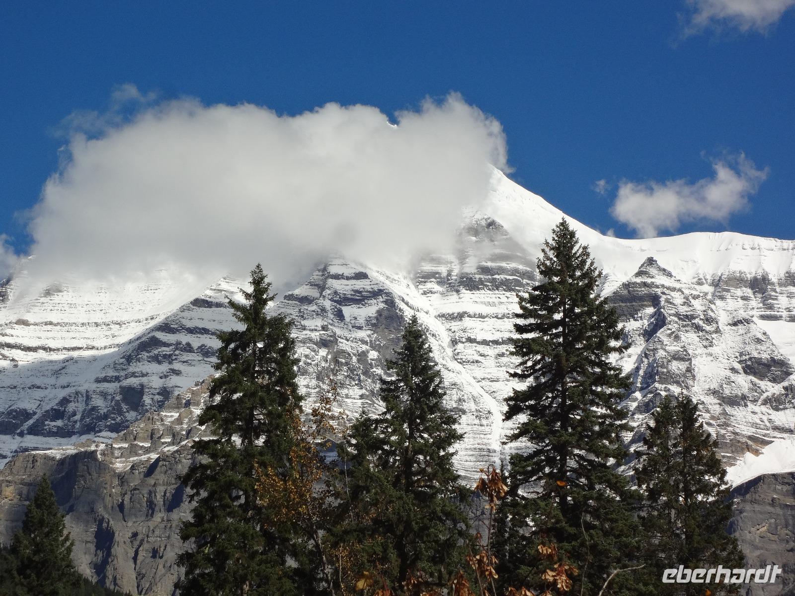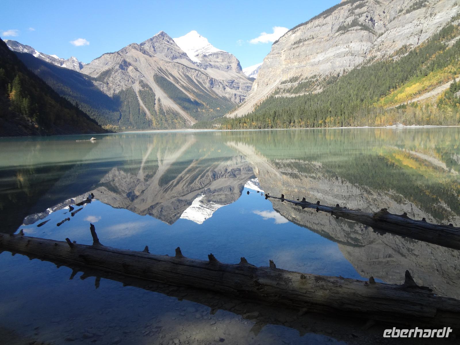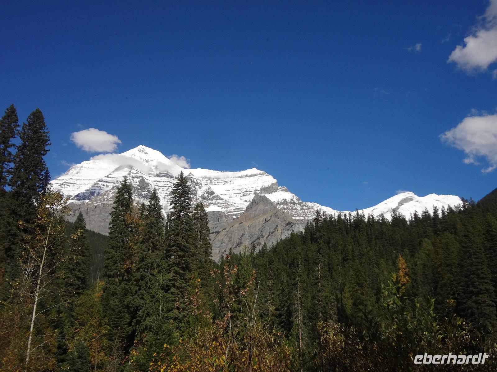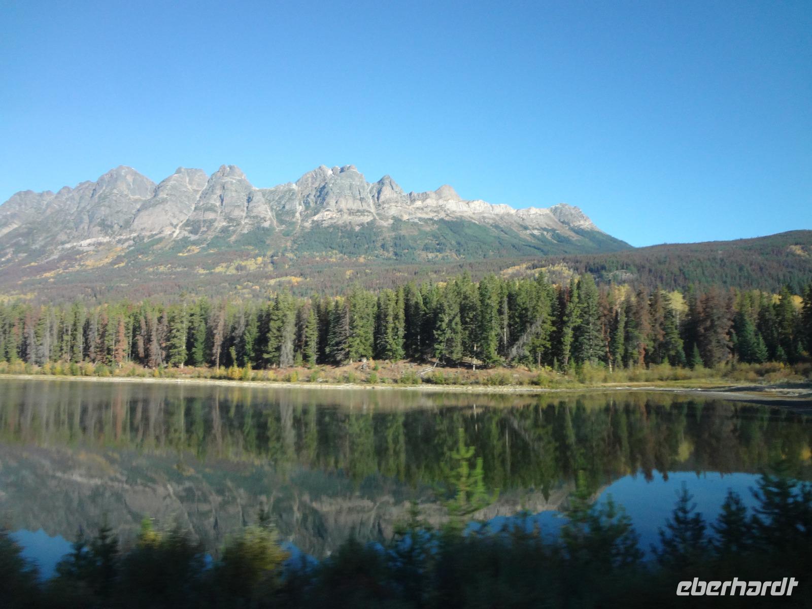Ein wolkenloser Himmel lacht uns heute an und frohgemut geniessen wir unser ausgiebiges Fruehstueck welches aus zwei Teilen besteht. Der erste Teil steht bereits auf dem Tisch, Brot, Kaese, Schinken, Butter, Marmelade usw. Kaffee wird gebracht und dann kommt der zweite Teil ein Teller voller Ruehrei, Speck, Kartoffeln, Wuerstchen und Toastbrot. Das alles in einem Restaurant mit Panoramafenster. Es geht uns wirklich gut, denn heute haben wir auch einen Geburtstag zu feiern und wir duerfen in einem modernen Riesenbus hinter Colin so sitzen, dass jeder der moechte, eine eigene Sitzreihe beanspruchen kann. Wir fahren nach Jasper und danach auf die Yellowhead Autobahn. Nun heisst es aufpassen, denn wir wollen die Abzweigung in den Sueden BC's nicht verpassen ! Ein Stuendchen spaeter, haben wir die Grenze zwischen Alberta und British Colombia, sowie jene zwischen Jasper National Park und Mt. Robson National Park ueberquert. Es ist auch der Moment, indem wir die Uhr wieder richten muessen. Der heutige Tag hat 25 Stunden, der Geburtstag wird instant verlaengert und wir stellen die Uhr eine Stunde zurueck. Vorbei der Wasserscheide sehen wir den Fraser River in seinen Kinderschuhen und fahren vorbei an wunderschoenen Seen. Bei Moose Lake, suchen wir natuerlich den Elch, der da rueber schwimmen soll ;-). Bald sind wir bei unserer ersten Wanderung entland des Fraser Flusses angekommen. Wanderschuhe an, Jacken an, den es ist bloss 6 Grad. Eine Stunde wandern wir gemuetlich ueber Stock und Stein, schauen die Wasserfaelle an und lernen auch die wichtigsten Baeume Britisch Columbien kennen. Beim Ende des Wanderweges wartet auch schon Colin auf uns. Auf der kurzen Fahrt zu Mt. Robson Parkplatz sehen wir auch den maechtigen Berg. Mt. Robson ist der hoechste Berg BC's mit seinen 3954 M.ue.M. Mit so einer fantastischer Kulisse feiern wir nun den Geburtstag eines Gastes. Der kanadische Champagner mit den Ahornkeksen untermalen das Fest. Danach kaufen wir noch ein kleines Picknick ein und gehen alsbald auf unsere naechste Wanderung. Wir wandern auf dem Berg Lake Trail bis zum Kinney Lake. Eine herrliche Aussicht wird uns prophezeit....und ja, wahrhaftig eine praechtige Aussicht nicht nur auf Mt. Robson sondern auch eine wundebare Spiegelung von anderen verschneiten Bergen im Kinney See. Unsere Herzen singen. Der selbe Weg zurueck zum Bus ist eigenartigerweise bloss halb so lang wie hin ! Nun tut es uns aber gut, wieder im Bus zu sitzen und unsere Beine auszuruhen. Wir erfahren wie so ein Lachsleben eines der fuenf verschiedenen pazifischen Lachse ausschaut, wie sie leben, wie lange, wohin sie schwimmen und wie sie laichen. Wir halten auch gleich bei einem Fluss an, wo die Lachse laichen aber eben im August und nicht ende September. Auf der Reise zu unserem Hotel horchen wir der kanadischen Saengerin Diana Krall zu und doesen ein wenig vor uns hin. Die strahlende Sonne, sowie die weissverschneiten Berge, der grosse Wald, die kleine Doerfer und die verschiedenen Fluesse begleiten uns. In Clearwater checken wir in unser Hotel ein und stoebern noch ein bisschen im Garten herum ehe wir zum Abendessen im Hause gehen. Heute testen wir den Coho Lachs, er schmeckt sehr lecker, andere waehlen das Haehnchen oder den Steak. Manche gehen auf einen kleinen Abendspaziergang, aber die geraeumigen Zimmer rufen schon.