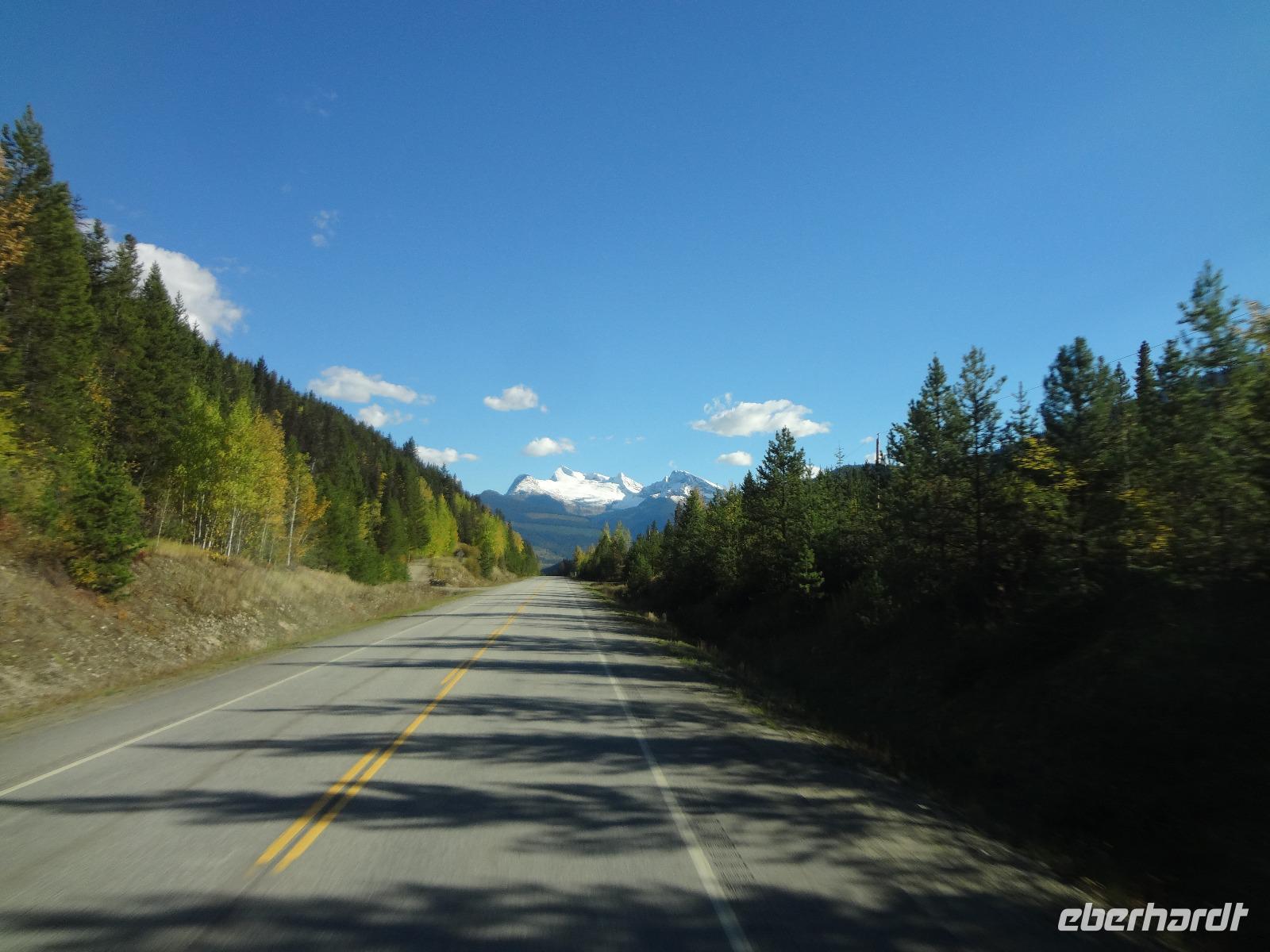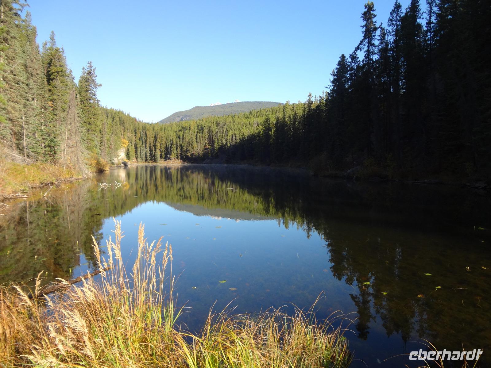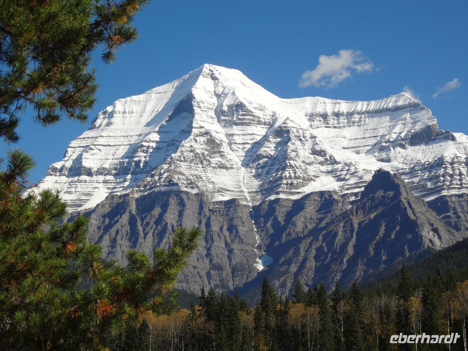 Ein wolkenloser Himmel lacht uns heute an und frohgemut geniessen wir unser ausgiebiges Fruehstueck welches aus zwei Teilen besteht. Der erste Teil steht bereits auf dem Tisch, Brot, Kaese, Schinken, Butter, Marmelade usw. Kaffee wird gebracht und dann kommt der zweite Teil ein Teller voller Ruehrei, Speck, Kartoffeln, Wuerstchen und Toastbrot. Das alles in einem Restaurant mit Panoramafenster. Es geht uns wirklich gut, denn heute haben wir auch einen Geburtstag zu feiern und wir duerfen in einem modernen Riesenbus hinter Colin so sitzen, dass jeder der moechte, eine eigene Sitzreihe beanspruchen kann. Wir fahren nach Jasper und danach auf die Yellowhead Autobahn. Nun heisst es aufpassen, denn wir wollen die Abzweigung in den Sueden BC's nicht verpassen ! Ein Stuendchen spaeter, haben wir die Grenze zwischen Alberta und British Colombia, sowie jene zwischen Jasper National Park und Mt. Robson National Park ueberquert. Es ist auch der Moment, indem wir die Uhr wieder richten muessen. Der heutige Tag hat 25 Stunden, der Geburtstag wird instant verlaengert und wir stellen die Uhr eine Stunde zurueck. Vorbei der Wasserscheide sehen wir den Fraser River in seinen Kinderschuhen und fahren vorbei an wunderschoenen Seen. Bei Moose Lake, suchen wir natuerlich den Elch, der da rueber schwimmen soll ;-). Bald sind wir bei unserer ersten Wanderung entland des Fraser Flusses angekommen. Wanderschuhe an, Jacken an, den es ist bloss 6 Grad. Eine Stunde wandern wir gemuetlich ueber Stock und Stein, schauen die Wasserfaelle an und lernen auch die wichtigsten Baeume Britisch Columbien kennen. Beim Ende des Wanderweges wartet auch schon Colin auf uns. Auf der kurzen Fahrt zu Mt. Robson Parkplatz sehen wir auch den maechtigen Berg. Mt. Robson ist der hoechste Berg BC's mit seinen 3954 M.ue.M. Mit so einer fantastischer Kulisse feiern wir nun den Geburtstag eines Gastes. Der kanadische Champagner mit den Ahornkeksen untermalen das Fest. Danach kaufen wir noch ein kleines Picknick ein und gehen alsbald auf unsere naechste Wanderung. Wir wandern auf dem Berg Lake Trail bis zum Kinney Lake. Eine herrliche Aussicht wird uns prophezeit....und ja, wahrhaftig eine praechtige Aussicht nicht nur auf Mt. Robson sondern auch eine wundebare Spiegelung von anderen verschneiten Bergen im Kinney See. Unsere Herzen singen. Der selbe Weg zurueck zum Bus ist eigenartigerweise bloss halb so lang wie hin ! Nun tut es uns aber gut, wieder im Bus zu sitzen und unsere Beine auszuruhen. Wir erfahren wie so ein Lachsleben eines der fuenf verschiedenen pazifischen Lachse ausschaut, wie sie leben, wie lange, wohin sie schwimmen und wie sie laichen. Wir halten auch gleich bei einem Fluss an, wo die Lachse laichen aber eben im August und nicht ende September. Auf der Reise zu unserem Hotel horchen wir der kanadischen Saengerin Diana Krall zu und doesen ein wenig vor uns hin. Die strahlende Sonne, sowie die weissverschneiten Berge, der grosse Wald, die kleine Doerfer und die verschiedenen Fluesse begleiten uns. In Clearwater checken wir in unser Hotel ein und stoebern noch ein bisschen im Garten herum ehe wir zum Abendessen im Hause gehen. Heute testen wir den Coho Lachs, er schmeckt sehr lecker, andere waehlen das Haehnchen oder den Steak. Manche gehen auf einen kleinen Abendspaziergang, aber die geraeumigen Zimmer rufen schon.
