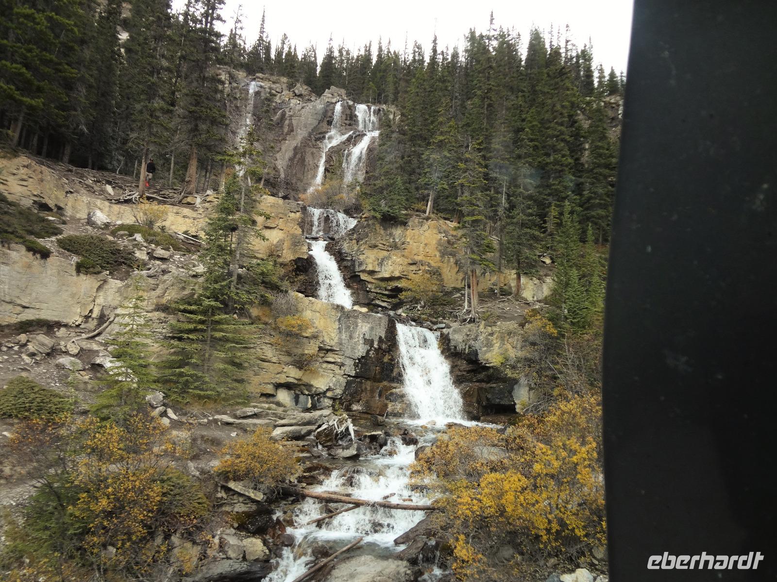 Die Sonne lacht und zum Abschied von Banff fahren wir gleich mal zum Banff Springs Hotel. Gerne waeren wir Lassie, und waeren in der Presidentensuite untergebracht. Wie mag das wohl sein ? sicher ein Hundeleben ! Bow Falls heisst es als naechstes auf Elisabeth's Programm. Marilyn Monroe, soll genau hier im Film „Fluss ohne Wiederkehr" gespielt haben. Es ist wirklich ein schoener kleiner Wasserfall und vor Freude huepfen hier sogar die Reiseleiter. Alsbald gehts auf der Highway no1 weiter zu einem ganz speziellen See. Der Moraine Lake ist so beruehmt, dass seine Aussicht sogar fuer lange Zeit auf der 20 Dollar Note strahlte. Mit seinen 10 Bergen die ihn umrahmen, seiner tuerkiesen Farbe und der heutigen Spiegelung sind wir wie verzaubert von seiner Schoenheit. Ungern lassen wir uns von hier wegzerren, aber der Tag verspricht noch vieles. Wir fahren auf die Gletscherstrasse und halten beim Crowfoot Gletscher, beim Bow See und danach bei Peyto Lake an. Die Farben, die Weite, die schillernden Seen sowie die thronenden Berge sind beeindruckend. Ein kleines Mittagessen gibt uns wieder Energie fuer das naechste Abenteuer. Wir fahren mit einem speziell angefertigten Eiscoach auf einen Gletscher. Aber Achtung, das leere Flaeschchen nicht vergessen, denn das Eiswasser soll verjuengende Eigenschaften haben. Vielleicht erkennt uns dann niemand mehr, wenn wir wieder zu Hause sind. Wir werden fuer unsere eigenen Nachfahren gehalten! Der Jungbrunnen wurde gefunden ;-) In absoluter Sicherheit auf einem echten Gletscher zu stehen ist ein einmaliges Gefuehl. Es ist so schoen, dass sogar die Sonne wieder hinter den Wolken hervorblitzt um uns beizuwohnen. Unser Hotel ist nicht weit weg und am spaeteren Nachmittag checken wir in unsere Waldhaeuschen ein. Heute abend ist Barbeque angesagt und nach dem Essen erzaehlt uns Heidi, eine Baerenliebhaberin und Naturalistin, vieles und auch lustiges ueber die Einwohner dieses UNESCO Weltkulturerbes, die Nationalparks von Banff, Jasper, Joho, Waterton und Mt. Robson. Ein paar Stunden spaeter, rufen jedoch die Waldhaeuschen nach ihren Bewohnern und dieser Aufforderung koennen wir nicht entgehen und folgen gehorsamst.