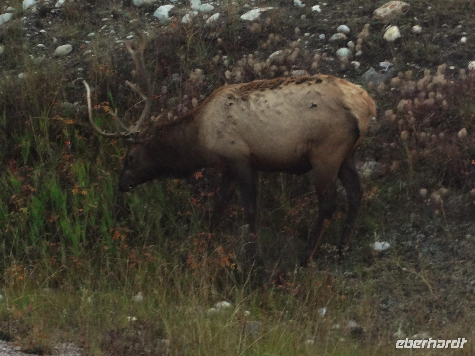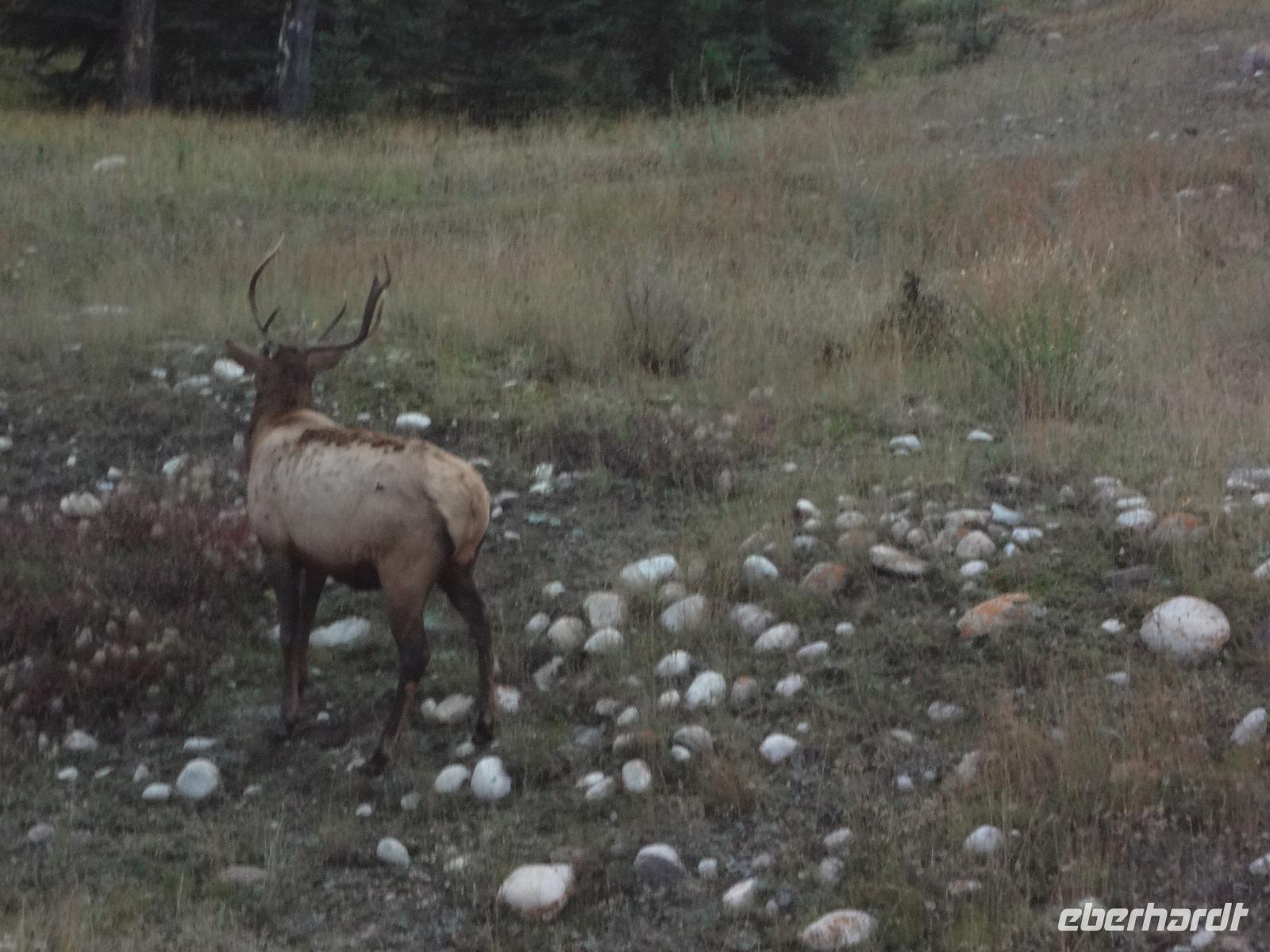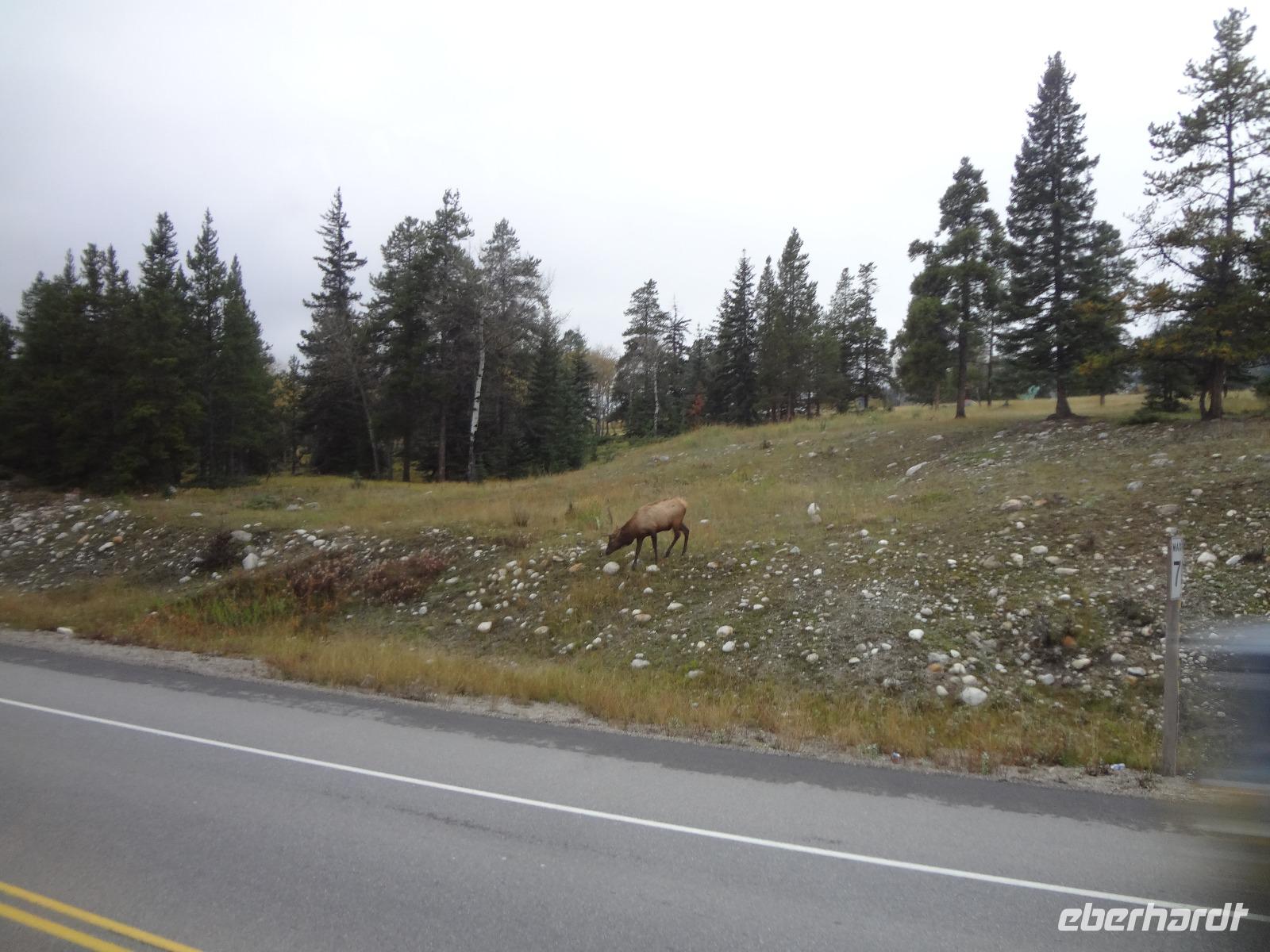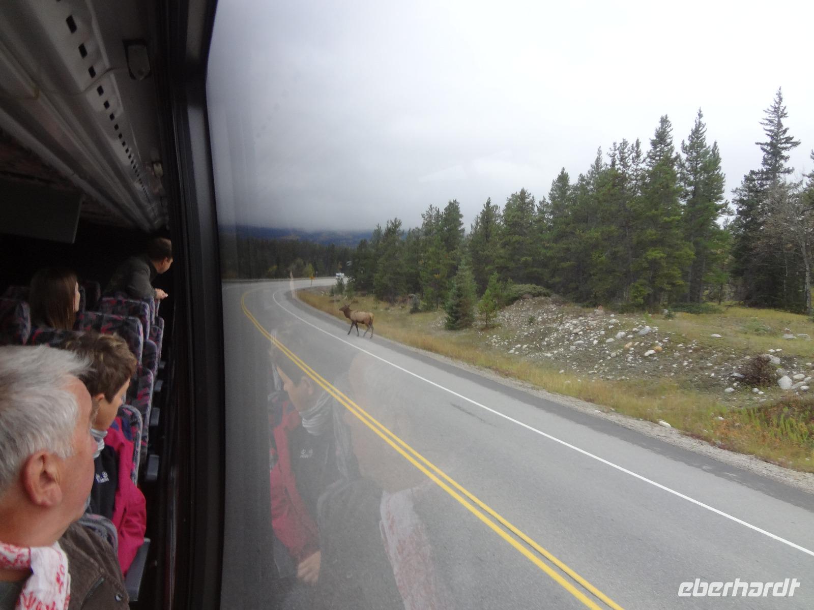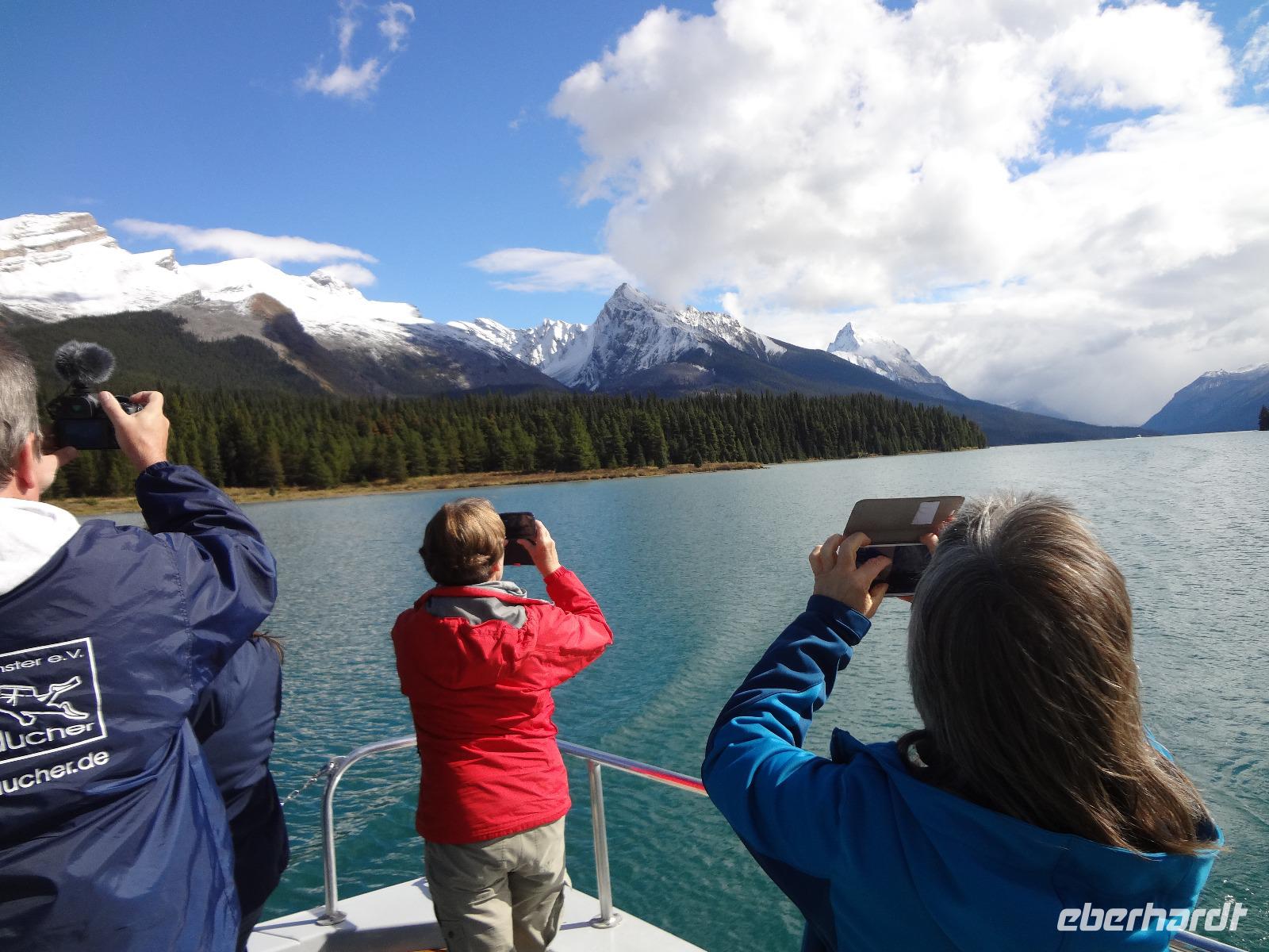 Nach einer geruhsamen Nacht in unseren Waldhaeuschen und einem ueppigen Fruehstueck, fahren wir in Richtung Jasper und sehen ploetzlich beim Vorbeifahren zwei Woelfe. Alex haelt den Bus und versucht auch zurueck zu fahren, aber die beiden sind gerade am verschwinden und nur das Hinterteil ist noch sichtbar. So einen Zufall, Woelfe zu sehen sei doch sehr selten und wir haben gleich 2 gesehen. Kurz vor Jasper werden wir nochmals verwoehnt, denn eine Wapitidame zeigt sich gleich neben unserem Bus, kurze Zeit danach sehen wir auch einen Wapiti Hirsch der wohl noch sehr jung ist. Auf dem Weg zum Maligne Canyon staut sich auf einmal die Autobahn.....ein ganzes Rudel, das heisst ein Wapitihirsch mit seinen 12 Damen sonnen sich gleich neben der Autobahn. Er steht mit seinem Riesengeweih majestaetisch da und schaut auf sein, im Gras liegendes, Harem. Ein wunderbarer Anblick. Natuerlich will da jedermann zuschauen und einige Fotografen haben bereits Stative aufgebaut und hantieren mit Kameras die teilweise einen Meter lang sind ! Auch wir versuchen noch ein Park-Plaetzchen zu ergattern, aber wir sind ein Bus und so viel Platz gibts nicht mehr. Wir fahren einfach ganz langsam vorbei und schauen dem Schauspiel zu. Bald sind wir bei unserer Wanderung. An dem linken Ufer des Maligne Canyons wandern wir von der 5. Bruecke bis hinauf zum Restaurant wo uns auch der Bus wieder abholt. Dieser Fluss ist wirklich verzaubert, einmal fuehrt er viel Wasser, und gleich danach wieder ganz wenig. Unterirdische Fluesse speisen ihn und fuehren auch Wasser ab. Ganz eigenartig. Wir kommen auch beim „Weissen Ton" Wasserfall vorbei und schauen immer wieder hinunter in die Schlucht die bei manchen Stellen ueber 50 Meter tief ist. Im Winter kann man hier Eiswandern und Eisklettern. Das soll interessant sein. Beim Restaurant angekommen haben wir etwas Zeit zum Kaffee trinken oder das Geschaeft anzuschauen. Die handgemachten Mocassins sind sehr weich und huebsch mit ihren Perlen. Aber passen die noch in unseren Koffer ? Bald gehts wieder weiter, zu unserem naechsten Ziel. Der Maligne See. Vorbei am Medicin Lake sind wir auch bald da. Die Mittagspause ist etwas kuerzer, da wir schon in einer ½ Stunde mit dem Schiff zur Spirit Island fahren werden. Das Schiff heisst Mary Schaeffer und ihre Geschichte haben wir bereits im Bus vernommen. Die Bootstour bringt uns Glueck, denn das Wetter wird zunehmends besser und bald haben wir einen blauen Himmer mit strahlender Sonne. Jetzt werden aber viele schoene Erinnerungen geknipst. Schatzilein vor Spirit Island, Schatzilein und ich vor einem verschneiten Berg, ich bei dem herrlich tuerkisfarbenen See usw, usw. Nach 1 ½ Stunden sind wir wieder zurueck und steigen auch wieder in unseren Bus ein. Wir wollen naemlich in Jasper noch Pause machen und uns das Staedtchen anschauen. Gesagt, getan und nun weiter zum Athabasca Wasserfall. Ohhh wie schoen, wie hoch, wie tief, wie ausgegraben, ein Wunder der Natur. Wie man einen Inukshuk baut und was das Ding ueberhaupt ist, erfahren wir gleich danach. Diese Lektion wird dann auch gleich in Tat umgesetzt und wir bauen die einfallsreichsten Inukshuks. Da die Ausscheidung so schwierig ist, stossen wir einfach mit einem echten kanadischen Whiskey auf unsere Arbeit an und knabbern an den salzigen-Limetten-Snacks. Zurueck im Hotel erfahren wir, dass wir morgen Bus und leider auch Buschauffeur wechseln werden. Wir werden den antiken Bus nicht so sehr vermissen, aber Alex, der uns sicher und gut durch die Rockies gefahren hat, schon. Das Abendessen ist wieder koestlich und Alex isst mit uns mit. Stewart, der Hotelmanager, ist heute besonders grosszuegig mit seinem Wein und fuellt auf Anfrage unsere Glaeser nochmals. Ja, die kanadische Grosszuegigkeit, vielleicht duerfen wir davon eine Portion mit nach Hause nehmen.
