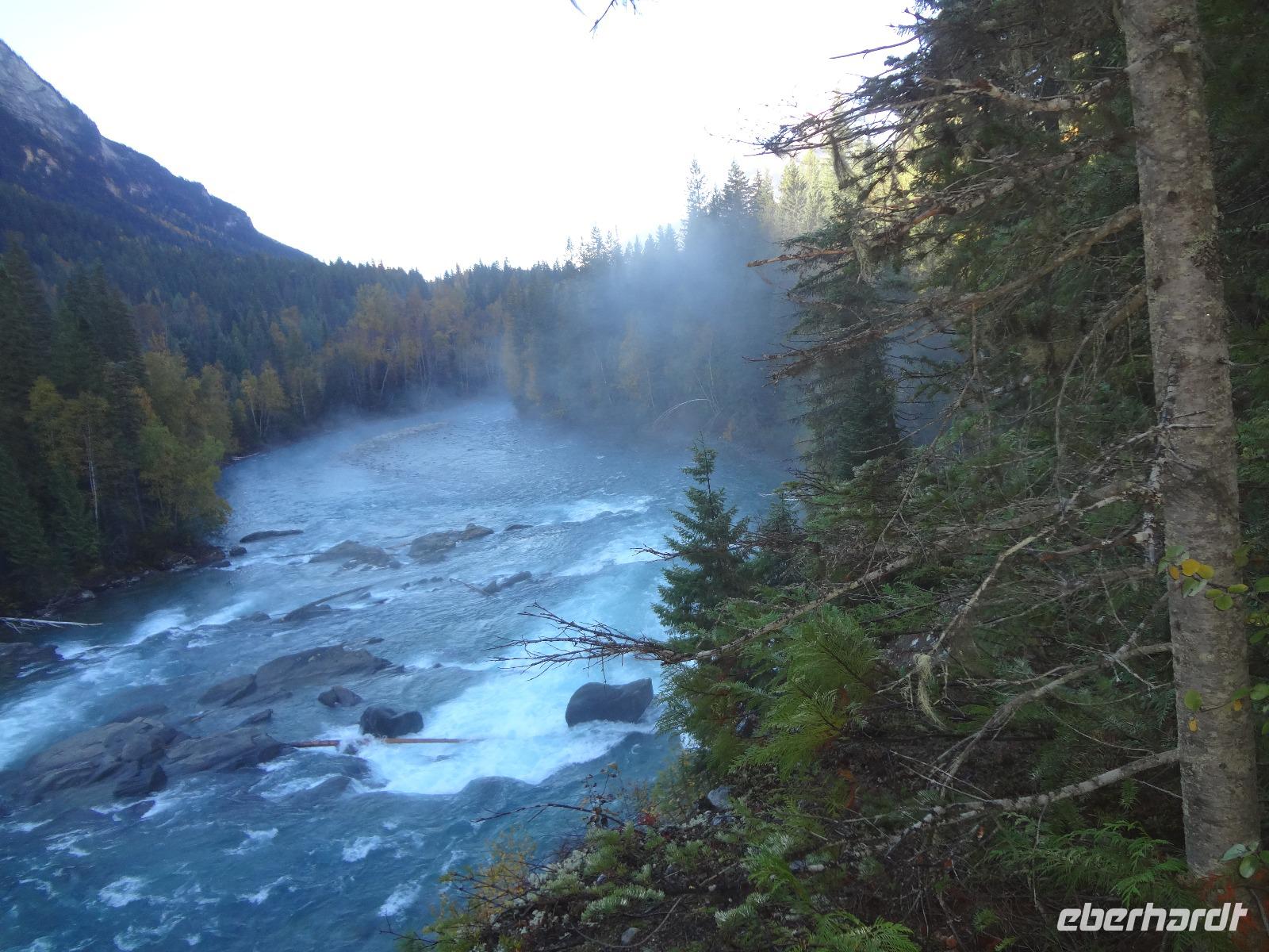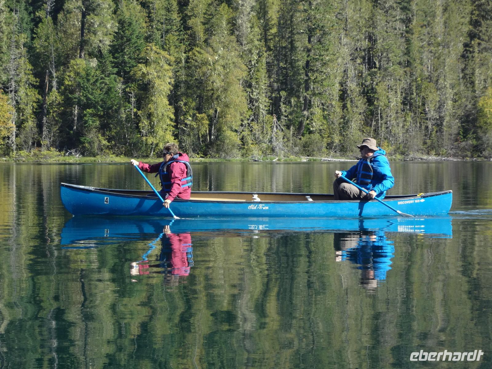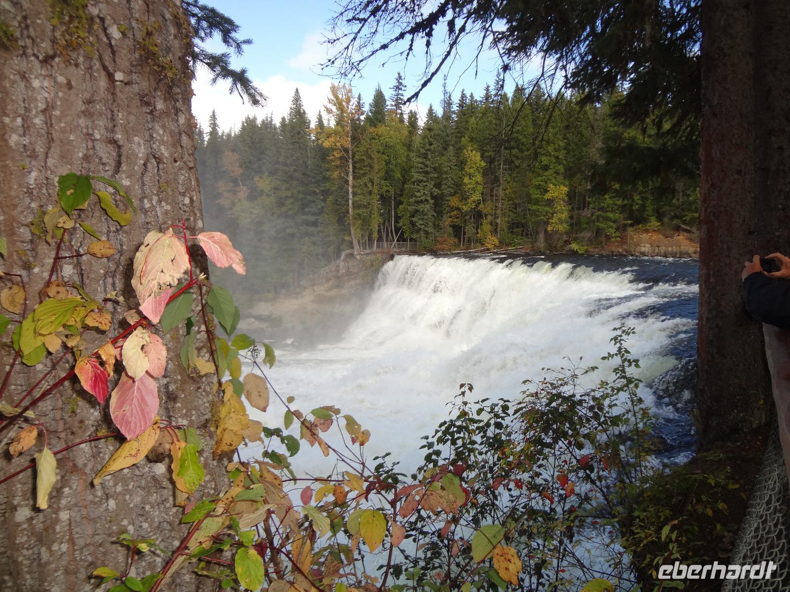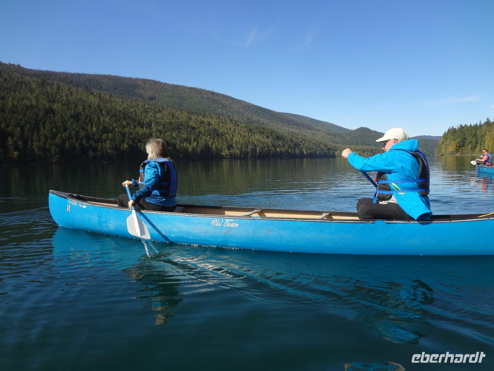 Bei strahlendem Sonnenschein fahren wir heute mit unserem Bus in den Wells Grey Park. Als erstes besuchen wir die Spahat Wasserfaelle. Wir steigen aus, gehen die 2 Minuten und stehen dann auf einer Terrasse mit Sicht auf ..... Weiss ...... Der Fluss unten in der Schlucht ist warm, die Luft aber noch kuehl und die ganze Aussicht ist in Nebel gehuellt. Hmm, also weiter zur Ranch wo unser Paddelfuehrer schon auf uns wartet. Mit seinem lockigen Haar und den verschlafenen traeumenden Augen, schaut er eher nach Cowboy Romantik aus. Er faehrt mit seinem Jeep vor uns her und haelt an schoenen Orten, sodass wir auch tolle Bilder knipsen koennen. Wir hoeren viel ueber die Homestaeds und das Leben der Ersten Nationen hier in Kanada. Bald sind wir auch schon bei den naechsten Wasserfaellen, mal schauen ob die Sonne schon die Luft gewaermt hat. Ja, so ein wunderbarer Anblick, ein Wasserfall so gebogen wie ein Hufeisen auf zwei Etagen. Es schaut ein wenig aus wie die Niagara Faelle, verkleinert und ohne Hochhaeuser. Es sind die Dawson Falls, wir haengen auch gleich einen Spaziergang an, ehe wir weiterfahren zum Clearwater See. Heute steht Kanu fahren auf dem Programm und wir schauen alle ein bisschen besorgt auf den riesengrossen spiegelglatten See. Keine Sorge ! so haelt man das Paddel, man setzt sich zu zweit ins Kanu, so paddelt man, so steuert man und so steigt man ein. Easy. Bitte alle nachahmen und in die mitte des Sees paddeln.....ja, einige machen ein paar extrarunden und fahren im Kreis, andere bevorzugen das Zigzag Muster und wiederum andere paddeln perfekt einfach synchron bis in die Mitte des Sees. Jetzt erhalten wir von unserem ueber-netten Kanufuehrer Travis Einweisung in die Kunst des Kanufahrens. Mehr oder weniger geschmeidig gleiten wir nun uebers Wasser und haben sogar Zeit, die schoene unangetastete Natur, den glitzernden See und die waermende Sonne zu geniessen. Da vorne, ein Sandstrand, das ist unser Ziel, hier gibt es unser Mittagessen. Ein schoener Schmetterling setzt sich auf einen Arm, ach schau, die schoenen Federn ! oehh, Fell ? Haut ? Was hat denn so ein Schmetterling. Riesengelaechter, die Sonne brennt direkt auf unsere Koepfe. Einige unter uns springen auch gleich zur Kuehlung ins klare Wasser, es ist gar nicht kalt.....brrrr. Die Grillwurst mit Broetchen und die Salate schmecken vorzueglich hier am Seesufer, und das zurueck-paddeln geht schon wie von alleine. Da wir die letzte Gruppe sind die Kanue fahren gehen, tragen wir die Kanus auch gleich zum Anhaenger damit sie in den Winterschlaf gehen koennen. Auf dem Rueckweg halten wir noch beim hoechsten Wasserfall BC's an. Die 141 Meter hohen und sehr imposanten Helmecken Falls. Viele Fotos werden gemacht und die Basaltformation des Gesteines dieser Schlucht gefaellt unseren Augen. Zurueck in der Ranch, stehen etwa 20 Pferde beim Gatter, es ist bald 6 Uhr und das Abendessen wurde noch immer nicht serviert, scheint auf ihren lieblichen Gesichter geschrieben. Nur ungern steigen wir wieder in unseren Bus und nur das Wissen, dass wir auch heute wieder so gut essen werden im Hotel, ueberzeugt uns. Richtig, das Abendbrot war vorzueglich und mit vielen tollen Eindruecken und etwas Muskelkater an den Armen fallen wir in unsere Betten.