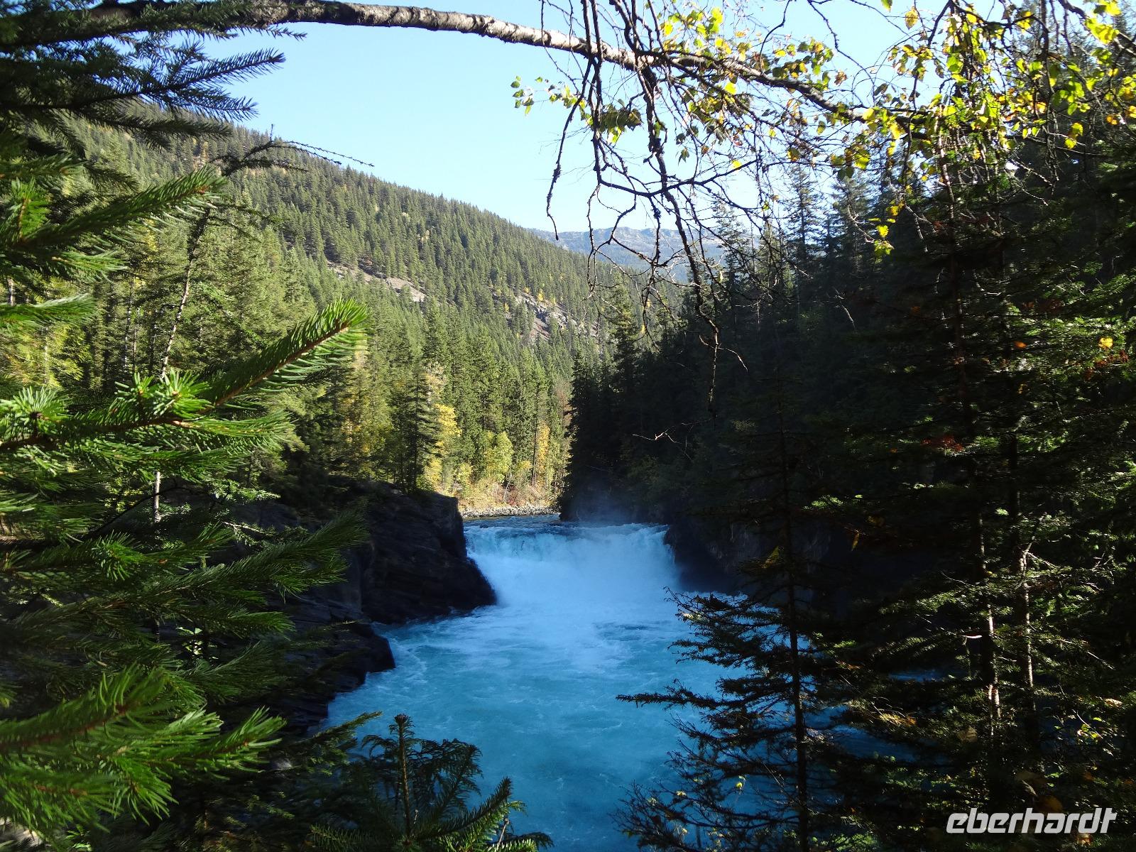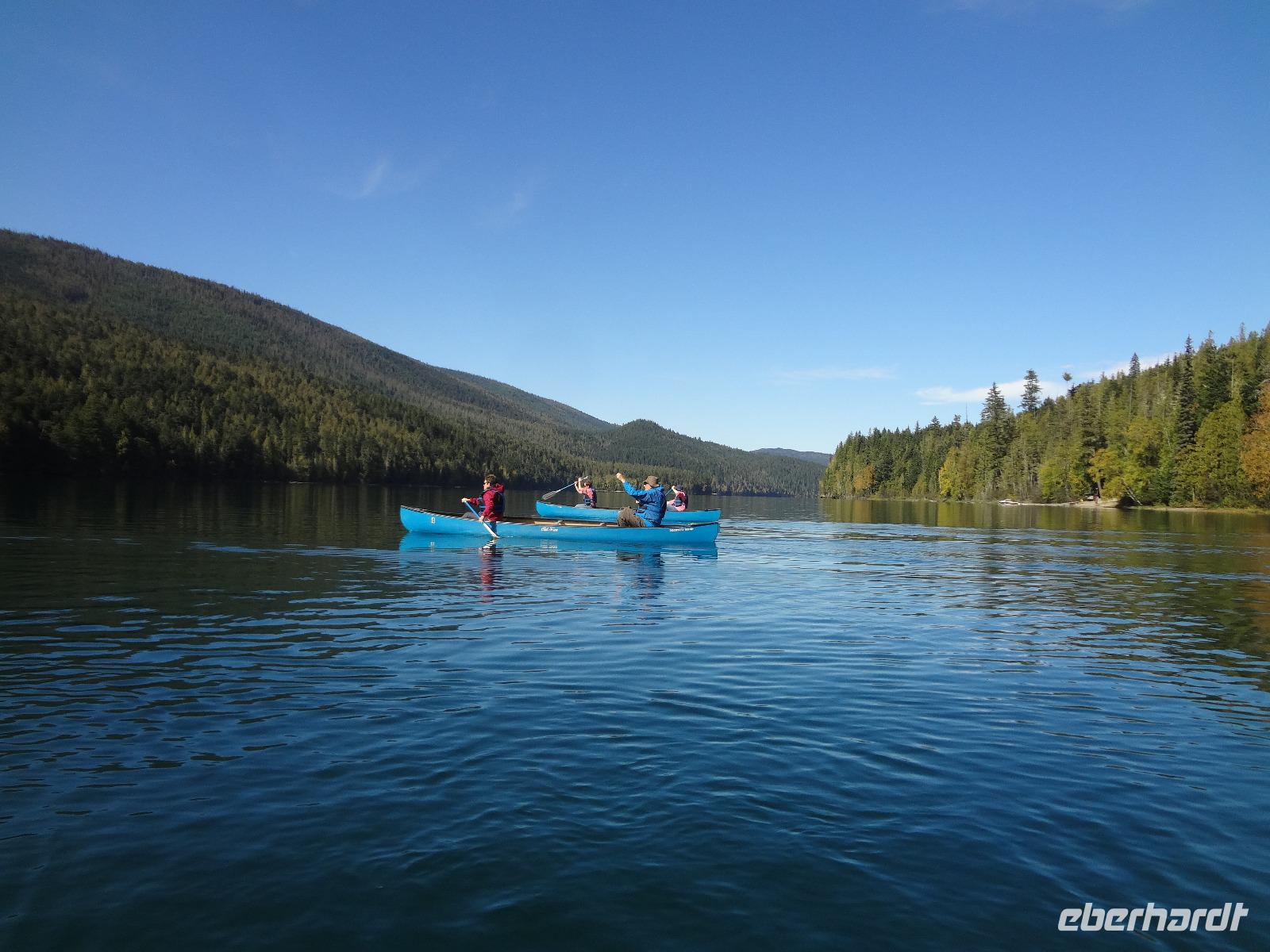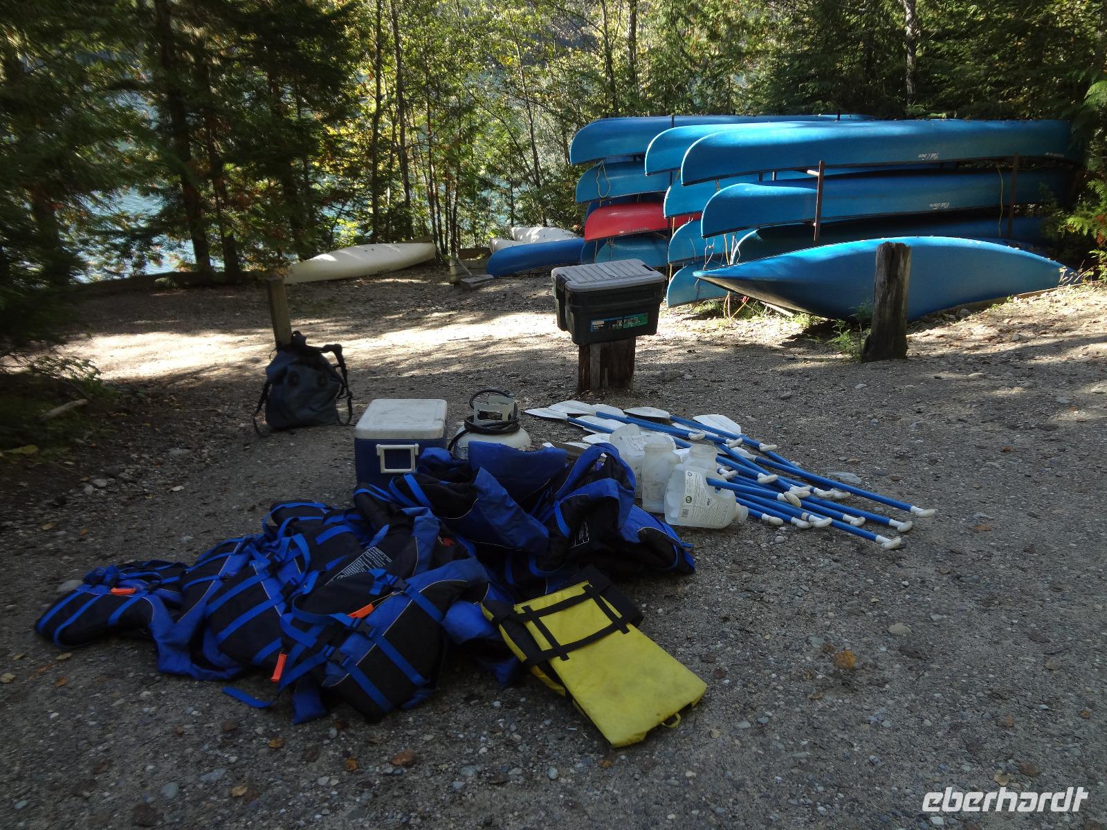 Bei strahlendem Sonnenschein fahren wir heute mit unserem Bus in den Wells Grey Park. Als erstes besuchen wir die Spahat Wasserfaelle. Wir steigen aus, gehen die 2 Minuten und stehen dann auf einer Terrasse mit Sicht auf ..... Weiss ...... Der Fluss unten in der Schlucht ist warm, die Luft aber noch kuehl und die ganze Aussicht ist in Nebel gehuellt. Hmm, also weiter zur Ranch wo unser Paddelfuehrer schon auf uns wartet. Mit seinem lockigen Haar und den verschlafenen traeumenden Augen, schaut er eher nach Cowboy Romantik aus. Er faehrt mit seinem Jeep vor uns her und haelt an schoenen Orten, sodass wir auch tolle Bilder knipsen koennen. Wir hoeren viel ueber die Homestaeds und das Leben der Ersten Nationen hier in Kanada. Bald sind wir auch schon bei den naechsten Wasserfaellen, mal schauen ob die Sonne schon die Luft gewaermt hat. Ja, so ein wunderbarer Anblick, ein Wasserfall so gebogen wie ein Hufeisen auf zwei Etagen. Es schaut ein wenig aus wie die Niagara Faelle, verkleinert und ohne Hochhaeuser. Es sind die Dawson Falls, wir haengen auch gleich einen Spaziergang an, ehe wir weiterfahren zum Clearwater See. Heute steht Kanu fahren auf dem Programm und wir schauen alle ein bisschen besorgt auf den riesengrossen spiegelglatten See. Keine Sorge ! so haelt man das Paddel, man setzt sich zu zweit ins Kanu, so paddelt man, so steuert man und so steigt man ein. Easy. Bitte alle nachahmen und in die mitte des Sees paddeln.....ja, einige machen ein paar extrarunden und fahren im Kreis, andere bevorzugen das Zigzag Muster und wiederum andere paddeln perfekt einfach synchron bis in die Mitte des Sees. Jetzt erhalten wir von unserem ueber-netten Kanufuehrer Travis Einweisung in die Kunst des Kanufahrens. Mehr oder weniger geschmeidig gleiten wir nun uebers Wasser und haben sogar Zeit, die schoene unangetastete Natur, den glitzernden See und die waermende Sonne zu geniessen. Da vorne, ein Sandstrand, das ist unser Ziel, hier gibt es unser Mittagessen. Ein schoener Schmetterling setzt sich auf einen Arm, ach schau, die schoenen Federn ! oehh, Fell ? Haut ? Was hat denn so ein Schmetterling. Riesengelaechter, die Sonne brennt direkt auf unsere Koepfe. Einige unter uns springen auch gleich zur Kuehlung ins klare Wasser, es ist gar nicht kalt.....brrrr. Die Grillwurst mit Broetchen und die Salate schmecken vorzueglich hier am Seesufer, und das zurueck-paddeln geht schon wie von alleine. Da wir die letzte Gruppe sind die Kanue fahren gehen, tragen wir die Kanus auch gleich zum Anhaenger damit sie in den Winterschlaf gehen koennen. Auf dem Rueckweg halten wir noch beim hoechsten Wasserfall BC's an. Die 141 Meter hohen und sehr imposanten Helmecken Falls. Viele Fotos werden gemacht und die Basaltformation des Gesteines dieser Schlucht gefaellt unseren Augen. Zurueck in der Ranch, stehen etwa 20 Pferde beim Gatter, es ist bald 6 Uhr und das Abendessen wurde noch immer nicht serviert, scheint auf ihren lieblichen Gesichter geschrieben. Nur ungern steigen wir wieder in unseren Bus und nur das Wissen, dass wir auch heute wieder so gut essen werden im Hotel, ueberzeugt uns. Richtig, das Abendbrot war vorzueglich und mit vielen tollen Eindruecken und etwas Muskelkater an den Armen fallen wir in unsere Betten.