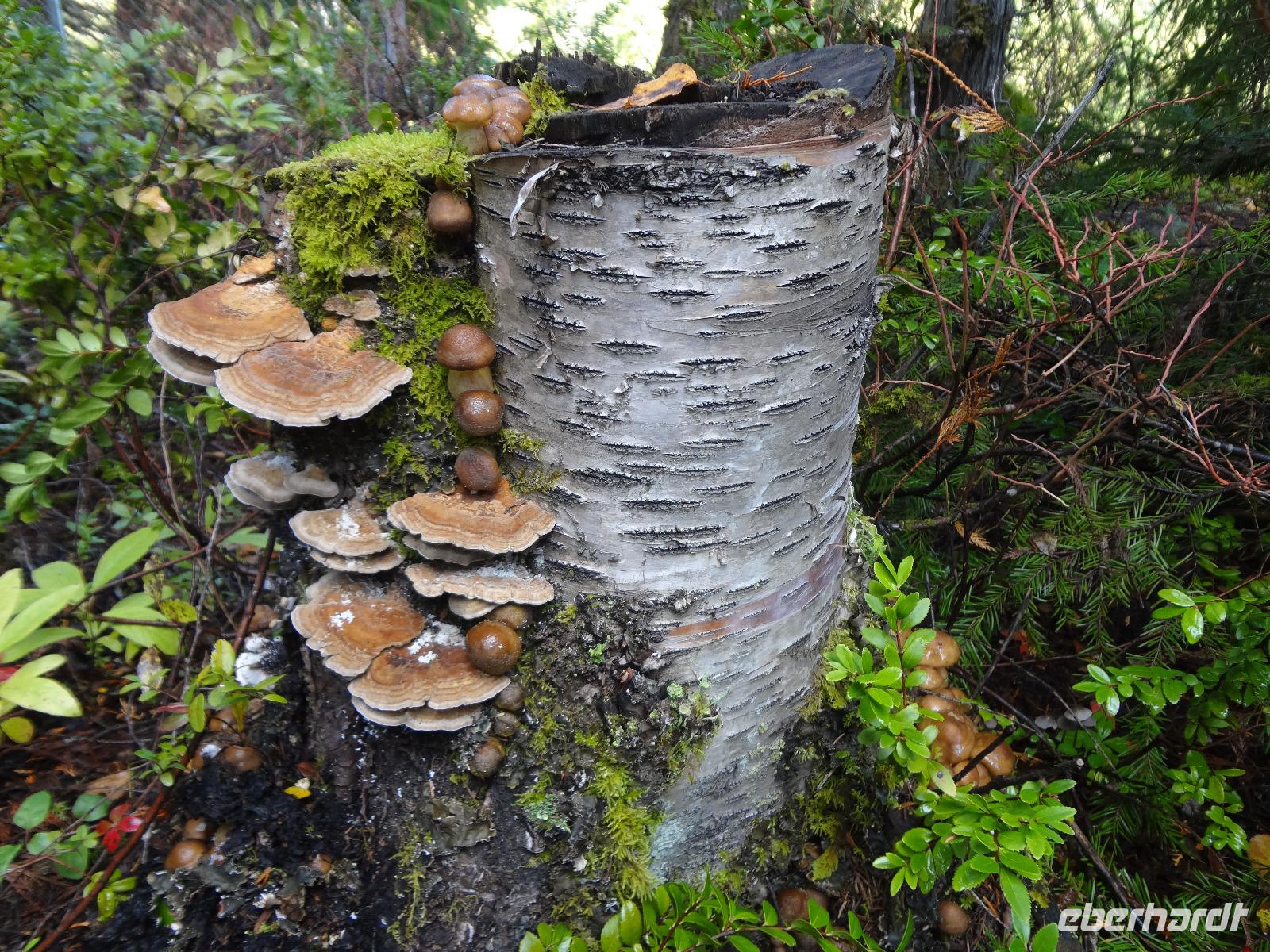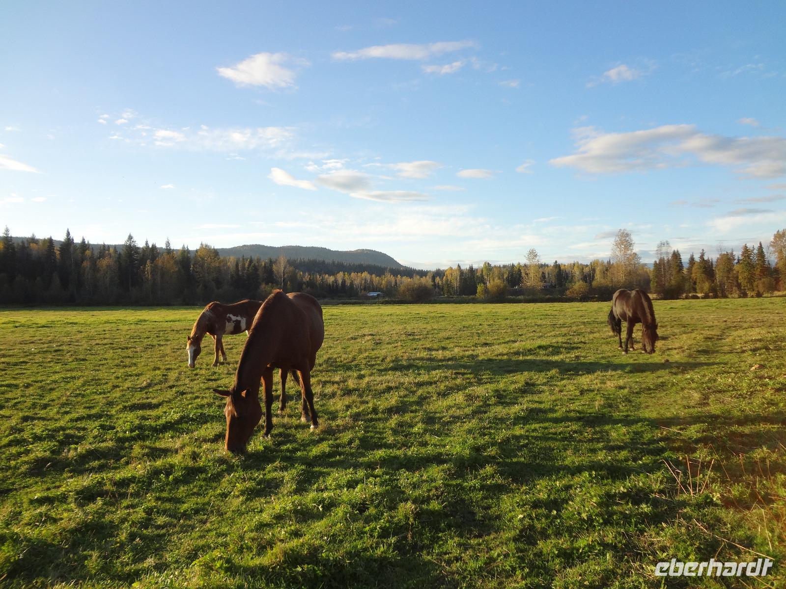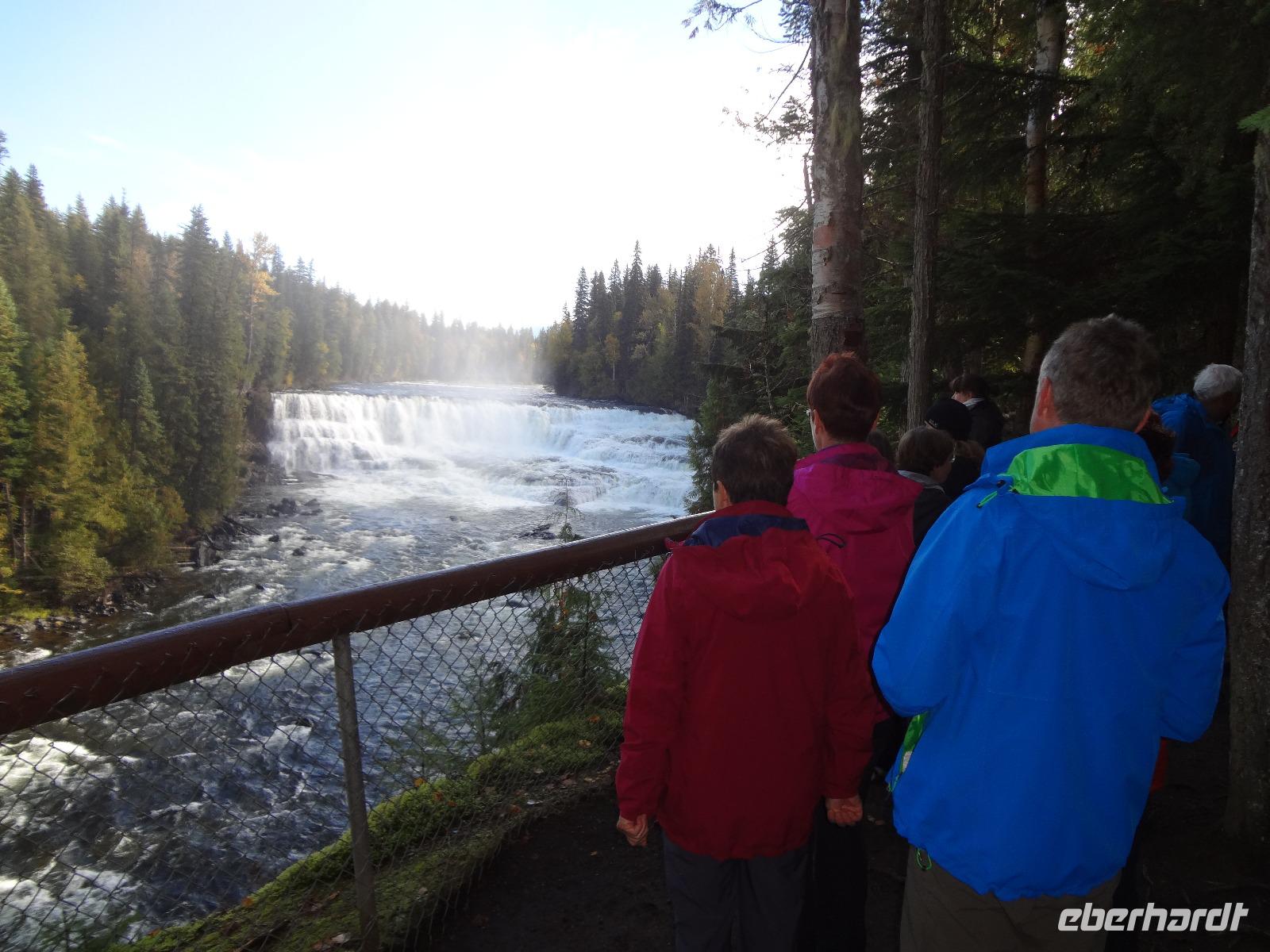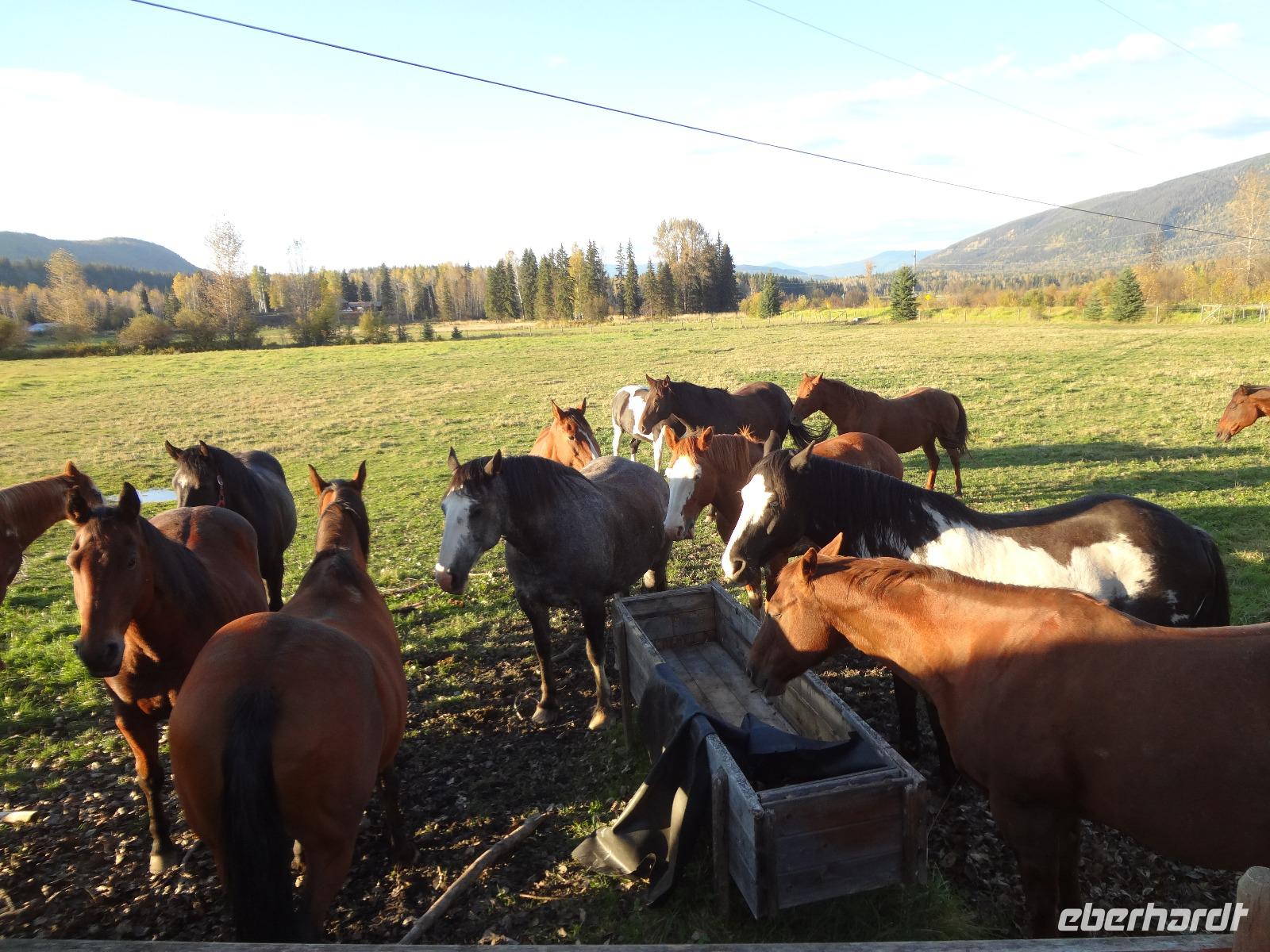 Bei strahlendem Sonnenschein fahren wir heute mit unserem Bus in den Wells Grey Park. Als erstes besuchen wir die Spahat Wasserfaelle. Wir steigen aus, gehen die 2 Minuten und stehen dann auf einer Terrasse mit Sicht auf ..... Weiss ...... Der Fluss unten in der Schlucht ist warm, die Luft aber noch kuehl und die ganze Aussicht ist in Nebel gehuellt. Hmm, also weiter zur Ranch wo unser Paddelfuehrer schon auf uns wartet. Mit seinem lockigen Haar und den verschlafenen traeumenden Augen, schaut er eher nach Cowboy Romantik aus. Er faehrt mit seinem Jeep vor uns her und haelt an schoenen Orten, sodass wir auch tolle Bilder knipsen koennen. Wir hoeren viel ueber die Homestaeds und das Leben der Ersten Nationen hier in Kanada. Bald sind wir auch schon bei den naechsten Wasserfaellen, mal schauen ob die Sonne schon die Luft gewaermt hat. Ja, so ein wunderbarer Anblick, ein Wasserfall so gebogen wie ein Hufeisen auf zwei Etagen. Es schaut ein wenig aus wie die Niagara Faelle, verkleinert und ohne Hochhaeuser. Es sind die Dawson Falls, wir haengen auch gleich einen Spaziergang an, ehe wir weiterfahren zum Clearwater See. Heute steht Kanu fahren auf dem Programm und wir schauen alle ein bisschen besorgt auf den riesengrossen spiegelglatten See. Keine Sorge ! so haelt man das Paddel, man setzt sich zu zweit ins Kanu, so paddelt man, so steuert man und so steigt man ein. Easy. Bitte alle nachahmen und in die mitte des Sees paddeln.....ja, einige machen ein paar extrarunden und fahren im Kreis, andere bevorzugen das Zigzag Muster und wiederum andere paddeln perfekt einfach synchron bis in die Mitte des Sees. Jetzt erhalten wir von unserem ueber-netten Kanufuehrer Travis Einweisung in die Kunst des Kanufahrens. Mehr oder weniger geschmeidig gleiten wir nun uebers Wasser und haben sogar Zeit, die schoene unangetastete Natur, den glitzernden See und die waermende Sonne zu geniessen. Da vorne, ein Sandstrand, das ist unser Ziel, hier gibt es unser Mittagessen. Ein schoener Schmetterling setzt sich auf einen Arm, ach schau, die schoenen Federn ! oehh, Fell ? Haut ? Was hat denn so ein Schmetterling. Riesengelaechter, die Sonne brennt direkt auf unsere Koepfe. Einige unter uns springen auch gleich zur Kuehlung ins klare Wasser, es ist gar nicht kalt.....brrrr. Die Grillwurst mit Broetchen und die Salate schmecken vorzueglich hier am Seesufer, und das zurueck-paddeln geht schon wie von alleine. Da wir die letzte Gruppe sind die Kanue fahren gehen, tragen wir die Kanus auch gleich zum Anhaenger damit sie in den Winterschlaf gehen koennen. Auf dem Rueckweg halten wir noch beim hoechsten Wasserfall BC's an. Die 141 Meter hohen und sehr imposanten Helmecken Falls. Viele Fotos werden gemacht und die Basaltformation des Gesteines dieser Schlucht gefaellt unseren Augen. Zurueck in der Ranch, stehen etwa 20 Pferde beim Gatter, es ist bald 6 Uhr und das Abendessen wurde noch immer nicht serviert, scheint auf ihren lieblichen Gesichter geschrieben. Nur ungern steigen wir wieder in unseren Bus und nur das Wissen, dass wir auch heute wieder so gut essen werden im Hotel, ueberzeugt uns. Richtig, das Abendbrot war vorzueglich und mit vielen tollen Eindruecken und etwas Muskelkater an den Armen fallen wir in unsere Betten.