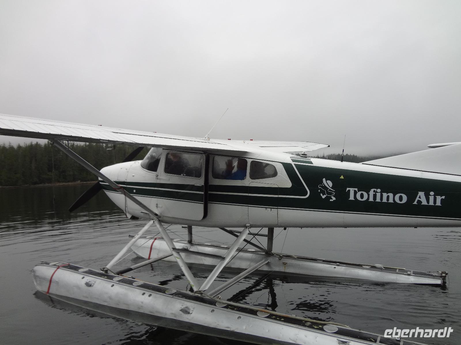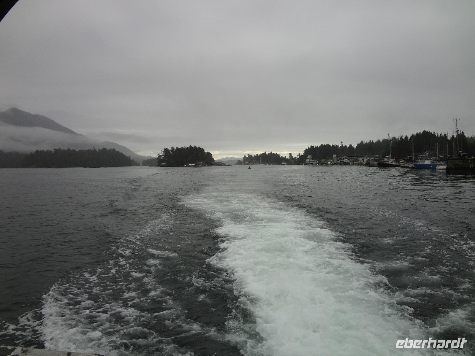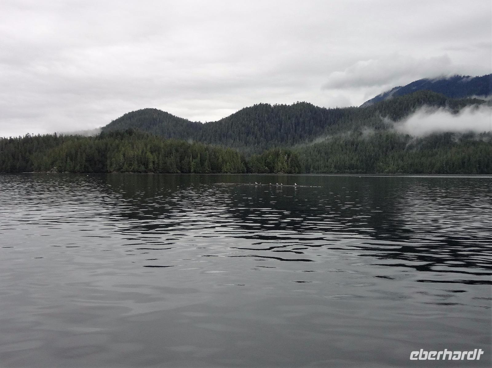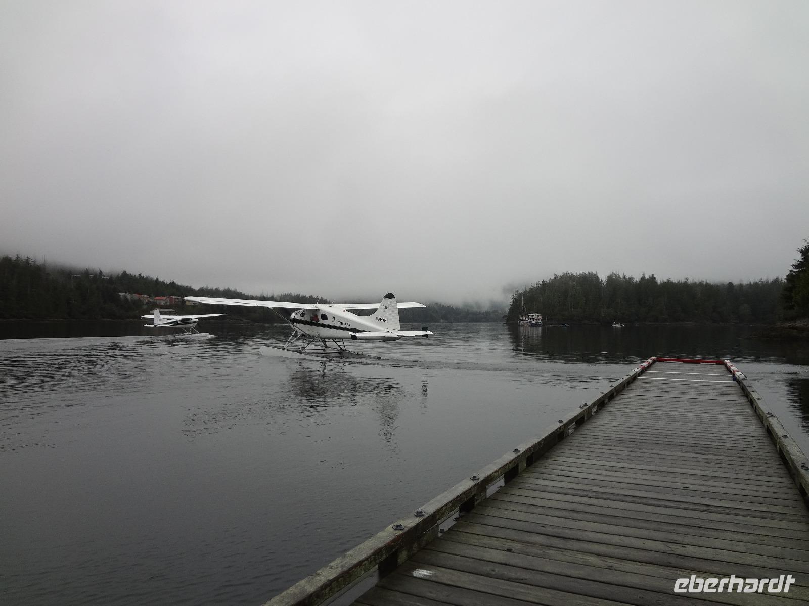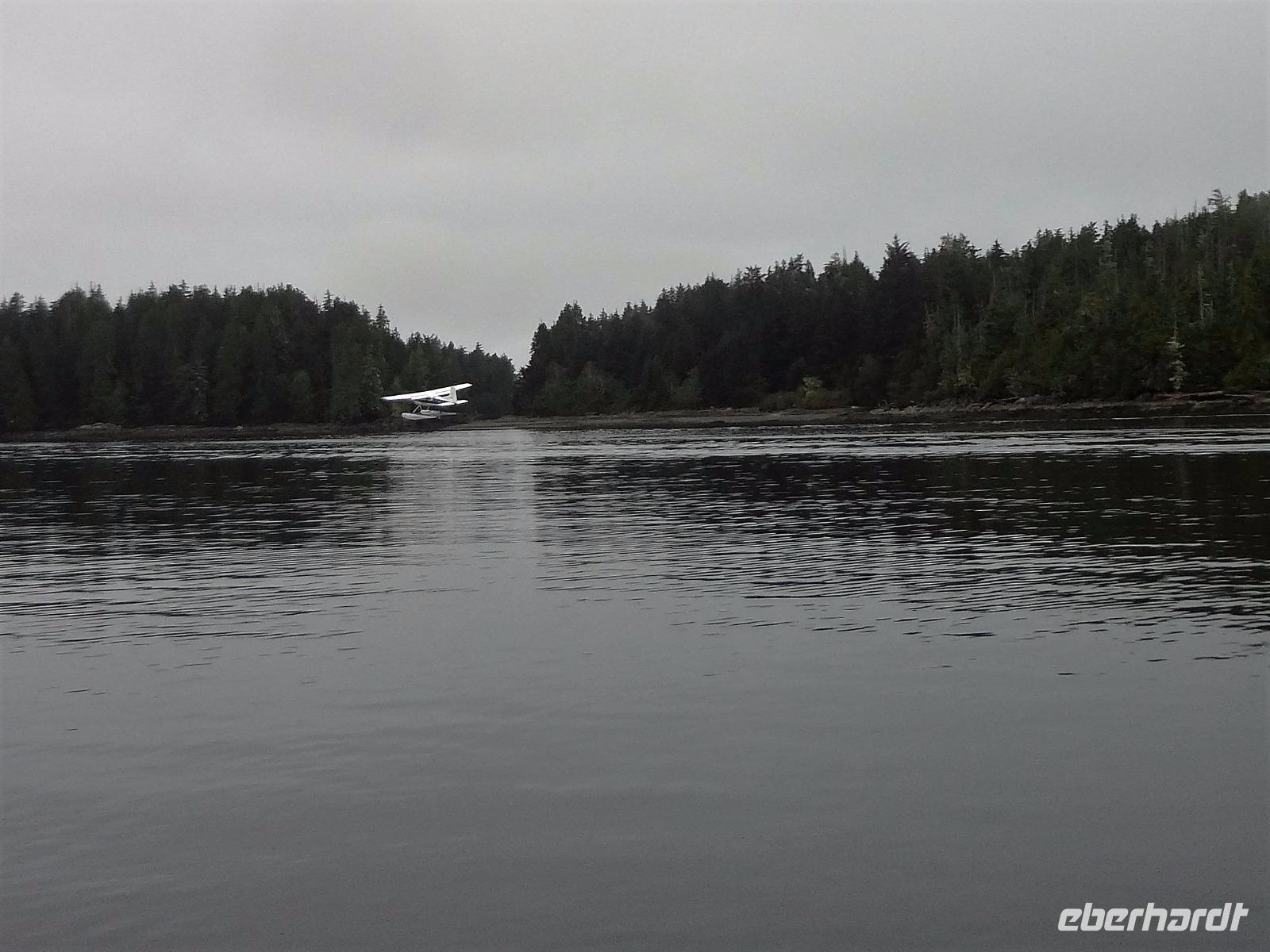 Es nieselt ein wenig wie es sich fuer einen Regenwald gehoert. So fahren wir nach dem Fruehstueck auch gleich los auf unsere erste Wanderung heute. In einem Urwald wandern wir auf einm Holzpfad an riesengrossen Westlichen Roten Zedern, Hemlock Tannen und Douglasien vorbei. Das Unterholz ist bedeckt mit Moos, Farnen, Stinkkohl und feinen Bueschen mit kleinen roten Beerchen drauf. Wir sehen auch des Teufels Schlagstock, die Devil's Club Pflanze kann sich sehr gut gegen die Hirsche wehren, die ihre Blume und Beeren fressen moechten. Da sie jedoch mit tausenden versteckten Nadeln vesehen ist, ist sie vor dem Verzehr geschuetzt. Wir staunen ueber die wunderbare Natur und stellen uns immer wieder neben die Riesenbaeume wohl, damit wir schlanker ausschauen. Unsere Kameras laufen wieder auf Hochtouren. Auf einmal aber, stehen wir wieder vor unserem Bus, wir sind einen Rundweg gegangen. In Tofino fahren wir vorerst durch das Surferdorf und halten auch beim Supermarkt an um unser Mittagessen einzukaufen. Auch heute, werden wir zu Mittag an einem ausgefallenen Ort sein. Dieses Mal fahren wir mit einem Privatschiff von Tofino nach Maquinna Park. Wir sehen unterwegs einige Otter die auf dem Ruecken schwimmen und sich von dem feinen Regen berieseln lassen. Ein Otter aber ist heute ganz besonders zum Spiele aufgelegt. Er springt immer wieder aus dem Wasser um danach Walfisch zu spielen und seine klitzekleine Schwanzflosse zu zeigen. Suess. Auf einem Felsen ruhen auch einige Robben, es sind Hafen Robben, sie sind hell und man sieht sie sehr gut auf dem duckeln Fels. Die Moeven wollen die Robben verjagen, denn sie stuerzen sich immer wieder flugs auf die Robben, bis die nicht endlich den Fels freigeben. Einen Moevensieg, haben sie errungen. Bei Maquinna Park angekommen, verabschieden wir uns von Chris und Sarah, den beiden Kapitaenen, ehe wir unser Picknick unter Dach einnehmen. Die Wanderung zu den Heissen Quellen ist auch wieder auf einem Holzweg. Auch hier ist der Wald unberuehrt und alles glizert, wenn Licht sich durch die vielen Baeume durchzwaengen kann. Nach einer Stunde sind wir bei den Quellen, nun heisst es Badehose an und ab ins warme Nass. Fast alle goennen sich diese schwefelangereicherte Pause andere brauchen wir um die Fotos zu knipsen ! Nach ¼ Stunde ist die Haut fein und warm, die Fingerspitzen wie von einer Waschfrau ganz aufgeschwollen und wellig. Den Weg hinein gehen wir nun auch wieder zurueck und da hoeren wir auch schon unser Flugzeug. Denn heute fliegen wir mit einem Wasserflugzeug wieder zurueck nach Tofino. Die ersten sechs unter uns, sitzen in einem Beaver und drei weitere in einer Wasser-Chessna. Wir sind eine groessere Gruppe, also kommt der Beaver und die Chessna nach ½ Stunde wieder zurueck und holt den Rest der Gruppe ab. Da wir heute keinen Sonnenschein haben, fliegen wir auch sehr niedrig und wir koennen so, jeden Fisch und sogar einen Baeren von oben sehen. Was fuer ein Abenteuer, einfach herrlich mit so einem Wasserflugzeug zu fliegen. Der Tag ist aber noch lange nicht aus. Wir wollen noch einen Strandspaziergang machen und danach das Lachs-Abendessen geniessen. Am Strand lernen wir die Pflanze Kelp kennen und betrachten auch die riesengrossen Muscheln die es hier anschwemmt. Viel Holz ziert auch die BC Straende und Surfer spielen mit den Wellen. Einen vollen, langen und eindruecklichen Tag haben wir heute erlebt, wir werden alles unseren Kissen erzaehlen.