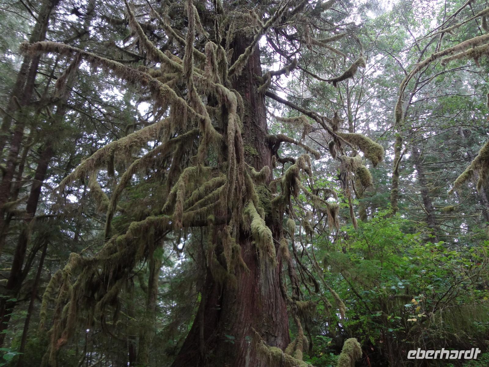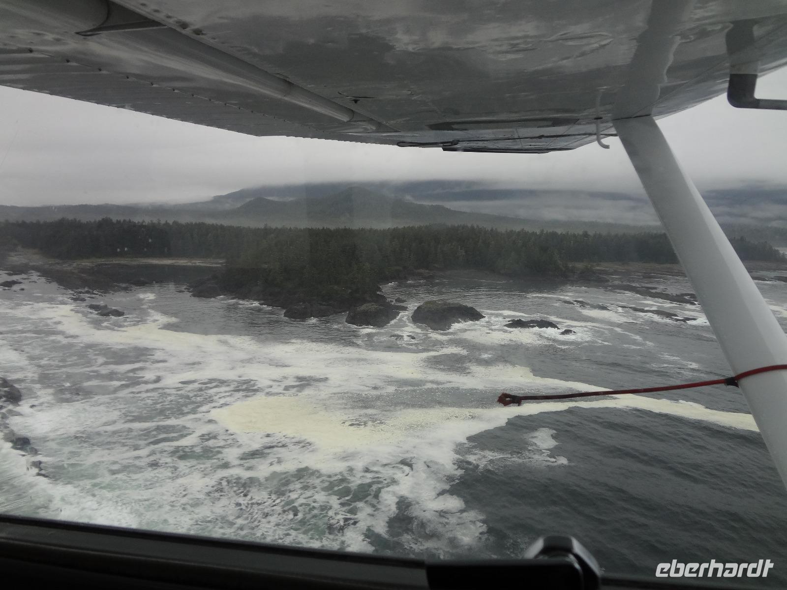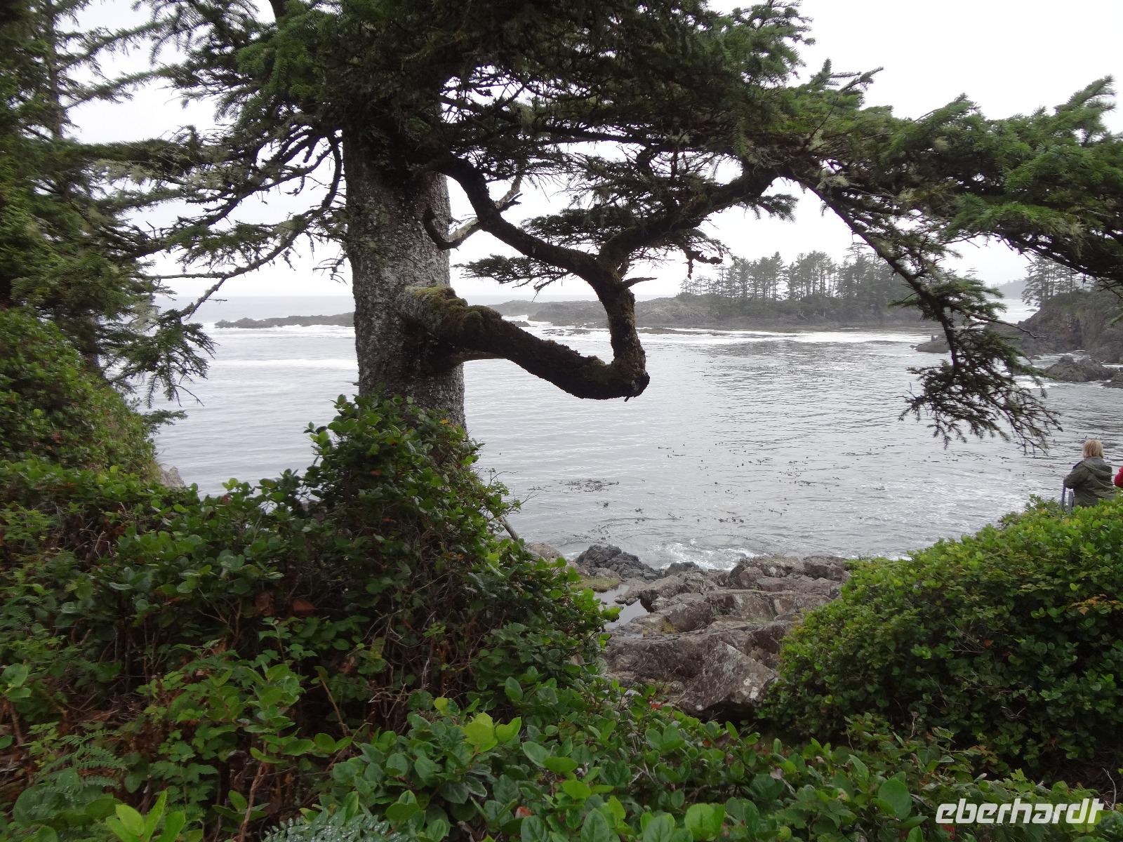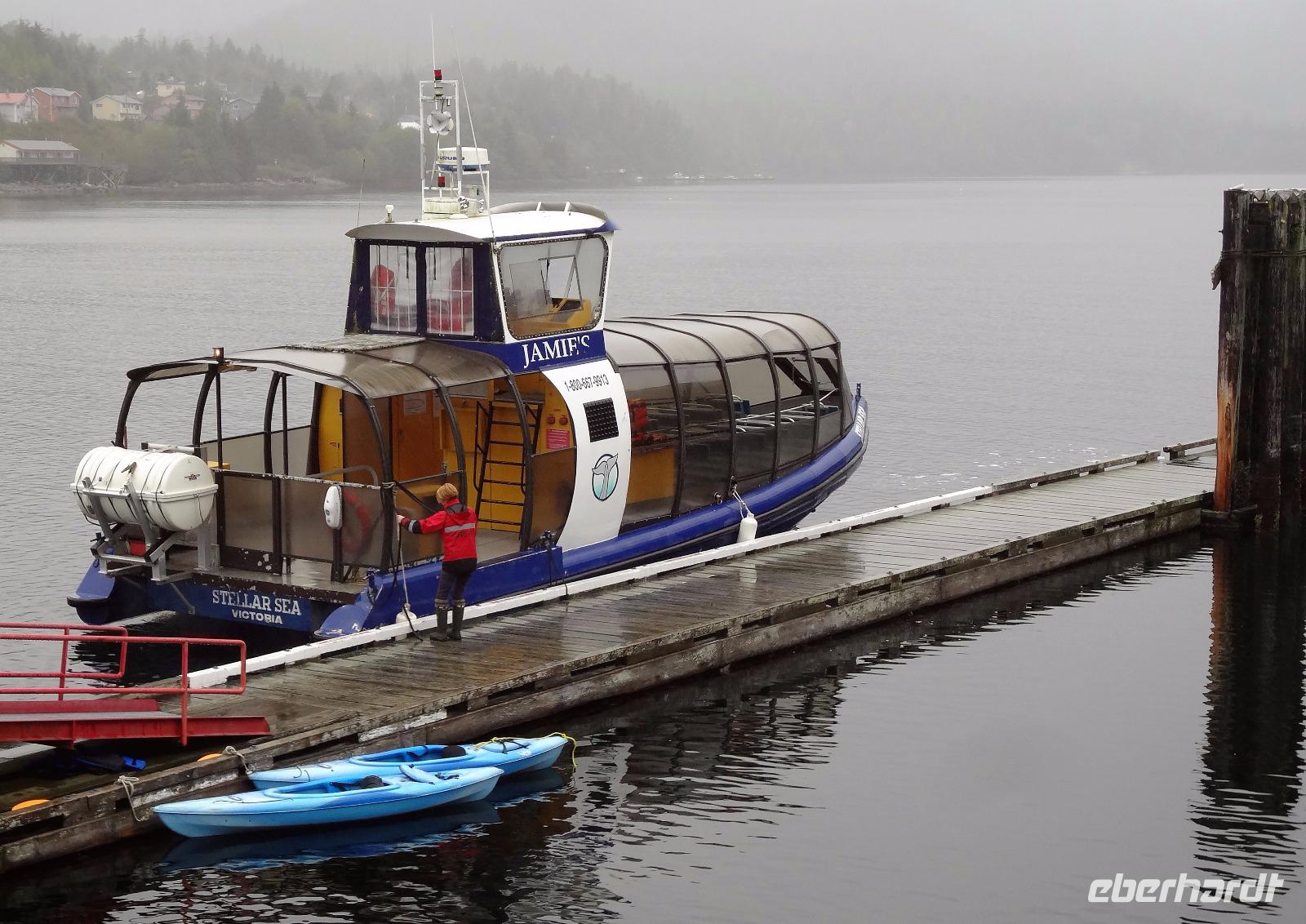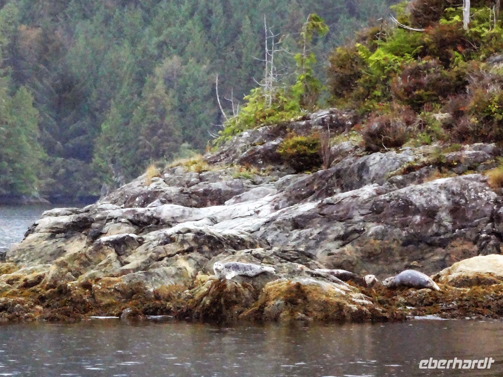 Es nieselt ein wenig wie es sich fuer einen Regenwald gehoert. So fahren wir nach dem Fruehstueck auch gleich los auf unsere erste Wanderung heute. In einem Urwald wandern wir auf einm Holzpfad an riesengrossen Westlichen Roten Zedern, Hemlock Tannen und Douglasien vorbei. Das Unterholz ist bedeckt mit Moos, Farnen, Stinkkohl und feinen Bueschen mit kleinen roten Beerchen drauf. Wir sehen auch des Teufels Schlagstock, die Devil's Club Pflanze kann sich sehr gut gegen die Hirsche wehren, die ihre Blume und Beeren fressen moechten. Da sie jedoch mit tausenden versteckten Nadeln vesehen ist, ist sie vor dem Verzehr geschuetzt. Wir staunen ueber die wunderbare Natur und stellen uns immer wieder neben die Riesenbaeume wohl, damit wir schlanker ausschauen. Unsere Kameras laufen wieder auf Hochtouren. Auf einmal aber, stehen wir wieder vor unserem Bus, wir sind einen Rundweg gegangen. In Tofino fahren wir vorerst durch das Surferdorf und halten auch beim Supermarkt an um unser Mittagessen einzukaufen. Auch heute, werden wir zu Mittag an einem ausgefallenen Ort sein. Dieses Mal fahren wir mit einem Privatschiff von Tofino nach Maquinna Park. Wir sehen unterwegs einige Otter die auf dem Ruecken schwimmen und sich von dem feinen Regen berieseln lassen. Ein Otter aber ist heute ganz besonders zum Spiele aufgelegt. Er springt immer wieder aus dem Wasser um danach Walfisch zu spielen und seine klitzekleine Schwanzflosse zu zeigen. Suess. Auf einem Felsen ruhen auch einige Robben, es sind Hafen Robben, sie sind hell und man sieht sie sehr gut auf dem duckeln Fels. Die Moeven wollen die Robben verjagen, denn sie stuerzen sich immer wieder flugs auf die Robben, bis die nicht endlich den Fels freigeben. Einen Moevensieg, haben sie errungen. Bei Maquinna Park angekommen, verabschieden wir uns von Chris und Sarah, den beiden Kapitaenen, ehe wir unser Picknick unter Dach einnehmen. Die Wanderung zu den Heissen Quellen ist auch wieder auf einem Holzweg. Auch hier ist der Wald unberuehrt und alles glizert, wenn Licht sich durch die vielen Baeume durchzwaengen kann. Nach einer Stunde sind wir bei den Quellen, nun heisst es Badehose an und ab ins warme Nass. Fast alle goennen sich diese schwefelangereicherte Pause andere brauchen wir um die Fotos zu knipsen ! Nach ¼ Stunde ist die Haut fein und warm, die Fingerspitzen wie von einer Waschfrau ganz aufgeschwollen und wellig. Den Weg hinein gehen wir nun auch wieder zurueck und da hoeren wir auch schon unser Flugzeug. Denn heute fliegen wir mit einem Wasserflugzeug wieder zurueck nach Tofino. Die ersten sechs unter uns, sitzen in einem Beaver und drei weitere in einer Wasser-Chessna. Wir sind eine groessere Gruppe, also kommt der Beaver und die Chessna nach ½ Stunde wieder zurueck und holt den Rest der Gruppe ab. Da wir heute keinen Sonnenschein haben, fliegen wir auch sehr niedrig und wir koennen so, jeden Fisch und sogar einen Baeren von oben sehen. Was fuer ein Abenteuer, einfach herrlich mit so einem Wasserflugzeug zu fliegen. Der Tag ist aber noch lange nicht aus. Wir wollen noch einen Strandspaziergang machen und danach das Lachs-Abendessen geniessen. Am Strand lernen wir die Pflanze Kelp kennen und betrachten auch die riesengrossen Muscheln die es hier anschwemmt. Viel Holz ziert auch die BC Straende und Surfer spielen mit den Wellen. Einen vollen, langen und eindruecklichen Tag haben wir heute erlebt, wir werden alles unseren Kissen erzaehlen.