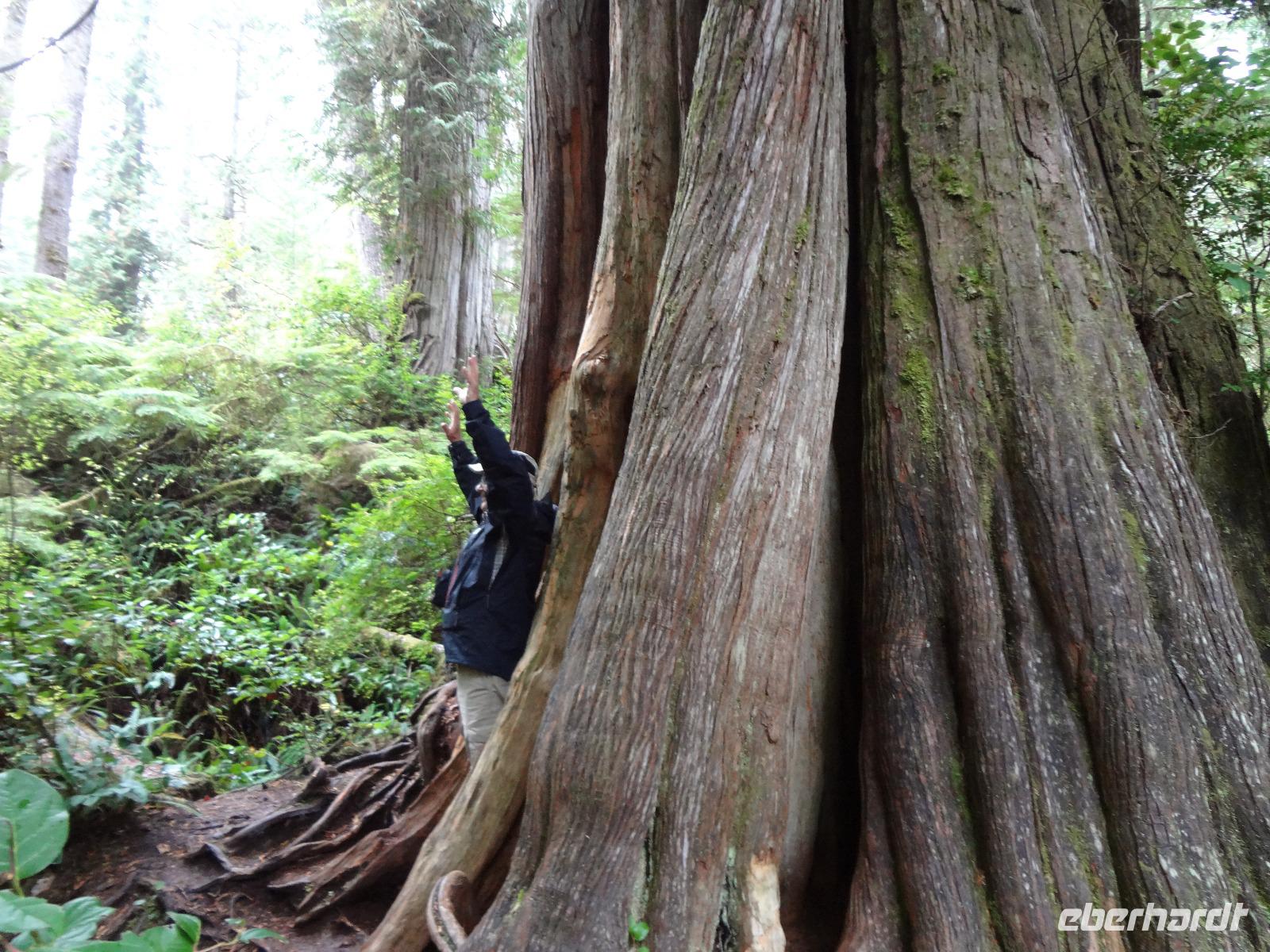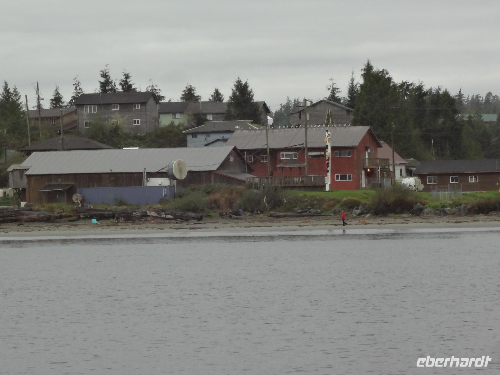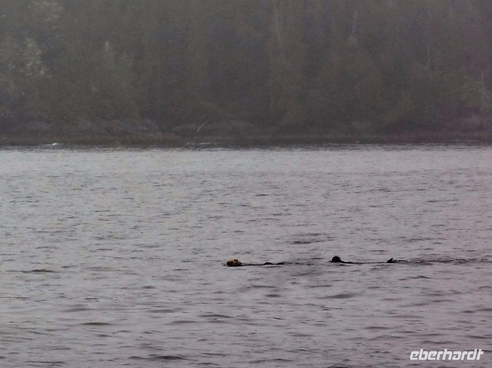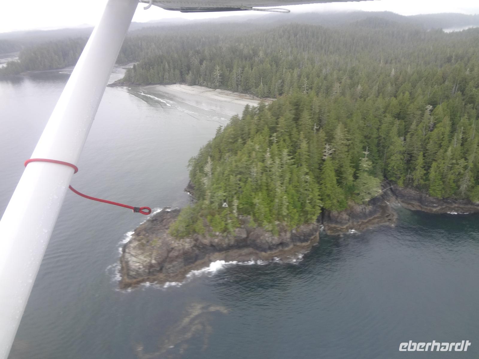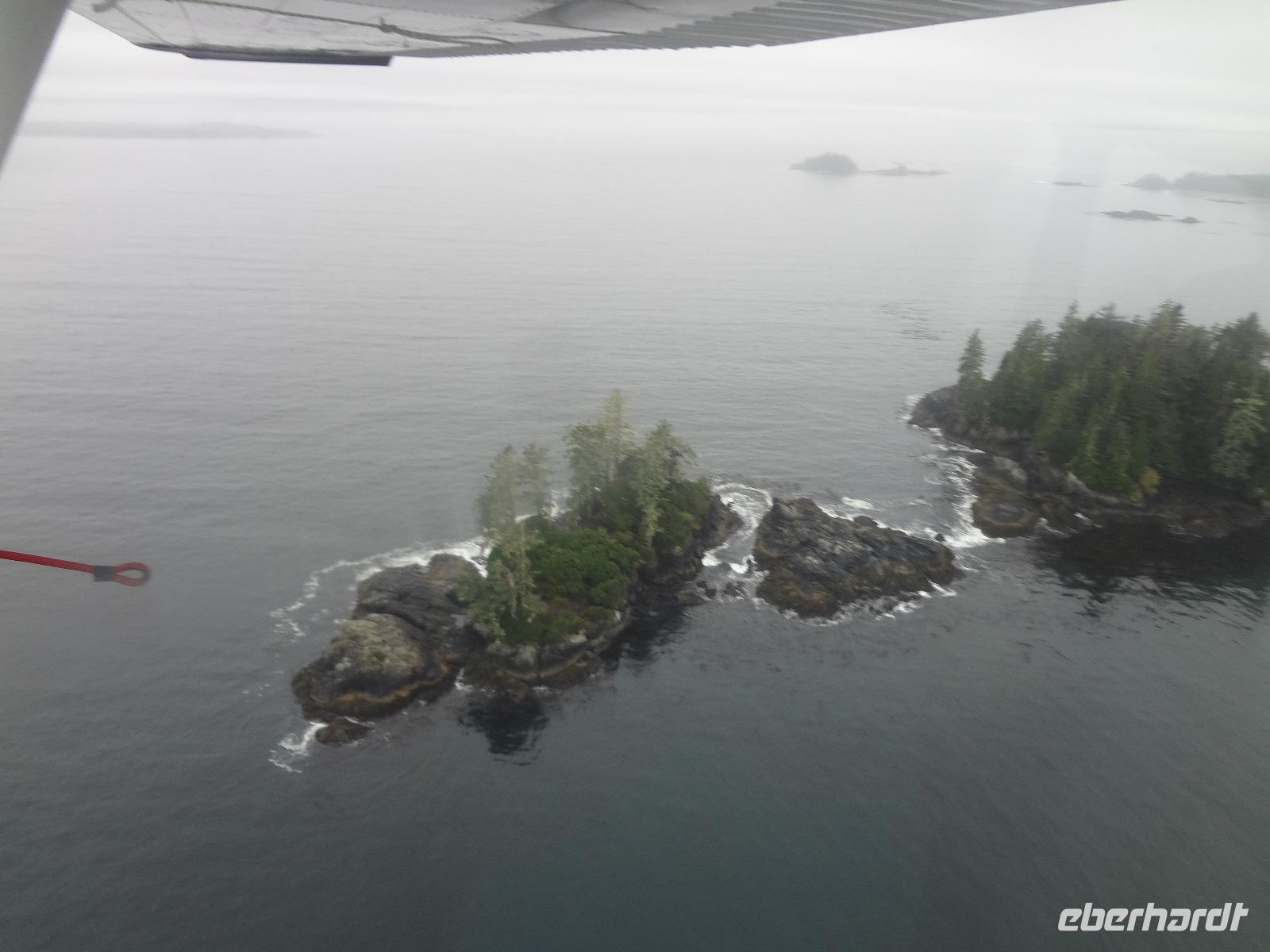 Es nieselt ein wenig wie es sich fuer einen Regenwald gehoert. So fahren wir nach dem Fruehstueck auch gleich los auf unsere erste Wanderung heute. In einem Urwald wandern wir auf einm Holzpfad an riesengrossen Westlichen Roten Zedern, Hemlock Tannen und Douglasien vorbei. Das Unterholz ist bedeckt mit Moos, Farnen, Stinkkohl und feinen Bueschen mit kleinen roten Beerchen drauf. Wir sehen auch des Teufels Schlagstock, die Devil's Club Pflanze kann sich sehr gut gegen die Hirsche wehren, die ihre Blume und Beeren fressen moechten. Da sie jedoch mit tausenden versteckten Nadeln vesehen ist, ist sie vor dem Verzehr geschuetzt. Wir staunen ueber die wunderbare Natur und stellen uns immer wieder neben die Riesenbaeume wohl, damit wir schlanker ausschauen. Unsere Kameras laufen wieder auf Hochtouren. Auf einmal aber, stehen wir wieder vor unserem Bus, wir sind einen Rundweg gegangen. In Tofino fahren wir vorerst durch das Surferdorf und halten auch beim Supermarkt an um unser Mittagessen einzukaufen. Auch heute, werden wir zu Mittag an einem ausgefallenen Ort sein. Dieses Mal fahren wir mit einem Privatschiff von Tofino nach Maquinna Park. Wir sehen unterwegs einige Otter die auf dem Ruecken schwimmen und sich von dem feinen Regen berieseln lassen. Ein Otter aber ist heute ganz besonders zum Spiele aufgelegt. Er springt immer wieder aus dem Wasser um danach Walfisch zu spielen und seine klitzekleine Schwanzflosse zu zeigen. Suess. Auf einem Felsen ruhen auch einige Robben, es sind Hafen Robben, sie sind hell und man sieht sie sehr gut auf dem duckeln Fels. Die Moeven wollen die Robben verjagen, denn sie stuerzen sich immer wieder flugs auf die Robben, bis die nicht endlich den Fels freigeben. Einen Moevensieg, haben sie errungen. Bei Maquinna Park angekommen, verabschieden wir uns von Chris und Sarah, den beiden Kapitaenen, ehe wir unser Picknick unter Dach einnehmen. Die Wanderung zu den Heissen Quellen ist auch wieder auf einem Holzweg. Auch hier ist der Wald unberuehrt und alles glizert, wenn Licht sich durch die vielen Baeume durchzwaengen kann. Nach einer Stunde sind wir bei den Quellen, nun heisst es Badehose an und ab ins warme Nass. Fast alle goennen sich diese schwefelangereicherte Pause andere brauchen wir um die Fotos zu knipsen ! Nach ¼ Stunde ist die Haut fein und warm, die Fingerspitzen wie von einer Waschfrau ganz aufgeschwollen und wellig. Den Weg hinein gehen wir nun auch wieder zurueck und da hoeren wir auch schon unser Flugzeug. Denn heute fliegen wir mit einem Wasserflugzeug wieder zurueck nach Tofino. Die ersten sechs unter uns, sitzen in einem Beaver und drei weitere in einer Wasser-Chessna. Wir sind eine groessere Gruppe, also kommt der Beaver und die Chessna nach ½ Stunde wieder zurueck und holt den Rest der Gruppe ab. Da wir heute keinen Sonnenschein haben, fliegen wir auch sehr niedrig und wir koennen so, jeden Fisch und sogar einen Baeren von oben sehen. Was fuer ein Abenteuer, einfach herrlich mit so einem Wasserflugzeug zu fliegen. Der Tag ist aber noch lange nicht aus. Wir wollen noch einen Strandspaziergang machen und danach das Lachs-Abendessen geniessen. Am Strand lernen wir die Pflanze Kelp kennen und betrachten auch die riesengrossen Muscheln die es hier anschwemmt. Viel Holz ziert auch die BC Straende und Surfer spielen mit den Wellen. Einen vollen, langen und eindruecklichen Tag haben wir heute erlebt, wir werden alles unseren Kissen erzaehlen.
