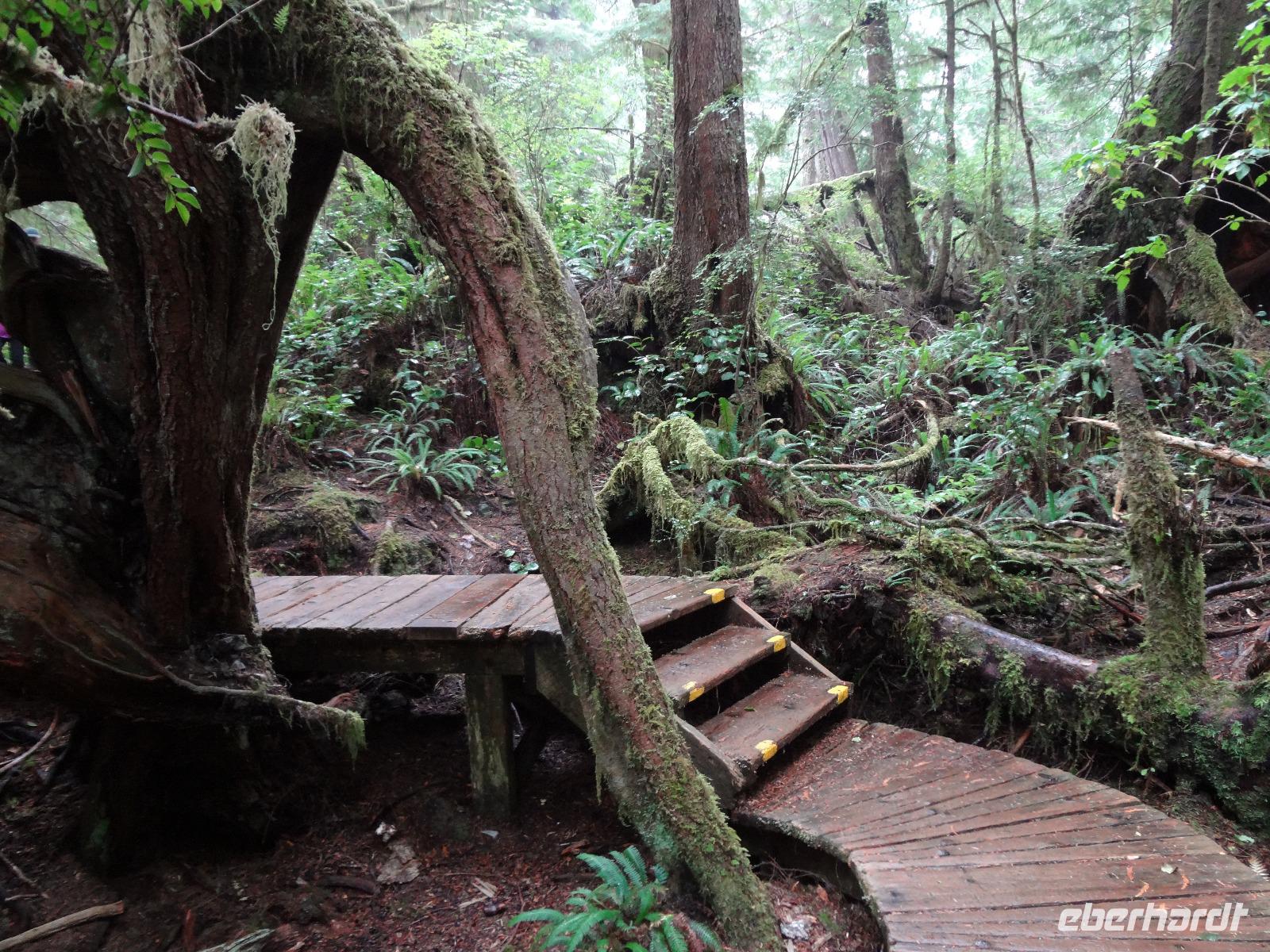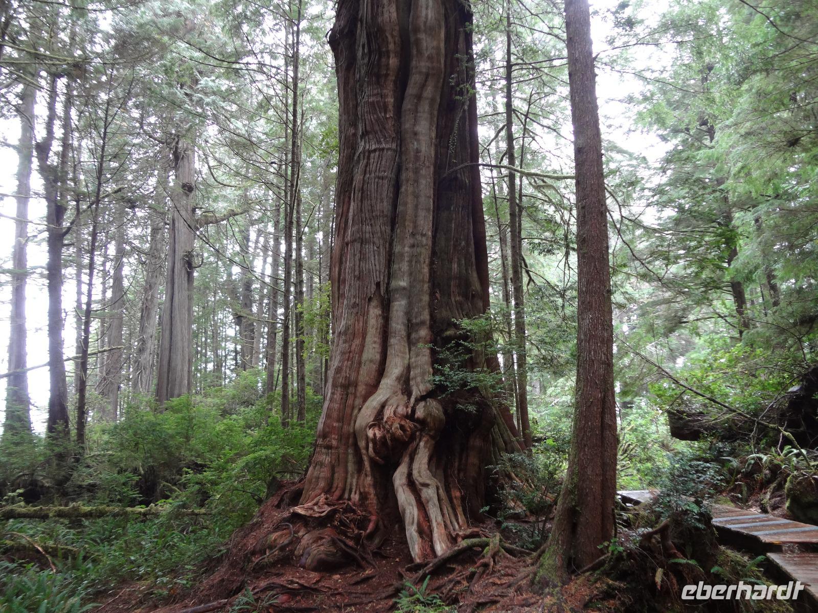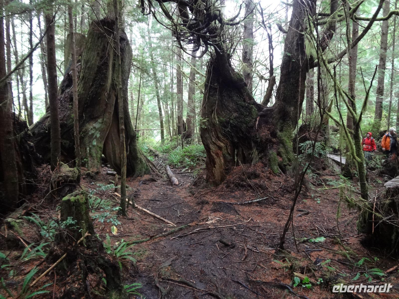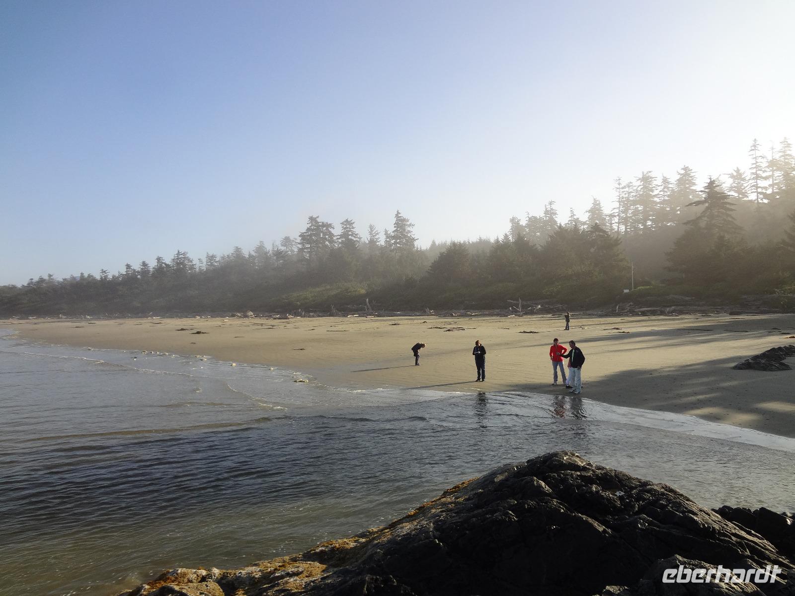 Es nieselt ein wenig wie es sich fuer einen Regenwald gehoert. So fahren wir nach dem Fruehstueck auch gleich los auf unsere erste Wanderung heute. In einem Urwald wandern wir auf einm Holzpfad an riesengrossen Westlichen Roten Zedern, Hemlock Tannen und Douglasien vorbei. Das Unterholz ist bedeckt mit Moos, Farnen, Stinkkohl und feinen Bueschen mit kleinen roten Beerchen drauf. Wir sehen auch des Teufels Schlagstock, die Devil's Club Pflanze kann sich sehr gut gegen die Hirsche wehren, die ihre Blume und Beeren fressen moechten. Da sie jedoch mit tausenden versteckten Nadeln vesehen ist, ist sie vor dem Verzehr geschuetzt. Wir staunen ueber die wunderbare Natur und stellen uns immer wieder neben die Riesenbaeume wohl, damit wir schlanker ausschauen. Unsere Kameras laufen wieder auf Hochtouren. Auf einmal aber, stehen wir wieder vor unserem Bus, wir sind einen Rundweg gegangen. In Tofino fahren wir vorerst durch das Surferdorf und halten auch beim Supermarkt an um unser Mittagessen einzukaufen. Auch heute, werden wir zu Mittag an einem ausgefallenen Ort sein. Dieses Mal fahren wir mit einem Privatschiff von Tofino nach Maquinna Park. Wir sehen unterwegs einige Otter die auf dem Ruecken schwimmen und sich von dem feinen Regen berieseln lassen. Ein Otter aber ist heute ganz besonders zum Spiele aufgelegt. Er springt immer wieder aus dem Wasser um danach Walfisch zu spielen und seine klitzekleine Schwanzflosse zu zeigen. Suess. Auf einem Felsen ruhen auch einige Robben, es sind Hafen Robben, sie sind hell und man sieht sie sehr gut auf dem duckeln Fels. Die Moeven wollen die Robben verjagen, denn sie stuerzen sich immer wieder flugs auf die Robben, bis die nicht endlich den Fels freigeben. Einen Moevensieg, haben sie errungen. Bei Maquinna Park angekommen, verabschieden wir uns von Chris und Sarah, den beiden Kapitaenen, ehe wir unser Picknick unter Dach einnehmen. Die Wanderung zu den Heissen Quellen ist auch wieder auf einem Holzweg. Auch hier ist der Wald unberuehrt und alles glizert, wenn Licht sich durch die vielen Baeume durchzwaengen kann. Nach einer Stunde sind wir bei den Quellen, nun heisst es Badehose an und ab ins warme Nass. Fast alle goennen sich diese schwefelangereicherte Pause andere brauchen wir um die Fotos zu knipsen ! Nach ¼ Stunde ist die Haut fein und warm, die Fingerspitzen wie von einer Waschfrau ganz aufgeschwollen und wellig. Den Weg hinein gehen wir nun auch wieder zurueck und da hoeren wir auch schon unser Flugzeug. Denn heute fliegen wir mit einem Wasserflugzeug wieder zurueck nach Tofino. Die ersten sechs unter uns, sitzen in einem Beaver und drei weitere in einer Wasser-Chessna. Wir sind eine groessere Gruppe, also kommt der Beaver und die Chessna nach ½ Stunde wieder zurueck und holt den Rest der Gruppe ab. Da wir heute keinen Sonnenschein haben, fliegen wir auch sehr niedrig und wir koennen so, jeden Fisch und sogar einen Baeren von oben sehen. Was fuer ein Abenteuer, einfach herrlich mit so einem Wasserflugzeug zu fliegen. Der Tag ist aber noch lange nicht aus. Wir wollen noch einen Strandspaziergang machen und danach das Lachs-Abendessen geniessen. Am Strand lernen wir die Pflanze Kelp kennen und betrachten auch die riesengrossen Muscheln die es hier anschwemmt. Viel Holz ziert auch die BC Straende und Surfer spielen mit den Wellen. Einen vollen, langen und eindruecklichen Tag haben wir heute erlebt, wir werden alles unseren Kissen erzaehlen.