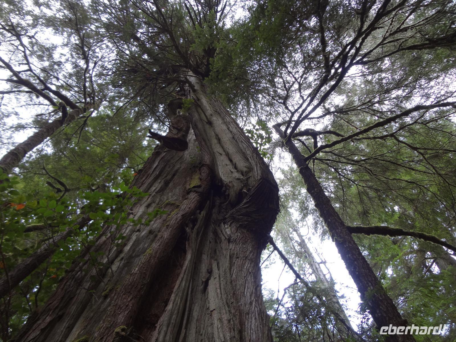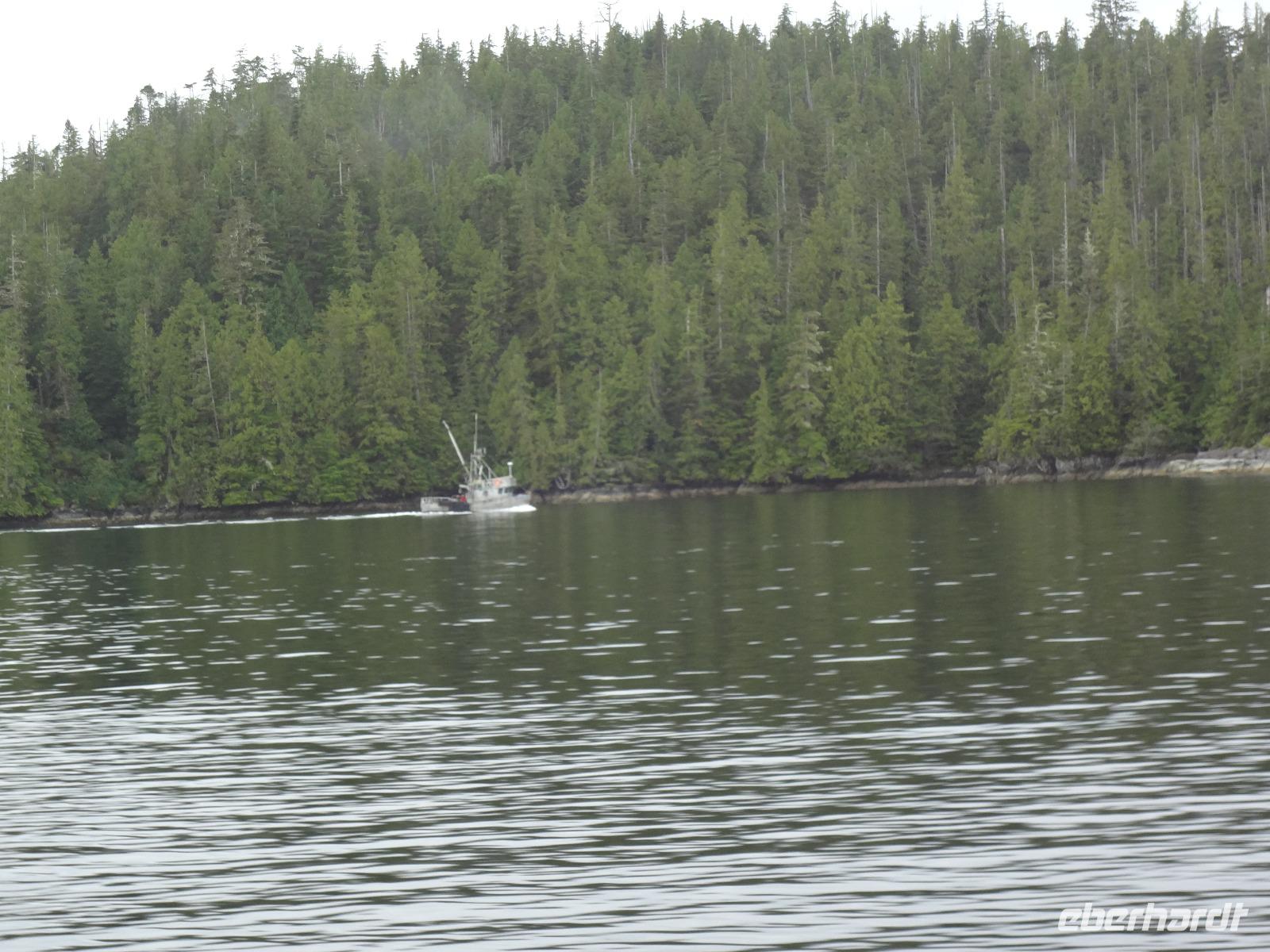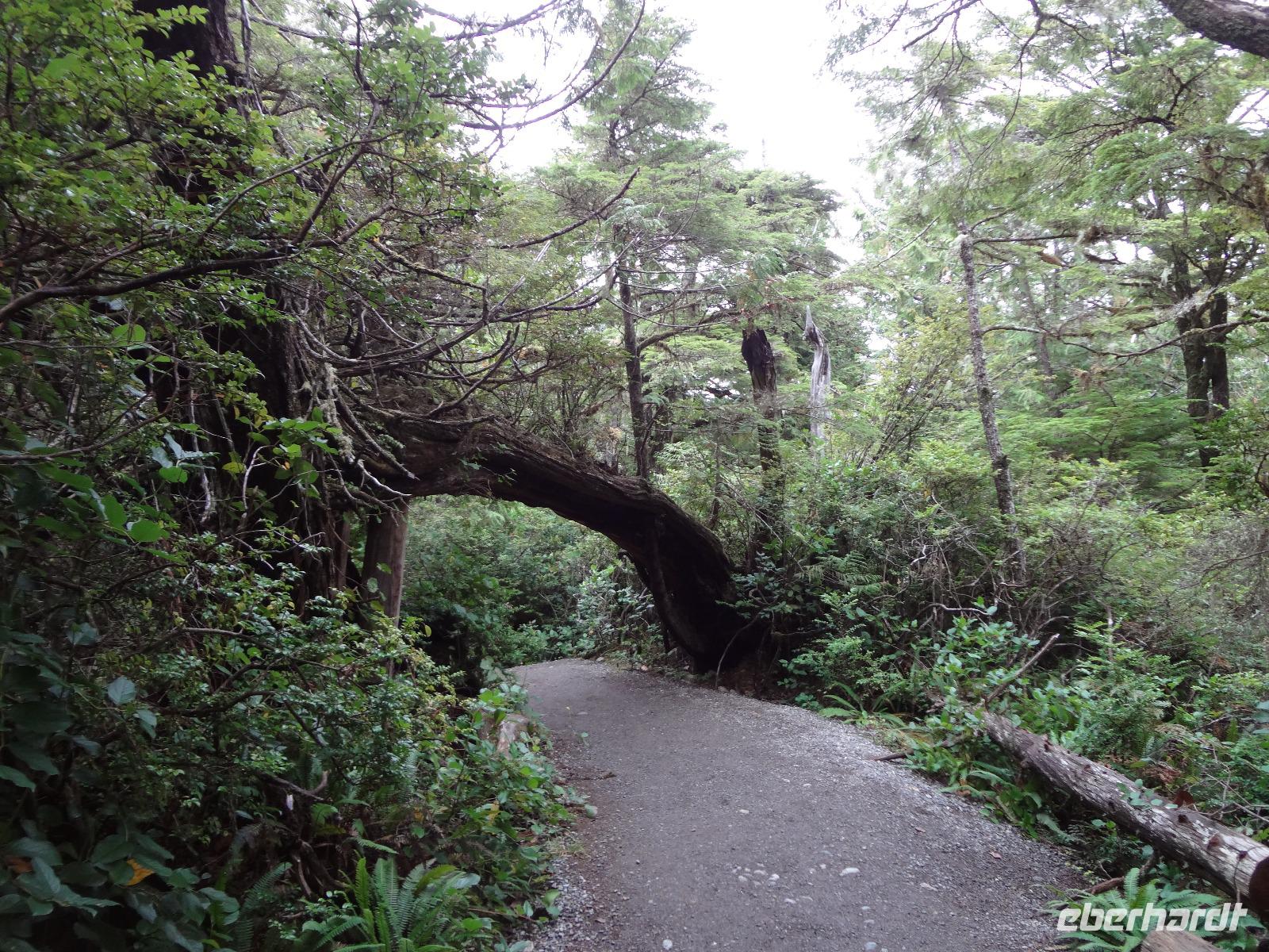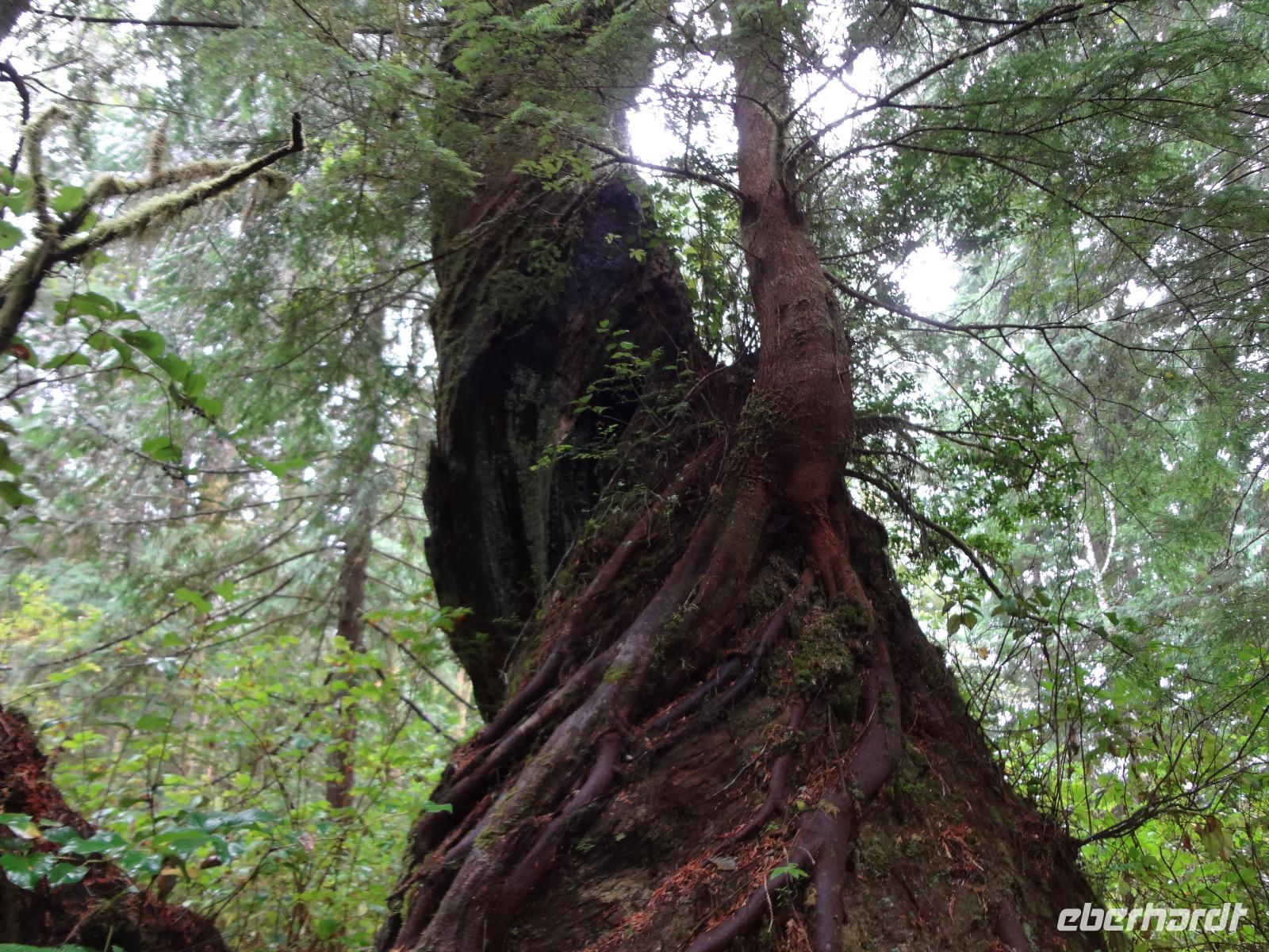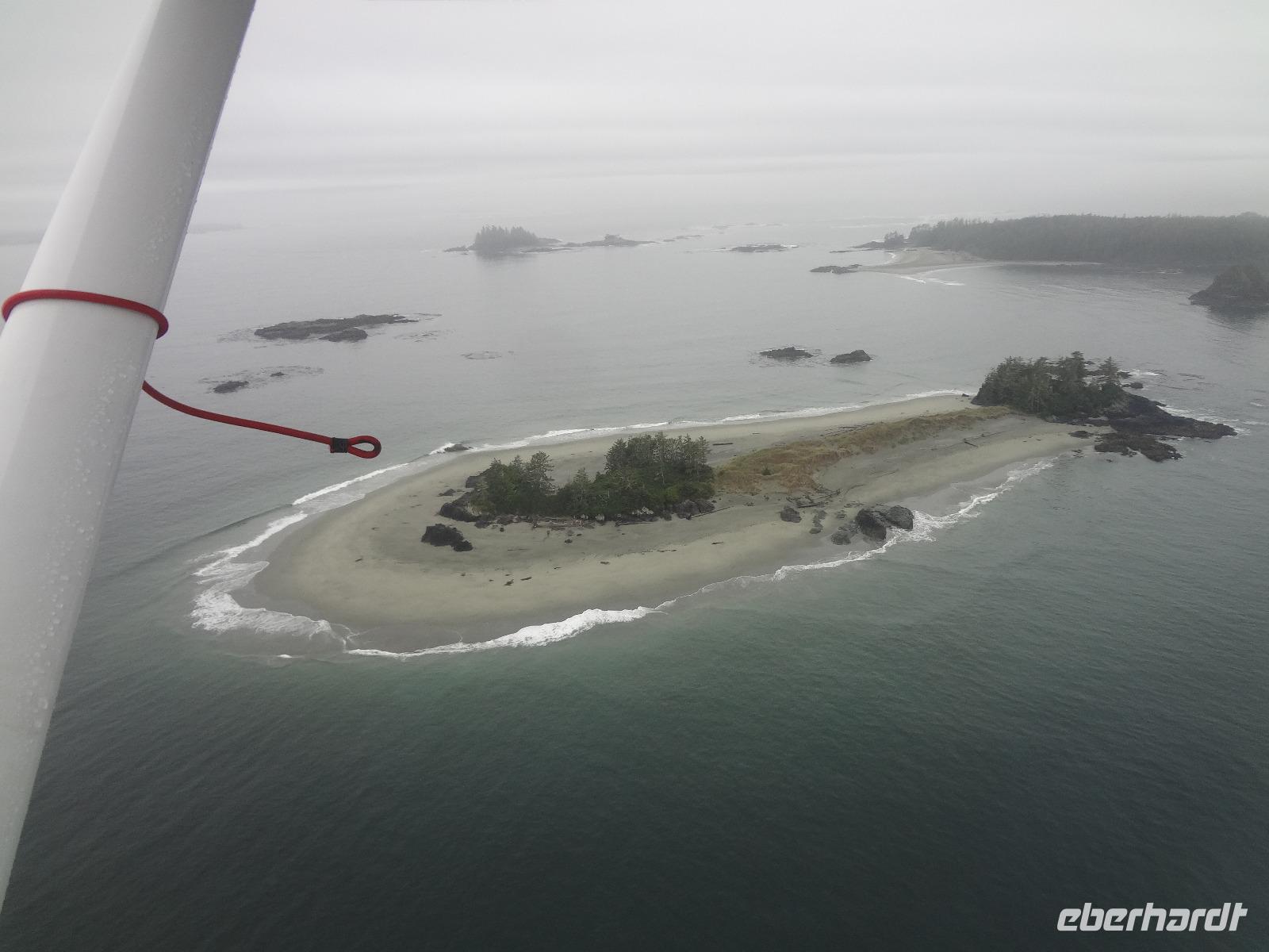 Es nieselt ein wenig wie es sich fuer einen Regenwald gehoert. So fahren wir nach dem Fruehstueck auch gleich los auf unsere erste Wanderung heute. In einem Urwald wandern wir auf einm Holzpfad an riesengrossen Westlichen Roten Zedern, Hemlock Tannen und Douglasien vorbei. Das Unterholz ist bedeckt mit Moos, Farnen, Stinkkohl und feinen Bueschen mit kleinen roten Beerchen drauf. Wir sehen auch des Teufels Schlagstock, die Devil's Club Pflanze kann sich sehr gut gegen die Hirsche wehren, die ihre Blume und Beeren fressen moechten. Da sie jedoch mit tausenden versteckten Nadeln vesehen ist, ist sie vor dem Verzehr geschuetzt. Wir staunen ueber die wunderbare Natur und stellen uns immer wieder neben die Riesenbaeume wohl, damit wir schlanker ausschauen. Unsere Kameras laufen wieder auf Hochtouren. Auf einmal aber, stehen wir wieder vor unserem Bus, wir sind einen Rundweg gegangen. In Tofino fahren wir vorerst durch das Surferdorf und halten auch beim Supermarkt an um unser Mittagessen einzukaufen. Auch heute, werden wir zu Mittag an einem ausgefallenen Ort sein. Dieses Mal fahren wir mit einem Privatschiff von Tofino nach Maquinna Park. Wir sehen unterwegs einige Otter die auf dem Ruecken schwimmen und sich von dem feinen Regen berieseln lassen. Ein Otter aber ist heute ganz besonders zum Spiele aufgelegt. Er springt immer wieder aus dem Wasser um danach Walfisch zu spielen und seine klitzekleine Schwanzflosse zu zeigen. Suess. Auf einem Felsen ruhen auch einige Robben, es sind Hafen Robben, sie sind hell und man sieht sie sehr gut auf dem duckeln Fels. Die Moeven wollen die Robben verjagen, denn sie stuerzen sich immer wieder flugs auf die Robben, bis die nicht endlich den Fels freigeben. Einen Moevensieg, haben sie errungen. Bei Maquinna Park angekommen, verabschieden wir uns von Chris und Sarah, den beiden Kapitaenen, ehe wir unser Picknick unter Dach einnehmen. Die Wanderung zu den Heissen Quellen ist auch wieder auf einem Holzweg. Auch hier ist der Wald unberuehrt und alles glizert, wenn Licht sich durch die vielen Baeume durchzwaengen kann. Nach einer Stunde sind wir bei den Quellen, nun heisst es Badehose an und ab ins warme Nass. Fast alle goennen sich diese schwefelangereicherte Pause andere brauchen wir um die Fotos zu knipsen ! Nach ¼ Stunde ist die Haut fein und warm, die Fingerspitzen wie von einer Waschfrau ganz aufgeschwollen und wellig. Den Weg hinein gehen wir nun auch wieder zurueck und da hoeren wir auch schon unser Flugzeug. Denn heute fliegen wir mit einem Wasserflugzeug wieder zurueck nach Tofino. Die ersten sechs unter uns, sitzen in einem Beaver und drei weitere in einer Wasser-Chessna. Wir sind eine groessere Gruppe, also kommt der Beaver und die Chessna nach ½ Stunde wieder zurueck und holt den Rest der Gruppe ab. Da wir heute keinen Sonnenschein haben, fliegen wir auch sehr niedrig und wir koennen so, jeden Fisch und sogar einen Baeren von oben sehen. Was fuer ein Abenteuer, einfach herrlich mit so einem Wasserflugzeug zu fliegen. Der Tag ist aber noch lange nicht aus. Wir wollen noch einen Strandspaziergang machen und danach das Lachs-Abendessen geniessen. Am Strand lernen wir die Pflanze Kelp kennen und betrachten auch die riesengrossen Muscheln die es hier anschwemmt. Viel Holz ziert auch die BC Straende und Surfer spielen mit den Wellen. Einen vollen, langen und eindruecklichen Tag haben wir heute erlebt, wir werden alles unseren Kissen erzaehlen.