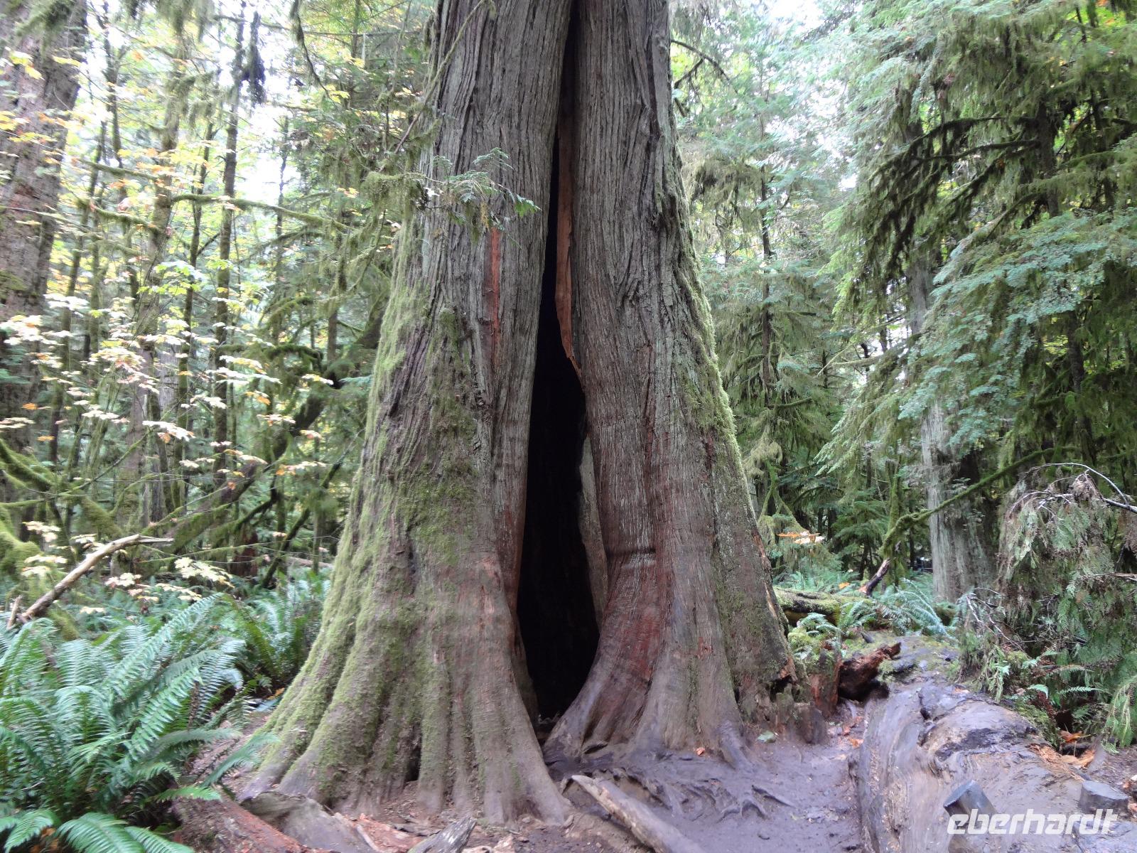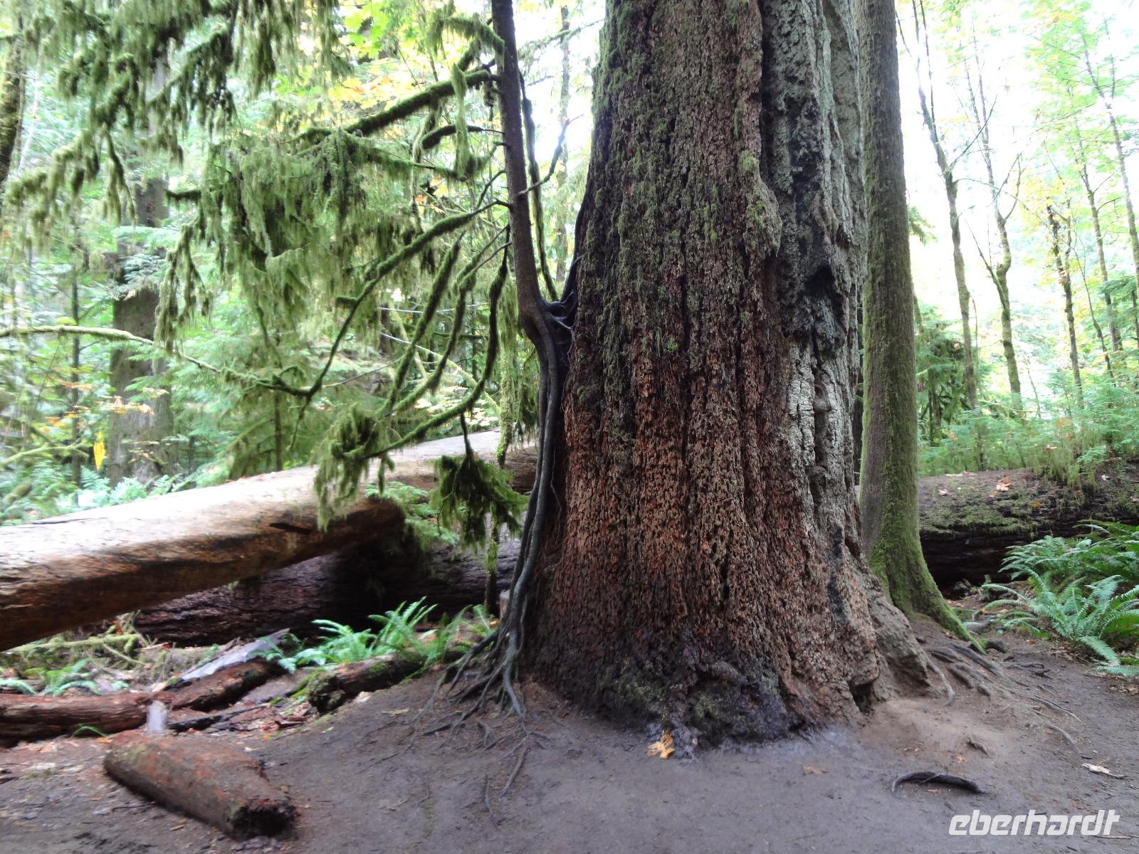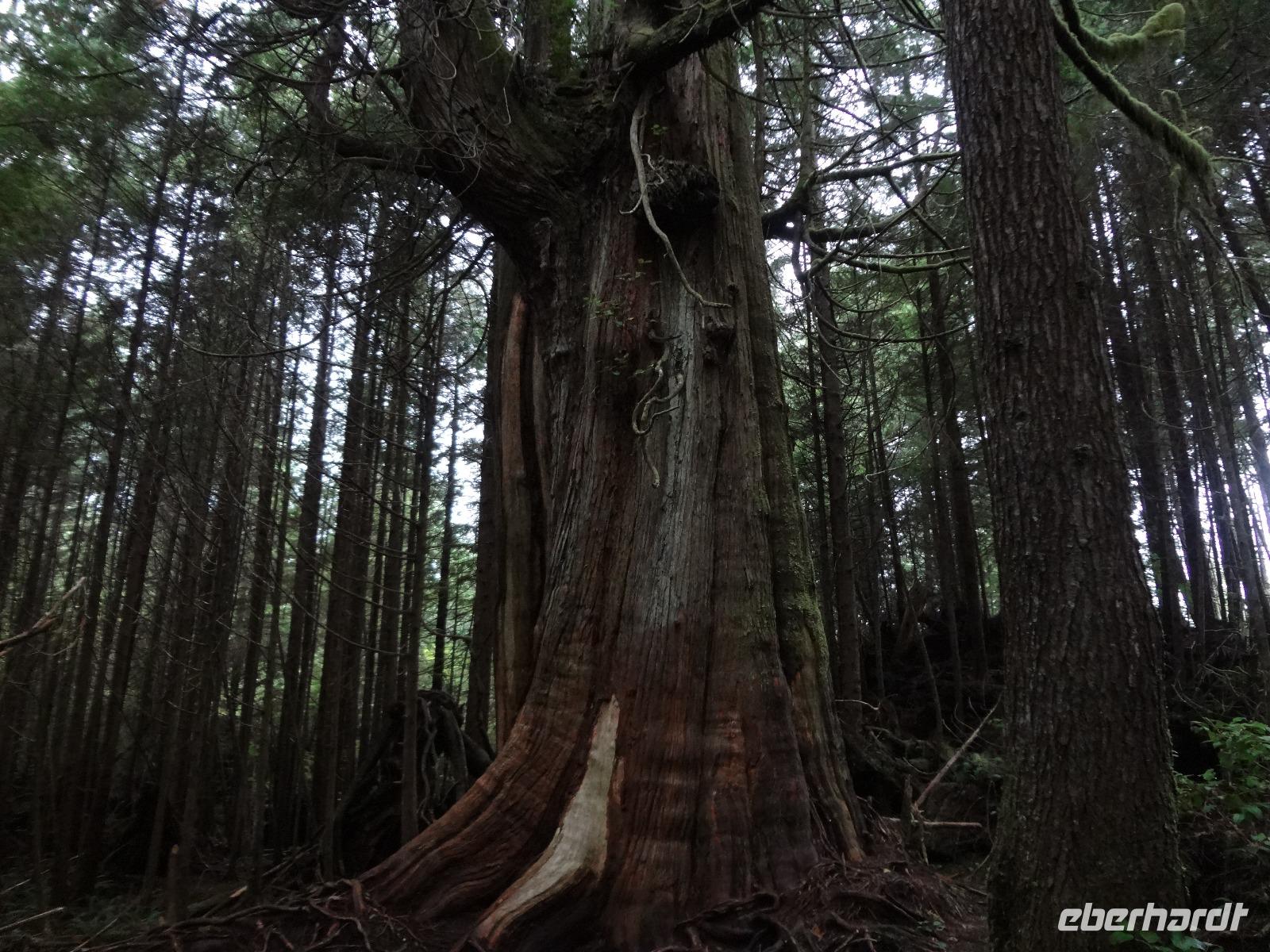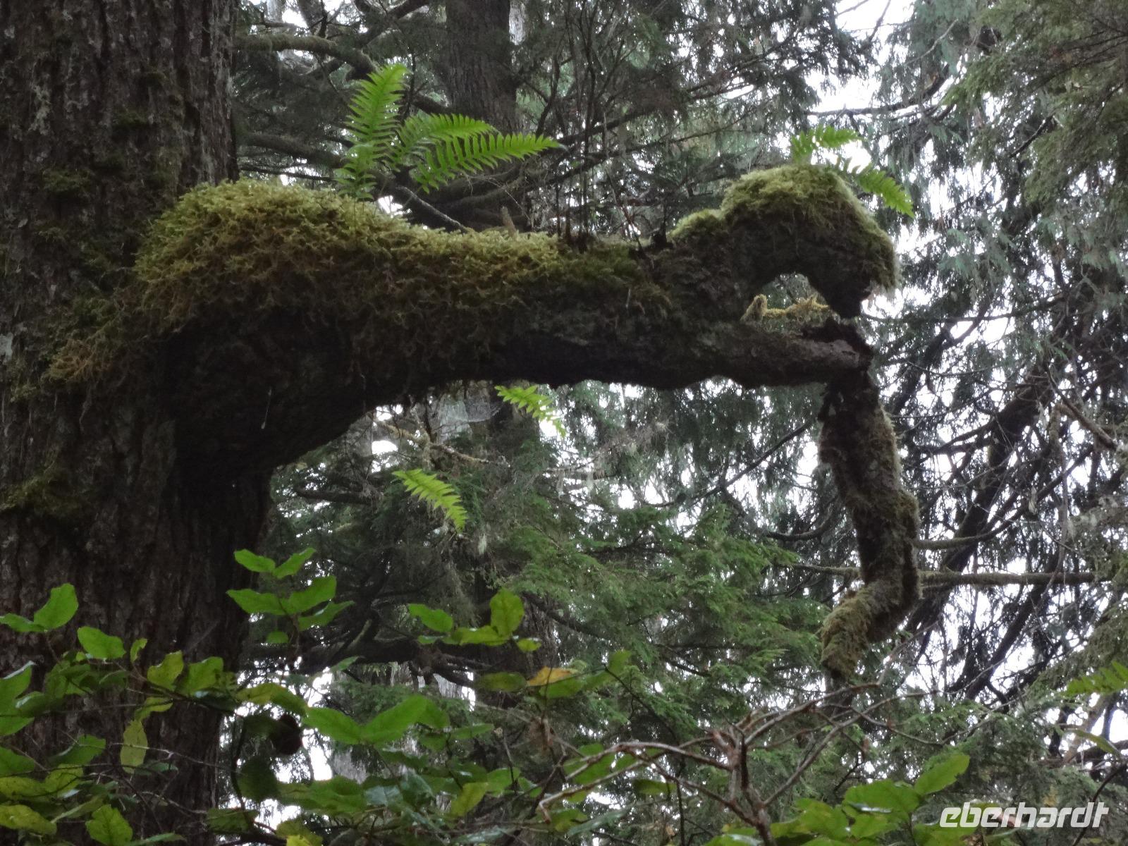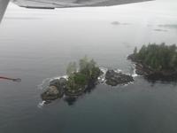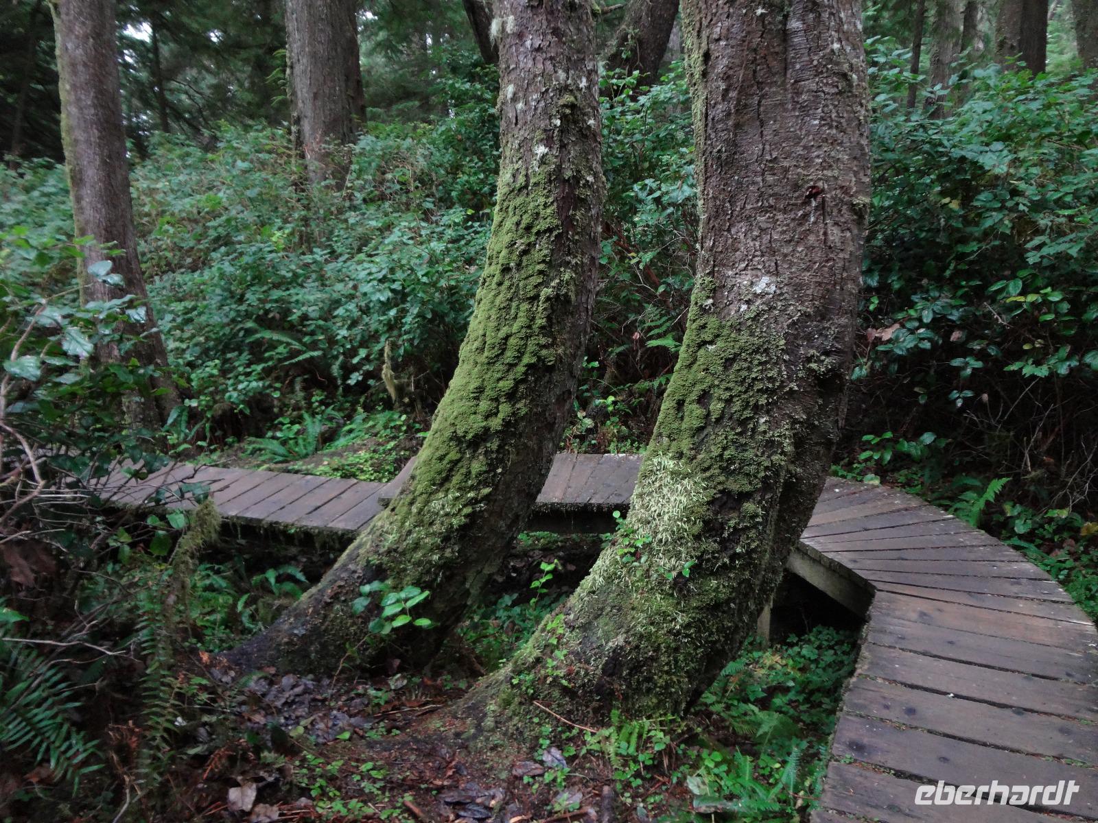 Es nieselt ein wenig wie es sich fuer einen Regenwald gehoert. So fahren wir nach dem Fruehstueck auch gleich los auf unsere erste Wanderung heute. In einem Urwald wandern wir auf einm Holzpfad an riesengrossen Westlichen Roten Zedern, Hemlock Tannen und Douglasien vorbei. Das Unterholz ist bedeckt mit Moos, Farnen, Stinkkohl und feinen Bueschen mit kleinen roten Beerchen drauf. Wir sehen auch des Teufels Schlagstock, die Devil's Club Pflanze kann sich sehr gut gegen die Hirsche wehren, die ihre Blume und Beeren fressen moechten. Da sie jedoch mit tausenden versteckten Nadeln vesehen ist, ist sie vor dem Verzehr geschuetzt. Wir staunen ueber die wunderbare Natur und stellen uns immer wieder neben die Riesenbaeume wohl, damit wir schlanker ausschauen. Unsere Kameras laufen wieder auf Hochtouren. Auf einmal aber, stehen wir wieder vor unserem Bus, wir sind einen Rundweg gegangen. In Tofino fahren wir vorerst durch das Surferdorf und halten auch beim Supermarkt an um unser Mittagessen einzukaufen. Auch heute, werden wir zu Mittag an einem ausgefallenen Ort sein. Dieses Mal fahren wir mit einem Privatschiff von Tofino nach Maquinna Park. Wir sehen unterwegs einige Otter die auf dem Ruecken schwimmen und sich von dem feinen Regen berieseln lassen. Ein Otter aber ist heute ganz besonders zum Spiele aufgelegt. Er springt immer wieder aus dem Wasser um danach Walfisch zu spielen und seine klitzekleine Schwanzflosse zu zeigen. Suess. Auf einem Felsen ruhen auch einige Robben, es sind Hafen Robben, sie sind hell und man sieht sie sehr gut auf dem duckeln Fels. Die Moeven wollen die Robben verjagen, denn sie stuerzen sich immer wieder flugs auf die Robben, bis die nicht endlich den Fels freigeben. Einen Moevensieg, haben sie errungen. Bei Maquinna Park angekommen, verabschieden wir uns von Chris und Sarah, den beiden Kapitaenen, ehe wir unser Picknick unter Dach einnehmen. Die Wanderung zu den Heissen Quellen ist auch wieder auf einem Holzweg. Auch hier ist der Wald unberuehrt und alles glizert, wenn Licht sich durch die vielen Baeume durchzwaengen kann. Nach einer Stunde sind wir bei den Quellen, nun heisst es Badehose an und ab ins warme Nass. Fast alle goennen sich diese schwefelangereicherte Pause andere brauchen wir um die Fotos zu knipsen ! Nach ¼ Stunde ist die Haut fein und warm, die Fingerspitzen wie von einer Waschfrau ganz aufgeschwollen und wellig. Den Weg hinein gehen wir nun auch wieder zurueck und da hoeren wir auch schon unser Flugzeug. Denn heute fliegen wir mit einem Wasserflugzeug wieder zurueck nach Tofino. Die ersten sechs unter uns, sitzen in einem Beaver und drei weitere in einer Wasser-Chessna. Wir sind eine groessere Gruppe, also kommt der Beaver und die Chessna nach ½ Stunde wieder zurueck und holt den Rest der Gruppe ab. Da wir heute keinen Sonnenschein haben, fliegen wir auch sehr niedrig und wir koennen so, jeden Fisch und sogar einen Baeren von oben sehen. Was fuer ein Abenteuer, einfach herrlich mit so einem Wasserflugzeug zu fliegen. Der Tag ist aber noch lange nicht aus. Wir wollen noch einen Strandspaziergang machen und danach das Lachs-Abendessen geniessen. Am Strand lernen wir die Pflanze Kelp kennen und betrachten auch die riesengrossen Muscheln die es hier anschwemmt. Viel Holz ziert auch die BC Straende und Surfer spielen mit den Wellen. Einen vollen, langen und eindruecklichen Tag haben wir heute erlebt, wir werden alles unseren Kissen erzaehlen.
