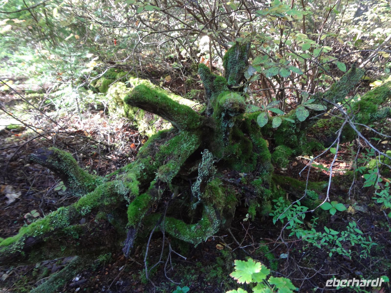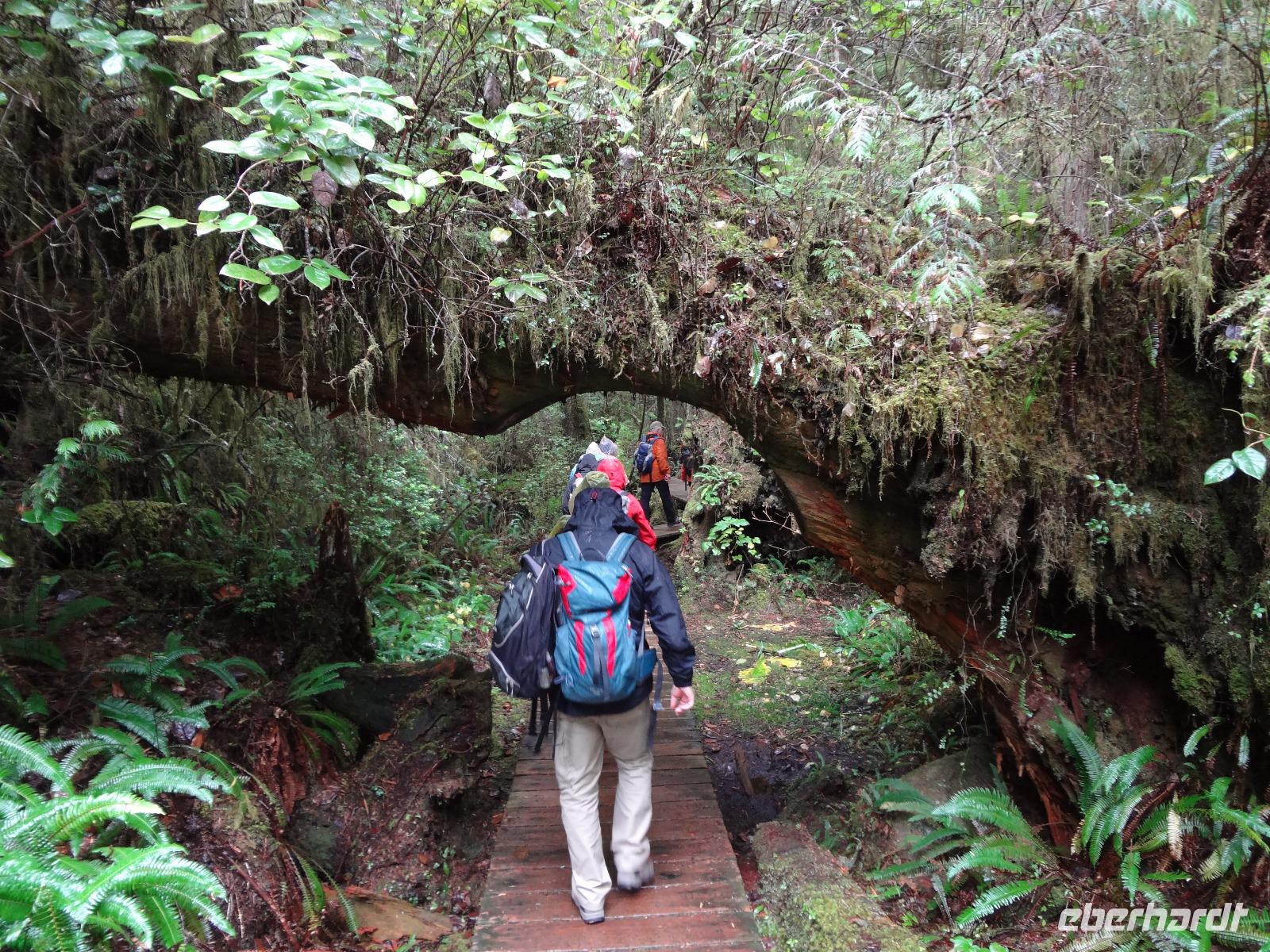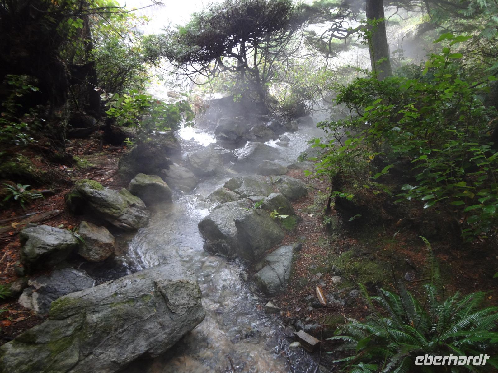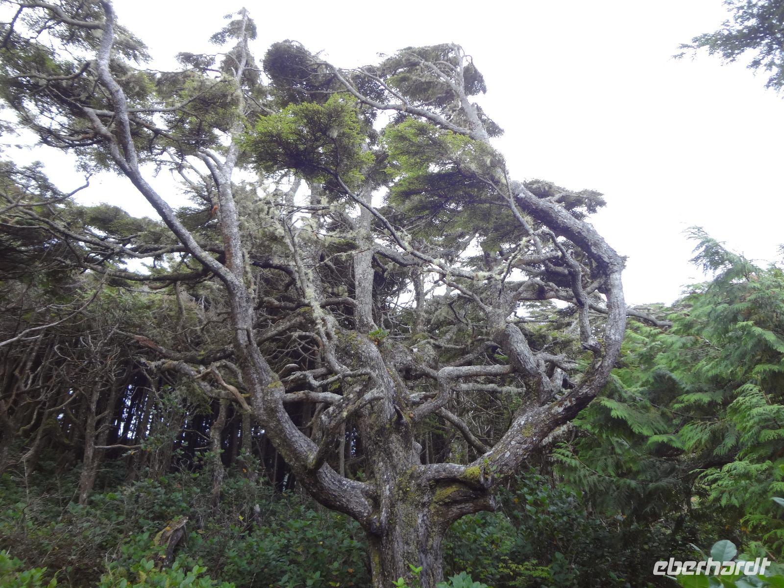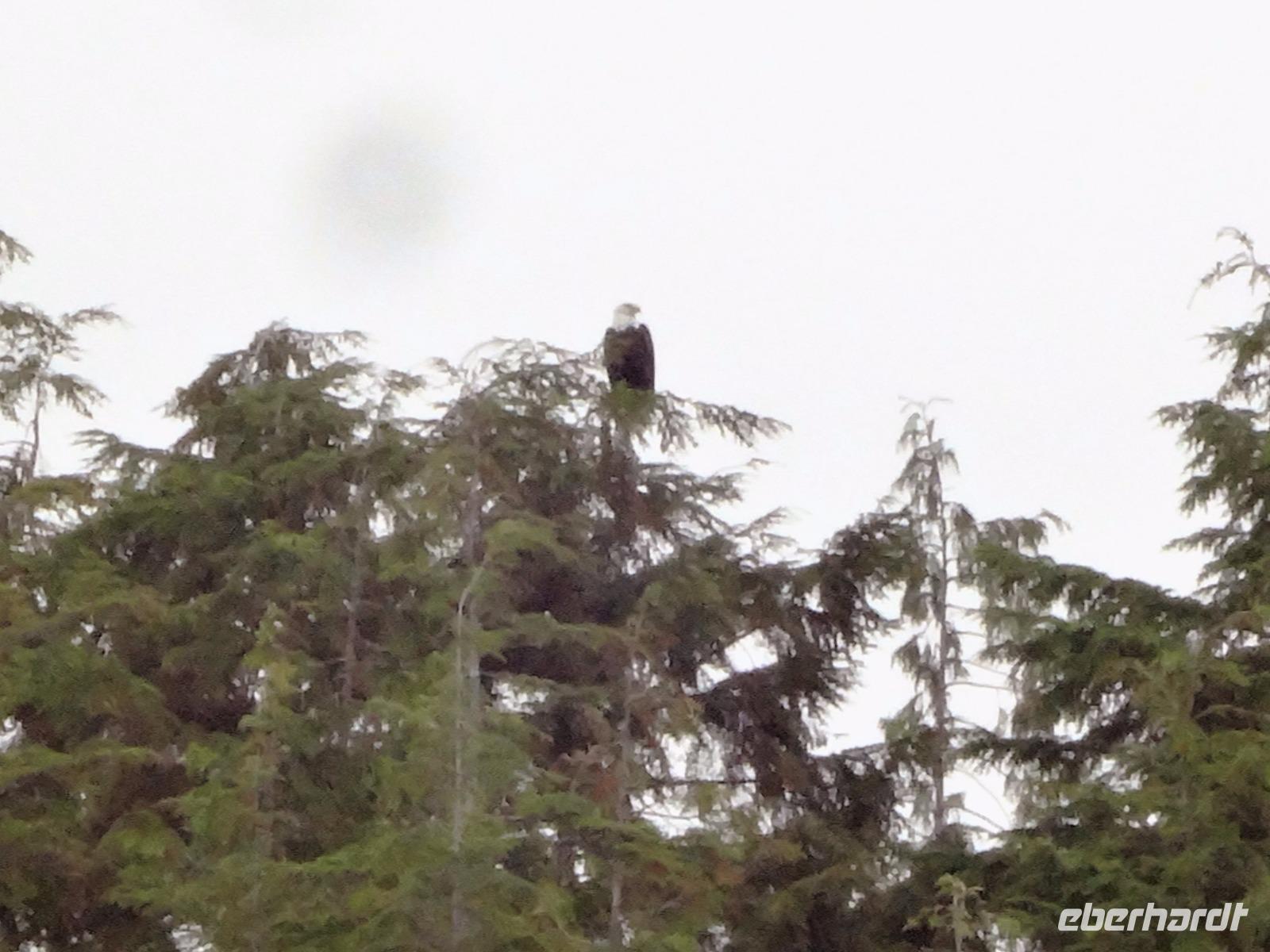 Es nieselt ein wenig wie es sich fuer einen Regenwald gehoert. So fahren wir nach dem Fruehstueck auch gleich los auf unsere erste Wanderung heute. In einem Urwald wandern wir auf einm Holzpfad an riesengrossen Westlichen Roten Zedern, Hemlock Tannen und Douglasien vorbei. Das Unterholz ist bedeckt mit Moos, Farnen, Stinkkohl und feinen Bueschen mit kleinen roten Beerchen drauf. Wir sehen auch des Teufels Schlagstock, die Devil's Club Pflanze kann sich sehr gut gegen die Hirsche wehren, die ihre Blume und Beeren fressen moechten. Da sie jedoch mit tausenden versteckten Nadeln vesehen ist, ist sie vor dem Verzehr geschuetzt. Wir staunen ueber die wunderbare Natur und stellen uns immer wieder neben die Riesenbaeume wohl, damit wir schlanker ausschauen. Unsere Kameras laufen wieder auf Hochtouren. Auf einmal aber, stehen wir wieder vor unserem Bus, wir sind einen Rundweg gegangen. In Tofino fahren wir vorerst durch das Surferdorf und halten auch beim Supermarkt an um unser Mittagessen einzukaufen. Auch heute, werden wir zu Mittag an einem ausgefallenen Ort sein. Dieses Mal fahren wir mit einem Privatschiff von Tofino nach Maquinna Park. Wir sehen unterwegs einige Otter die auf dem Ruecken schwimmen und sich von dem feinen Regen berieseln lassen. Ein Otter aber ist heute ganz besonders zum Spiele aufgelegt. Er springt immer wieder aus dem Wasser um danach Walfisch zu spielen und seine klitzekleine Schwanzflosse zu zeigen. Suess. Auf einem Felsen ruhen auch einige Robben, es sind Hafen Robben, sie sind hell und man sieht sie sehr gut auf dem duckeln Fels. Die Moeven wollen die Robben verjagen, denn sie stuerzen sich immer wieder flugs auf die Robben, bis die nicht endlich den Fels freigeben. Einen Moevensieg, haben sie errungen. Bei Maquinna Park angekommen, verabschieden wir uns von Chris und Sarah, den beiden Kapitaenen, ehe wir unser Picknick unter Dach einnehmen. Die Wanderung zu den Heissen Quellen ist auch wieder auf einem Holzweg. Auch hier ist der Wald unberuehrt und alles glizert, wenn Licht sich durch die vielen Baeume durchzwaengen kann. Nach einer Stunde sind wir bei den Quellen, nun heisst es Badehose an und ab ins warme Nass. Fast alle goennen sich diese schwefelangereicherte Pause andere brauchen wir um die Fotos zu knipsen ! Nach ¼ Stunde ist die Haut fein und warm, die Fingerspitzen wie von einer Waschfrau ganz aufgeschwollen und wellig. Den Weg hinein gehen wir nun auch wieder zurueck und da hoeren wir auch schon unser Flugzeug. Denn heute fliegen wir mit einem Wasserflugzeug wieder zurueck nach Tofino. Die ersten sechs unter uns, sitzen in einem Beaver und drei weitere in einer Wasser-Chessna. Wir sind eine groessere Gruppe, also kommt der Beaver und die Chessna nach ½ Stunde wieder zurueck und holt den Rest der Gruppe ab. Da wir heute keinen Sonnenschein haben, fliegen wir auch sehr niedrig und wir koennen so, jeden Fisch und sogar einen Baeren von oben sehen. Was fuer ein Abenteuer, einfach herrlich mit so einem Wasserflugzeug zu fliegen. Der Tag ist aber noch lange nicht aus. Wir wollen noch einen Strandspaziergang machen und danach das Lachs-Abendessen geniessen. Am Strand lernen wir die Pflanze Kelp kennen und betrachten auch die riesengrossen Muscheln die es hier anschwemmt. Viel Holz ziert auch die BC Straende und Surfer spielen mit den Wellen. Einen vollen, langen und eindruecklichen Tag haben wir heute erlebt, wir werden alles unseren Kissen erzaehlen.
