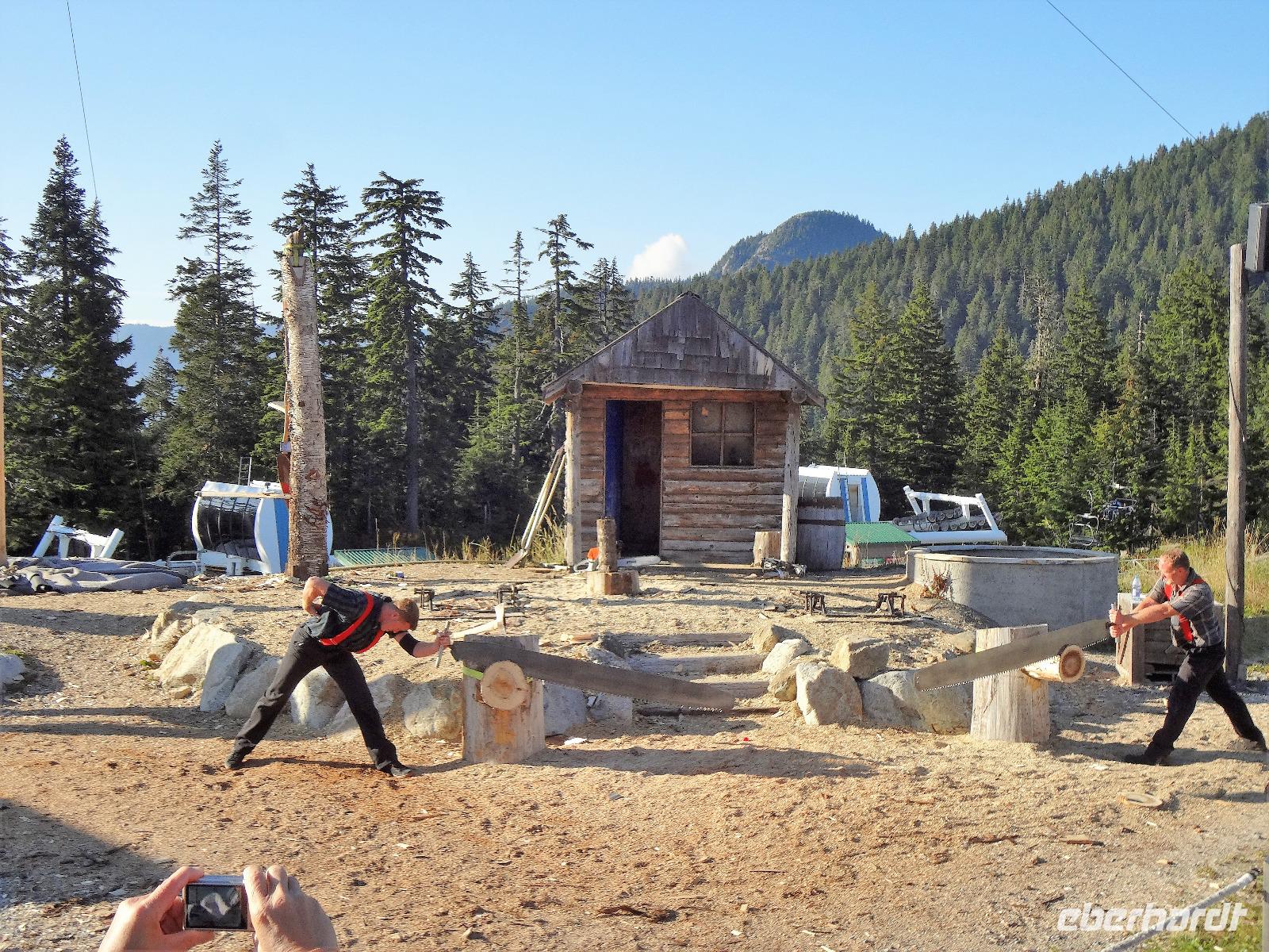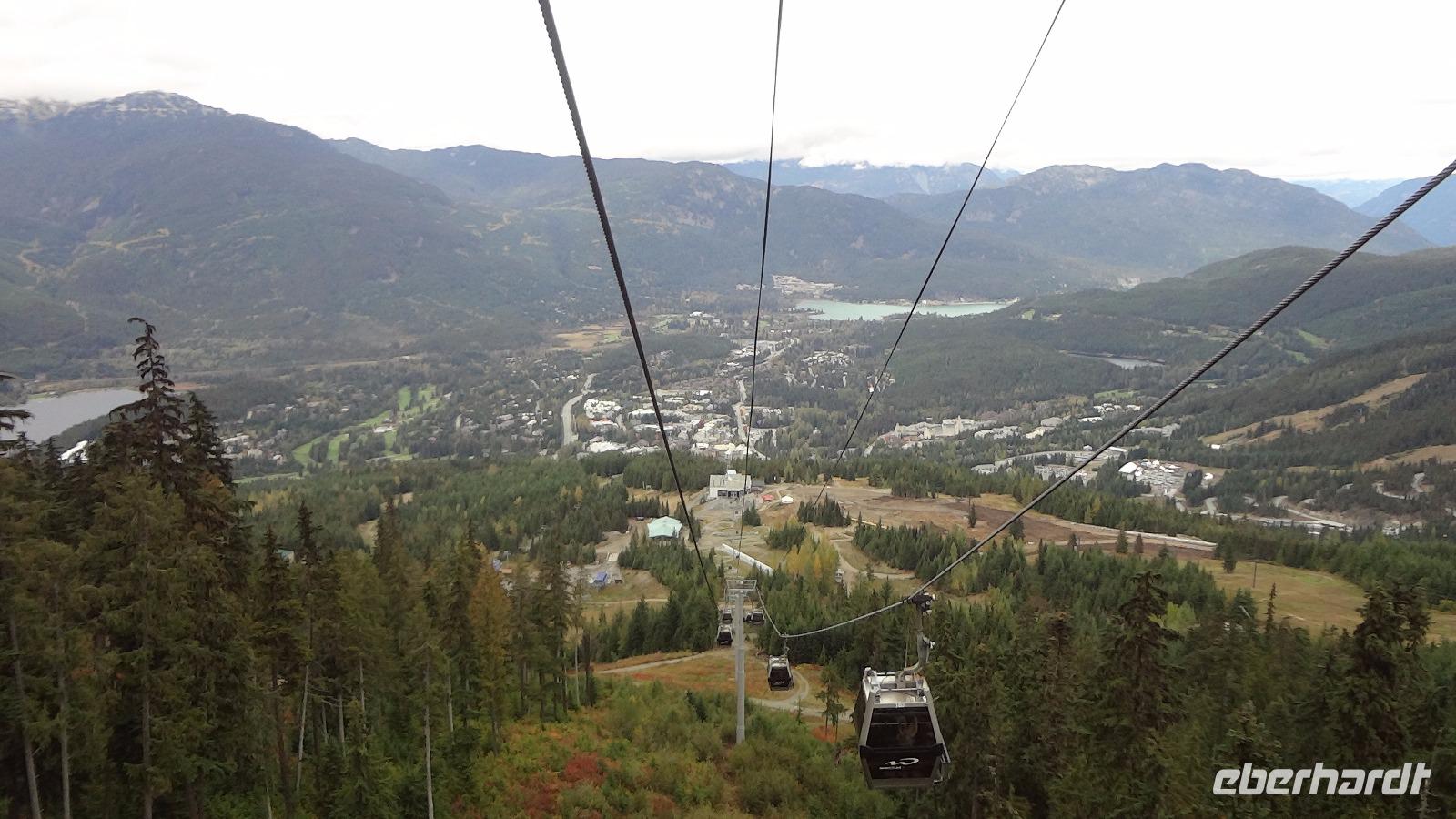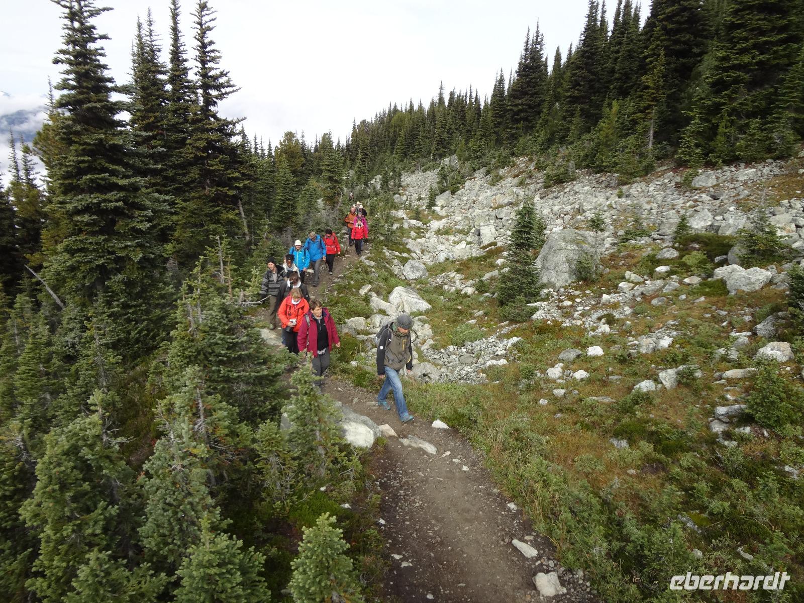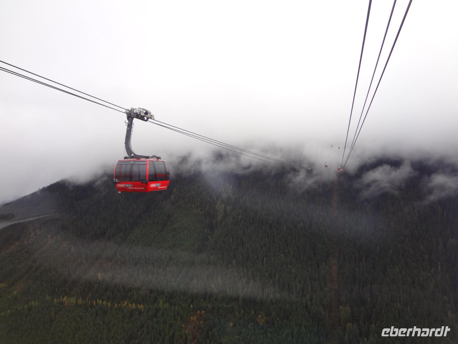 Heute duerfen wir eine halbe Stunde laenger schlafen.....da wir einen Whistler-Blackcomb Wandertag einschalten. Das Fruehstueck dauert zwar ewig bis es bestellt ist und noch eine Ewigkeit, bis es zubereitet und serviert wird. So hat das Wetter auch Zeit sich zu verbessern und wir gehen gut gelaunt zur Talstation der Whistler Gondel. Hier wird gerade ein Film gedreht und wir werden ganz schnell abgefertigt. Schon schweben wir in Gondeln die jeweils 8 Personen fassen koennen. 20 Minuten dauert diese Fahrt unterdessen hoeren wir einige Whistler Skigeschichten und schauen gespannt in die Tiefe wo die Downhill Biker, Kopf und Kragen aufs Spiel setzen um mit so einem Drahtesel so schnell wie moeglich den steilen Berg hinunter zu flitzen. Ausschauen tun sie wie mittelalterliche Krieger die sich gerade durch den Schlamm gekaempft haben. Durch die erste Wolkendecke sind wir durchgeschwebt und nun sind wir auf Whistler Mountain oben. Ein fantastischer Blick auf die Bergspitzen, die Gletscher und einen kleinen Stausee tut sich vor unseren Augen auf. Da die Wolke jedoch hochkommen moechte, entscheiden wir uns, gleich auf Blackcomb hinueber zu schweben. WOW, wir sitzen in der laengsten Seilbahn der Welt mit der laengsten Spanne. Wir fliegen von einem Berg zum andern in einer dicken Wolke gehuellt. Auf Blackcomb aber, blaest ein zarter Hauch von Wind und alsbald ist die Sicht wieder frei. Auf gehts, die Wanderung zum Balckcomb Lake wartet schon auf uns. Es ist ein sehr schoener Weg, etwas eng, durch Wald und ueber Pisten mit herrlicher Aussicht auf Whistler Mountain und sogar auf den Black Tusk. Beim See machen wir Pause ehe wir denselben Weg zurueck nehmen. Nun schaut die Welt wieder ganz neu aus und wir reden und lachen viel ueber verschiedene Themen. Zurueck in Whistler, wollen die einen zu Lost Lake spazieren, andere wollen einkaufen gehen und die meisten wollen einfach das Dorf mit seinem Musik festival geniessen. Wir sehen uns alle wieder zum Abendessen im La Boca, wo uns die Vorspeise und das Dessert sehr gut schmecken, die Pasta dazwischen, als Hauptgericht, jedoch etwas weniger. Heute ist Samstag, da ist im Dorfkern sicher noch mehr los als gestern. Whistler ist ein echtes Partydorf mit einem Durchschnittsalter unter 25 Jahren. Schoen wars.