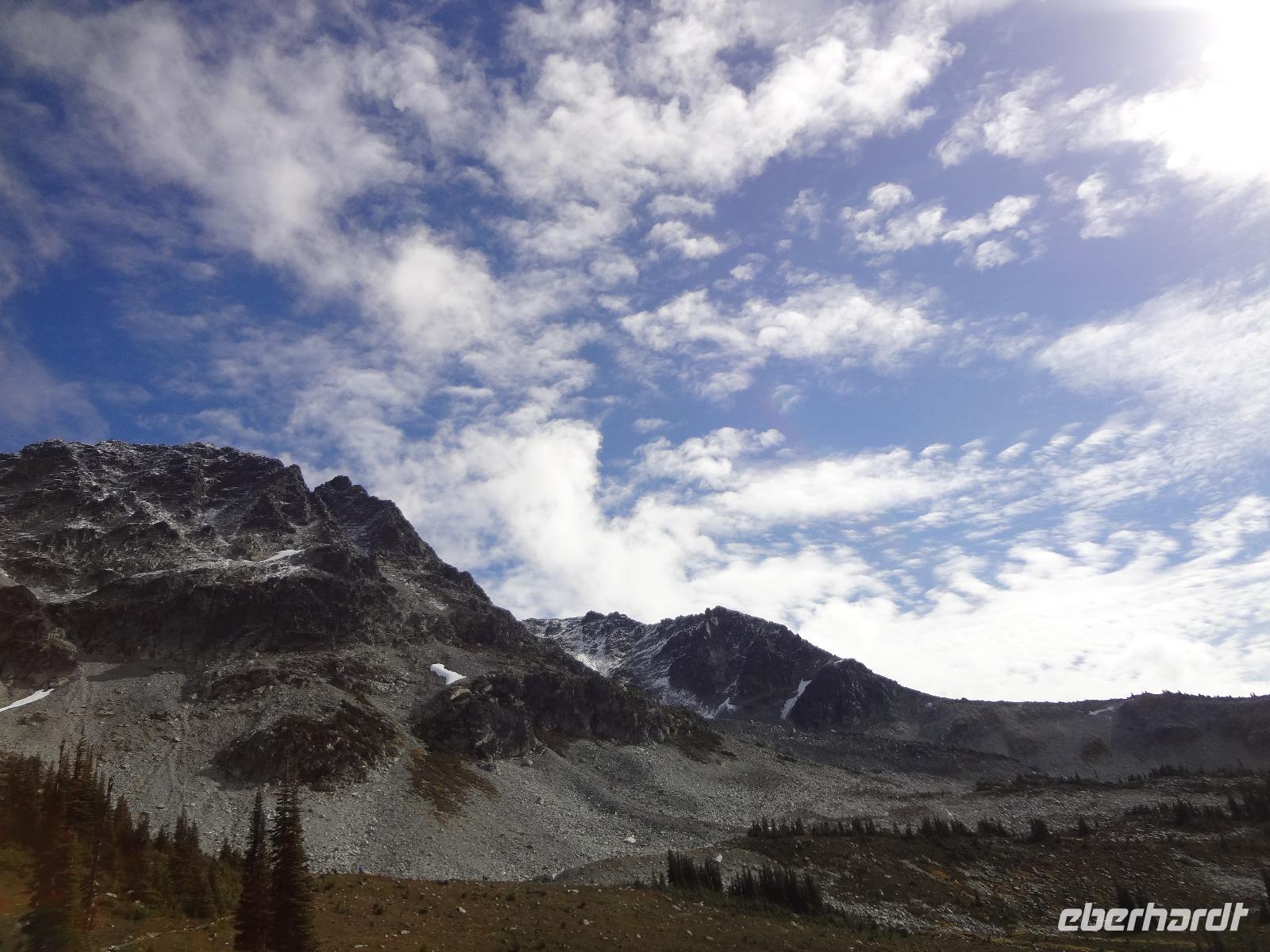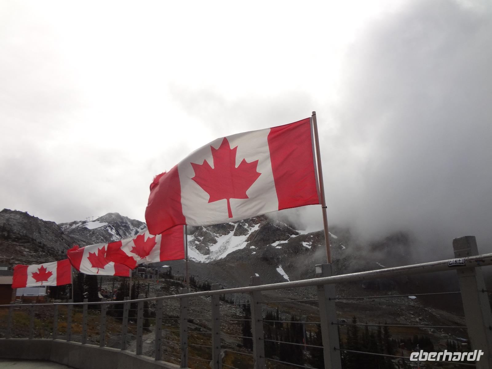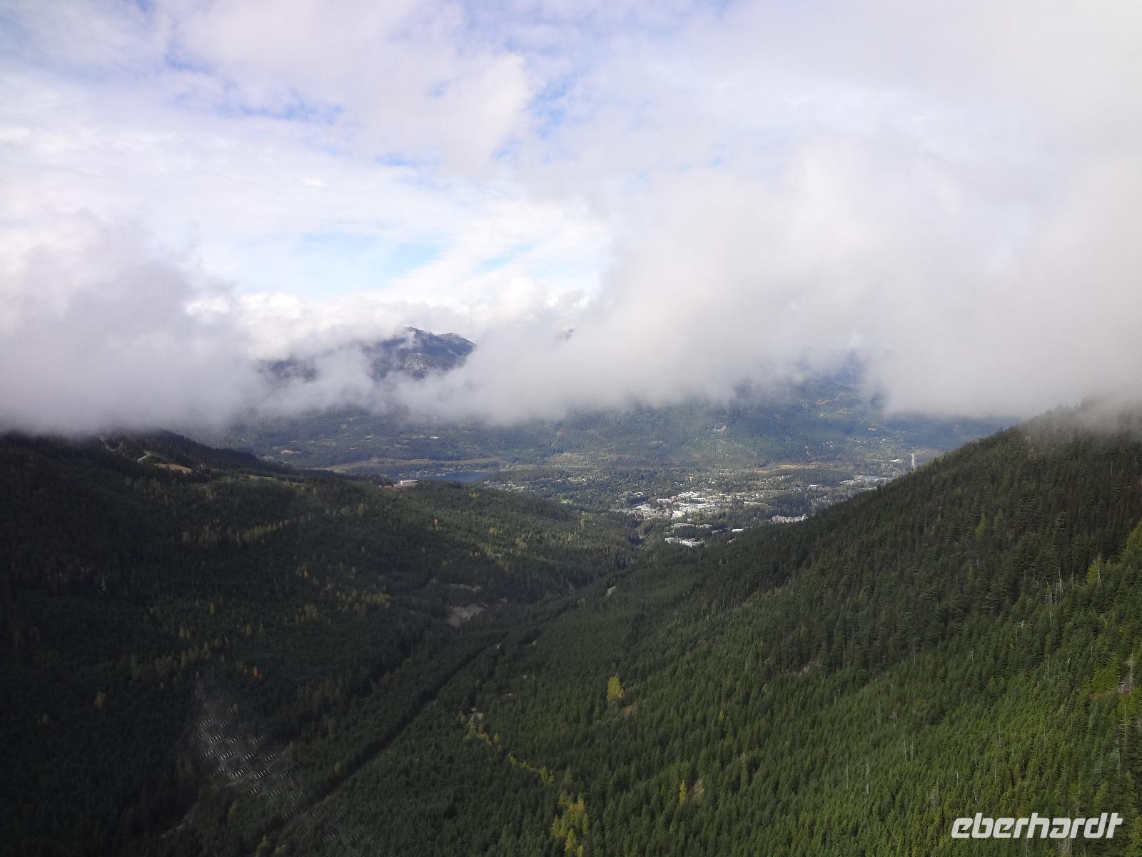 Heute duerfen wir eine halbe Stunde laenger schlafen.....da wir einen Whistler-Blackcomb Wandertag einschalten. Das Fruehstueck dauert zwar ewig bis es bestellt ist und noch eine Ewigkeit, bis es zubereitet und serviert wird. So hat das Wetter auch Zeit sich zu verbessern und wir gehen gut gelaunt zur Talstation der Whistler Gondel. Hier wird gerade ein Film gedreht und wir werden ganz schnell abgefertigt. Schon schweben wir in Gondeln die jeweils 8 Personen fassen koennen. 20 Minuten dauert diese Fahrt unterdessen hoeren wir einige Whistler Skigeschichten und schauen gespannt in die Tiefe wo die Downhill Biker, Kopf und Kragen aufs Spiel setzen um mit so einem Drahtesel so schnell wie moeglich den steilen Berg hinunter zu flitzen. Ausschauen tun sie wie mittelalterliche Krieger die sich gerade durch den Schlamm gekaempft haben. Durch die erste Wolkendecke sind wir durchgeschwebt und nun sind wir auf Whistler Mountain oben. Ein fantastischer Blick auf die Bergspitzen, die Gletscher und einen kleinen Stausee tut sich vor unseren Augen auf. Da die Wolke jedoch hochkommen moechte, entscheiden wir uns, gleich auf Blackcomb hinueber zu schweben. WOW, wir sitzen in der laengsten Seilbahn der Welt mit der laengsten Spanne. Wir fliegen von einem Berg zum andern in einer dicken Wolke gehuellt. Auf Blackcomb aber, blaest ein zarter Hauch von Wind und alsbald ist die Sicht wieder frei. Auf gehts, die Wanderung zum Balckcomb Lake wartet schon auf uns. Es ist ein sehr schoener Weg, etwas eng, durch Wald und ueber Pisten mit herrlicher Aussicht auf Whistler Mountain und sogar auf den Black Tusk. Beim See machen wir Pause ehe wir denselben Weg zurueck nehmen. Nun schaut die Welt wieder ganz neu aus und wir reden und lachen viel ueber verschiedene Themen. Zurueck in Whistler, wollen die einen zu Lost Lake spazieren, andere wollen einkaufen gehen und die meisten wollen einfach das Dorf mit seinem Musik festival geniessen. Wir sehen uns alle wieder zum Abendessen im La Boca, wo uns die Vorspeise und das Dessert sehr gut schmecken, die Pasta dazwischen, als Hauptgericht, jedoch etwas weniger. Heute ist Samstag, da ist im Dorfkern sicher noch mehr los als gestern. Whistler ist ein echtes Partydorf mit einem Durchschnittsalter unter 25 Jahren. Schoen wars.
