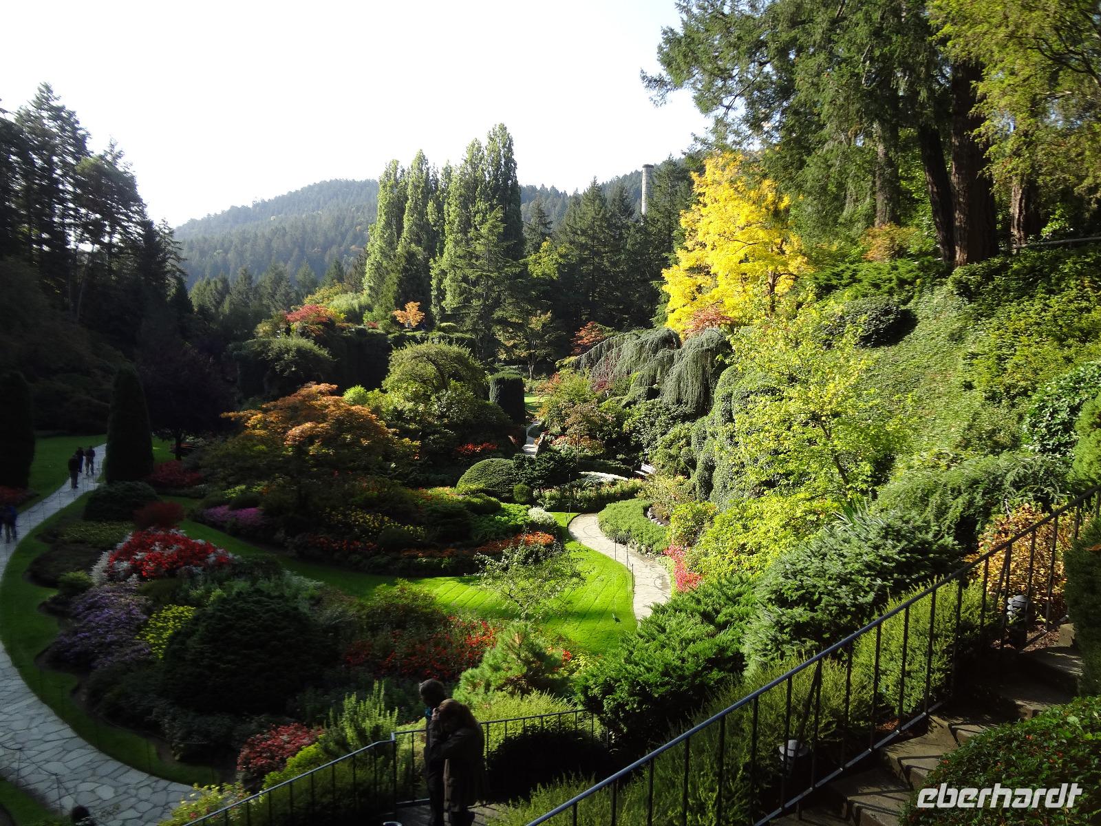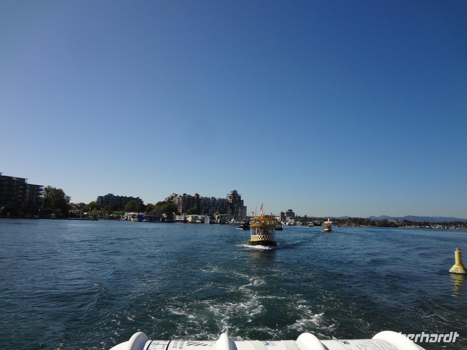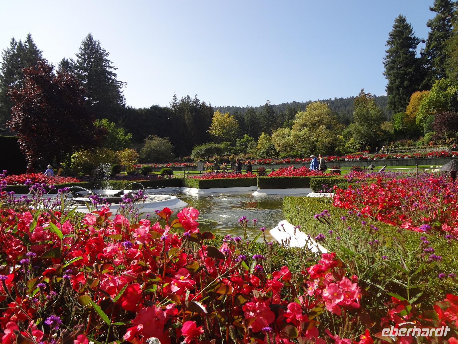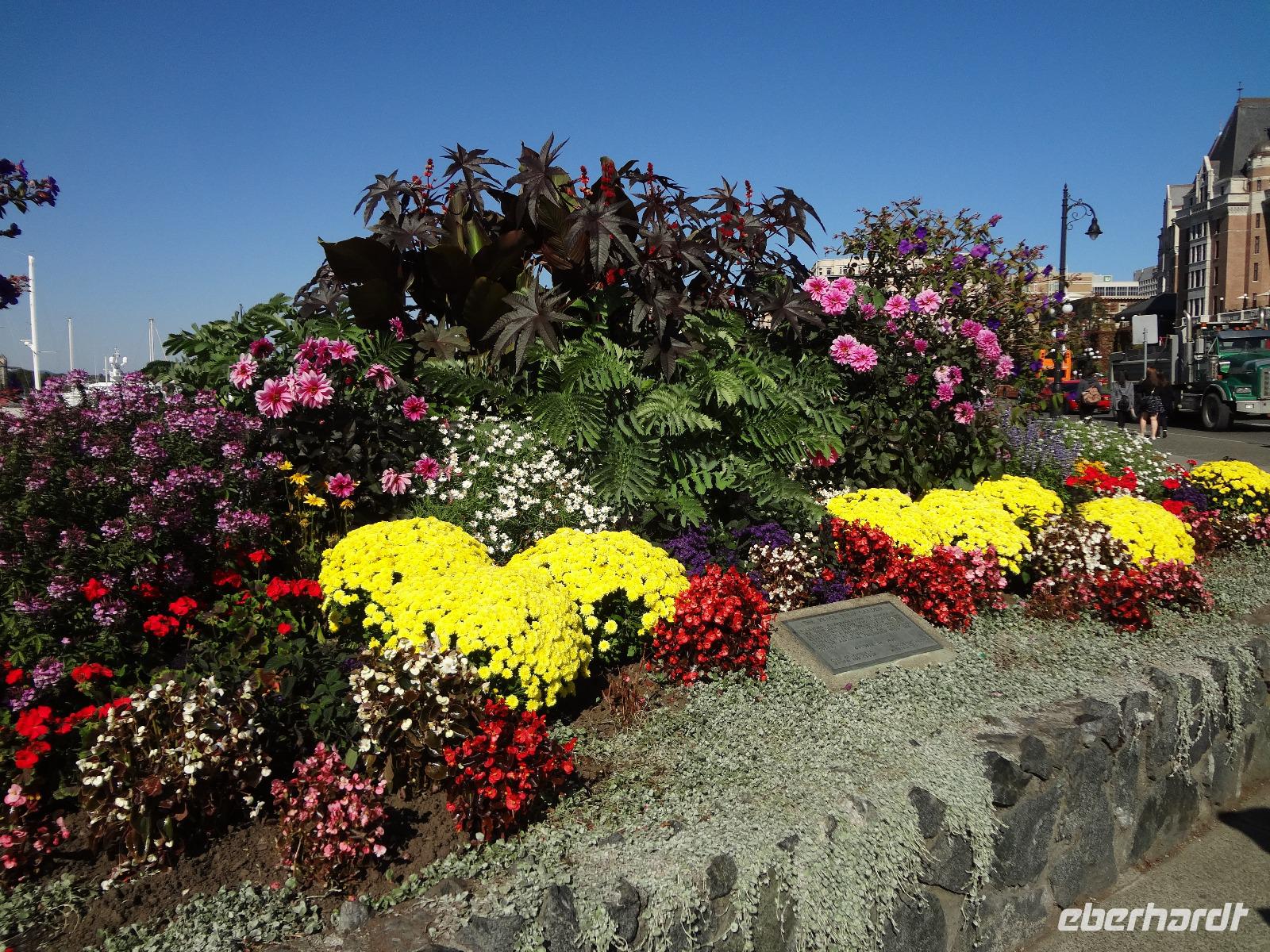 Nun klappt das Fruehstueck. Wir haben Glaeser, Tassen, Teller zur Genuege und heute gibt es auch reichlich dunkles Brot, Fruechte, Ruehrei usw wie wir uns das nun gewoehnt sind. Heute verlassen wir Victoria, indem wir noch die Nobelgegend dieser Stadt besuchen. Vorbei an der Meile Null der Highway number one, an Oak Bay, den Uplands und der Universitaet von Victoria gelangen wir zu den Butcharts Garden. Ach wie wunderschoen, hatte damals die Mrs. Butchart ihren Garten anlegen lassen. Diese Blumenpracht begeistert ueber 1 Million Menschen jedes Jahr. Wir gehoeren auch dazu und geniessen die Stunde. Voller guten Ideen und neuen Eindruecken fuer unseren eigenen Garten und den Balkon zu Hause fahren wir zur Faehre die uns aufs Festland nach Vancouver segeln wird. Auf der Faehre nehmen wir unser Mittagessen im Restaurant ein. Wie auf einer Mini-Kreuzschiffahrt, gibt es ein vorzuegliches Buffet mit sehr schoener Aussicht. Nach ein einhalb Stunden treffen wir bei Vancouver ein. Noch ein Stuendchen Fahrt und schon sind wir auf unser Stadtrundfahrt. Vorerst gehts nach Chinatown, wir steigen aus und gehen da zu Fuss durch, damit wir auch alles sehen und riechen koennen, danach gehen wir durch Gastown, es ist der aelteste Teil Vancouvers, ganz aus Backsteine gebaut. Die beruehmten Dampfuhr wird ganz genau unter die Lupe genommen, denn wer hat schon eine Uhr gesehen mit einem Trieberk wie eine Lokomotive ? Canada Place, die Olympische Fackel, Coal Harbour und Stanley Park zeigen sich von der besten Seite. Bei den Totem in Stanley Park lernen wir wieder einiges ueber diese Geschichts-erzaehlenden Pfaehle und horchen ihren Legenden zu. Der Stanley Park hat eine 10 Km Rundstrasse und endet am englischen Strand. Da ist auch unser Hotel. Nun will jeder noch in die Stadt oder an den Strand und alle stuermen los. Heute verabschieden wir uns auch von Colin, er faehrt wieder zurueck in die Rockies und wir im Gedanken mit ihm.