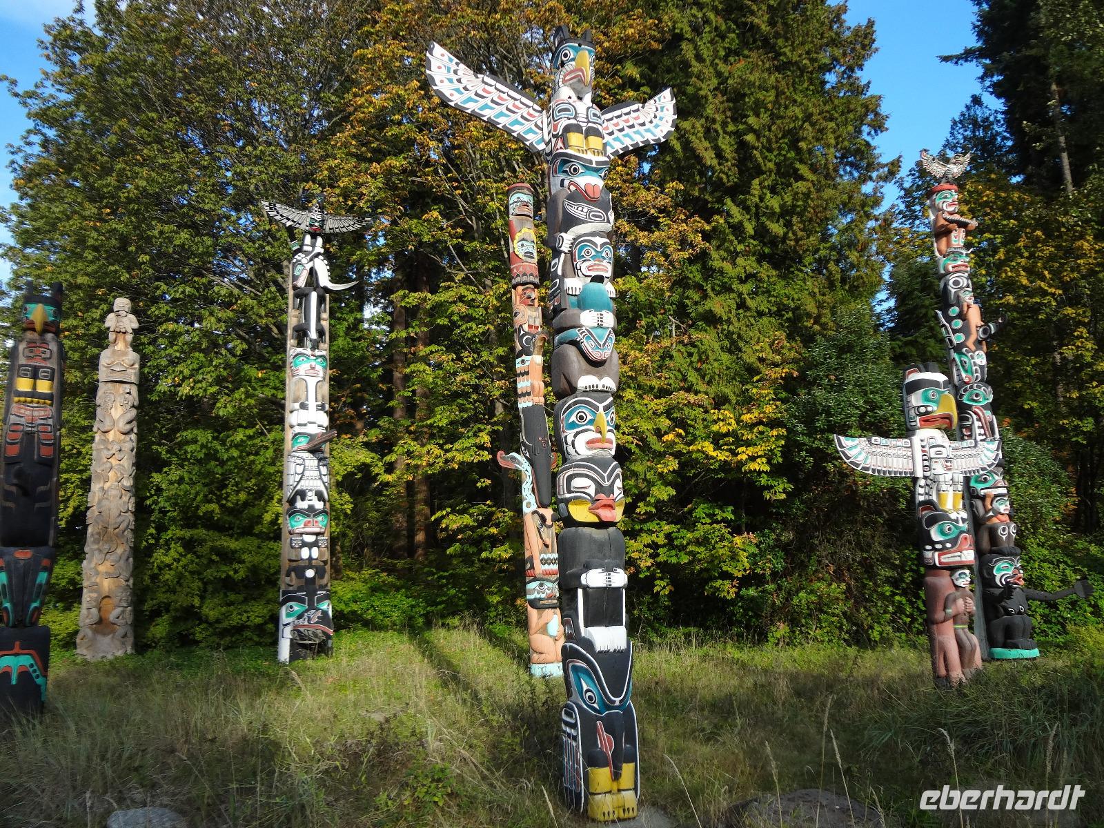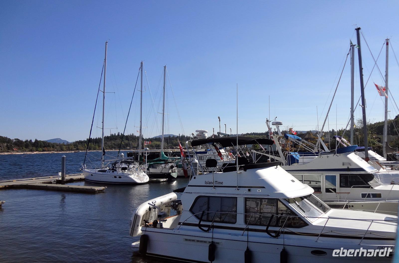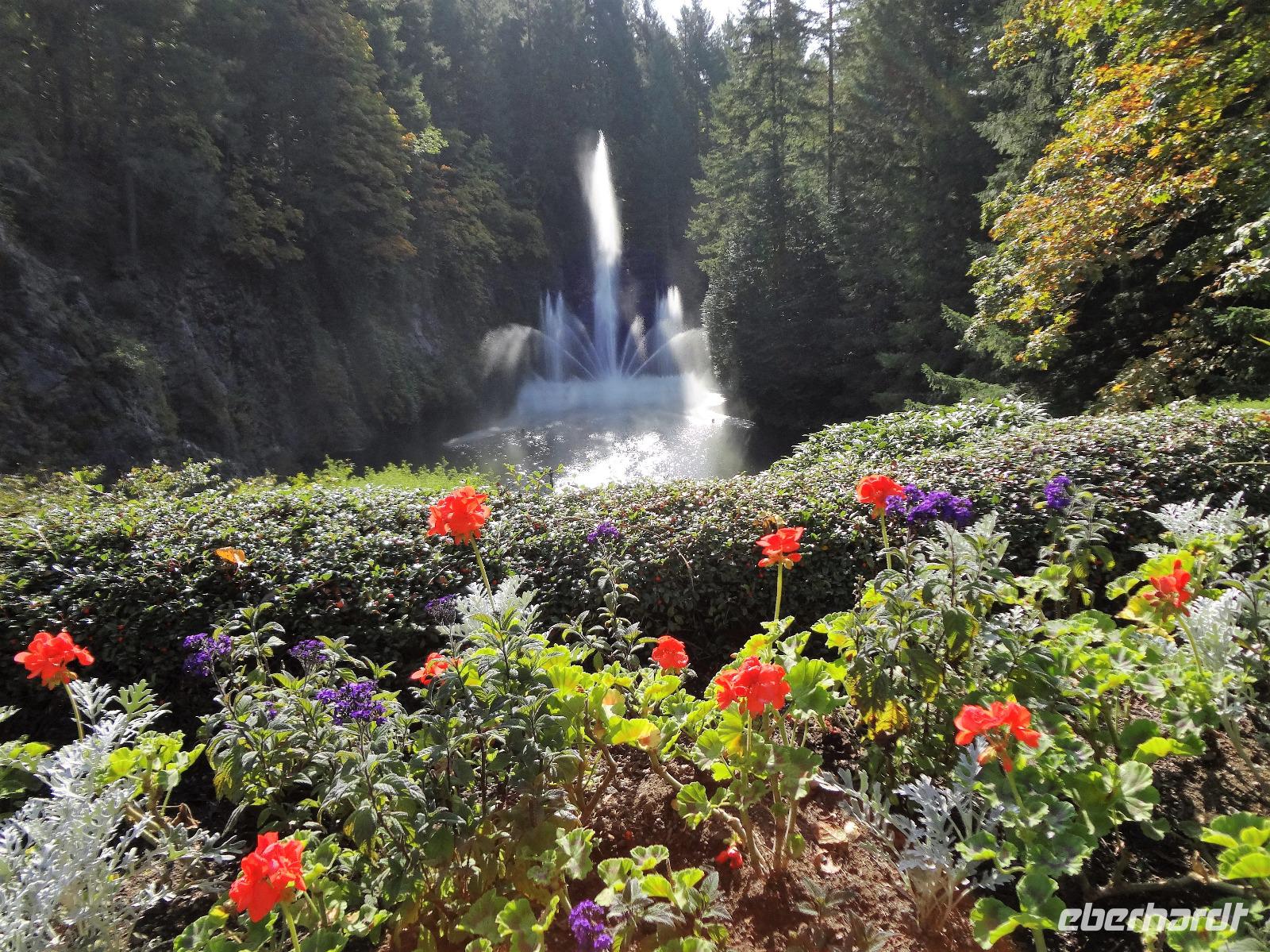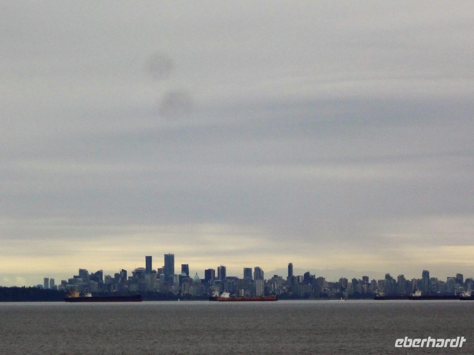 Nun klappt das Fruehstueck. Wir haben Glaeser, Tassen, Teller zur Genuege und heute gibt es auch reichlich dunkles Brot, Fruechte, Ruehrei usw wie wir uns das nun gewoehnt sind. Heute verlassen wir Victoria, indem wir noch die Nobelgegend dieser Stadt besuchen. Vorbei an der Meile Null der Highway number one, an Oak Bay, den Uplands und der Universitaet von Victoria gelangen wir zu den Butcharts Garden. Ach wie wunderschoen, hatte damals die Mrs. Butchart ihren Garten anlegen lassen. Diese Blumenpracht begeistert ueber 1 Million Menschen jedes Jahr. Wir gehoeren auch dazu und geniessen die Stunde. Voller guten Ideen und neuen Eindruecken fuer unseren eigenen Garten und den Balkon zu Hause fahren wir zur Faehre die uns aufs Festland nach Vancouver segeln wird. Auf der Faehre nehmen wir unser Mittagessen im Restaurant ein. Wie auf einer Mini-Kreuzschiffahrt, gibt es ein vorzuegliches Buffet mit sehr schoener Aussicht. Nach ein einhalb Stunden treffen wir bei Vancouver ein. Noch ein Stuendchen Fahrt und schon sind wir auf unser Stadtrundfahrt. Vorerst gehts nach Chinatown, wir steigen aus und gehen da zu Fuss durch, damit wir auch alles sehen und riechen koennen, danach gehen wir durch Gastown, es ist der aelteste Teil Vancouvers, ganz aus Backsteine gebaut. Die beruehmten Dampfuhr wird ganz genau unter die Lupe genommen, denn wer hat schon eine Uhr gesehen mit einem Trieberk wie eine Lokomotive ? Canada Place, die Olympische Fackel, Coal Harbour und Stanley Park zeigen sich von der besten Seite. Bei den Totem in Stanley Park lernen wir wieder einiges ueber diese Geschichts-erzaehlenden Pfaehle und horchen ihren Legenden zu. Der Stanley Park hat eine 10 Km Rundstrasse und endet am englischen Strand. Da ist auch unser Hotel. Nun will jeder noch in die Stadt oder an den Strand und alle stuermen los. Heute verabschieden wir uns auch von Colin, er faehrt wieder zurueck in die Rockies und wir im Gedanken mit ihm.