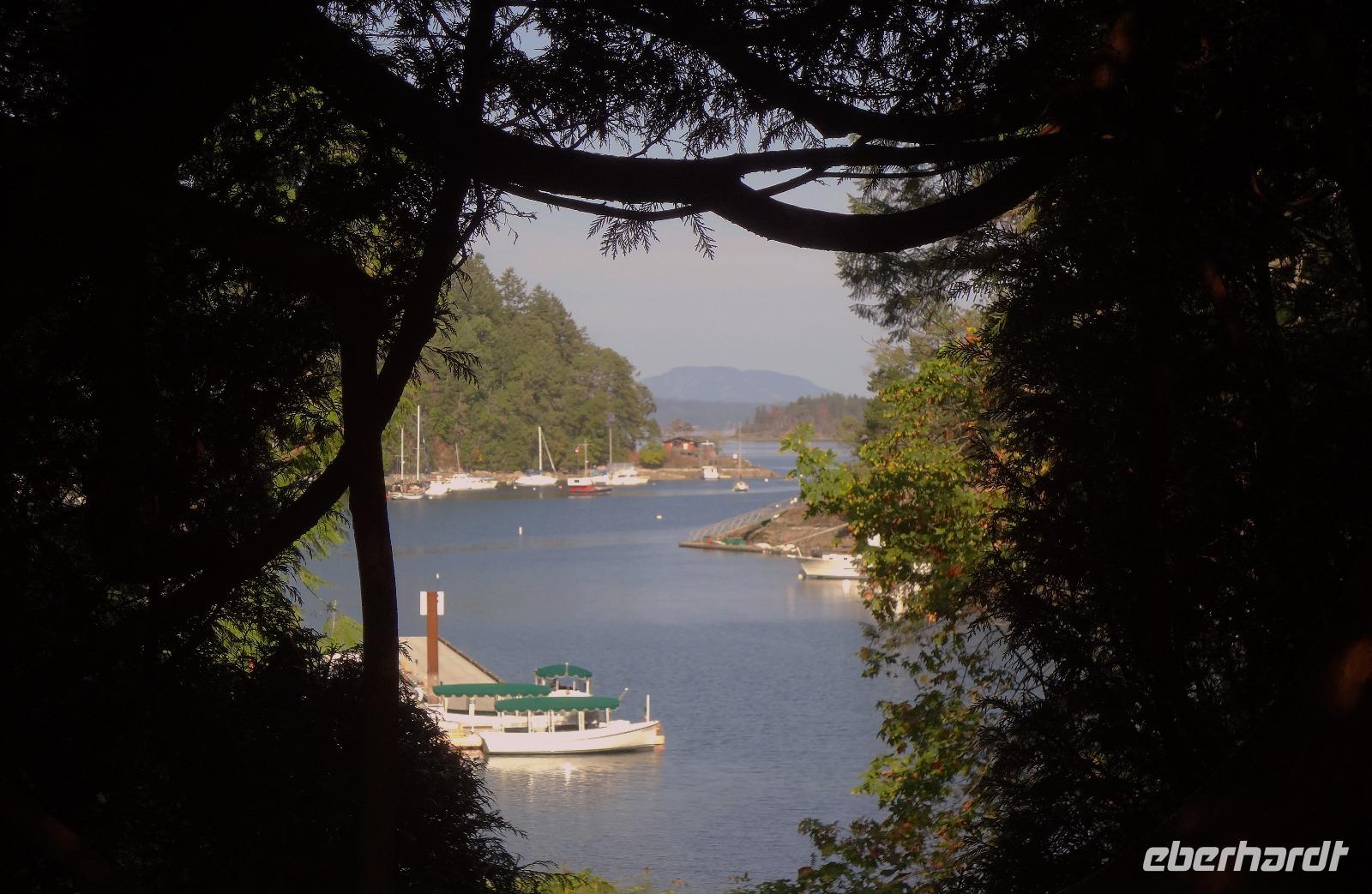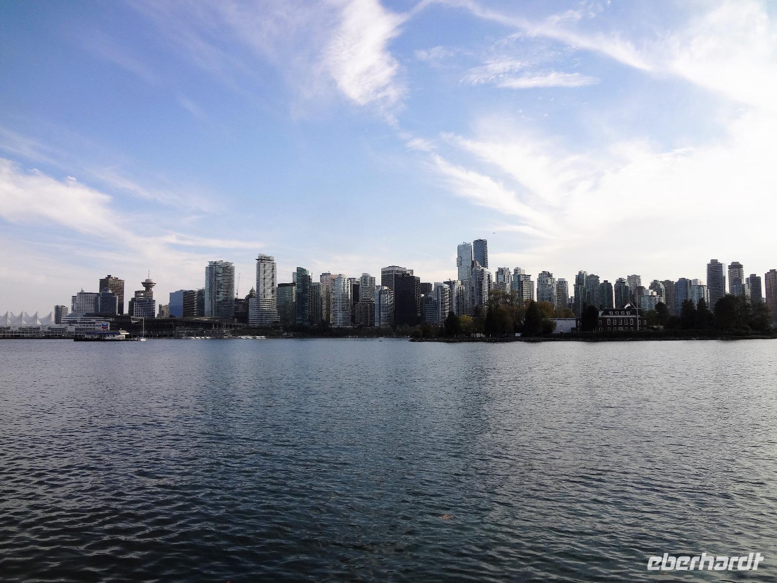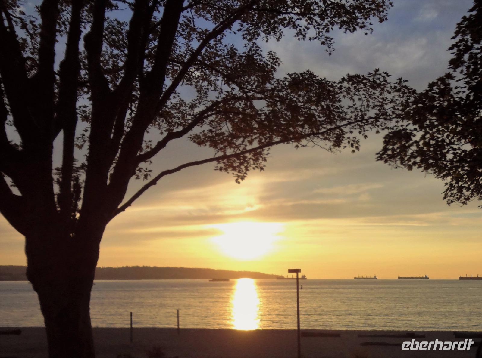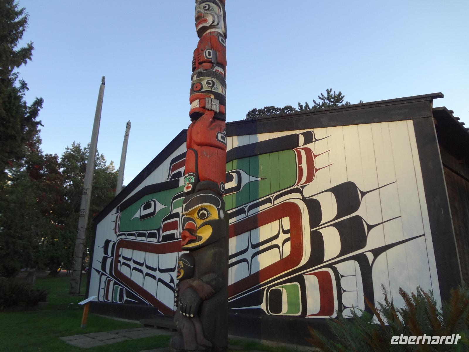 Nun klappt das Fruehstueck. Wir haben Glaeser, Tassen, Teller zur Genuege und heute gibt es auch reichlich dunkles Brot, Fruechte, Ruehrei usw wie wir uns das nun gewoehnt sind. Heute verlassen wir Victoria, indem wir noch die Nobelgegend dieser Stadt besuchen. Vorbei an der Meile Null der Highway number one, an Oak Bay, den Uplands und der Universitaet von Victoria gelangen wir zu den Butcharts Garden. Ach wie wunderschoen, hatte damals die Mrs. Butchart ihren Garten anlegen lassen. Diese Blumenpracht begeistert ueber 1 Million Menschen jedes Jahr. Wir gehoeren auch dazu und geniessen die Stunde. Voller guten Ideen und neuen Eindruecken fuer unseren eigenen Garten und den Balkon zu Hause fahren wir zur Faehre die uns aufs Festland nach Vancouver segeln wird. Auf der Faehre nehmen wir unser Mittagessen im Restaurant ein. Wie auf einer Mini-Kreuzschiffahrt, gibt es ein vorzuegliches Buffet mit sehr schoener Aussicht. Nach ein einhalb Stunden treffen wir bei Vancouver ein. Noch ein Stuendchen Fahrt und schon sind wir auf unser Stadtrundfahrt. Vorerst gehts nach Chinatown, wir steigen aus und gehen da zu Fuss durch, damit wir auch alles sehen und riechen koennen, danach gehen wir durch Gastown, es ist der aelteste Teil Vancouvers, ganz aus Backsteine gebaut. Die beruehmten Dampfuhr wird ganz genau unter die Lupe genommen, denn wer hat schon eine Uhr gesehen mit einem Trieberk wie eine Lokomotive ? Canada Place, die Olympische Fackel, Coal Harbour und Stanley Park zeigen sich von der besten Seite. Bei den Totem in Stanley Park lernen wir wieder einiges ueber diese Geschichts-erzaehlenden Pfaehle und horchen ihren Legenden zu. Der Stanley Park hat eine 10 Km Rundstrasse und endet am englischen Strand. Da ist auch unser Hotel. Nun will jeder noch in die Stadt oder an den Strand und alle stuermen los. Heute verabschieden wir uns auch von Colin, er faehrt wieder zurueck in die Rockies und wir im Gedanken mit ihm.