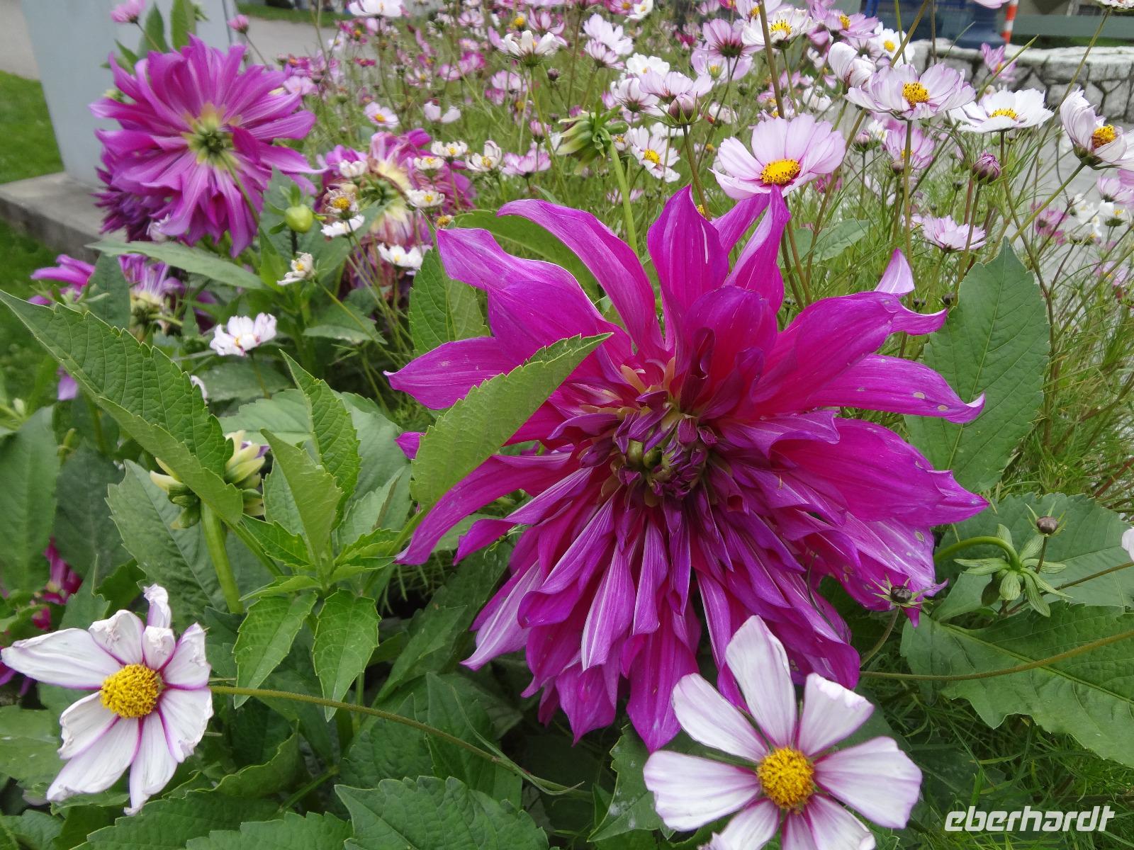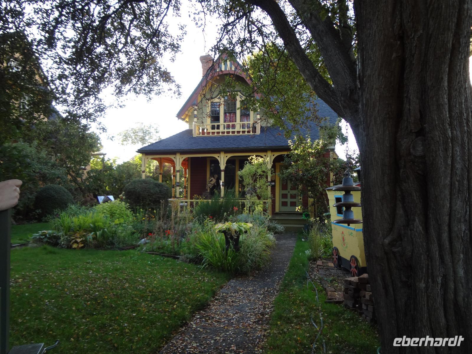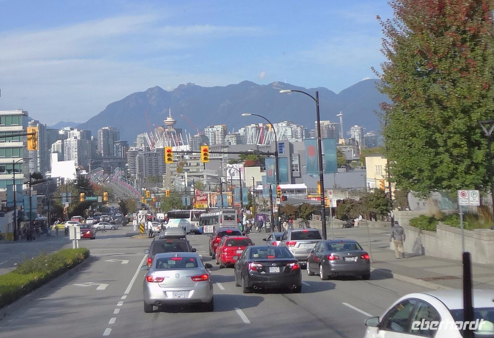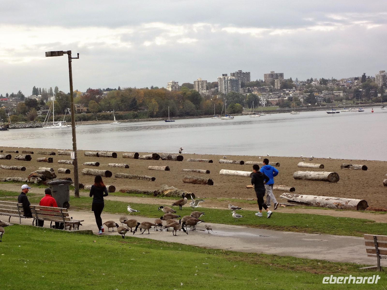 Nun klappt das Fruehstueck. Wir haben Glaeser, Tassen, Teller zur Genuege und heute gibt es auch reichlich dunkles Brot, Fruechte, Ruehrei usw wie wir uns das nun gewoehnt sind. Heute verlassen wir Victoria, indem wir noch die Nobelgegend dieser Stadt besuchen. Vorbei an der Meile Null der Highway number one, an Oak Bay, den Uplands und der Universitaet von Victoria gelangen wir zu den Butcharts Garden. Ach wie wunderschoen, hatte damals die Mrs. Butchart ihren Garten anlegen lassen. Diese Blumenpracht begeistert ueber 1 Million Menschen jedes Jahr. Wir gehoeren auch dazu und geniessen die Stunde. Voller guten Ideen und neuen Eindruecken fuer unseren eigenen Garten und den Balkon zu Hause fahren wir zur Faehre die uns aufs Festland nach Vancouver segeln wird. Auf der Faehre nehmen wir unser Mittagessen im Restaurant ein. Wie auf einer Mini-Kreuzschiffahrt, gibt es ein vorzuegliches Buffet mit sehr schoener Aussicht. Nach ein einhalb Stunden treffen wir bei Vancouver ein. Noch ein Stuendchen Fahrt und schon sind wir auf unser Stadtrundfahrt. Vorerst gehts nach Chinatown, wir steigen aus und gehen da zu Fuss durch, damit wir auch alles sehen und riechen koennen, danach gehen wir durch Gastown, es ist der aelteste Teil Vancouvers, ganz aus Backsteine gebaut. Die beruehmten Dampfuhr wird ganz genau unter die Lupe genommen, denn wer hat schon eine Uhr gesehen mit einem Trieberk wie eine Lokomotive ? Canada Place, die Olympische Fackel, Coal Harbour und Stanley Park zeigen sich von der besten Seite. Bei den Totem in Stanley Park lernen wir wieder einiges ueber diese Geschichts-erzaehlenden Pfaehle und horchen ihren Legenden zu. Der Stanley Park hat eine 10 Km Rundstrasse und endet am englischen Strand. Da ist auch unser Hotel. Nun will jeder noch in die Stadt oder an den Strand und alle stuermen los. Heute verabschieden wir uns auch von Colin, er faehrt wieder zurueck in die Rockies und wir im Gedanken mit ihm.