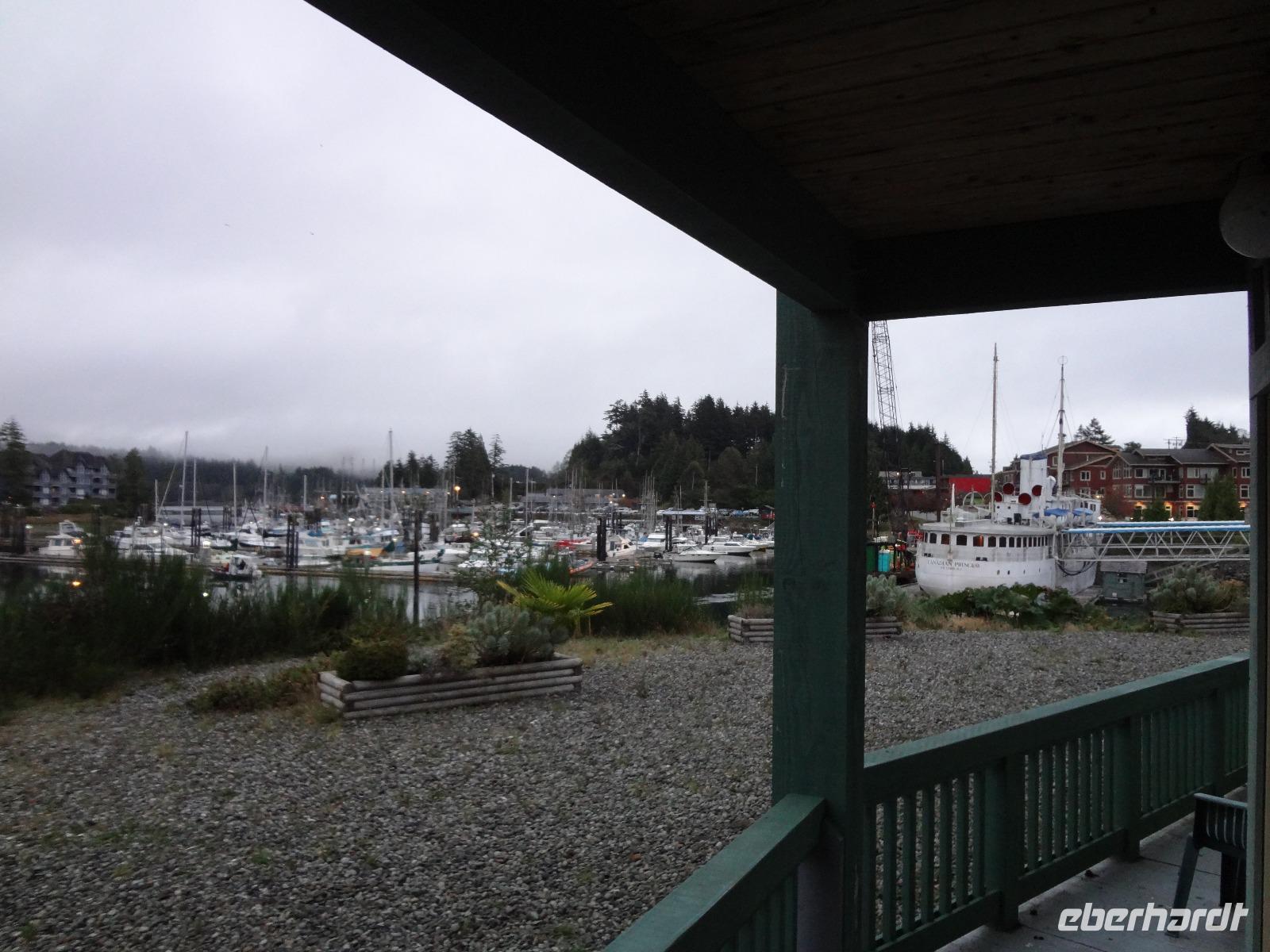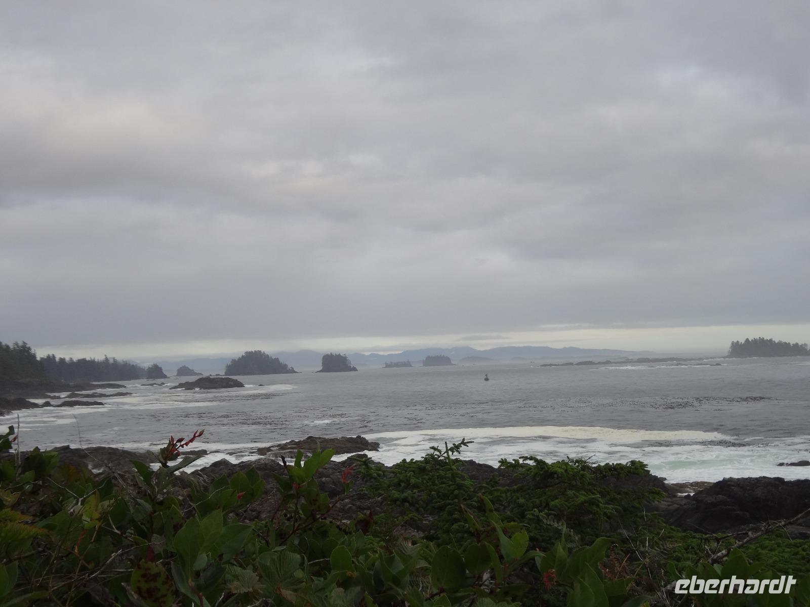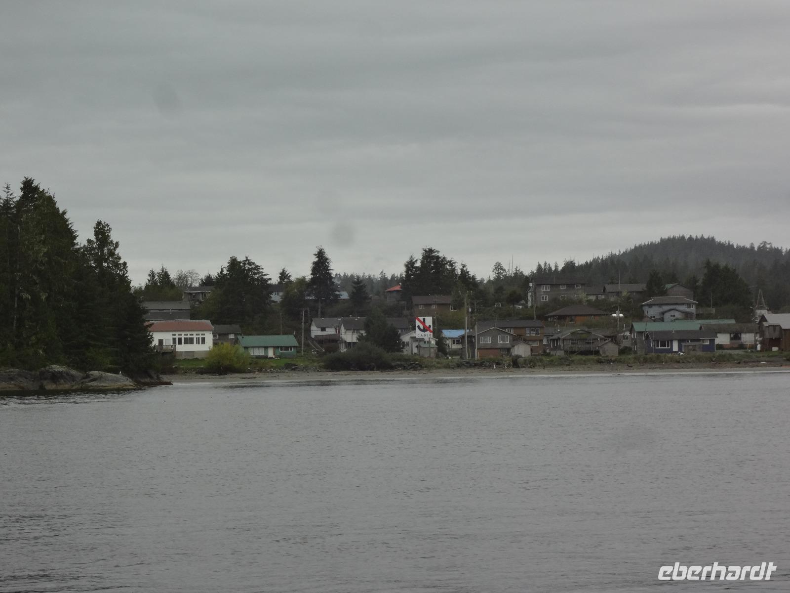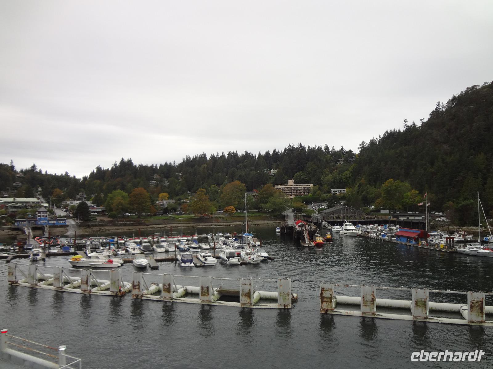 In Whistler ist immer gut schlafen und das Fruehstueck ist auch heute wieder spaet aber ueberschwenglich. Heute fahren wir schon zeitig weg, eine ½ Stunde frueher als ueblich da wir nach Vancouver fahren werden um dort die Faehre auf die Insel von Vancouver zu erwischen. Der Himmel ist verhangen und die Strasse ist an diesem Sonntagmorgen ganz leer. Wir erfahren vieles ueber die Olympiade die hier im 2010 abgehalten wurde und auch wie es zu Whistler Blackcomb kam. Vielleicht sollten wir auch in Whistler ¼ Zimmer in einem Hotel kaufen, sodass unsere Investition sich so schnell verdoppelt ! Mit solchen Flausen im Kopf, kommen wir gut voran und sind auch zeitig bei der Faehre in Horseshoe Bay. Kaum auf der Faehre lichtet sich auch schon das Wetter und wir sehen in den ersten 10 Minuten eine Gruppe Schweinswale tummeln. Sie sind so schnell, dass man sie kaum fotografieren kann. Wir schauen auf die vorgelagerten Inseln und die Stadt Vancouver in der Ferne. Auf der Faehre gibt es allerhand, ein Geschaeft mit Kleider und Schnickschnack, sowie ein Restaurant, eine Bar, Spielplatz und Sonnendeck. Nach 1 ½ Stunden segeln wir in Nanaimo ein und fahren auch gleich weiter zu unserem Mittagsziel. Coombs heisst dieser Markt wo die Ziegen auf dem Dache grasen und man in der Markthalle allerhand zu essen finden kann. Interessante Geschaefte gibt es um diese Markthalle herum und wir amuesieren uns an der feilgebotenen Ware die teilweise wirklich viel zu gross ist mitzunehmen. Nach einer Stunde gehts wieder weiter zum naechsten Ziel. Ein Stueck wunderschoener Urwald will von uns erforscht werden. Die Riesen schauen auf uns kleine Menschen hinunter und wundern sich vielleicht weshalb wir wie wild knipsen. Diese Stunde im Urwald vergeht viel zu schnell. Die naechsten 2 dafuer ein wenig langsamer. Die Reise durch die Insel, an die wilde West Kueste, ist sehr kurvenreich und verfuehrt uns, nach Gespraechen ueber das Sozial- und Schulwesen Kanadas, dazu, die Augenlieder von innen anzuschauen. Bei Sproat Lake und Kennedy Lake vorbei kommen wir in Ucluelet an. Einchecken und dann gleich auf eine schoene Wanderung auf dem Wild Pacific Trail bis zum Leuchtturm. Dort wartet Colin schon auf uns und faehrt uns ins Restaurant zum Abendbrot. Alles war lecker aber danach eilen wir in unsere Zimmer. Gute Nacht.