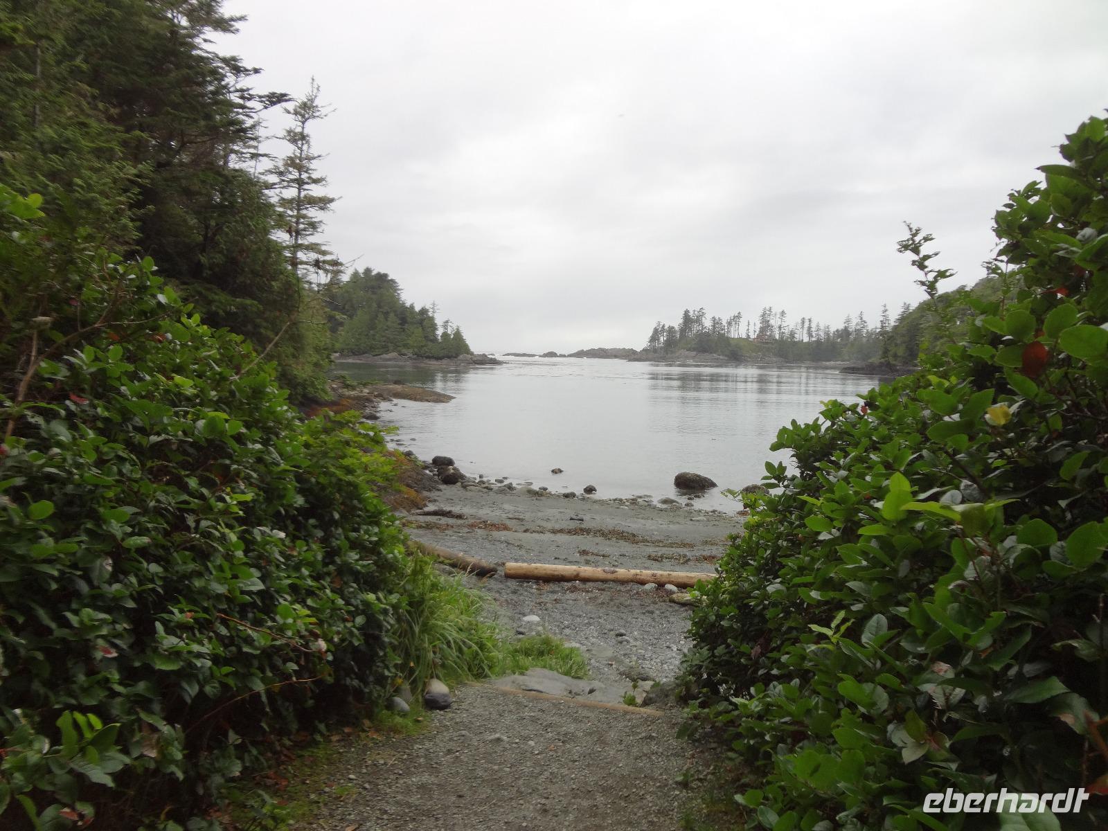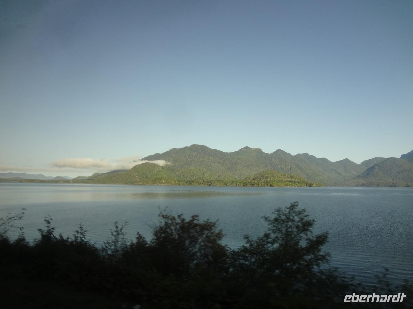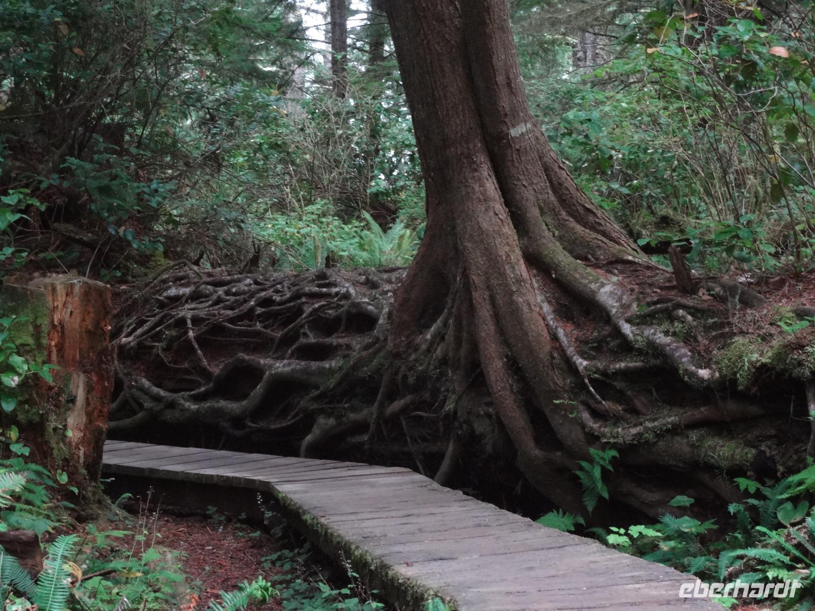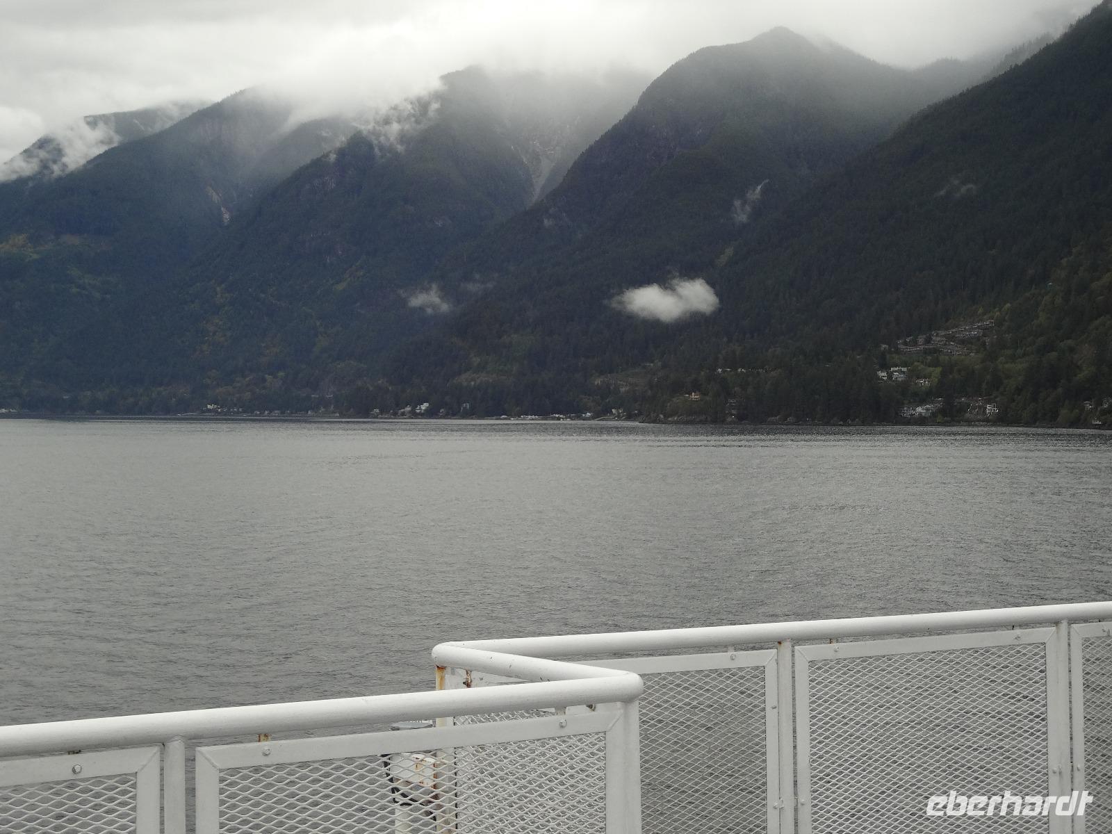 In Whistler ist immer gut schlafen und das Fruehstueck ist auch heute wieder spaet aber ueberschwenglich. Heute fahren wir schon zeitig weg, eine ½ Stunde frueher als ueblich da wir nach Vancouver fahren werden um dort die Faehre auf die Insel von Vancouver zu erwischen. Der Himmel ist verhangen und die Strasse ist an diesem Sonntagmorgen ganz leer. Wir erfahren vieles ueber die Olympiade die hier im 2010 abgehalten wurde und auch wie es zu Whistler Blackcomb kam. Vielleicht sollten wir auch in Whistler ¼ Zimmer in einem Hotel kaufen, sodass unsere Investition sich so schnell verdoppelt ! Mit solchen Flausen im Kopf, kommen wir gut voran und sind auch zeitig bei der Faehre in Horseshoe Bay. Kaum auf der Faehre lichtet sich auch schon das Wetter und wir sehen in den ersten 10 Minuten eine Gruppe Schweinswale tummeln. Sie sind so schnell, dass man sie kaum fotografieren kann. Wir schauen auf die vorgelagerten Inseln und die Stadt Vancouver in der Ferne. Auf der Faehre gibt es allerhand, ein Geschaeft mit Kleider und Schnickschnack, sowie ein Restaurant, eine Bar, Spielplatz und Sonnendeck. Nach 1 ½ Stunden segeln wir in Nanaimo ein und fahren auch gleich weiter zu unserem Mittagsziel. Coombs heisst dieser Markt wo die Ziegen auf dem Dache grasen und man in der Markthalle allerhand zu essen finden kann. Interessante Geschaefte gibt es um diese Markthalle herum und wir amuesieren uns an der feilgebotenen Ware die teilweise wirklich viel zu gross ist mitzunehmen. Nach einer Stunde gehts wieder weiter zum naechsten Ziel. Ein Stueck wunderschoener Urwald will von uns erforscht werden. Die Riesen schauen auf uns kleine Menschen hinunter und wundern sich vielleicht weshalb wir wie wild knipsen. Diese Stunde im Urwald vergeht viel zu schnell. Die naechsten 2 dafuer ein wenig langsamer. Die Reise durch die Insel, an die wilde West Kueste, ist sehr kurvenreich und verfuehrt uns, nach Gespraechen ueber das Sozial- und Schulwesen Kanadas, dazu, die Augenlieder von innen anzuschauen. Bei Sproat Lake und Kennedy Lake vorbei kommen wir in Ucluelet an. Einchecken und dann gleich auf eine schoene Wanderung auf dem Wild Pacific Trail bis zum Leuchtturm. Dort wartet Colin schon auf uns und faehrt uns ins Restaurant zum Abendbrot. Alles war lecker aber danach eilen wir in unsere Zimmer. Gute Nacht.