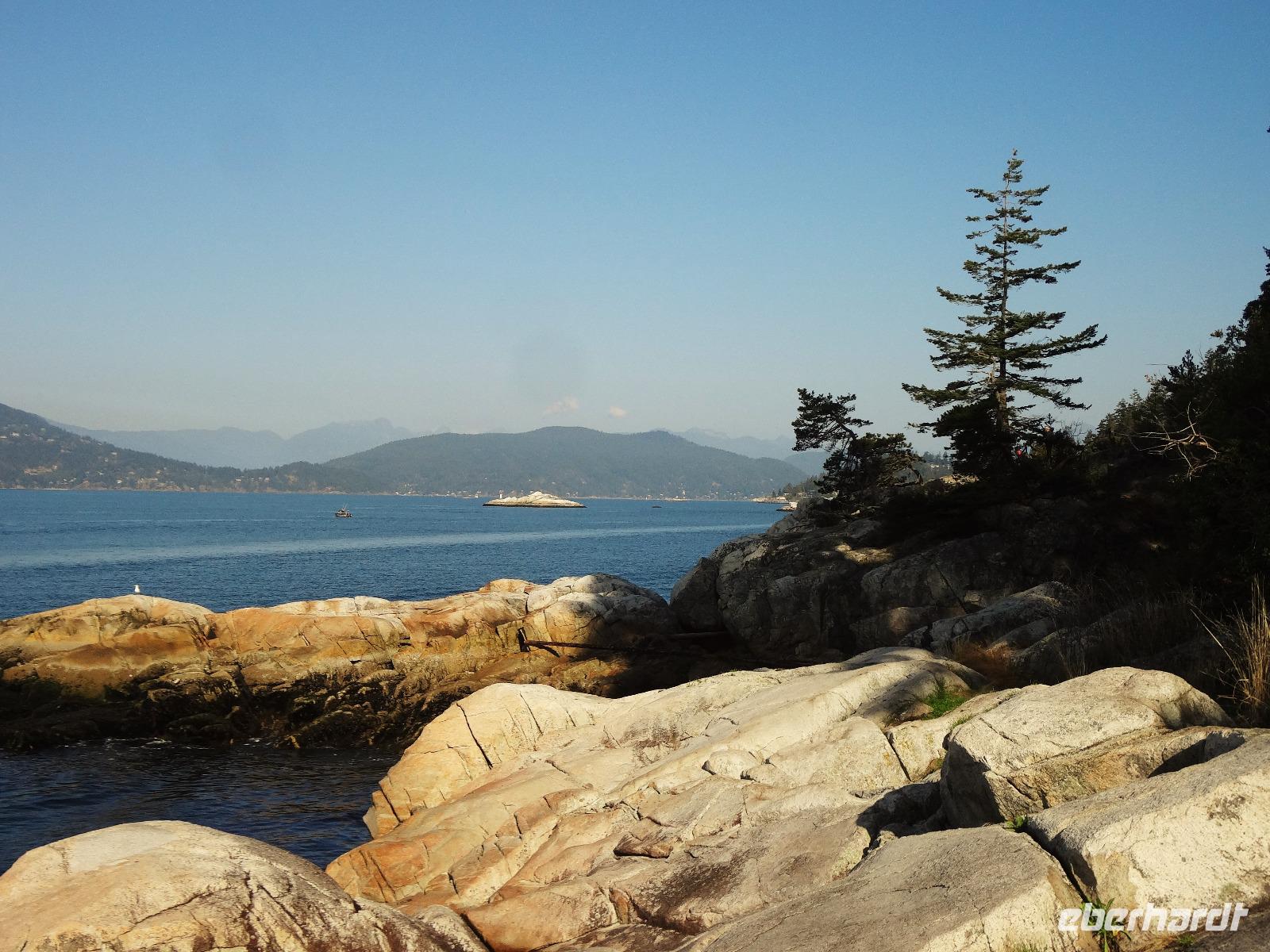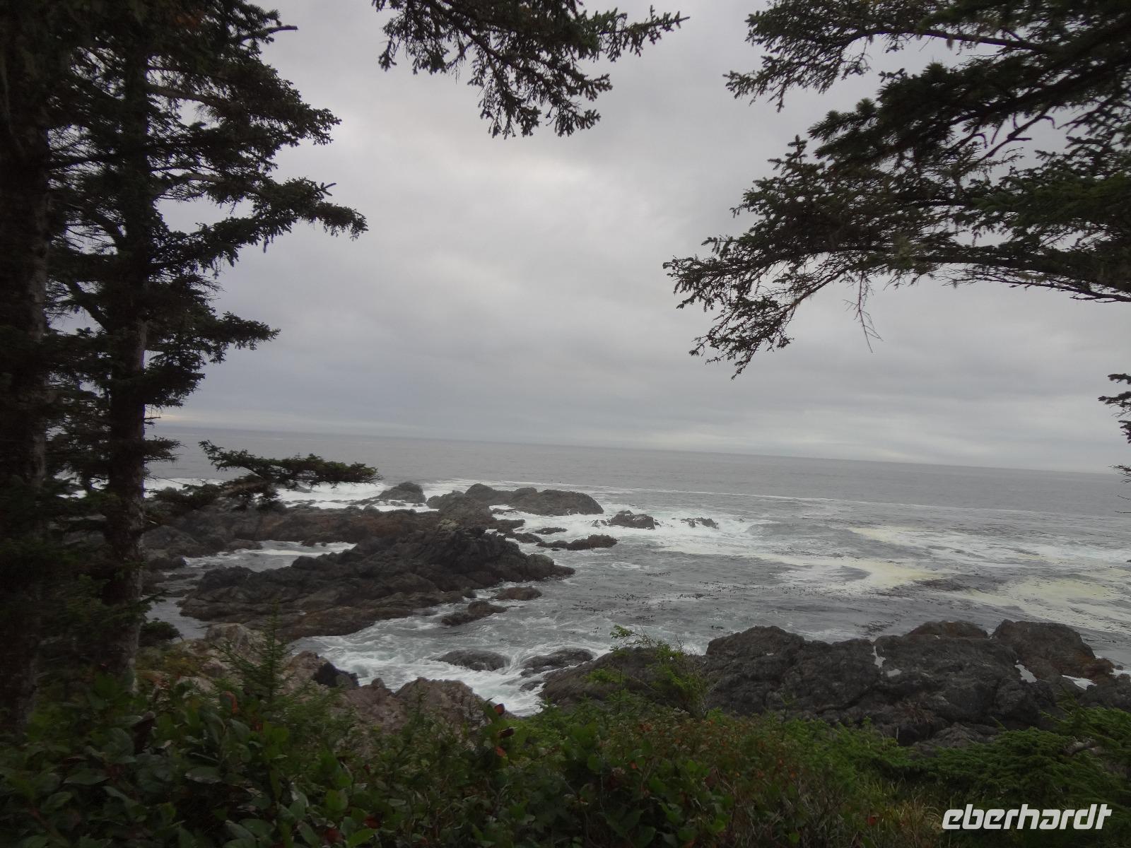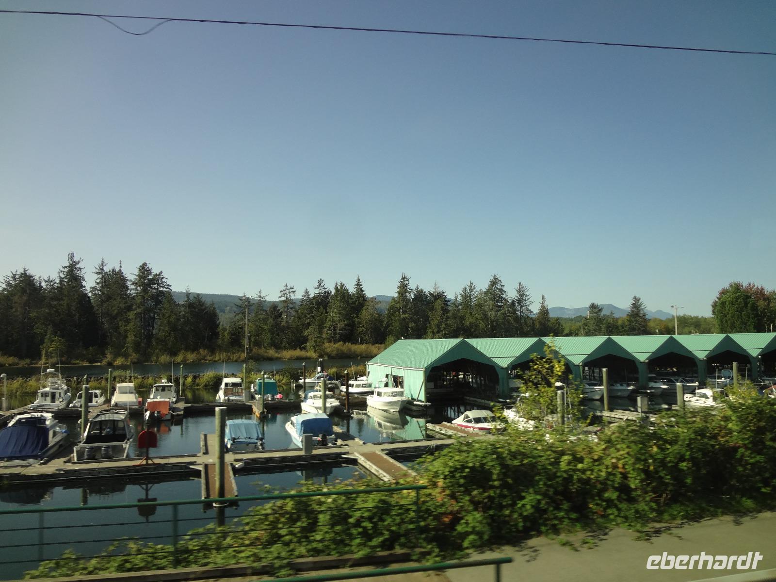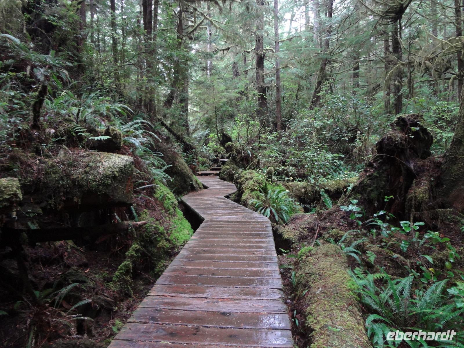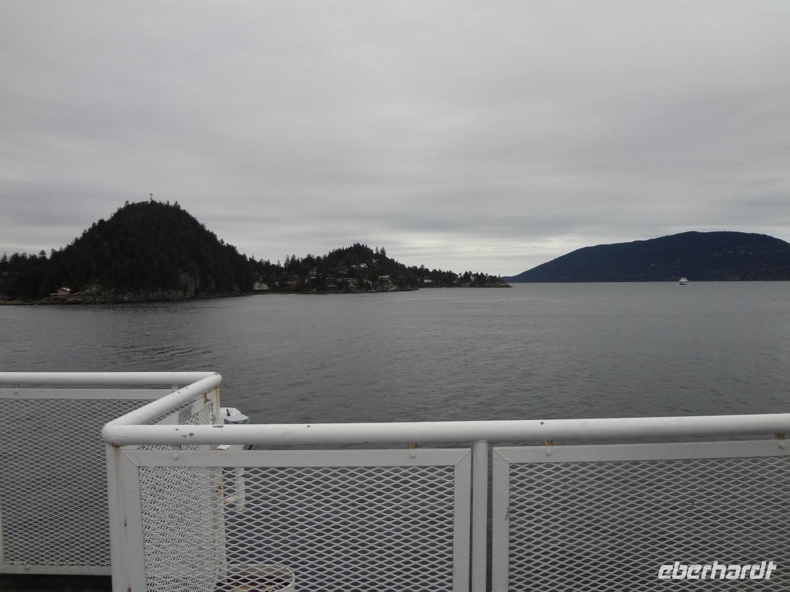 In Whistler ist immer gut schlafen und das Fruehstueck ist auch heute wieder spaet aber ueberschwenglich. Heute fahren wir schon zeitig weg, eine ½ Stunde frueher als ueblich da wir nach Vancouver fahren werden um dort die Faehre auf die Insel von Vancouver zu erwischen. Der Himmel ist verhangen und die Strasse ist an diesem Sonntagmorgen ganz leer. Wir erfahren vieles ueber die Olympiade die hier im 2010 abgehalten wurde und auch wie es zu Whistler Blackcomb kam. Vielleicht sollten wir auch in Whistler ¼ Zimmer in einem Hotel kaufen, sodass unsere Investition sich so schnell verdoppelt ! Mit solchen Flausen im Kopf, kommen wir gut voran und sind auch zeitig bei der Faehre in Horseshoe Bay. Kaum auf der Faehre lichtet sich auch schon das Wetter und wir sehen in den ersten 10 Minuten eine Gruppe Schweinswale tummeln. Sie sind so schnell, dass man sie kaum fotografieren kann. Wir schauen auf die vorgelagerten Inseln und die Stadt Vancouver in der Ferne. Auf der Faehre gibt es allerhand, ein Geschaeft mit Kleider und Schnickschnack, sowie ein Restaurant, eine Bar, Spielplatz und Sonnendeck. Nach 1 ½ Stunden segeln wir in Nanaimo ein und fahren auch gleich weiter zu unserem Mittagsziel. Coombs heisst dieser Markt wo die Ziegen auf dem Dache grasen und man in der Markthalle allerhand zu essen finden kann. Interessante Geschaefte gibt es um diese Markthalle herum und wir amuesieren uns an der feilgebotenen Ware die teilweise wirklich viel zu gross ist mitzunehmen. Nach einer Stunde gehts wieder weiter zum naechsten Ziel. Ein Stueck wunderschoener Urwald will von uns erforscht werden. Die Riesen schauen auf uns kleine Menschen hinunter und wundern sich vielleicht weshalb wir wie wild knipsen. Diese Stunde im Urwald vergeht viel zu schnell. Die naechsten 2 dafuer ein wenig langsamer. Die Reise durch die Insel, an die wilde West Kueste, ist sehr kurvenreich und verfuehrt uns, nach Gespraechen ueber das Sozial- und Schulwesen Kanadas, dazu, die Augenlieder von innen anzuschauen. Bei Sproat Lake und Kennedy Lake vorbei kommen wir in Ucluelet an. Einchecken und dann gleich auf eine schoene Wanderung auf dem Wild Pacific Trail bis zum Leuchtturm. Dort wartet Colin schon auf uns und faehrt uns ins Restaurant zum Abendbrot. Alles war lecker aber danach eilen wir in unsere Zimmer. Gute Nacht.