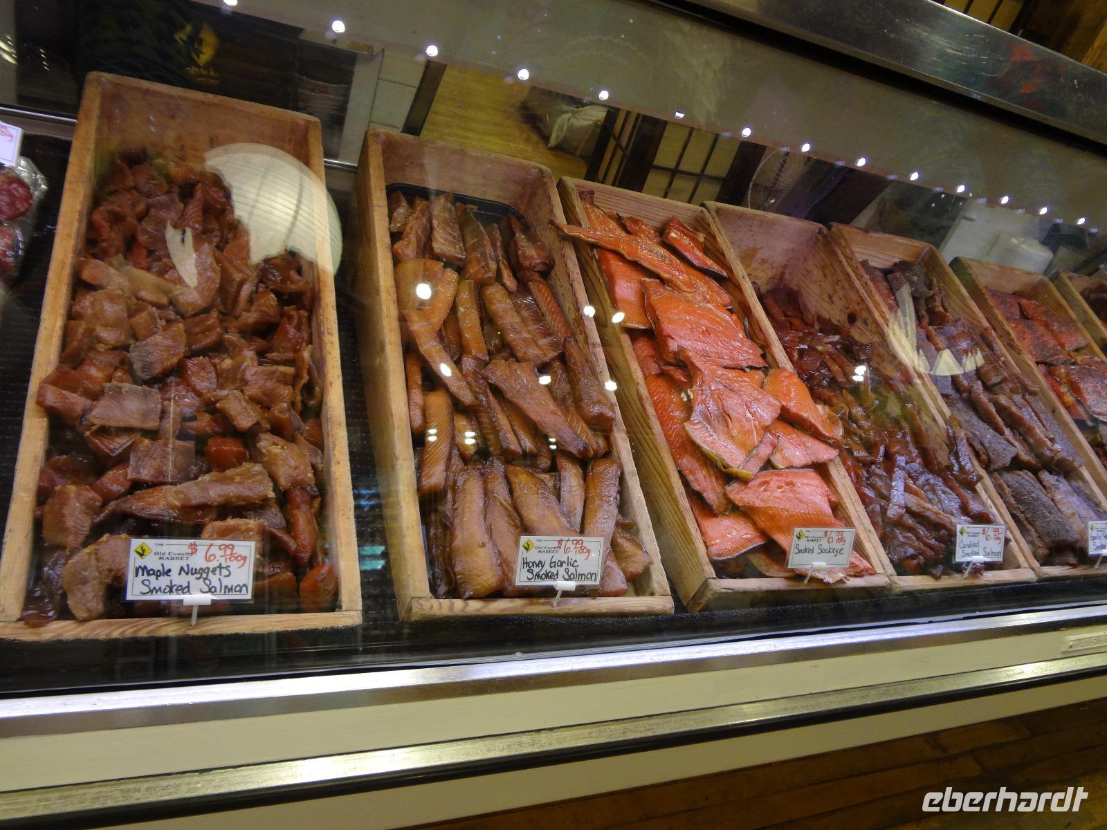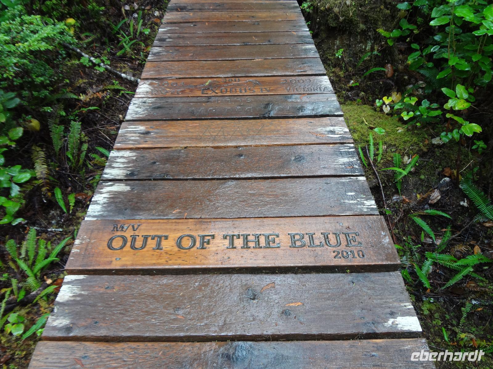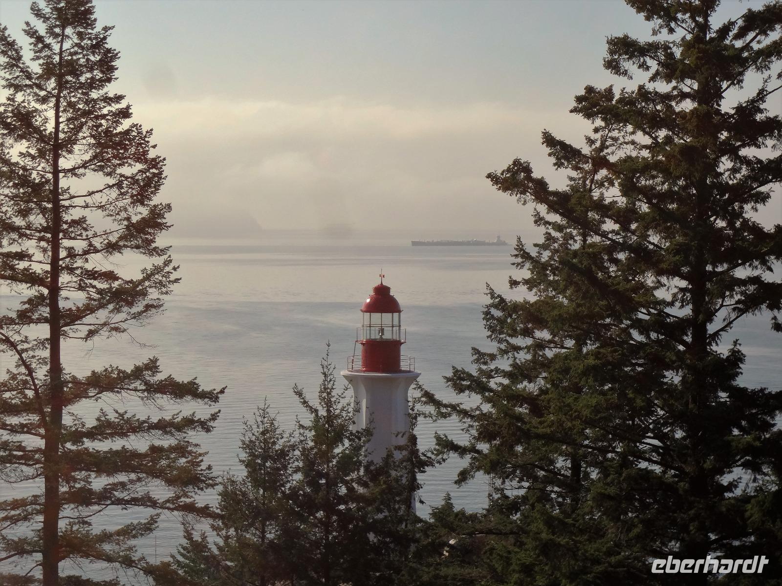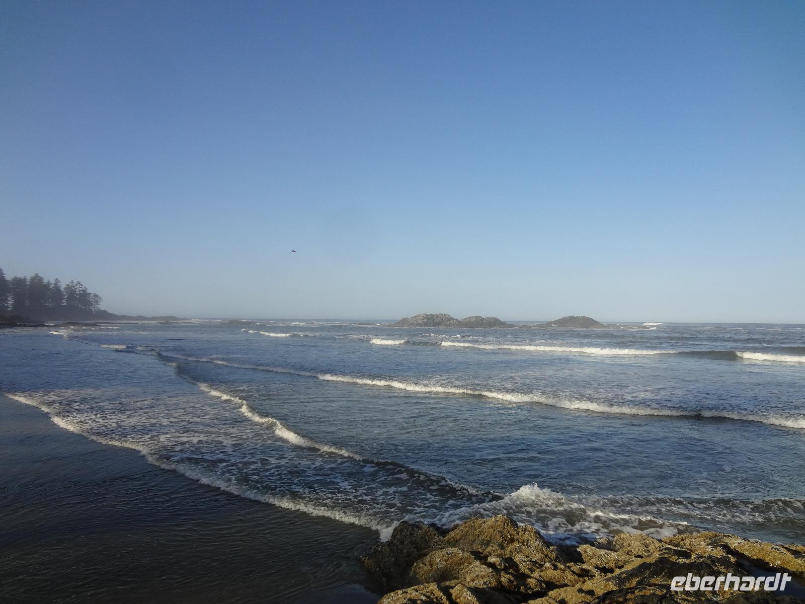 In Whistler ist immer gut schlafen und das Fruehstueck ist auch heute wieder spaet aber ueberschwenglich. Heute fahren wir schon zeitig weg, eine ½ Stunde frueher als ueblich da wir nach Vancouver fahren werden um dort die Faehre auf die Insel von Vancouver zu erwischen. Der Himmel ist verhangen und die Strasse ist an diesem Sonntagmorgen ganz leer. Wir erfahren vieles ueber die Olympiade die hier im 2010 abgehalten wurde und auch wie es zu Whistler Blackcomb kam. Vielleicht sollten wir auch in Whistler ¼ Zimmer in einem Hotel kaufen, sodass unsere Investition sich so schnell verdoppelt ! Mit solchen Flausen im Kopf, kommen wir gut voran und sind auch zeitig bei der Faehre in Horseshoe Bay. Kaum auf der Faehre lichtet sich auch schon das Wetter und wir sehen in den ersten 10 Minuten eine Gruppe Schweinswale tummeln. Sie sind so schnell, dass man sie kaum fotografieren kann. Wir schauen auf die vorgelagerten Inseln und die Stadt Vancouver in der Ferne. Auf der Faehre gibt es allerhand, ein Geschaeft mit Kleider und Schnickschnack, sowie ein Restaurant, eine Bar, Spielplatz und Sonnendeck. Nach 1 ½ Stunden segeln wir in Nanaimo ein und fahren auch gleich weiter zu unserem Mittagsziel. Coombs heisst dieser Markt wo die Ziegen auf dem Dache grasen und man in der Markthalle allerhand zu essen finden kann. Interessante Geschaefte gibt es um diese Markthalle herum und wir amuesieren uns an der feilgebotenen Ware die teilweise wirklich viel zu gross ist mitzunehmen. Nach einer Stunde gehts wieder weiter zum naechsten Ziel. Ein Stueck wunderschoener Urwald will von uns erforscht werden. Die Riesen schauen auf uns kleine Menschen hinunter und wundern sich vielleicht weshalb wir wie wild knipsen. Diese Stunde im Urwald vergeht viel zu schnell. Die naechsten 2 dafuer ein wenig langsamer. Die Reise durch die Insel, an die wilde West Kueste, ist sehr kurvenreich und verfuehrt uns, nach Gespraechen ueber das Sozial- und Schulwesen Kanadas, dazu, die Augenlieder von innen anzuschauen. Bei Sproat Lake und Kennedy Lake vorbei kommen wir in Ucluelet an. Einchecken und dann gleich auf eine schoene Wanderung auf dem Wild Pacific Trail bis zum Leuchtturm. Dort wartet Colin schon auf uns und faehrt uns ins Restaurant zum Abendbrot. Alles war lecker aber danach eilen wir in unsere Zimmer. Gute Nacht.