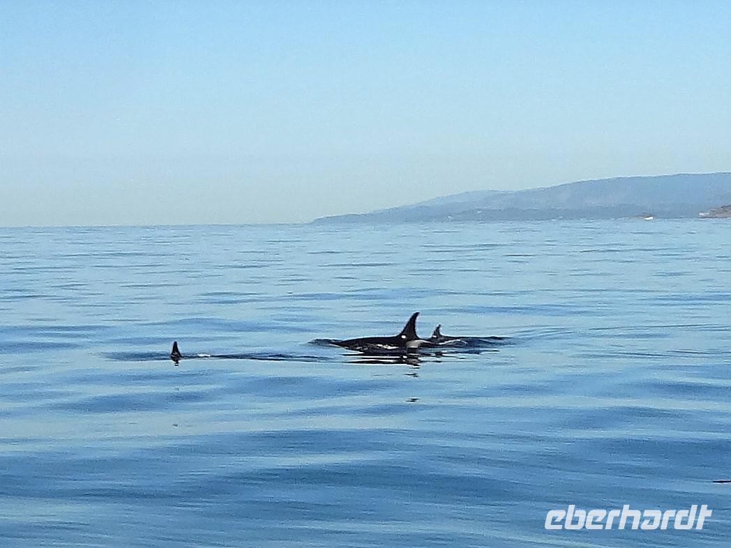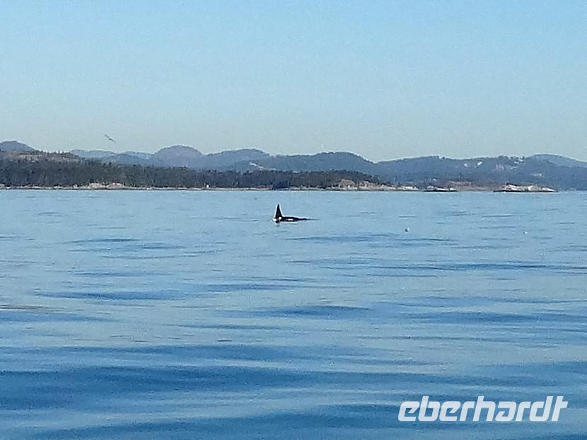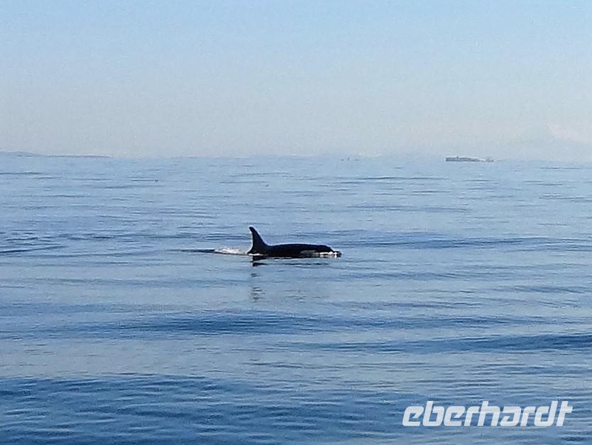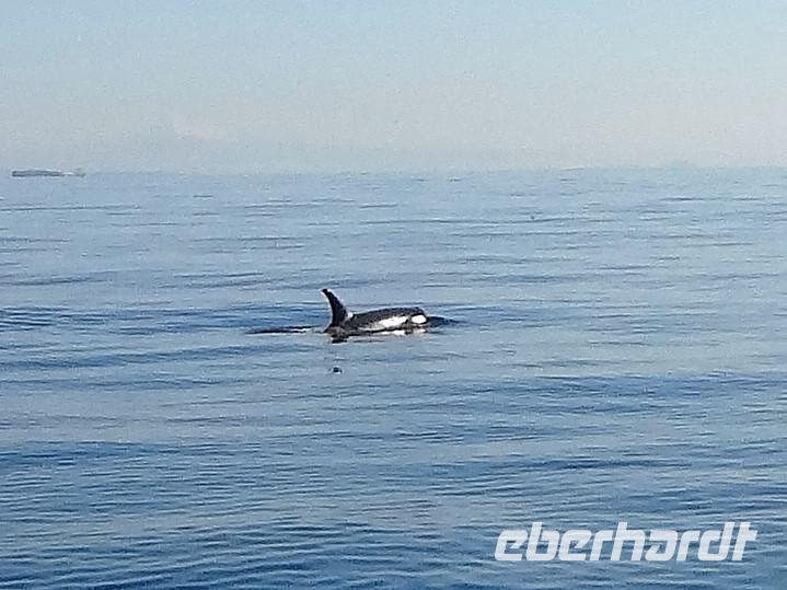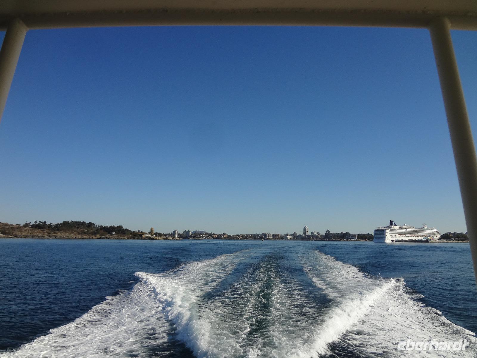 Schoen ist es bei Sonnenschein ohne Wecker aufzuwachen. Das Fruehstueck ist heute leider nicht so schoen. Die Pappkartonbecher fuer Saft, Kaffe und Tee sind nicht nur haesslich und unappetitlich sondern auch noch razioniert und abgezaehlt sowie die Teller. Die haben wohl Angst, dass wir zuviel trinken und essen. Das ist alles sehr eigenartig und DAS Telefon wir gebraucht. Dafuer werden wir mit einem herrlichen Tag verwoehnt und vergessen das Vergangene schnell. Viele haben sich fuer die Walbeobachtungstour angemeldet und andere wandern lieber am Hafen entlang. Bei der Walbeobachtung, sehen wir alsbald 6 Killerwale die auch Orca genannt werden. Sie fischen gerade und Mike, das 20 Jaehrige Maennchen hat wohl soeben eine Robbe oder so gefangen. Er schwimmt im Kreise, taucht ab, stuermt wieder hoch um sich bald wieder in die Tiefe zu stuerzen. Ein wunderbares Schauspiel. Ein aeltere Damen-Orca zieht gemuetlich mit ihrem Baby vorbei und die zwei Schwestern Keiko und Kiko eilen mit Keiko's Baby in Richtung Mike. Das Baby kommt fast nicht nach, so schnell schwimmen die beiden. Alle gehoeren der K-Familie an und wir lernen vieles ueber das Leben der Orca's. Weiter oestlich sollen zwei Buckelwale sein. Nichts wie hin. Tatsaechlich sehen wir sie und viele haben auch die beruehmte Schwanzflosse beim Abtauchen knipsen koennen. Bald flitzen wir wieder ueber die Wellen um uns auch noch die Seehunde und Seeloewen anzuschauen. Hunderte, liegen auf dem Felsen an der Sonne und grunzen und stinken vor sich hin. Ein herrlicher Anblick. Die drei Stunden sind flugs vergangen und der Nachmittag wir nun fuer Einkaeufe, Museums-besuch und eigene Erkundungen ausgenuetzt. Heute haben wir unser Abendessen im nahegelegenen Vista 18. Ein vornehmes Restaurant auf einem Hotel-turm. Die Nacht ist lau und laedt auf einen Verdauungs-spaziergang zum Parlamentsgebaeude ein. Das letzte Foto wird gemacht ehe das Bett uns ruft.