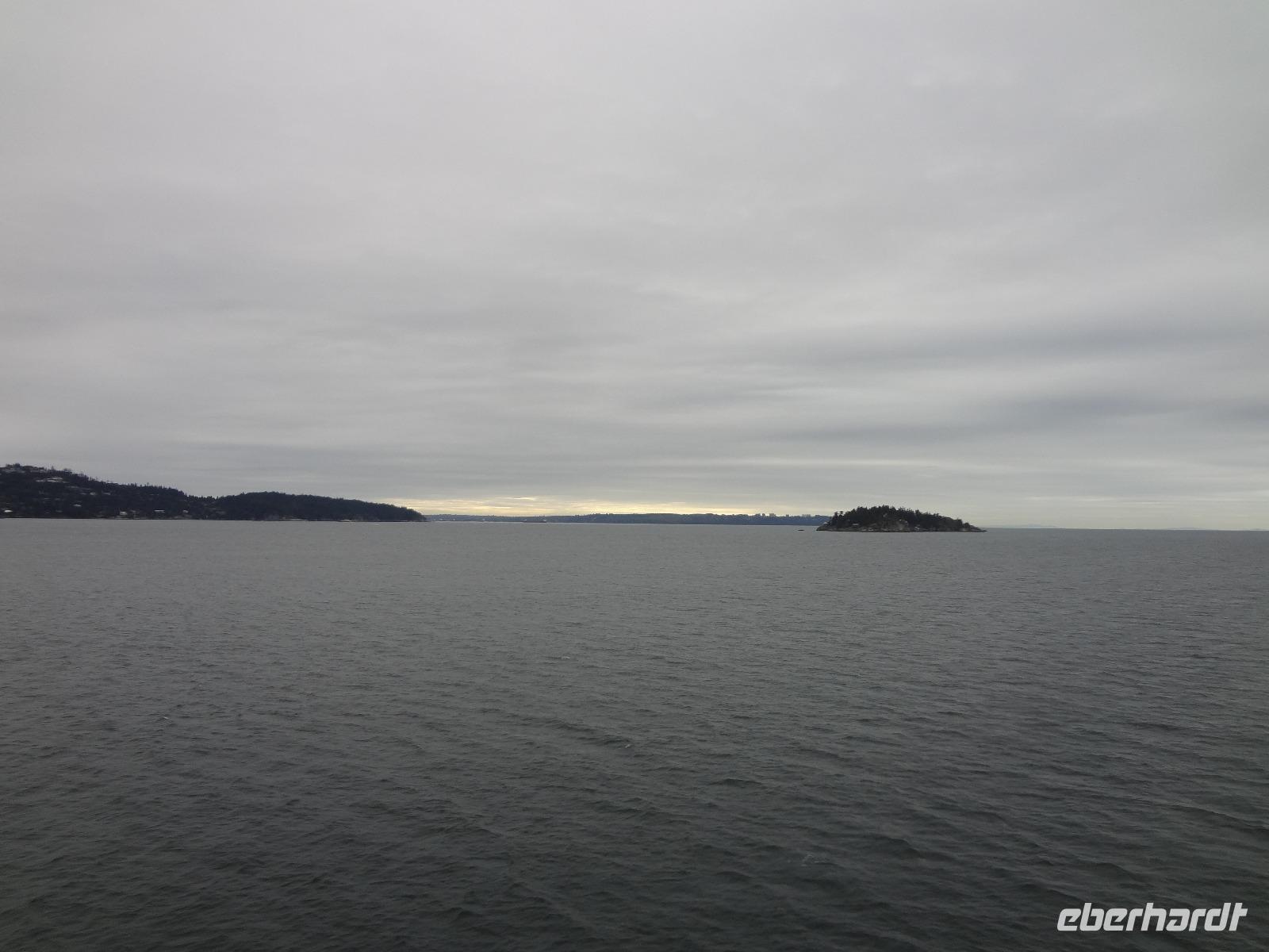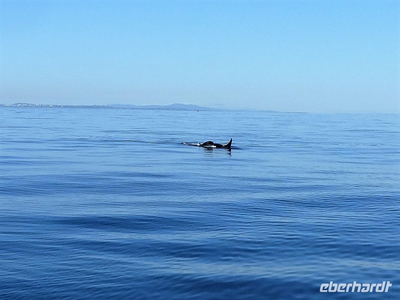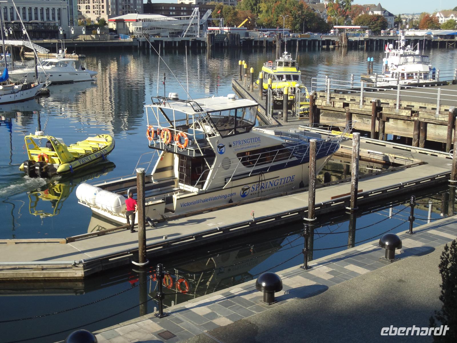 Schoen ist es bei Sonnenschein ohne Wecker aufzuwachen. Das Fruehstueck ist heute leider nicht so schoen. Die Pappkartonbecher fuer Saft, Kaffe und Tee sind nicht nur haesslich und unappetitlich sondern auch noch razioniert und abgezaehlt sowie die Teller. Die haben wohl Angst, dass wir zuviel trinken und essen. Das ist alles sehr eigenartig und DAS Telefon wir gebraucht. Dafuer werden wir mit einem herrlichen Tag verwoehnt und vergessen das Vergangene schnell. Viele haben sich fuer die Walbeobachtungstour angemeldet und andere wandern lieber am Hafen entlang. Bei der Walbeobachtung, sehen wir alsbald 6 Killerwale die auch Orca genannt werden. Sie fischen gerade und Mike, das 20 Jaehrige Maennchen hat wohl soeben eine Robbe oder so gefangen. Er schwimmt im Kreise, taucht ab, stuermt wieder hoch um sich bald wieder in die Tiefe zu stuerzen. Ein wunderbares Schauspiel. Ein aeltere Damen-Orca zieht gemuetlich mit ihrem Baby vorbei und die zwei Schwestern Keiko und Kiko eilen mit Keiko's Baby in Richtung Mike. Das Baby kommt fast nicht nach, so schnell schwimmen die beiden. Alle gehoeren der K-Familie an und wir lernen vieles ueber das Leben der Orca's. Weiter oestlich sollen zwei Buckelwale sein. Nichts wie hin. Tatsaechlich sehen wir sie und viele haben auch die beruehmte Schwanzflosse beim Abtauchen knipsen koennen. Bald flitzen wir wieder ueber die Wellen um uns auch noch die Seehunde und Seeloewen anzuschauen. Hunderte, liegen auf dem Felsen an der Sonne und grunzen und stinken vor sich hin. Ein herrlicher Anblick. Die drei Stunden sind flugs vergangen und der Nachmittag wir nun fuer Einkaeufe, Museums-besuch und eigene Erkundungen ausgenuetzt. Heute haben wir unser Abendessen im nahegelegenen Vista 18. Ein vornehmes Restaurant auf einem Hotel-turm. Die Nacht ist lau und laedt auf einen Verdauungs-spaziergang zum Parlamentsgebaeude ein. Das letzte Foto wird gemacht ehe das Bett uns ruft.