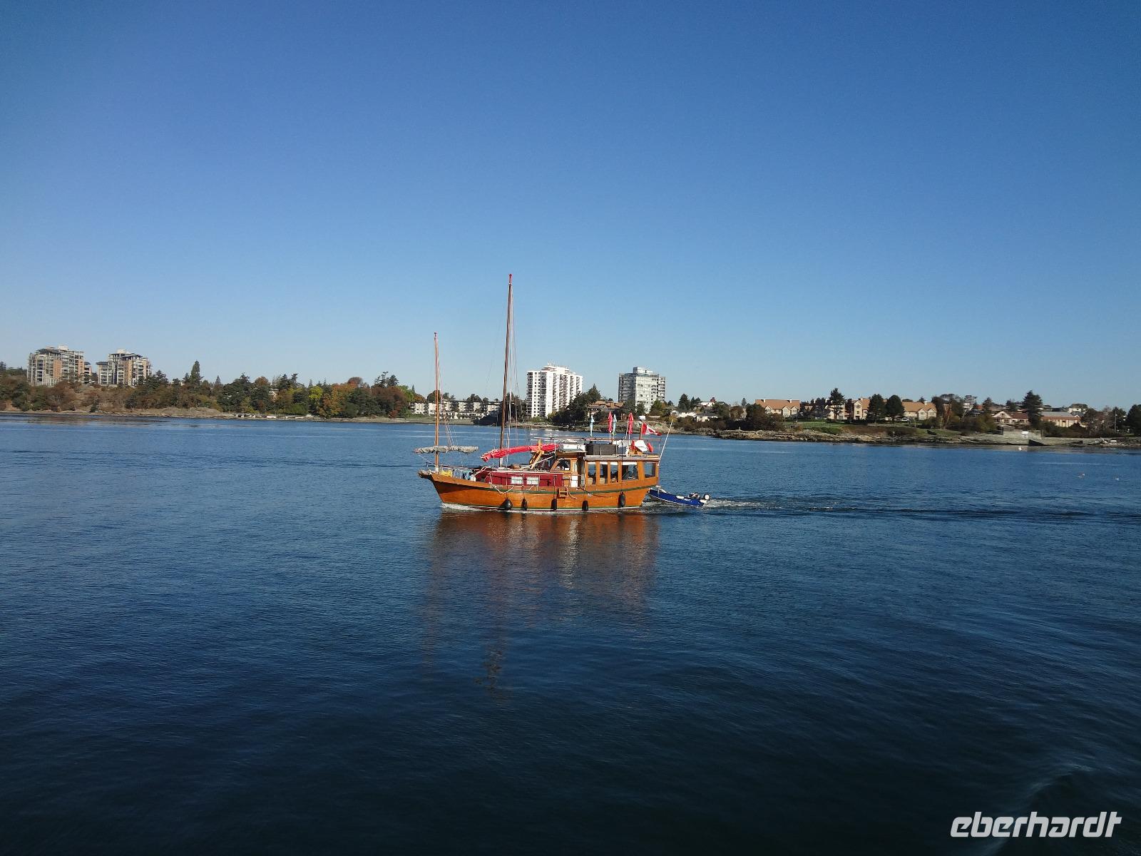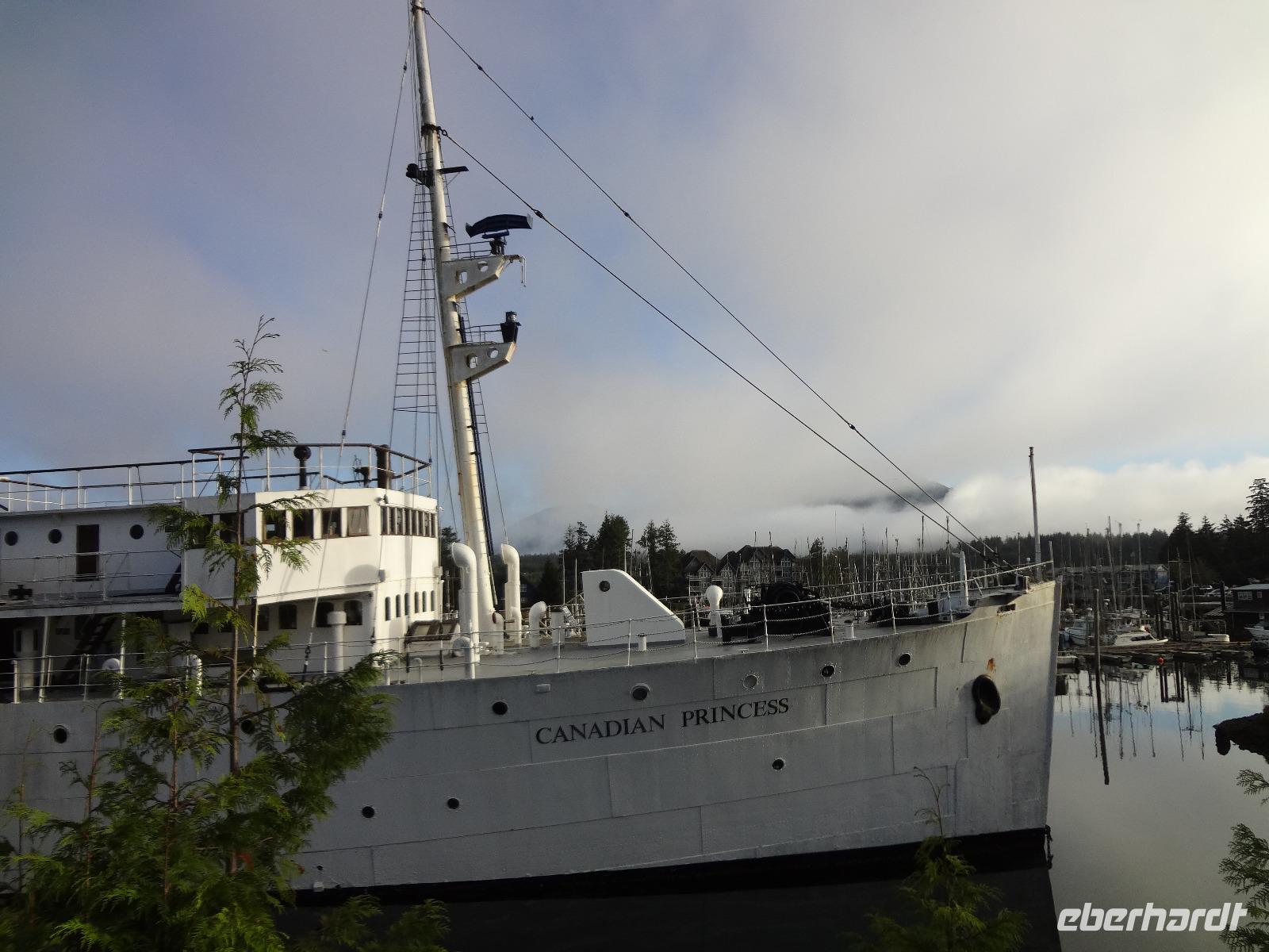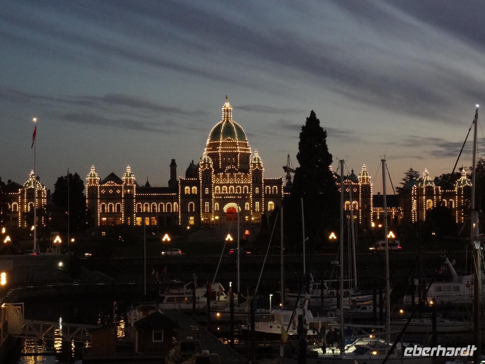 Herrlicher Sonnenschein erwartet uns heute. Noch schnell das letzte Bild von dem schoenen alten Schiff „Canadian Princess". Sie war nun 30 Jahre hier in Ucluelet angelegt und wird morgen den Hafen verlassen. Ein chinesischer Millionaer hat das Museumsstueck gekauft und niemand weiss so richtig, wohin sie segeln, oder besser „gezogen" wird. Wir werden es sicher in den Zeitungen erfahren. Ein Halt beim Wickaninnish Center beschert uns einen gebuehrenden Abschied von Pacific Rim National Park. Es war sehr schoen und hat uns sehr gefreut ! Haette Kaiser Franz Joseph gesagt. Die Sonnenstrahlen glitzern auf den langen Wellen, der Dunst des Meeres huellt die Felsen in ein zartes Licht und die angeschwemmten Hoelzer bleiben wie Kunstwerke am Strande liegen. Unsere Reise fuehrt uns wieder zurueck in die Wirklichkeit, vorbei in Port Alberni mit einem Stopp bei Tim Hortons fuer Kaffee und Donuts, sodass wir gestaerkt nach Chemainus weiterfahren koennen. Chemainus ist ein Freilichtmuseum ganz besonderer Art. Das Dorf ist eine Bildergallerien. Hier bleiben wir eine Weile, um die vielen Gemaelde anzuschauen, und auch was kleines zu Mittag zu finden. Danach gehts weiter nach Victoria. Hauptstadt von Britisch Columbien mit seinen schoenen Blumenampeln, dem majestaetischen Parlament dem lebhaften Hafen und natuerlich dem maechtigen Empress Hotel. Wir machen eine Stadtfuehrung zu Fuss und lernen so gleich schon Chinatown mit ihrer eigenen Schule und engen Gassen kennen, sowie die Bastion, die Government Street mit allen ihren tollen Geschaeften und die Agatha Christi-Romeo und Juliette-Geschichte um den Architekten des Parlaments. Unser Hotel ist ganz in der Naehe des Hafens und das feine Restaurant indem wir fuer unser Abendessen gebucht sind, hat eine herrliche Aussicht auf das beleuchtete Parlamentsgebaeude. Mmmm, der Steak, der Lachs, das Haehnchen, alles ist so lecker, dass viele danach noch im Irish Pub bei live Musik auf ein Bierchen einkehren. So wird es eine kuerzere Nacht im Hotelzimmer, aber Morgen muessen wir auch nicht so frueh wieder raus.