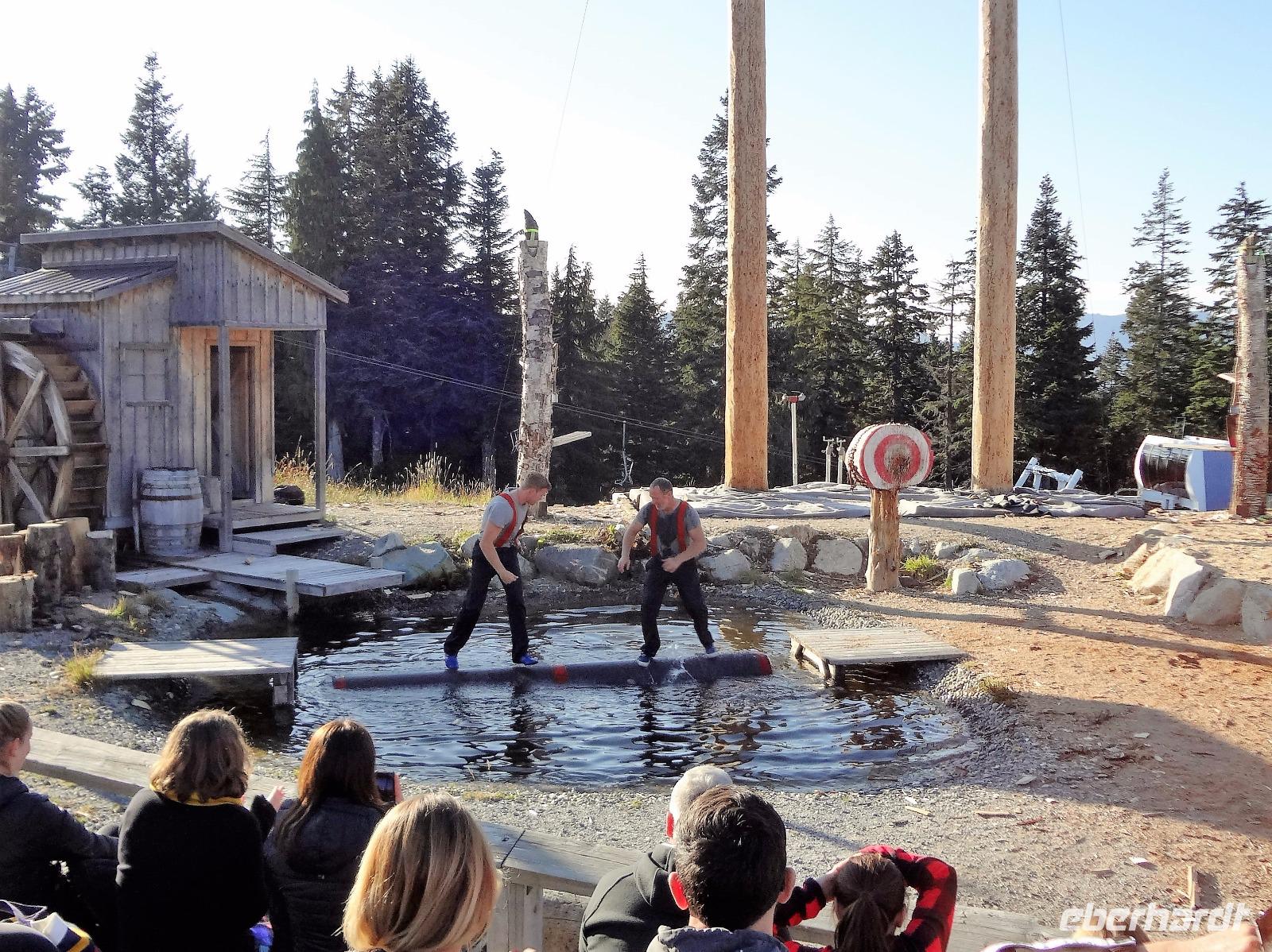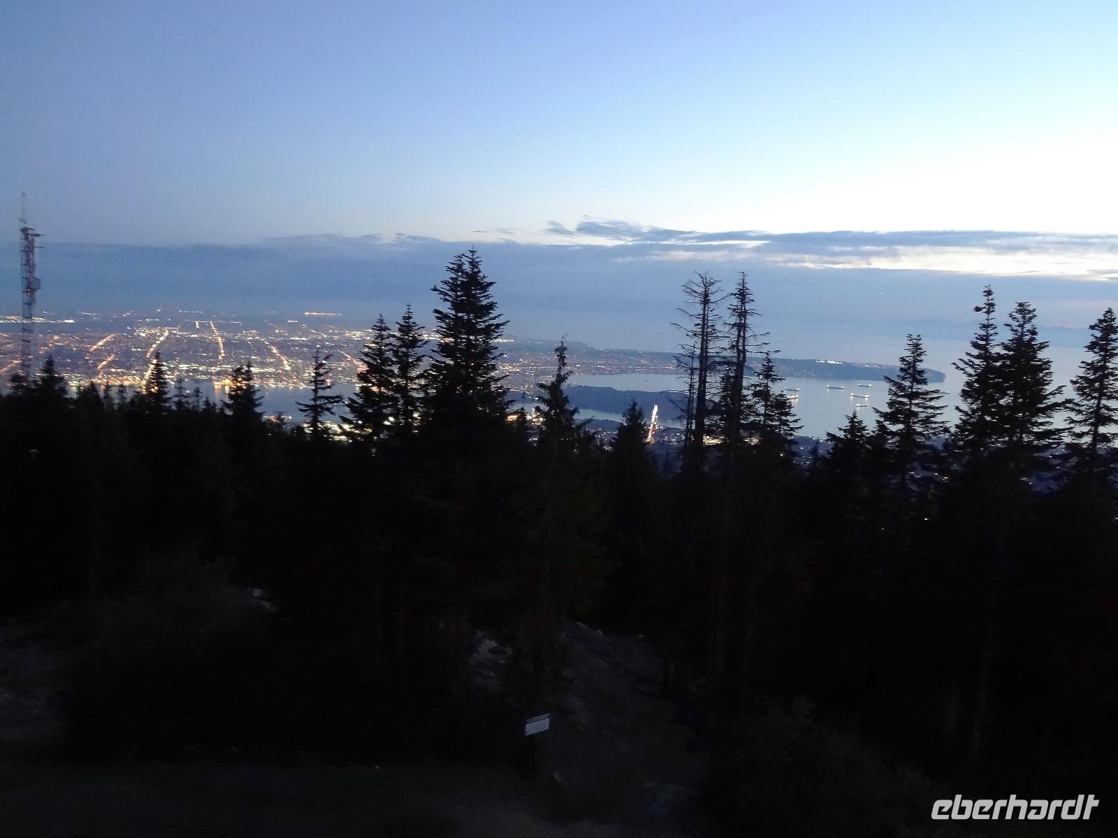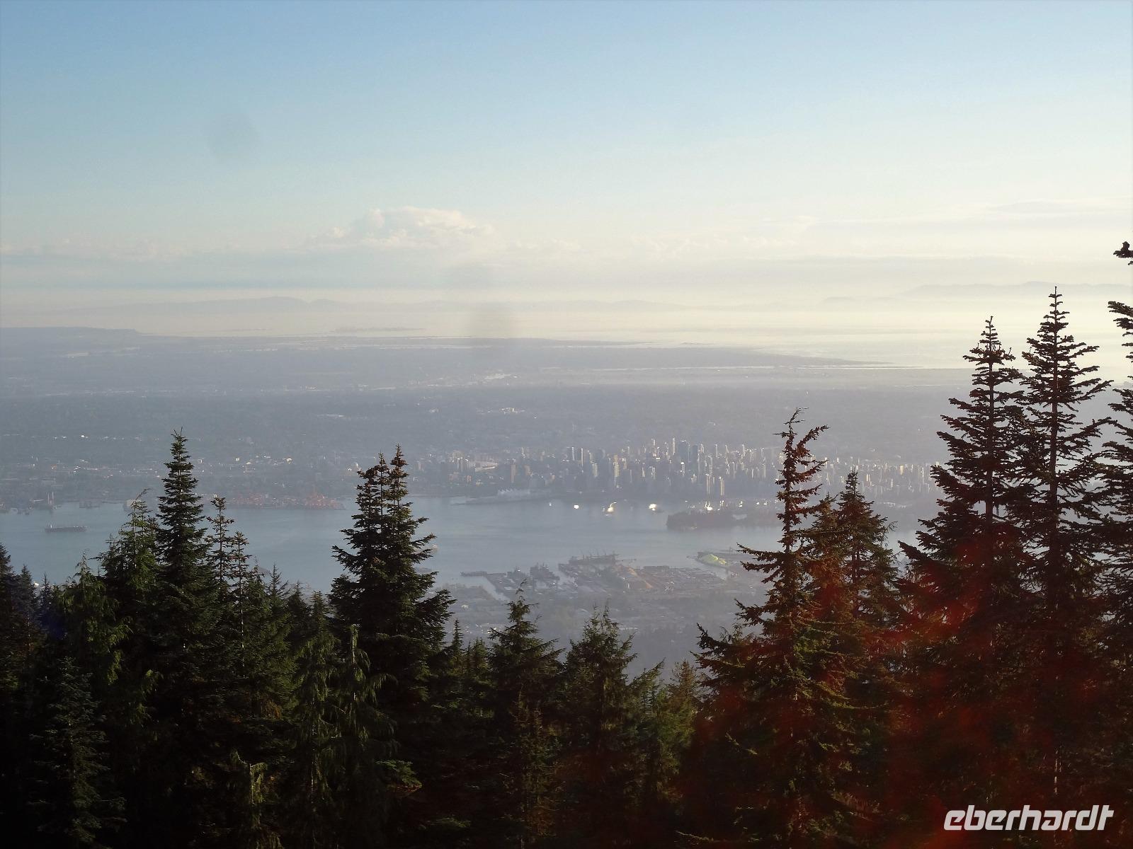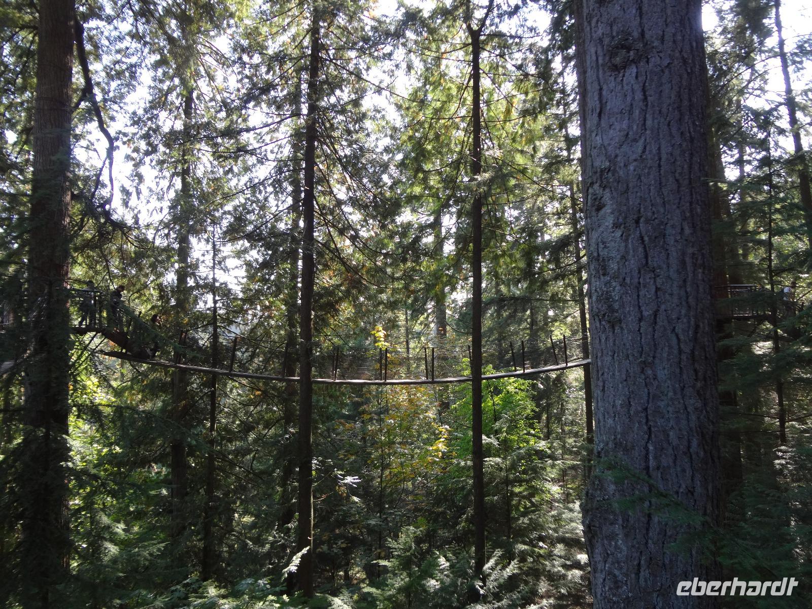 Sonnenschein, wunderbarer Sonnenschein. Das Fruehstuecksbuffet ist schoen und unser neuer Kleinbus faehrt uns entlang der Nordkueste Vancouvers zu einem schoenen Park. Wir wandern 1 Stunde im Lighthouse Park wo wir immer wieder zu herrlichen Aussichtspunkten gelangen und wo wir uns auch von den Urbaeumen gebuehrend verabschieden koennen. Der Wanderweg sei relativ ebenerdig wird uns prophezeit....aber eben, nur relativ.....es geht rauf und runter, ueber Wurzeln und Steine, auf Felsen hinauf und unter Beaumen durch. Nun sind unsere Lungen von der guten Luft angereichert und wir lassen uns zu einer der laengesten Haengebruecken der Welt bringen. Bei Capilano Suspension Bridge, so heisst diese Bruecke, amuesieren wir uns ueber den Lebenswandel ihrer frueheren Besitzer, bewundern die schoen geschnitzten Totem und gelangen so zur Bruecke. Wir trauen uns alle hinueber, auch weil man ueberall in diesem Park versteckte Stempel hat wo man seinen Weg abstempeln lassen kann, zur Erinnerung ! Natuerlich sind einige Stempel auf der anderen Seite der Bruecke. Dort klettern wir auch auf einen Turm, wo beim Wipfelweg verschiedene Bruecken an hohen Bauemen angebracht sind. Die Fotoapparate arbeiten wiede sehr fleissig und ihre Besitzer versuchen hinter ihnen herzulaufen. Wieder zurueck auf der Eingangsseite, erleben wir auch den neuen Weg, der an einer Felswand angeklebt ist. Da braucht man noch mehr Mut, aber uns Wanderer schuechtert sowas nicht ein. Jetzt verstehen wir auch ein wenig, wie es den Kletterer geht die auf einer Via Ferrata gehen. Nun ist aber Zeit fuers Picknick. Tische, Stuehle, Baenke gibt es zur Genuege und man riecht den Duft der Speisen die gegrillt werden. Nach der Pause fahren wir zur Capilano Fischaufzucht und gleich danach schauen wir uns den Damm von Capilano Lake an. Es werden gerade Arbeiten am Damm durchgefuehrt und so machen wir ein Foto von der unendlichen Tiefe und dem Wasser, was da hinunterstuerzt. Das naechste Ziel und Abenteuer wartet schon auf uns, mit einer Gondel schweben wir auf Vancouvers Hausberg, den Grouse Mountain. Auf 1200 Meter scheint es hier waermer zu sein als unten am Meer und wir wandern kurzaermelig zu dem Grizzly Habitat um zu schauen, was Grinder und Coola so machen. Es ist ihnen zu warm und sie doesen vor sich hin. Der kurze, langsame Peak Sessellift ist heute das letzte mal geoeffnet und dieses Vergnuegen wollen wir auch mitmachen. Nichts wie hin und „Aufi" gehts. Uh, hu, die Aussicht von hier oben ist noch gigantischer als jene von der Gondel aus. Ganz Vancouver liegt uns zu Fuessen. Nur die Holzfaeller-show, ueberzeugt uns doch wieder hinunter zu fahren. Die Show ist echt lustig und die zwei Holzfaeller kaempfen um den ersten Preis. Sie faellen, sie kraxeln, sie balancieren und sie schnitzen mit Kettensaegen, der Holzfaeller rechts gewinnt schlussendlich und die Freude ist gross. Unsere Freude auch, denn Grinder ist aufgewacht und spaziert gemaechlich zum Wasser. Er ist schoen dick angefressen da er ja auch bald in den Winterschlaf gehen wird. Wir hingegen, werden nun mit einem wunderbaren sophistizierten Abendessen verwoehnt. Das Menue hat sogar das Eberhardt Logo drauf und das Essen ist so vorzueglich, dass wir uns lange daran erinnern werden. Das Abendessen bei der Aussicht ist ein Erlebnis fuer sich. Die englische Koenigsfamilie die im Moment in Victoria verweilt wird in den naechsten Tagen auch hier essen, hoffentlich haben sie es auch so schoen und lustig wie wir. Ein schoener Abend soll auch gebuehrend abgerundet werden und die Ueberraschung, der 3 Stretch Limousinen ist gelungen. Kein Weihnachtsbaum hat je so viele gleuckliche Gesichter auf einmal gesehen. Stilvoll fahren wir durch Downtown Vancouver bis zu unserem Hotel. Der Absacker in der hauseigenen Bar mit den 2 Pianospielern haben diesen Abend noch musikalisch abgerundet und die Martinis und Mohitos schmeckten auch ganz lecker. So haben wir einen wunderbaren letzten Tag in Vancouver verbracht.
