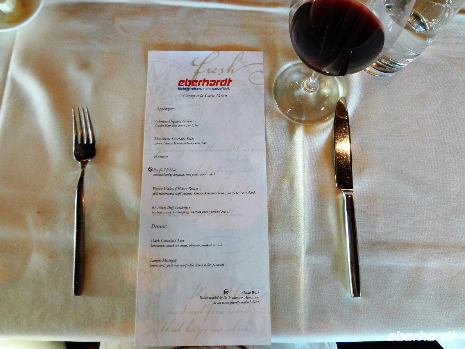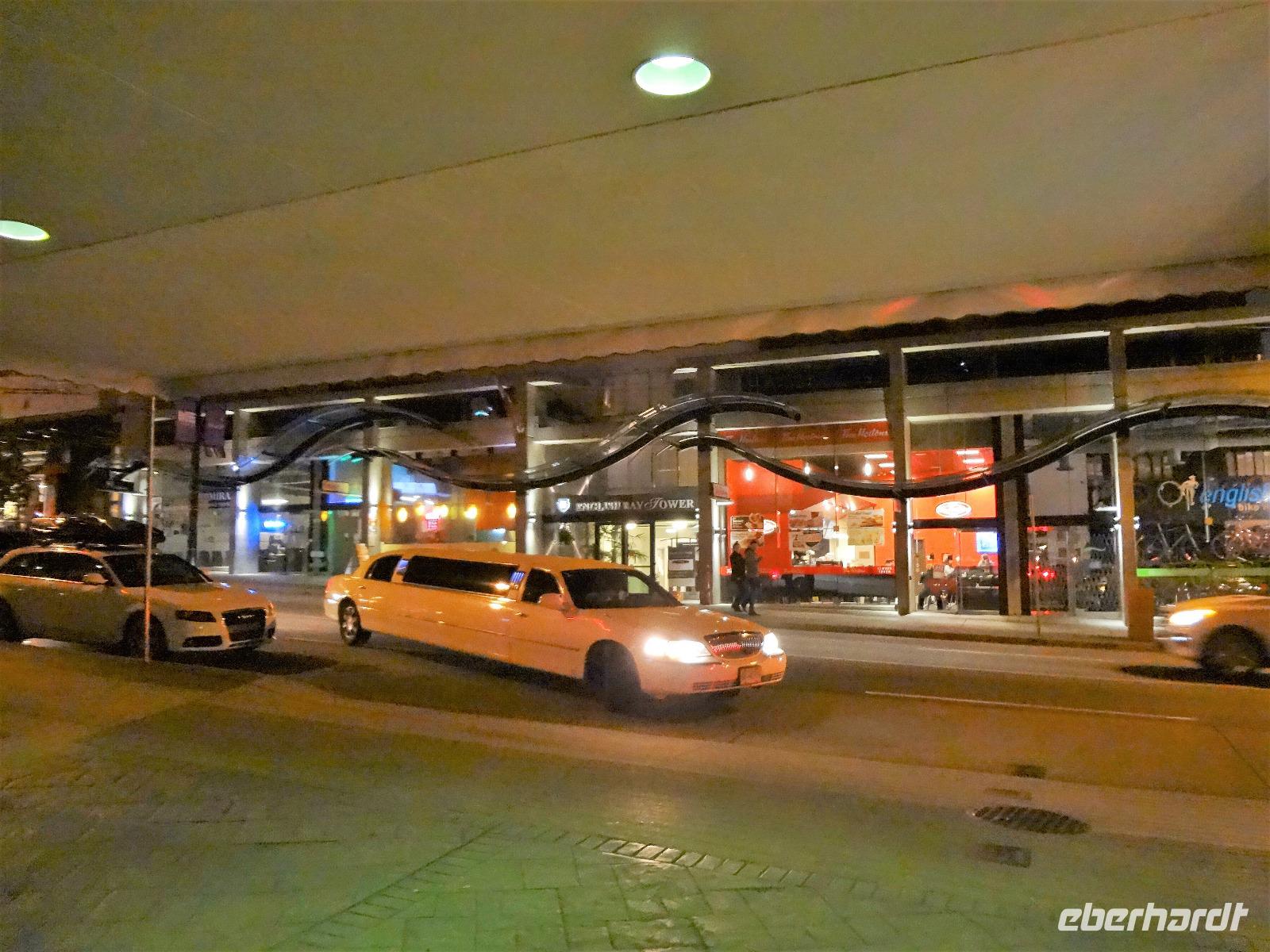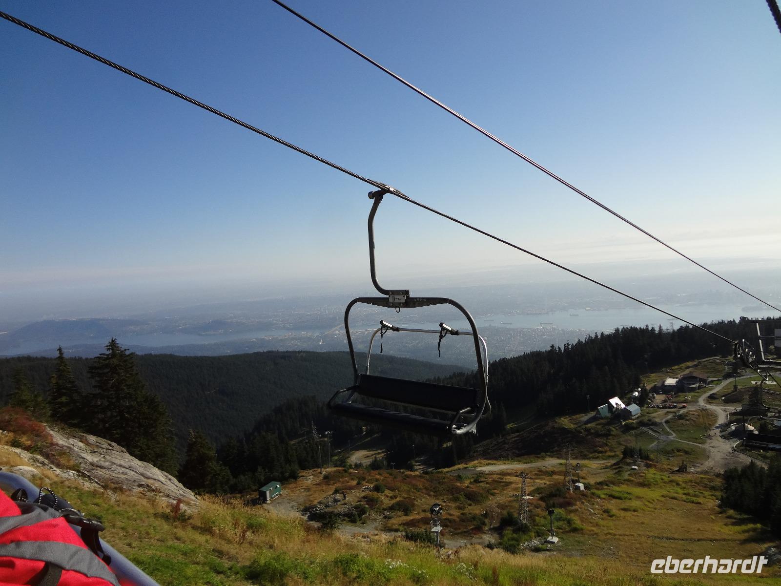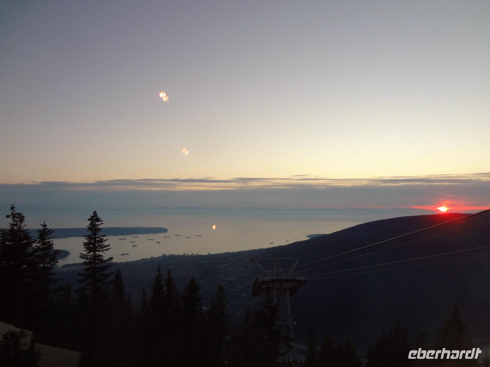 Sonnenschein, wunderbarer Sonnenschein. Das Fruehstuecksbuffet ist schoen und unser neuer Kleinbus faehrt uns entlang der Nordkueste Vancouvers zu einem schoenen Park. Wir wandern 1 Stunde im Lighthouse Park wo wir immer wieder zu herrlichen Aussichtspunkten gelangen und wo wir uns auch von den Urbaeumen gebuehrend verabschieden koennen. Der Wanderweg sei relativ ebenerdig wird uns prophezeit....aber eben, nur relativ.....es geht rauf und runter, ueber Wurzeln und Steine, auf Felsen hinauf und unter Beaumen durch. Nun sind unsere Lungen von der guten Luft angereichert und wir lassen uns zu einer der laengesten Haengebruecken der Welt bringen. Bei Capilano Suspension Bridge, so heisst diese Bruecke, amuesieren wir uns ueber den Lebenswandel ihrer frueheren Besitzer, bewundern die schoen geschnitzten Totem und gelangen so zur Bruecke. Wir trauen uns alle hinueber, auch weil man ueberall in diesem Park versteckte Stempel hat wo man seinen Weg abstempeln lassen kann, zur Erinnerung ! Natuerlich sind einige Stempel auf der anderen Seite der Bruecke. Dort klettern wir auch auf einen Turm, wo beim Wipfelweg verschiedene Bruecken an hohen Bauemen angebracht sind. Die Fotoapparate arbeiten wiede sehr fleissig und ihre Besitzer versuchen hinter ihnen herzulaufen. Wieder zurueck auf der Eingangsseite, erleben wir auch den neuen Weg, der an einer Felswand angeklebt ist. Da braucht man noch mehr Mut, aber uns Wanderer schuechtert sowas nicht ein. Jetzt verstehen wir auch ein wenig, wie es den Kletterer geht die auf einer Via Ferrata gehen. Nun ist aber Zeit fuers Picknick. Tische, Stuehle, Baenke gibt es zur Genuege und man riecht den Duft der Speisen die gegrillt werden. Nach der Pause fahren wir zur Capilano Fischaufzucht und gleich danach schauen wir uns den Damm von Capilano Lake an. Es werden gerade Arbeiten am Damm durchgefuehrt und so machen wir ein Foto von der unendlichen Tiefe und dem Wasser, was da hinunterstuerzt. Das naechste Ziel und Abenteuer wartet schon auf uns, mit einer Gondel schweben wir auf Vancouvers Hausberg, den Grouse Mountain. Auf 1200 Meter scheint es hier waermer zu sein als unten am Meer und wir wandern kurzaermelig zu dem Grizzly Habitat um zu schauen, was Grinder und Coola so machen. Es ist ihnen zu warm und sie doesen vor sich hin. Der kurze, langsame Peak Sessellift ist heute das letzte mal geoeffnet und dieses Vergnuegen wollen wir auch mitmachen. Nichts wie hin und „Aufi" gehts. Uh, hu, die Aussicht von hier oben ist noch gigantischer als jene von der Gondel aus. Ganz Vancouver liegt uns zu Fuessen. Nur die Holzfaeller-show, ueberzeugt uns doch wieder hinunter zu fahren. Die Show ist echt lustig und die zwei Holzfaeller kaempfen um den ersten Preis. Sie faellen, sie kraxeln, sie balancieren und sie schnitzen mit Kettensaegen, der Holzfaeller rechts gewinnt schlussendlich und die Freude ist gross. Unsere Freude auch, denn Grinder ist aufgewacht und spaziert gemaechlich zum Wasser. Er ist schoen dick angefressen da er ja auch bald in den Winterschlaf gehen wird. Wir hingegen, werden nun mit einem wunderbaren sophistizierten Abendessen verwoehnt. Das Menue hat sogar das Eberhardt Logo drauf und das Essen ist so vorzueglich, dass wir uns lange daran erinnern werden. Das Abendessen bei der Aussicht ist ein Erlebnis fuer sich. Die englische Koenigsfamilie die im Moment in Victoria verweilt wird in den naechsten Tagen auch hier essen, hoffentlich haben sie es auch so schoen und lustig wie wir. Ein schoener Abend soll auch gebuehrend abgerundet werden und die Ueberraschung, der 3 Stretch Limousinen ist gelungen. Kein Weihnachtsbaum hat je so viele gleuckliche Gesichter auf einmal gesehen. Stilvoll fahren wir durch Downtown Vancouver bis zu unserem Hotel. Der Absacker in der hauseigenen Bar mit den 2 Pianospielern haben diesen Abend noch musikalisch abgerundet und die Martinis und Mohitos schmeckten auch ganz lecker. So haben wir einen wunderbaren letzten Tag in Vancouver verbracht.