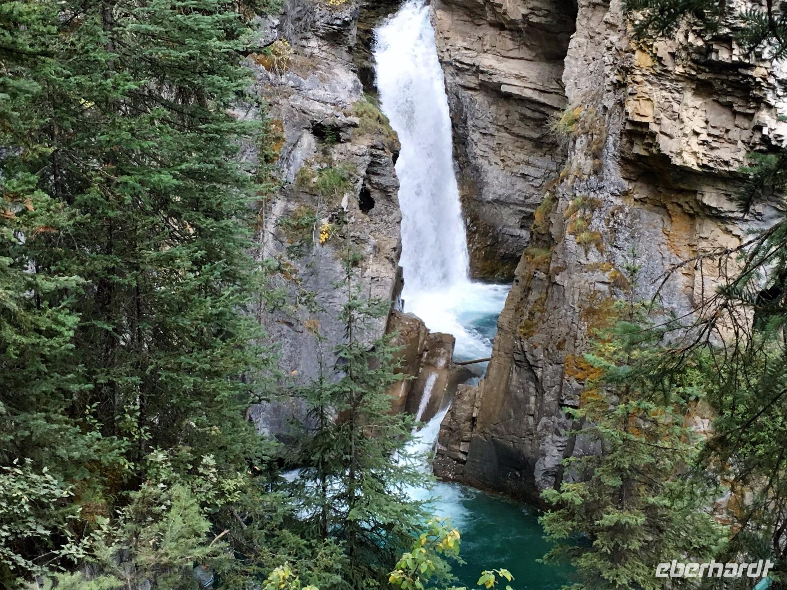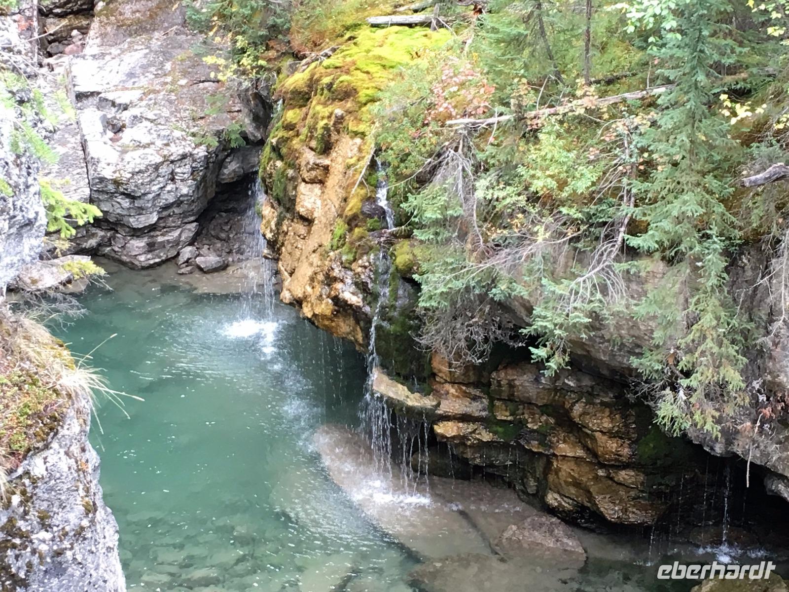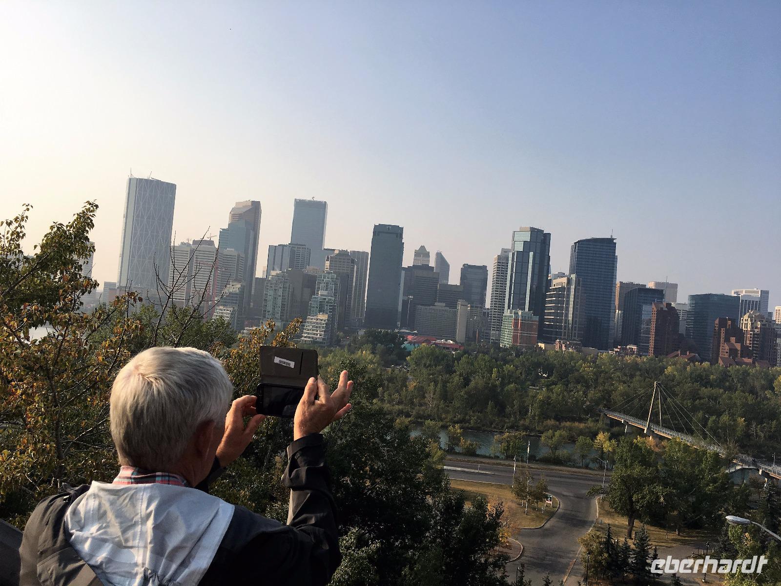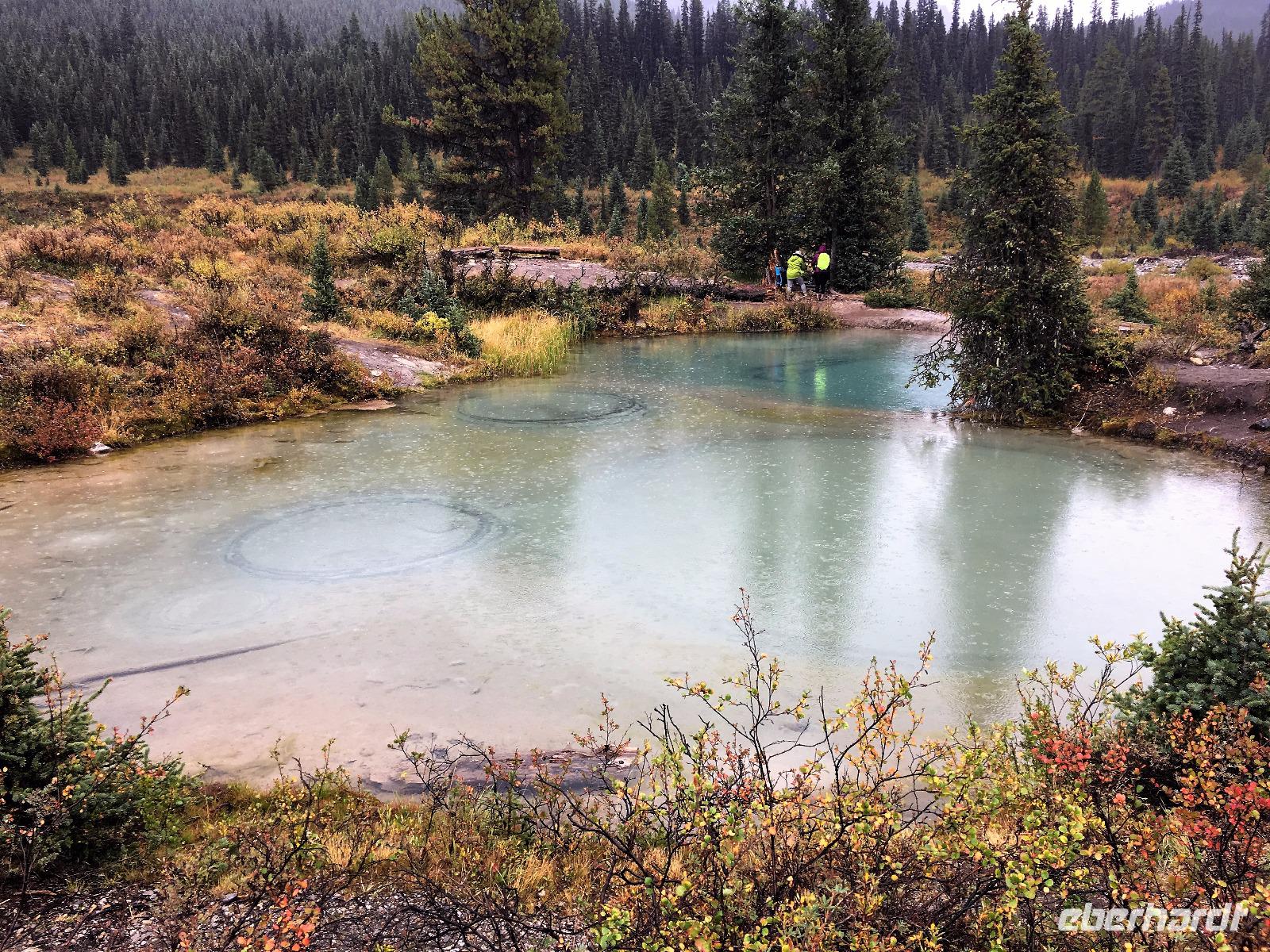 Zwei Reiseteilnehmer sind erst heute in der Frueh angekommen. Die Freude ist umso groesser, dass wir nun eine komplette Reisefamilie sind. Les ist unser Fahrer fuer die ersten Tage. Er faehrt uns erstmal durch Calgary und wir staunen ueber die hohen Glasspalaeste dieser jungen, reichen Stadt. Die Stampede muss sehr lustig sein und die Einkaufsstrassen in der 2. Etage der Haeuser sehr interessant. Aber die Rockies rufen uns schon. Ein Stop muss sein um ein Bild von Calgary zu knipsen und ein Stop um zu schauen ob Eddy der Eagle nochmals Schanze springt wie damals zur Olympiade 1988. Dies und viele Geschichten bringen uns in die ersehnten Berge. Die drei Schwestern gruessen uns, Cascade Mt schimmert durch den Dunst der Rauchschwaden und Mount Rundel schaut wuchtig auf uns hernieder. Erstmal fahren wir gleich nach Banff hinein, da wir uns ein Picknick fuer heute mittag einkaufen wollen. So ein kanadischer Supermarkt ist schon etwas anders und so stochern wir herum bis wir nicht das Passende finden. Es gibt alles, man muss es bloss finden ! Jetzt geht es auf unsere erste Wanderung. In Johnston Canyon wandern wir bis ganz hinauf zu den Ink Pots. Heute ist Samstag und halb Calgary scheint hier unterwegs zu sein. Der erste Kilometer ist geteert und bummvoll. Wir ueben uns im Slalomlauf und kurven geschickt durch die Leute, Kinder und Hunde. Schoene Wasserfaelle begleiten diese Schlucht und erst nach dem 3. Wasserfall werden es weniger Wanderer. Oh, nein, es faengt an zu tropfen. Bald schuettet es regelrecht und die mitgebrachten Jacken muessen nun alle an die frische Luft zum Wassertest. Es ist bereits 13:15 und bei uns knurrt es unter der Regenjacke. Da muss man nachgeben. Im Walde, auf gefallenen Baeumen sitzend, kosten wir nun das Auserwaehlte. So richtig gemuetlich ist es aber nicht, also gehen wir mutig und entschlossen bis ganz hinauf zu den Tintenfaesser. Da steht er ja, wie ein Maennchen im Walde, versteckt hinter einem Baum findet uns unser Vorlaeufer. Gott Sei Dank haben wir ihn wieder, so sind wir wieder komplett und von den Baeren gesichert !! Die Tintenfaesser sind kleine Seen die unterirdisch gespiesen werden. Da der Boden aus Sand besteht sieht man grosse und kleine Ringe in den Seen wo das Wasser hinaufgestossen wird. Es regnet immer mehr, unsere Frisuren sind nun sehr natuerlich geworden und so wandern wir schwatzend und diskutierend wieder hinunter zu unserem Bus. Wir waren geschlagene 4 Stunden unterwegs und nun gibt es endlich die Belohnung fuer all die Strapazen. Ein feiner Whisky wird offeriert dazu kanadische Snacks die ausschauen wie mini-Pommes. Die Busfahrt zurueck zu unserem Hotel ist heiter und wir wollen nun die Badesachen in den Zimmer holen, damit der naechste Ausflug auch gelingen moege. Die Hot Springs von Banff sind gerade das richtige fuer unsere armen und mueden Muskeln und Glieder. Nach 20 Minuten sind wir gar-gekocht in dem warmen Schwefelwasser sodass wir mit Les wieder zum Hotel fahren koennen. Haetten wir nun Zeit, wuerden wir alle gleich einschlafen, aber nein, es geht gleich weiter zum Abendessen ! Auch das ist gelungen, eine schoene Salatbar und ein weicher zarter Steak erfreuen unsere Gaumen. Jetzt aber nichts wie ab in die Zimmer sonst kommt der Elisabeth nochwas in den Sinn. Gute Nacht