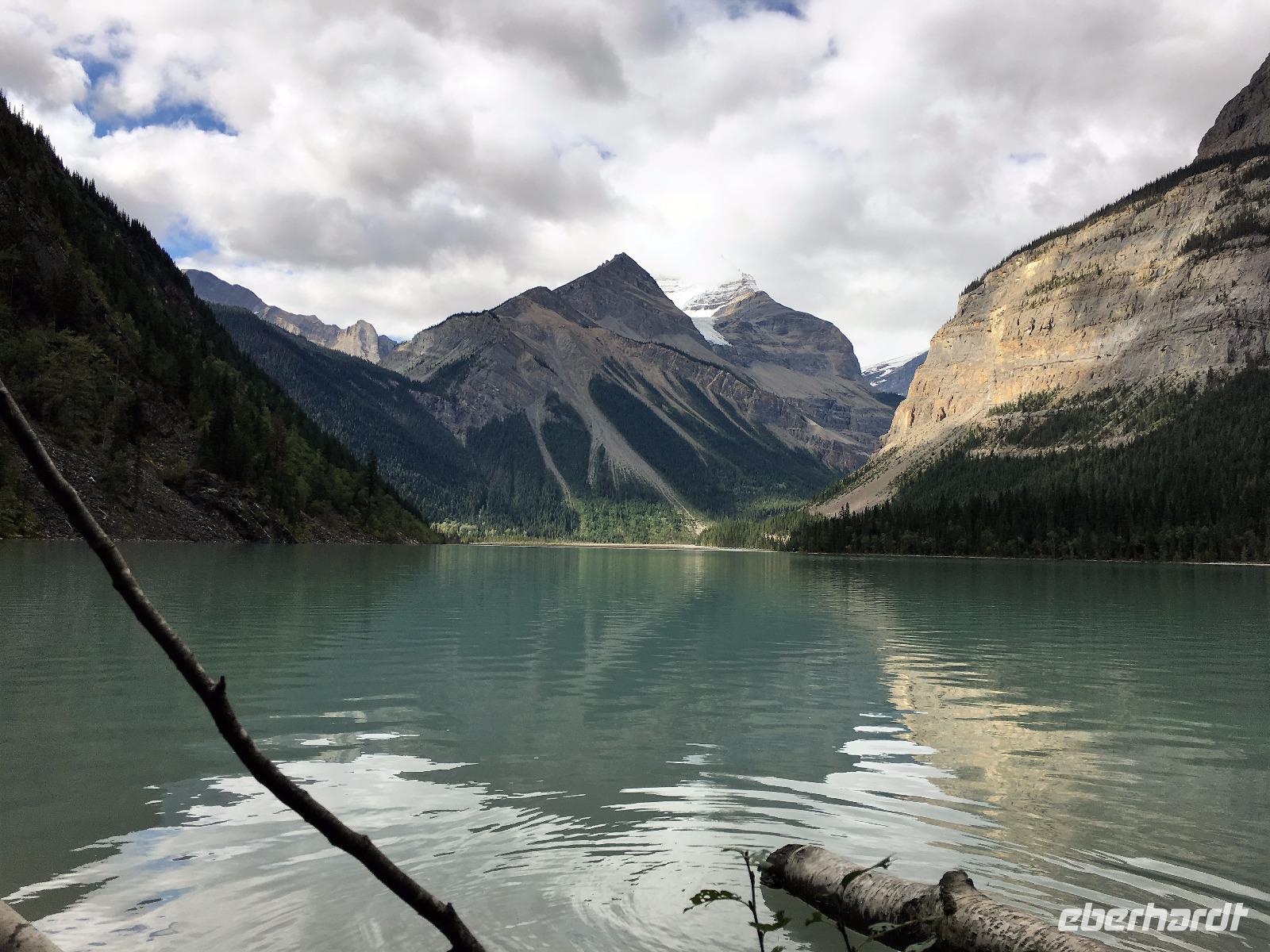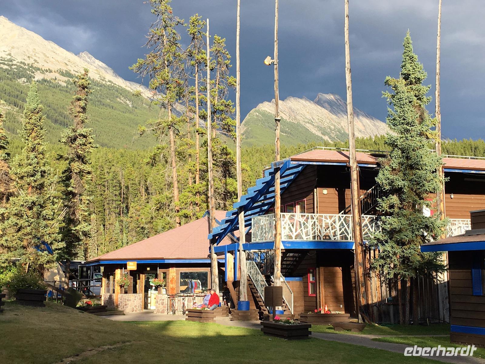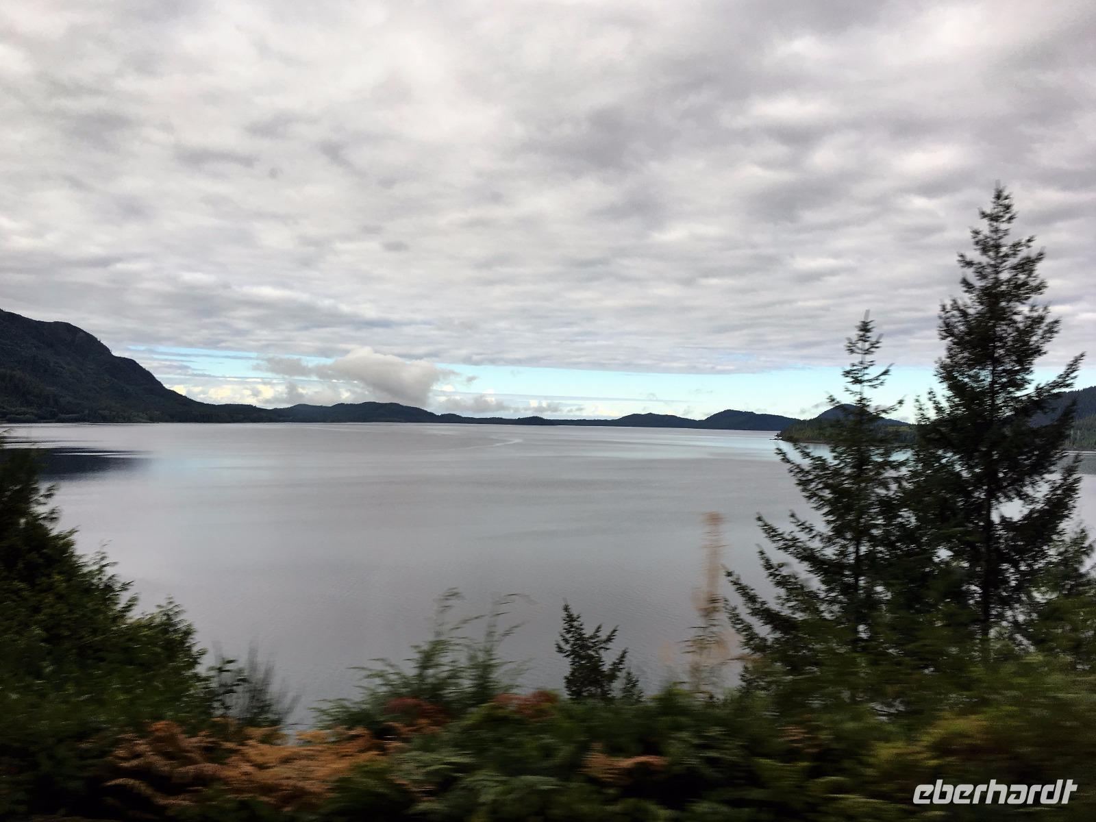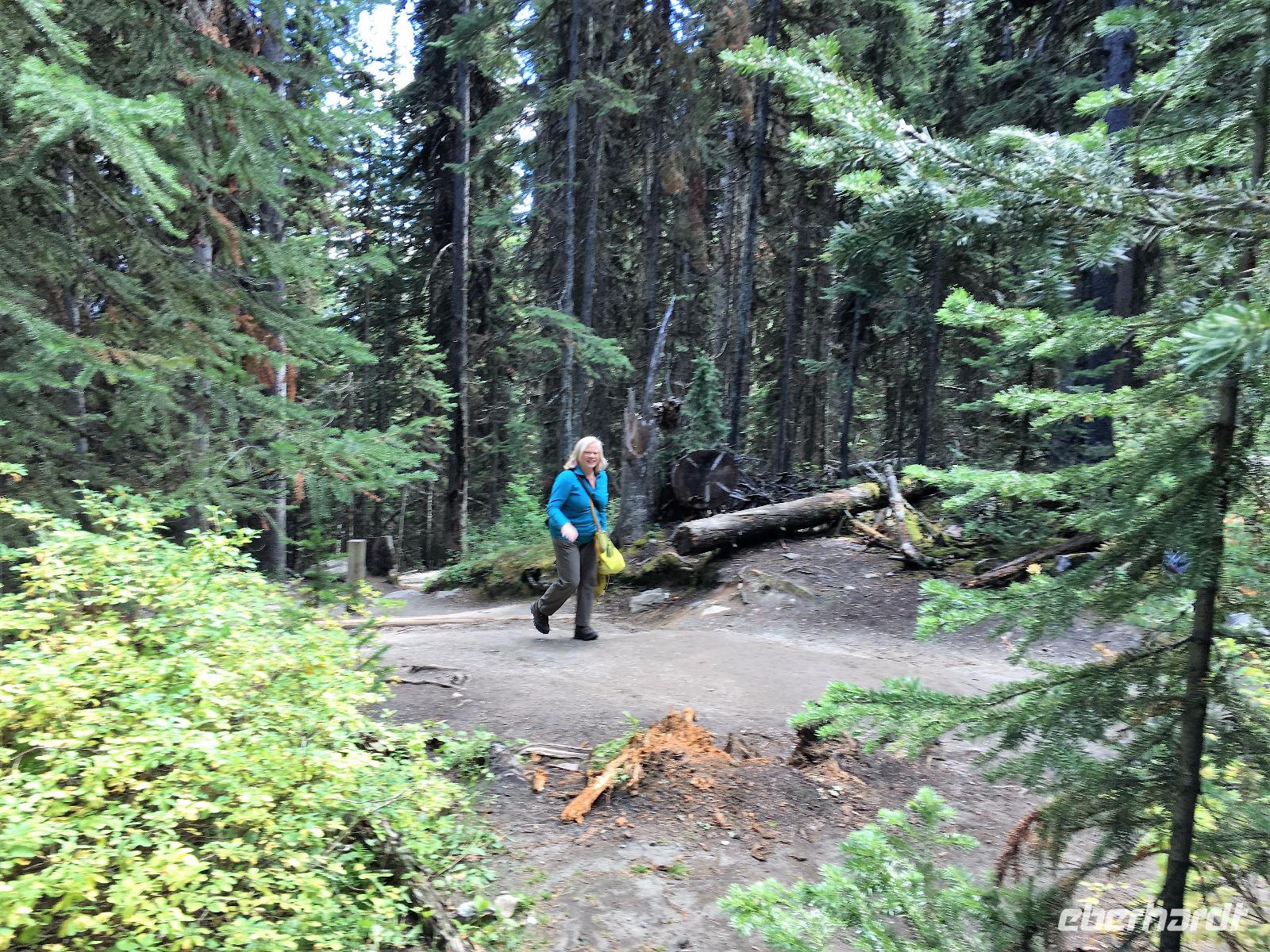 Nach dem Klopfen an meiner Tuere strecke ich auch gleich meinen Kopf erwartungsvoll zum Fenster hinaus und meine Nase wird nass, also regnet es. Schnell alle Fenster wieder zu, denn es ist draussen auch sehr kalt. Mein Waldhaeuschen ist jedoch angenhem warm. Nun heisst es wieder alle 7 Sachen zusammen zu packen und Brendan verstaut alles im Bus. Als erstes schauen wir uns die Athabascafaelle zwischen den vielen Touristen an. Manchmal sieht man mehr auf dem Display der anderen als in Natura. Das ist ein sehr beliebter Ort, da er auch spektakulaer ist. Wir wandern auch ganz hinunter in den Canyon. Dort lernen wir, was ein Inukshuk ist und wozu die Inuit diese bauen. Bald gehts weiter zu Pyramid Lake wo wir uns von den Rockies verabschieden. Bei Patricia Lake hingegen staunen wir ueber die «Operation Habakuk». Nun ist es aber wirklich Zeit diese schoene Gegen zu verlassen, denn Britisch Kolumbien erwartet uns schon. Ueber der grossen Wasserscheide treffen wir auf den Fraser Fluss der erste Fluss der in den Pazifischen Ozean fliesst. Wir wandern auch eine Stunde diesem Fluss entlang, durch dichtgruenes Dickicht mit schoenen Aussichten auf den reissenden Fluss und die Berge. Waermer ist die Luft hier, auch feuchter, es ist auch frueher am Vormittag, da wir eine Stunde gewonnen haben, wir gluecklichen. Nach einem kleinen Mittagessen gehen wir nun auf unsere zweite Wanderung. Auf dem Berg Trail wandern wir bis zum Kinney Lake. Dort gniessen wir die herrliche Aussicht und die Spiegelung die sich hier bietet. Der gute Mount Robson ist leicht angezuckert doch er zeigt heute bloss die unteren zwei drittel. Die uebliche Wolke huellt den Rest des maechtigen Berges ein. Die Wanderung ist schoen, interessant und der Weg ist angenehm breit, sodass wir viel plaudern koennen. Muede fahren wir nun die vielen Kilometer zu unserem Hotel nach Clearwater. Ahh, das Abendessen, so fein, so koestlich. Dieser Tag der mit Regen begonnen hat, endet nun doch in strahlendem Sonnen-und Mondschein.