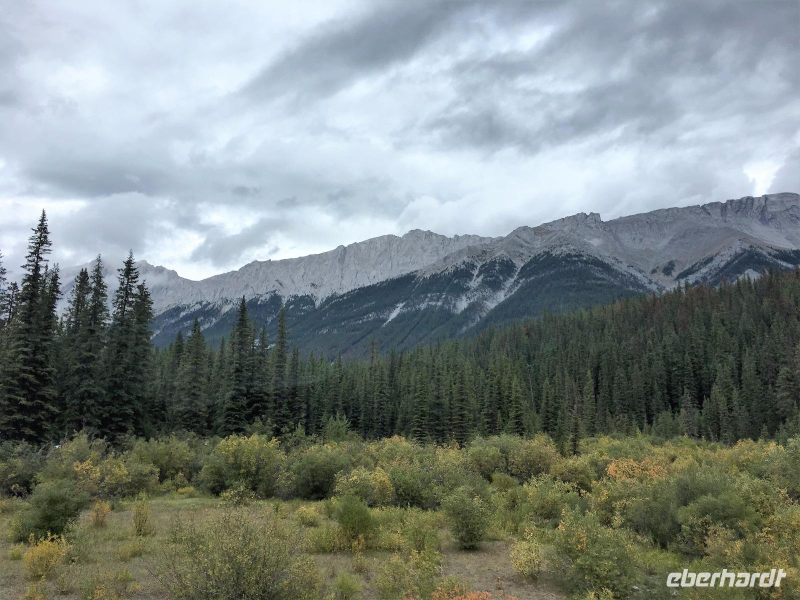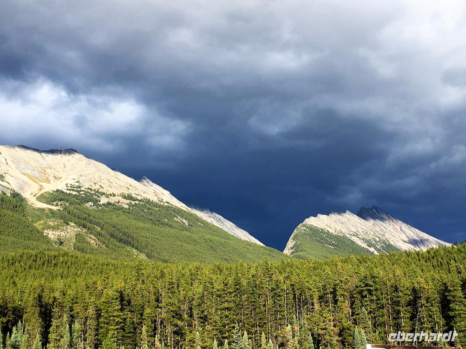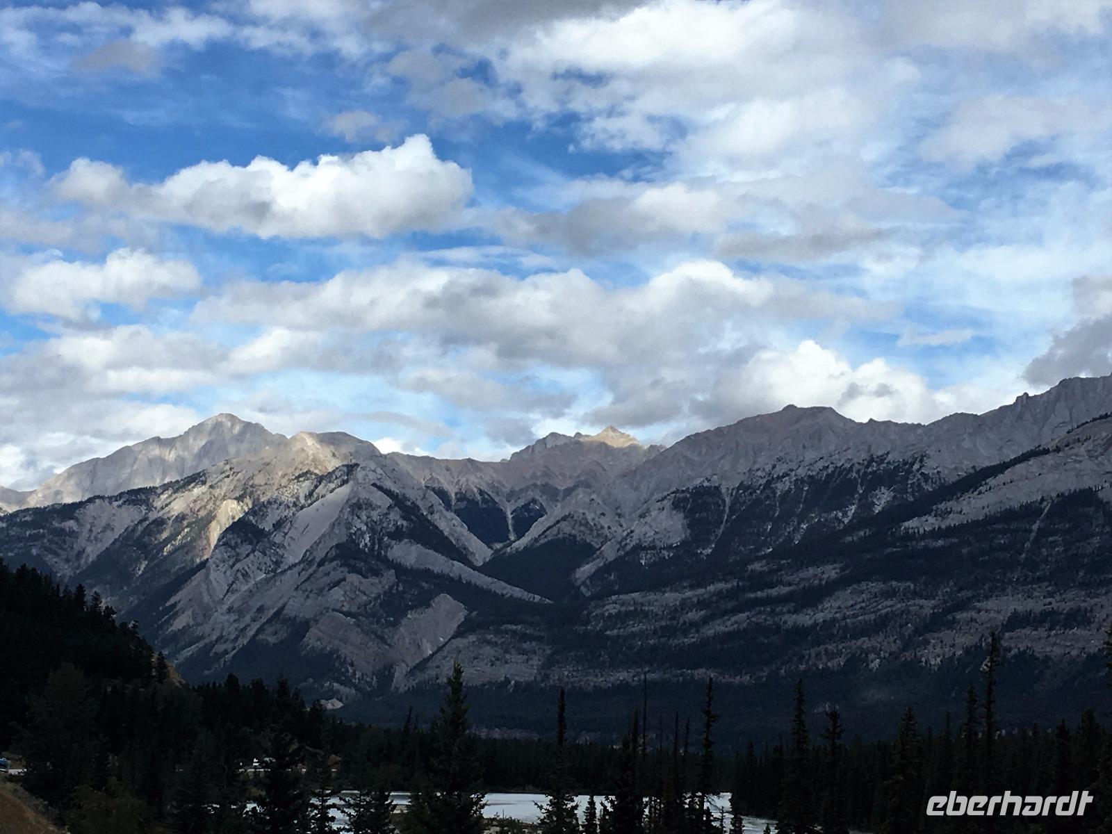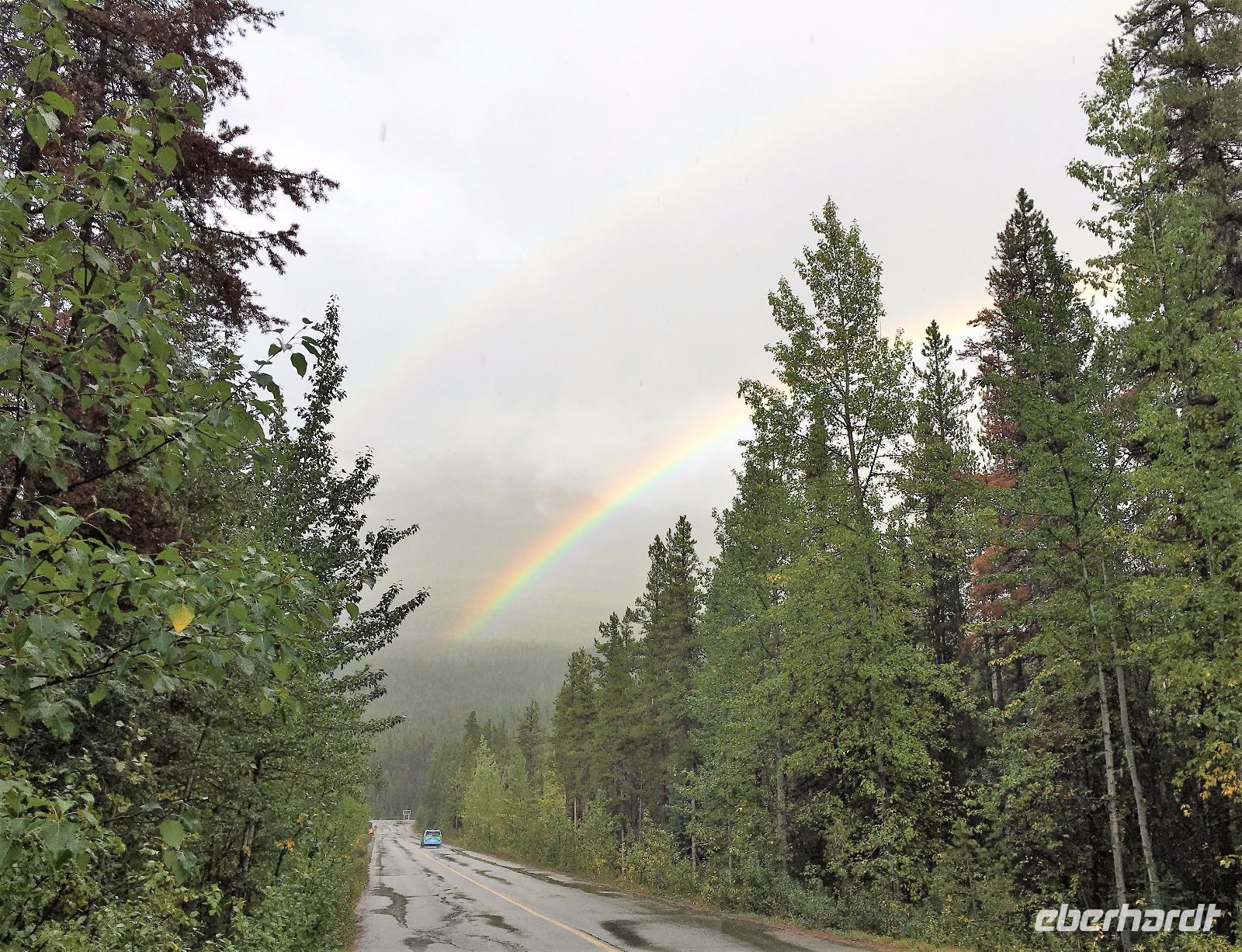 Nach dem Klopfen an meiner Tuere strecke ich auch gleich meinen Kopf erwartungsvoll zum Fenster hinaus und meine Nase wird nass, also regnet es. Schnell alle Fenster wieder zu, denn es ist draussen auch sehr kalt. Mein Waldhaeuschen ist jedoch angenhem warm. Nun heisst es wieder alle 7 Sachen zusammen zu packen und Brendan verstaut alles im Bus. Als erstes schauen wir uns die Athabascafaelle zwischen den vielen Touristen an. Manchmal sieht man mehr auf dem Display der anderen als in Natura. Das ist ein sehr beliebter Ort, da er auch spektakulaer ist. Wir wandern auch ganz hinunter in den Canyon. Dort lernen wir, was ein Inukshuk ist und wozu die Inuit diese bauen. Bald gehts weiter zu Pyramid Lake wo wir uns von den Rockies verabschieden. Bei Patricia Lake hingegen staunen wir ueber die «Operation Habakuk». Nun ist es aber wirklich Zeit diese schoene Gegen zu verlassen, denn Britisch Kolumbien erwartet uns schon. Ueber der grossen Wasserscheide treffen wir auf den Fraser Fluss der erste Fluss der in den Pazifischen Ozean fliesst. Wir wandern auch eine Stunde diesem Fluss entlang, durch dichtgruenes Dickicht mit schoenen Aussichten auf den reissenden Fluss und die Berge. Waermer ist die Luft hier, auch feuchter, es ist auch frueher am Vormittag, da wir eine Stunde gewonnen haben, wir gluecklichen. Nach einem kleinen Mittagessen gehen wir nun auf unsere zweite Wanderung. Auf dem Berg Trail wandern wir bis zum Kinney Lake. Dort gniessen wir die herrliche Aussicht und die Spiegelung die sich hier bietet. Der gute Mount Robson ist leicht angezuckert doch er zeigt heute bloss die unteren zwei drittel. Die uebliche Wolke huellt den Rest des maechtigen Berges ein. Die Wanderung ist schoen, interessant und der Weg ist angenehm breit, sodass wir viel plaudern koennen. Muede fahren wir nun die vielen Kilometer zu unserem Hotel nach Clearwater. Ahh, das Abendessen, so fein, so koestlich. Dieser Tag der mit Regen begonnen hat, endet nun doch in strahlendem Sonnen-und Mondschein.