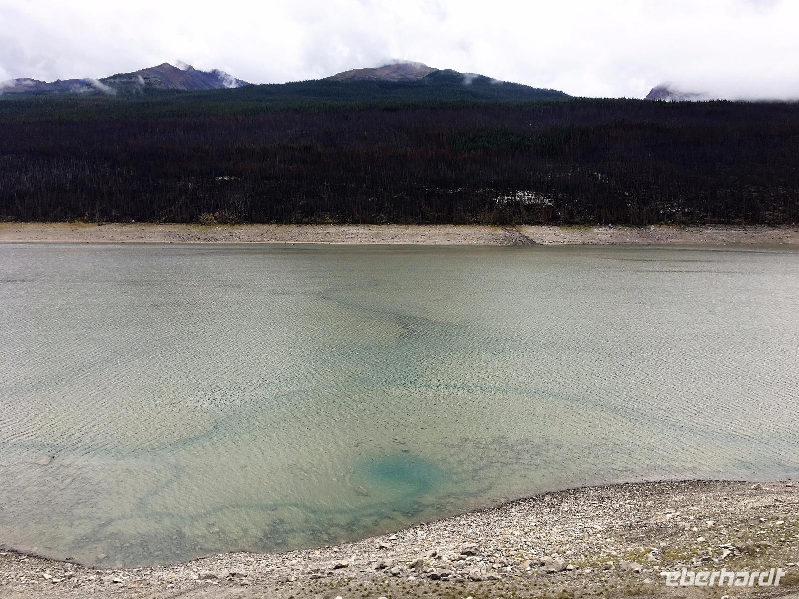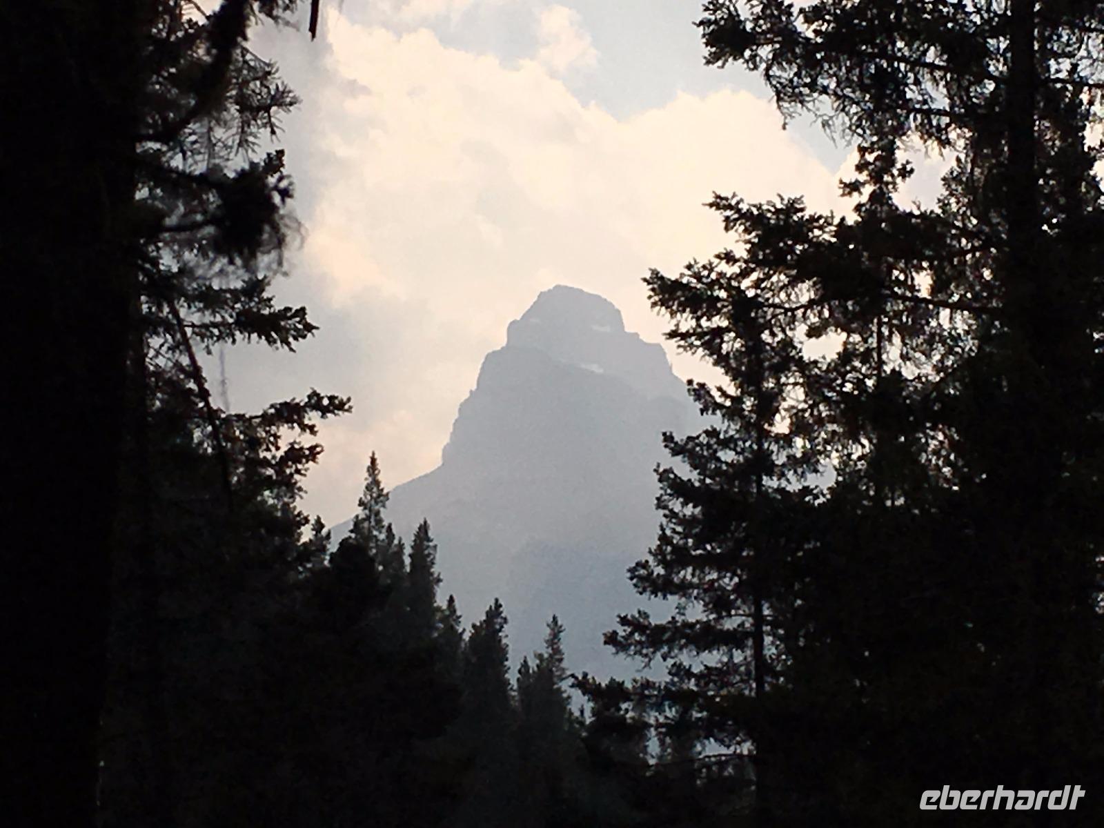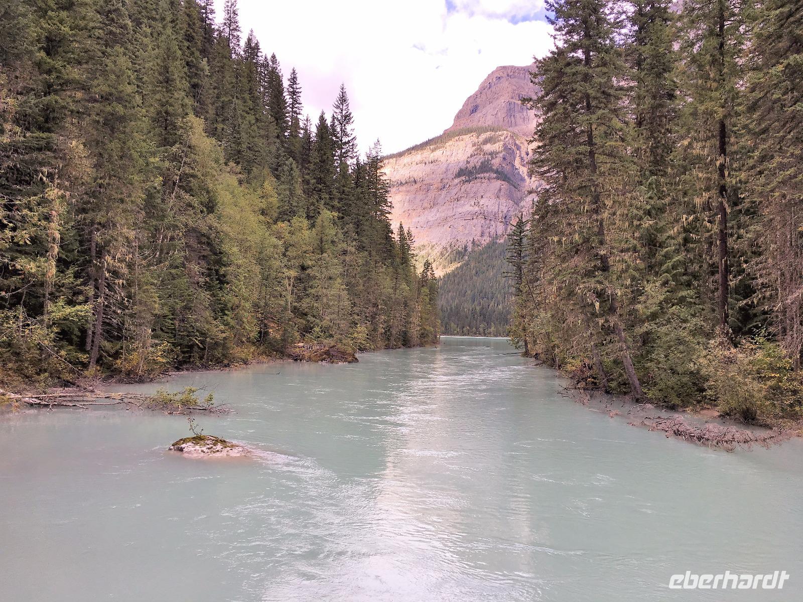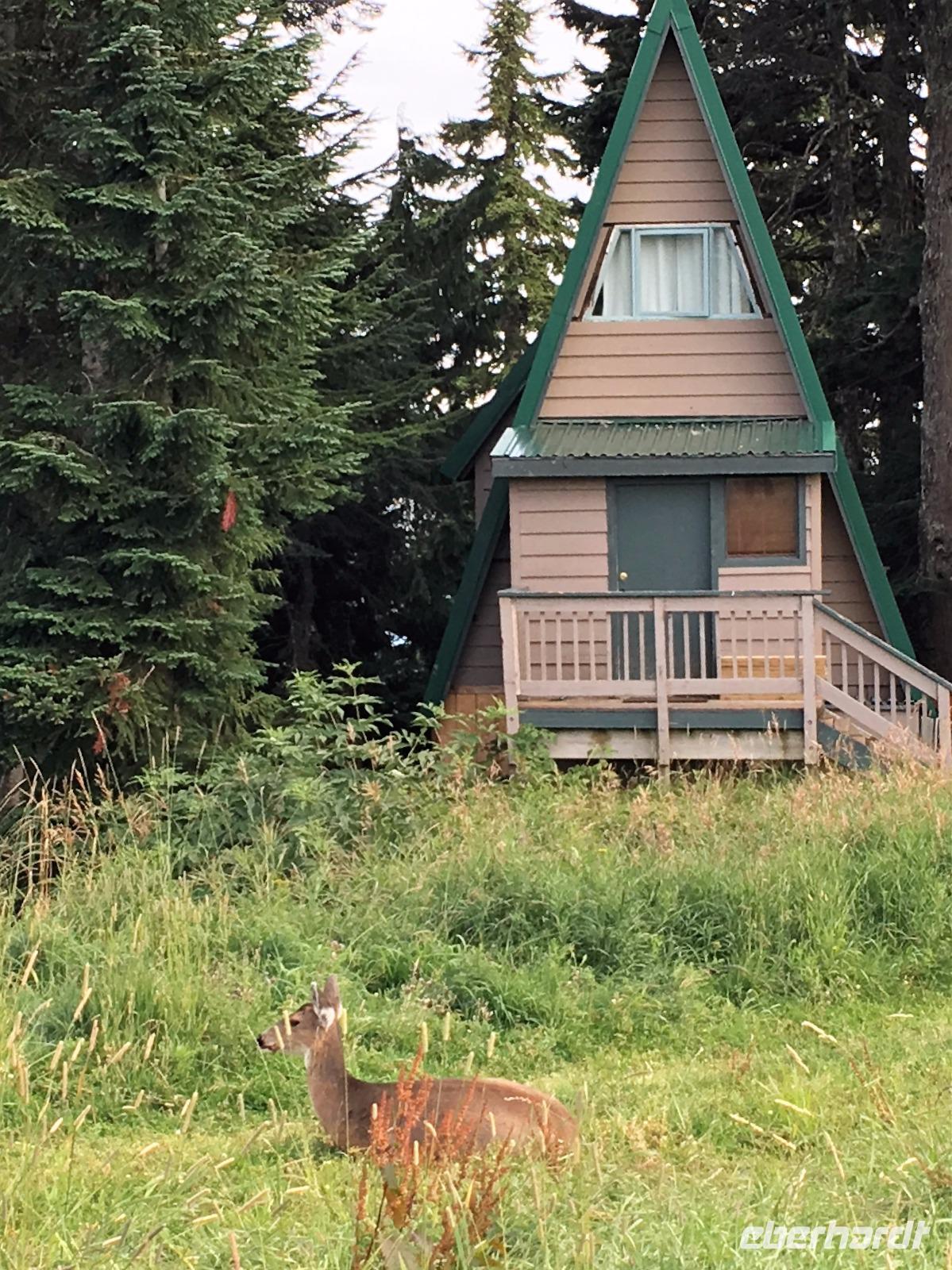 Nach dem Klopfen an meiner Tuere strecke ich auch gleich meinen Kopf erwartungsvoll zum Fenster hinaus und meine Nase wird nass, also regnet es. Schnell alle Fenster wieder zu, denn es ist draussen auch sehr kalt. Mein Waldhaeuschen ist jedoch angenhem warm. Nun heisst es wieder alle 7 Sachen zusammen zu packen und Brendan verstaut alles im Bus. Als erstes schauen wir uns die Athabascafaelle zwischen den vielen Touristen an. Manchmal sieht man mehr auf dem Display der anderen als in Natura. Das ist ein sehr beliebter Ort, da er auch spektakulaer ist. Wir wandern auch ganz hinunter in den Canyon. Dort lernen wir, was ein Inukshuk ist und wozu die Inuit diese bauen. Bald gehts weiter zu Pyramid Lake wo wir uns von den Rockies verabschieden. Bei Patricia Lake hingegen staunen wir ueber die «Operation Habakuk». Nun ist es aber wirklich Zeit diese schoene Gegen zu verlassen, denn Britisch Kolumbien erwartet uns schon. Ueber der grossen Wasserscheide treffen wir auf den Fraser Fluss der erste Fluss der in den Pazifischen Ozean fliesst. Wir wandern auch eine Stunde diesem Fluss entlang, durch dichtgruenes Dickicht mit schoenen Aussichten auf den reissenden Fluss und die Berge. Waermer ist die Luft hier, auch feuchter, es ist auch frueher am Vormittag, da wir eine Stunde gewonnen haben, wir gluecklichen. Nach einem kleinen Mittagessen gehen wir nun auf unsere zweite Wanderung. Auf dem Berg Trail wandern wir bis zum Kinney Lake. Dort gniessen wir die herrliche Aussicht und die Spiegelung die sich hier bietet. Der gute Mount Robson ist leicht angezuckert doch er zeigt heute bloss die unteren zwei drittel. Die uebliche Wolke huellt den Rest des maechtigen Berges ein. Die Wanderung ist schoen, interessant und der Weg ist angenehm breit, sodass wir viel plaudern koennen. Muede fahren wir nun die vielen Kilometer zu unserem Hotel nach Clearwater. Ahh, das Abendessen, so fein, so koestlich. Dieser Tag der mit Regen begonnen hat, endet nun doch in strahlendem Sonnen-und Mondschein.