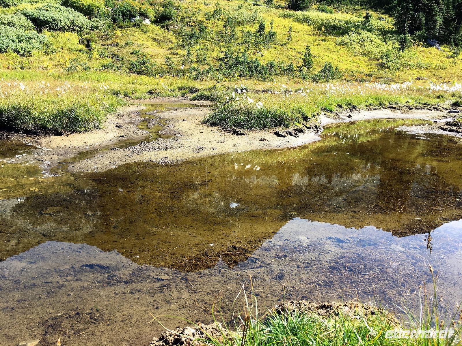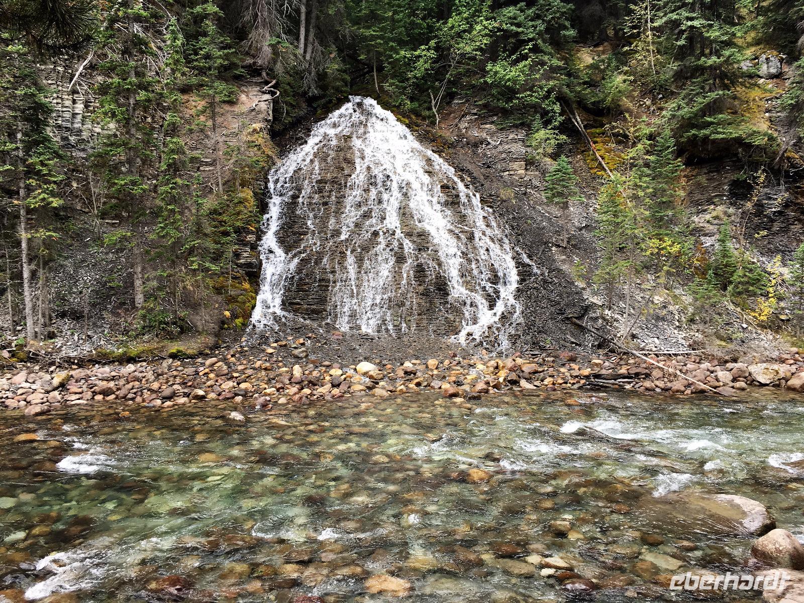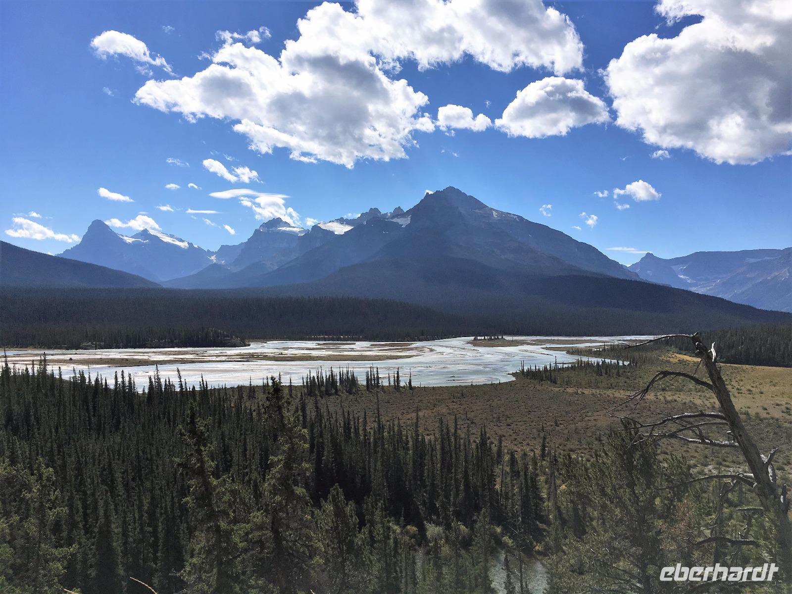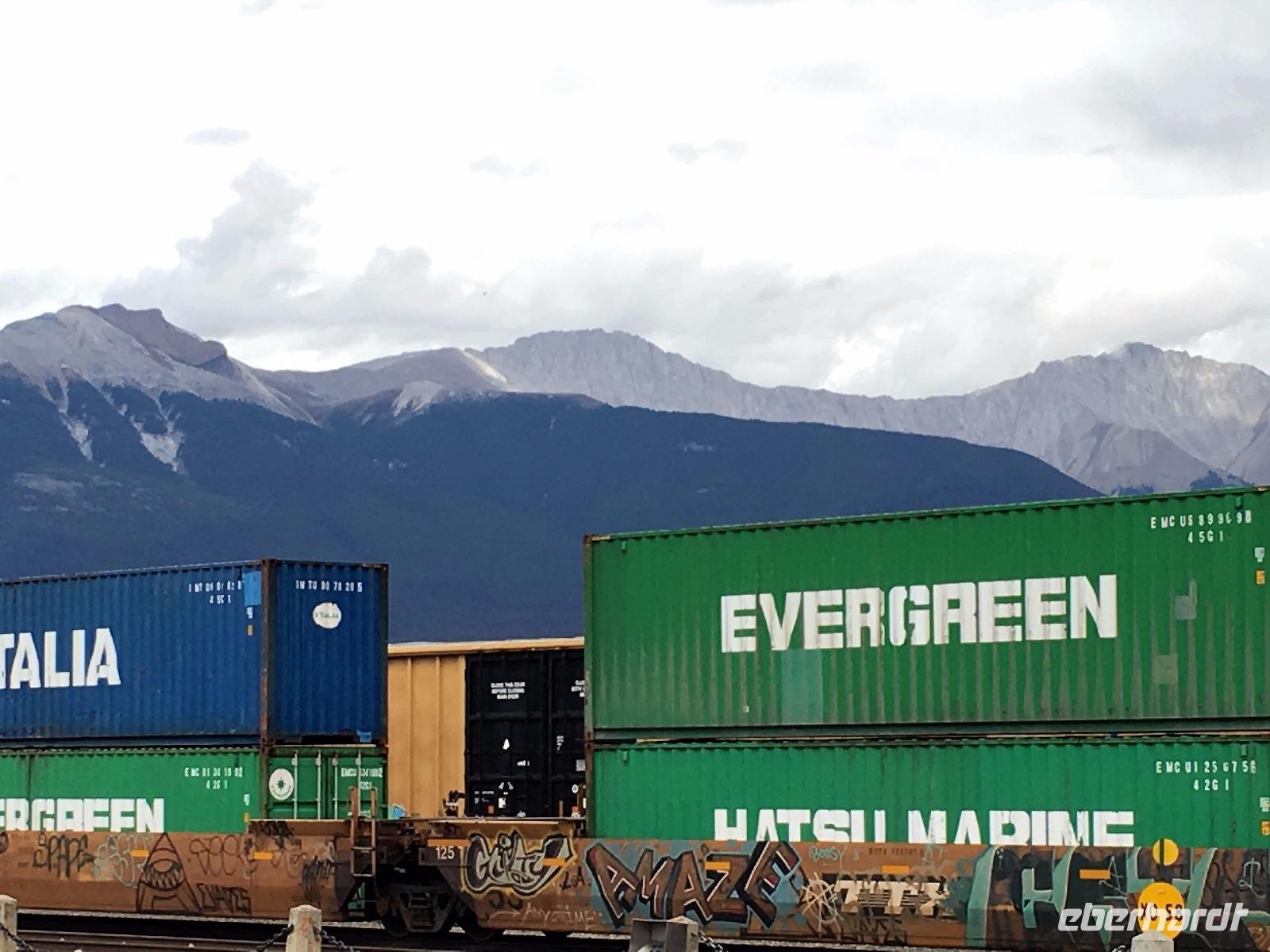 Nach dem Klopfen an meiner Tuere strecke ich auch gleich meinen Kopf erwartungsvoll zum Fenster hinaus und meine Nase wird nass, also regnet es. Schnell alle Fenster wieder zu, denn es ist draussen auch sehr kalt. Mein Waldhaeuschen ist jedoch angenhem warm. Nun heisst es wieder alle 7 Sachen zusammen zu packen und Brendan verstaut alles im Bus. Als erstes schauen wir uns die Athabascafaelle zwischen den vielen Touristen an. Manchmal sieht man mehr auf dem Display der anderen als in Natura. Das ist ein sehr beliebter Ort, da er auch spektakulaer ist. Wir wandern auch ganz hinunter in den Canyon. Dort lernen wir, was ein Inukshuk ist und wozu die Inuit diese bauen. Bald gehts weiter zu Pyramid Lake wo wir uns von den Rockies verabschieden. Bei Patricia Lake hingegen staunen wir ueber die «Operation Habakuk». Nun ist es aber wirklich Zeit diese schoene Gegen zu verlassen, denn Britisch Kolumbien erwartet uns schon. Ueber der grossen Wasserscheide treffen wir auf den Fraser Fluss der erste Fluss der in den Pazifischen Ozean fliesst. Wir wandern auch eine Stunde diesem Fluss entlang, durch dichtgruenes Dickicht mit schoenen Aussichten auf den reissenden Fluss und die Berge. Waermer ist die Luft hier, auch feuchter, es ist auch frueher am Vormittag, da wir eine Stunde gewonnen haben, wir gluecklichen. Nach einem kleinen Mittagessen gehen wir nun auf unsere zweite Wanderung. Auf dem Berg Trail wandern wir bis zum Kinney Lake. Dort gniessen wir die herrliche Aussicht und die Spiegelung die sich hier bietet. Der gute Mount Robson ist leicht angezuckert doch er zeigt heute bloss die unteren zwei drittel. Die uebliche Wolke huellt den Rest des maechtigen Berges ein. Die Wanderung ist schoen, interessant und der Weg ist angenehm breit, sodass wir viel plaudern koennen. Muede fahren wir nun die vielen Kilometer zu unserem Hotel nach Clearwater. Ahh, das Abendessen, so fein, so koestlich. Dieser Tag der mit Regen begonnen hat, endet nun doch in strahlendem Sonnen-und Mondschein.