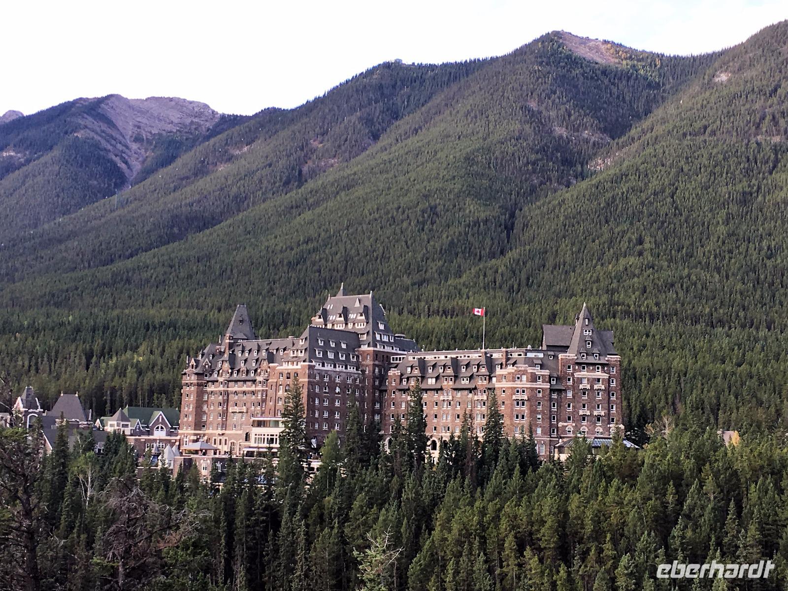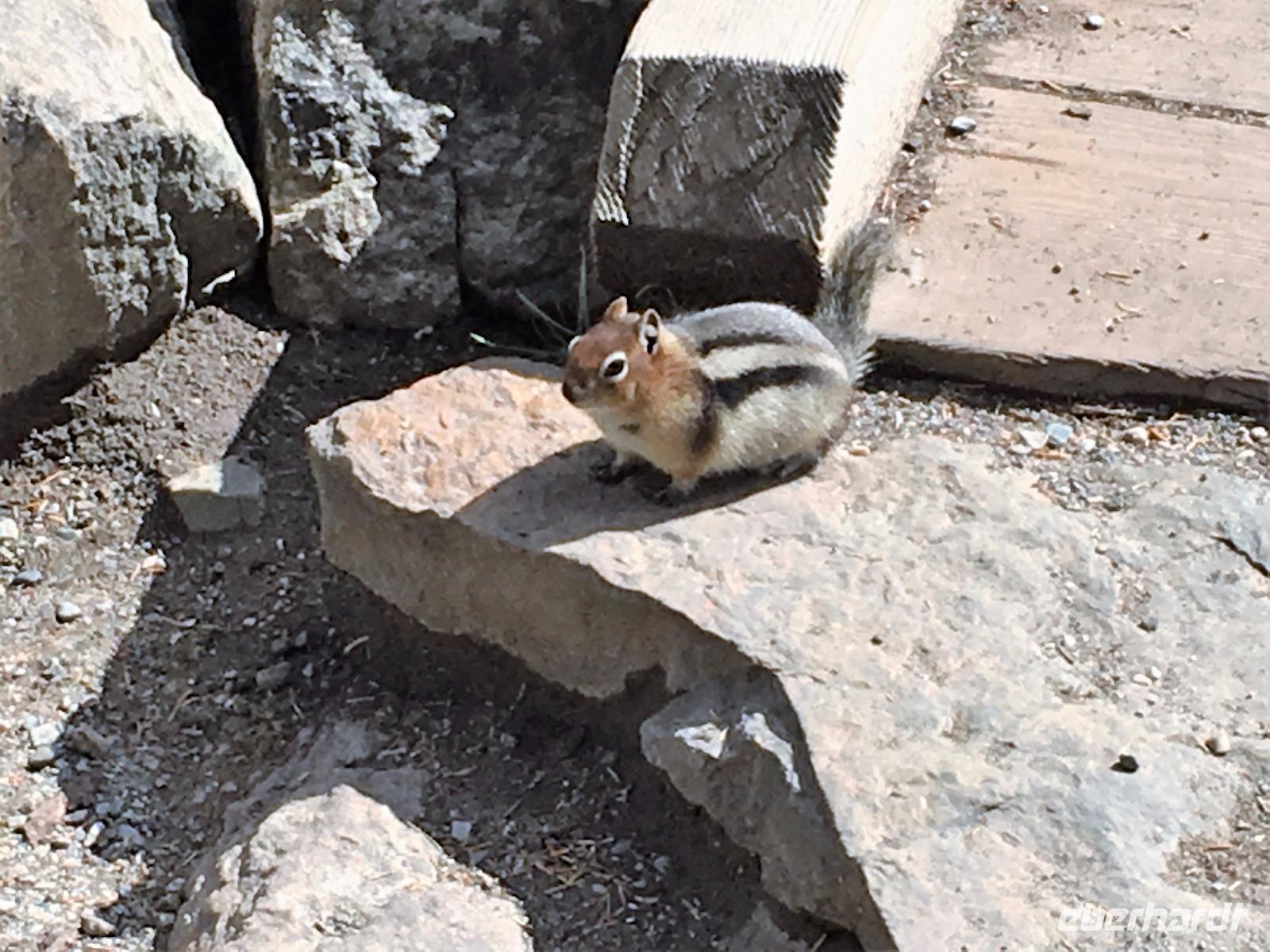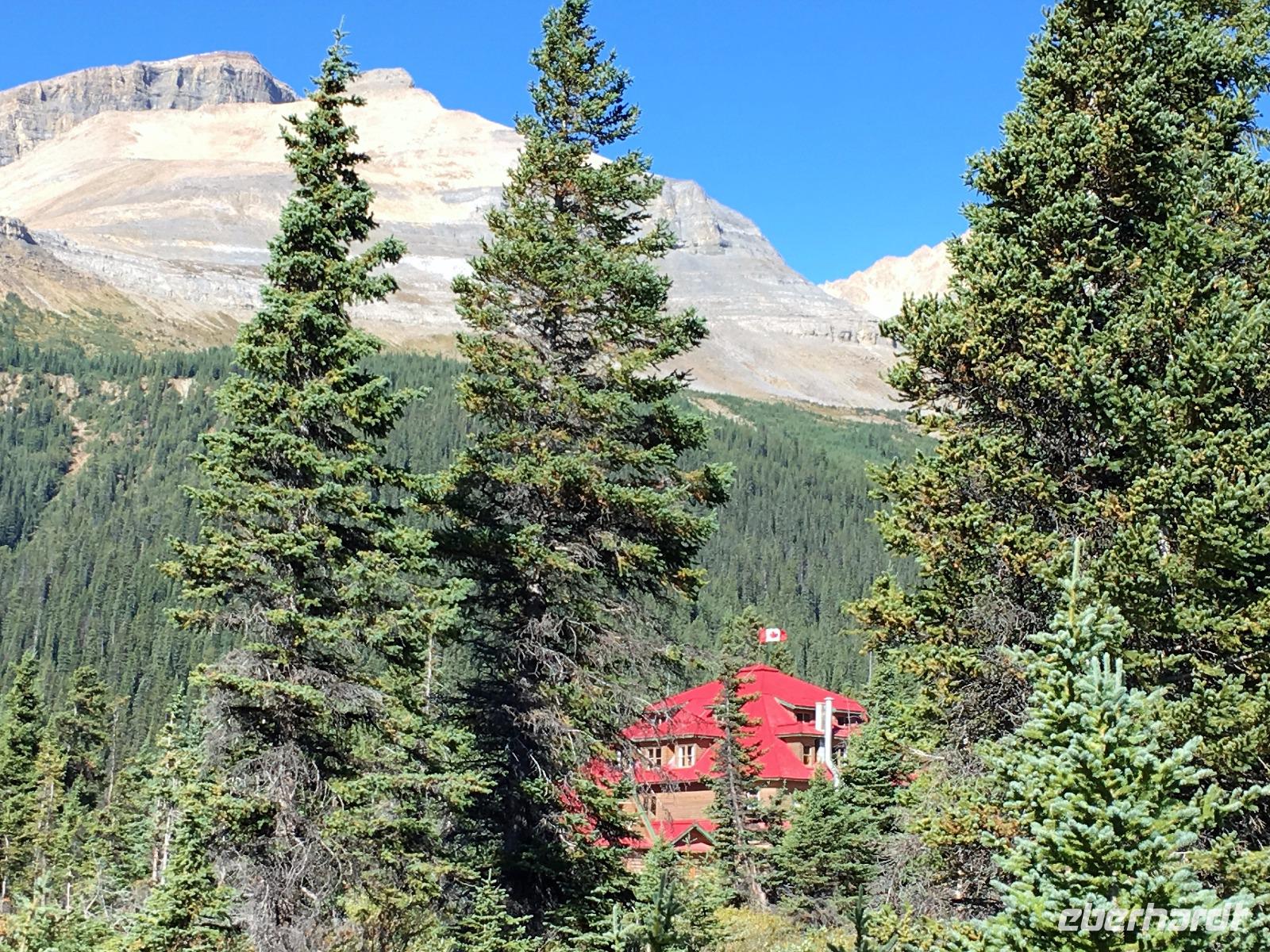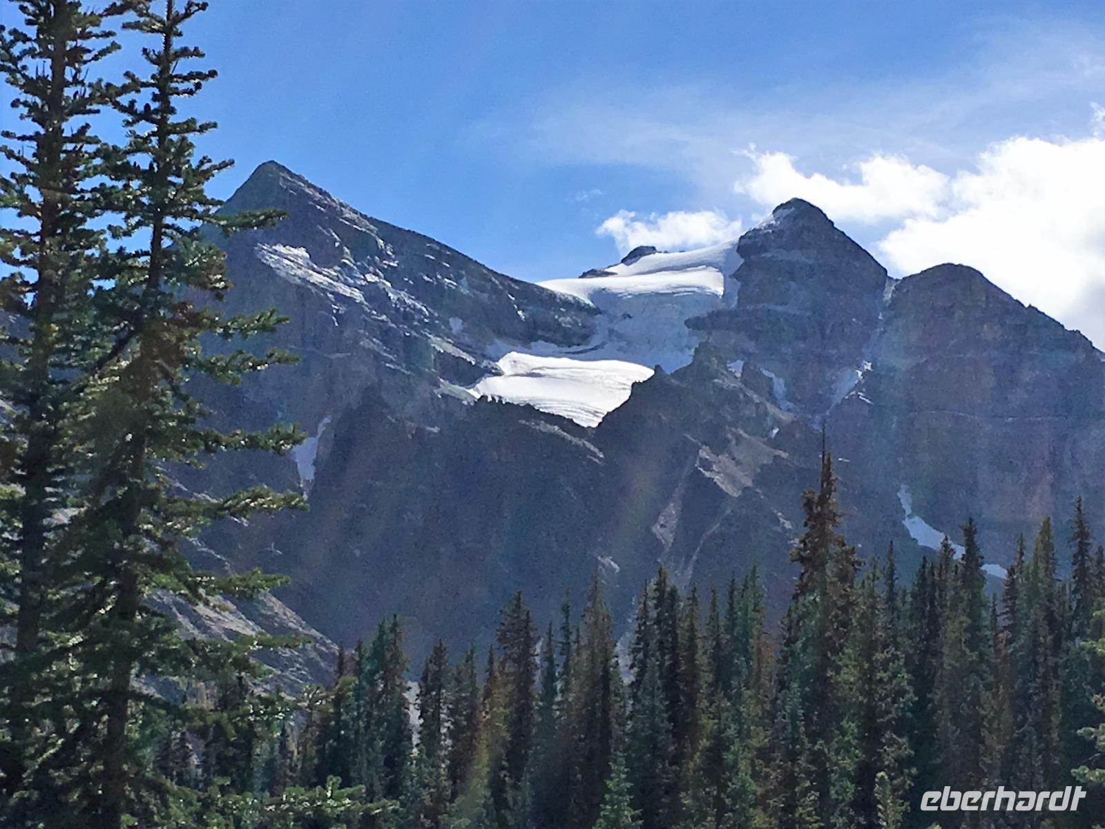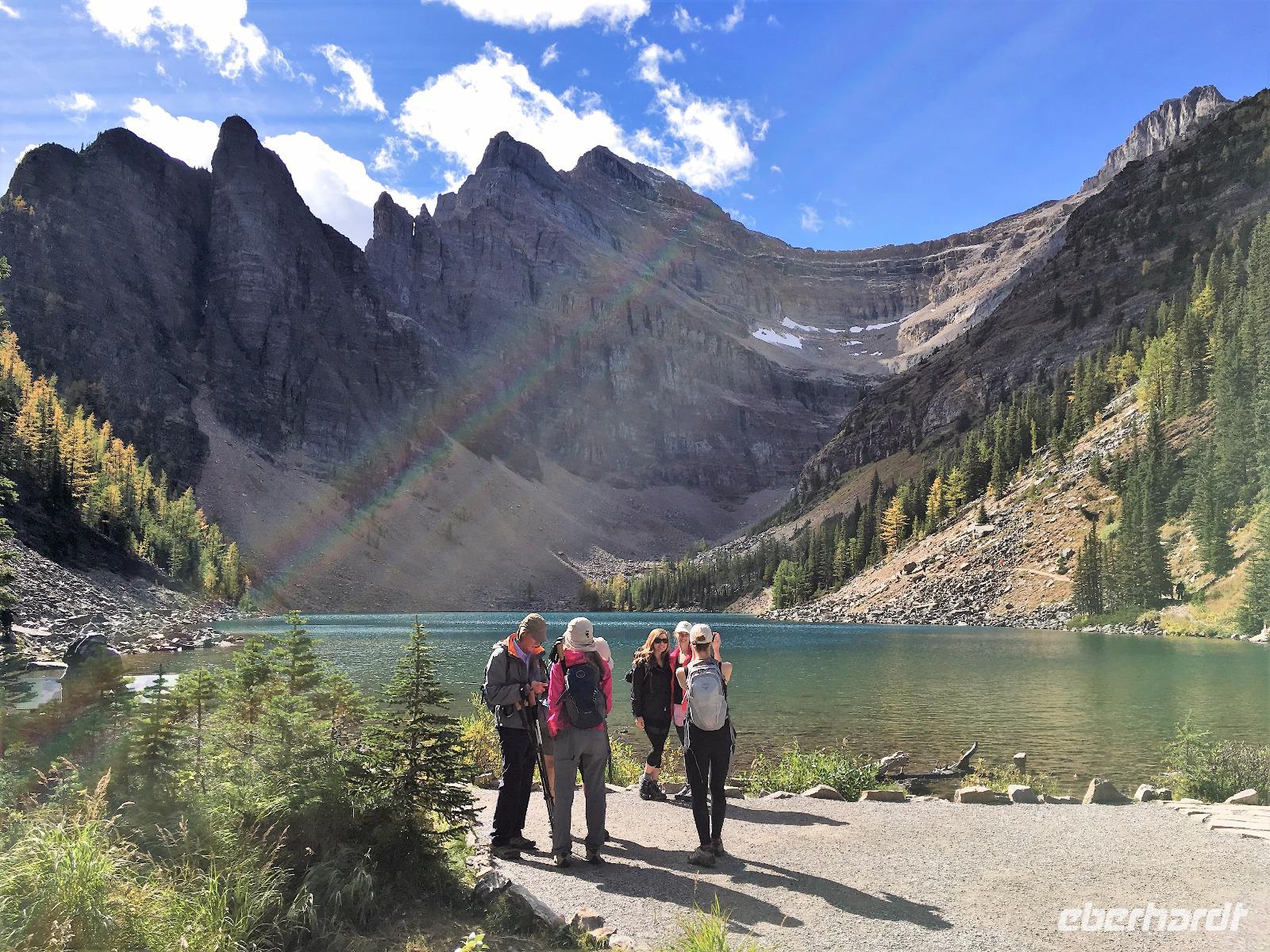 Ein herrlicher Tag bricht an. Sonnenschein, gute Laune, ausgeruht so geht es erstmals auf eine Stadtrundfahrt von Banff und danach gleich auf Sulphur Mountain. Die frische Luft da oben und der schoene Fussweg zu Samson's Huettchen sind richtig erquickend. Diese Aussicht, ein Traum. Auf der Fahrt nach Lake Louise halten wir beim Lieblingsberg, Castle Mountain, damit das obligate Gruppenbild geknipst werden kann. Es ist Sonntag also viel Verkehr auf der Hwy no 1 und noch mehr um Lake Louise herum. Ruhe gibt es bloss in dem maechtigen Chateau Lake Louise. Viele Fotos spaeter gehts auf die Wanderung zum Teehaus bei Agnes Lake. Die Hearte dieser Wanderung erkennt man an den verschwitzten T-Shirts und den ausgetrunkenen Wasserflaschen. Es geht naemlich ganz schoen steil hinauf bis zu Mirror Lake, da machen wir Mittagpause. Pikas, Chipmonks und Eichhoernchen schauen gespannt zu. Unsere T-Shirts trocknen wieder und die zweite Wasserflasche kommt nun zum Zuge. Erfolglos rennen die kleinen Waldbewohner weg, wenn es fuer uns wieder weiter geht. Es ist nicht mehr weit zu Agnes Lake bloss steil ! Es ist wahrlich eine wunderbare Wanderung. Oben angekommen, sehen wir den schimmernden See inmitten der Berge. Natuerlich zieht das an diesem schoenen Sonntag viele Besucher an. Also wandern wir bald wieder runter zu unserem Bus. Auch, weil wir heute auch noch nach Lake Moraine weiterfahren wollen. Lake Moraine ist so beruehmt, dass die alte 20 Dollar Note dieses Motiv daraufgedrueckt hatte. Einfach herrlich dieses tuerkisblau des Sees und das tiefblau des Himmels. So eine praechtige Farbe kann man gar nicht beschreiben. Am Abend gibt es verschiedene Nudelgerichte zur Auswahl, das gibt uns fuer morgen die noetige Energie. Denn Morgen gehts aufs Eis.