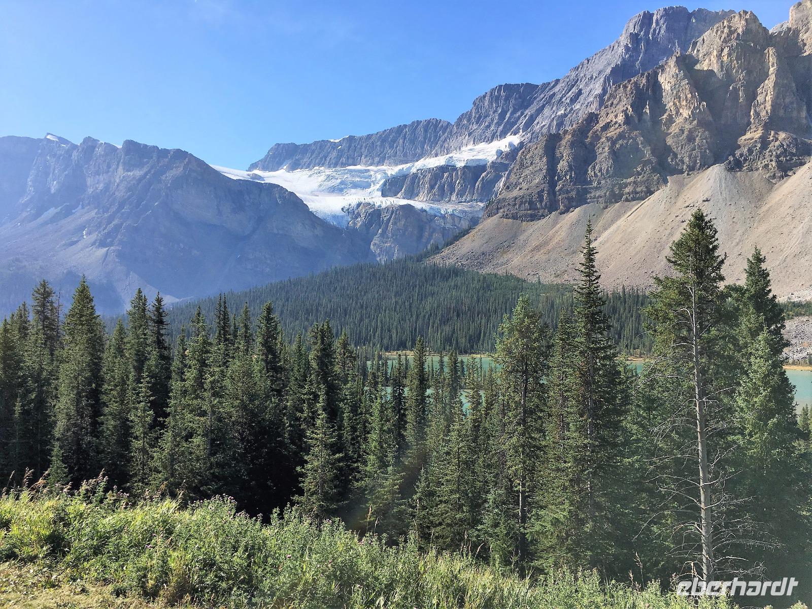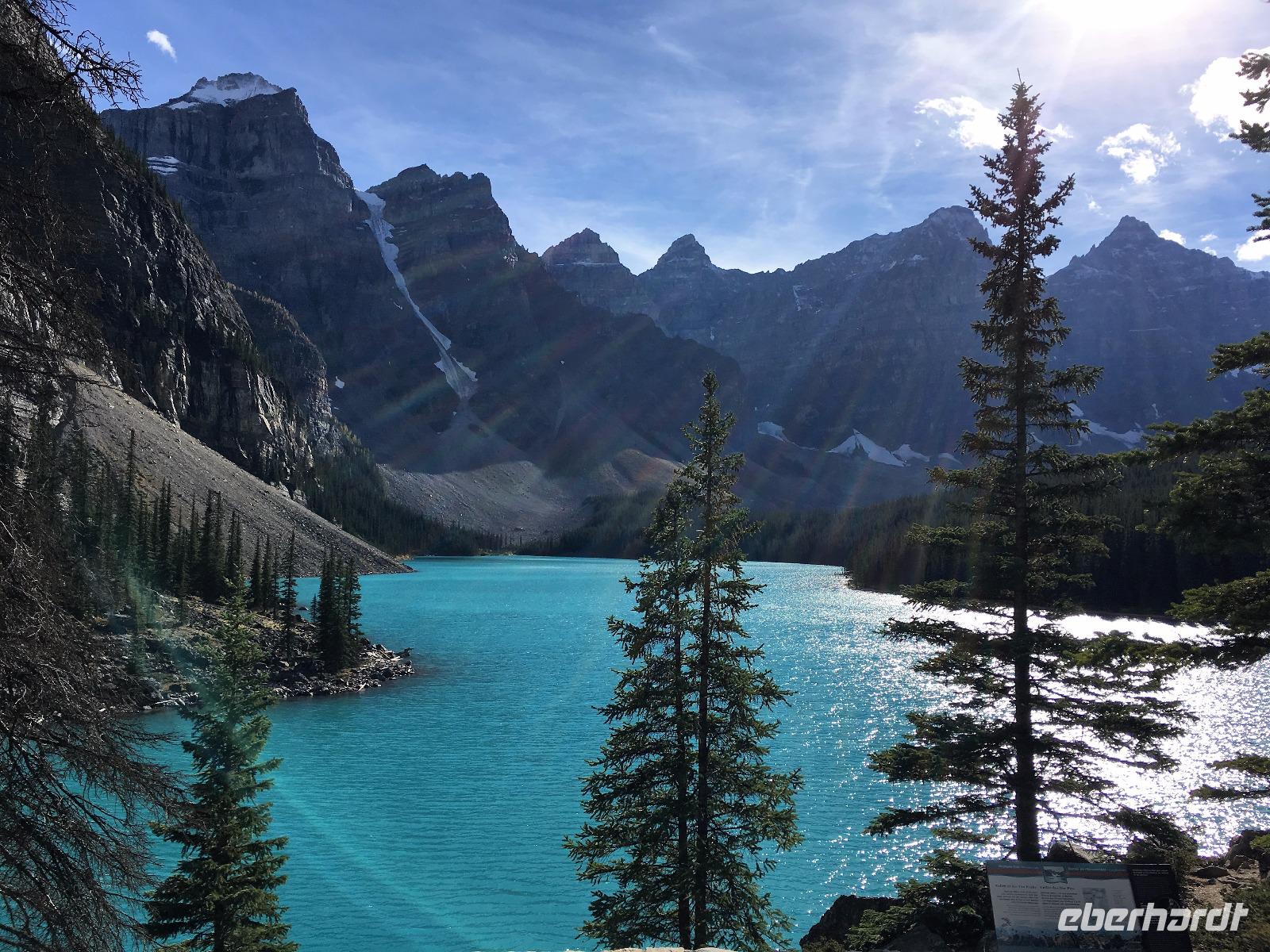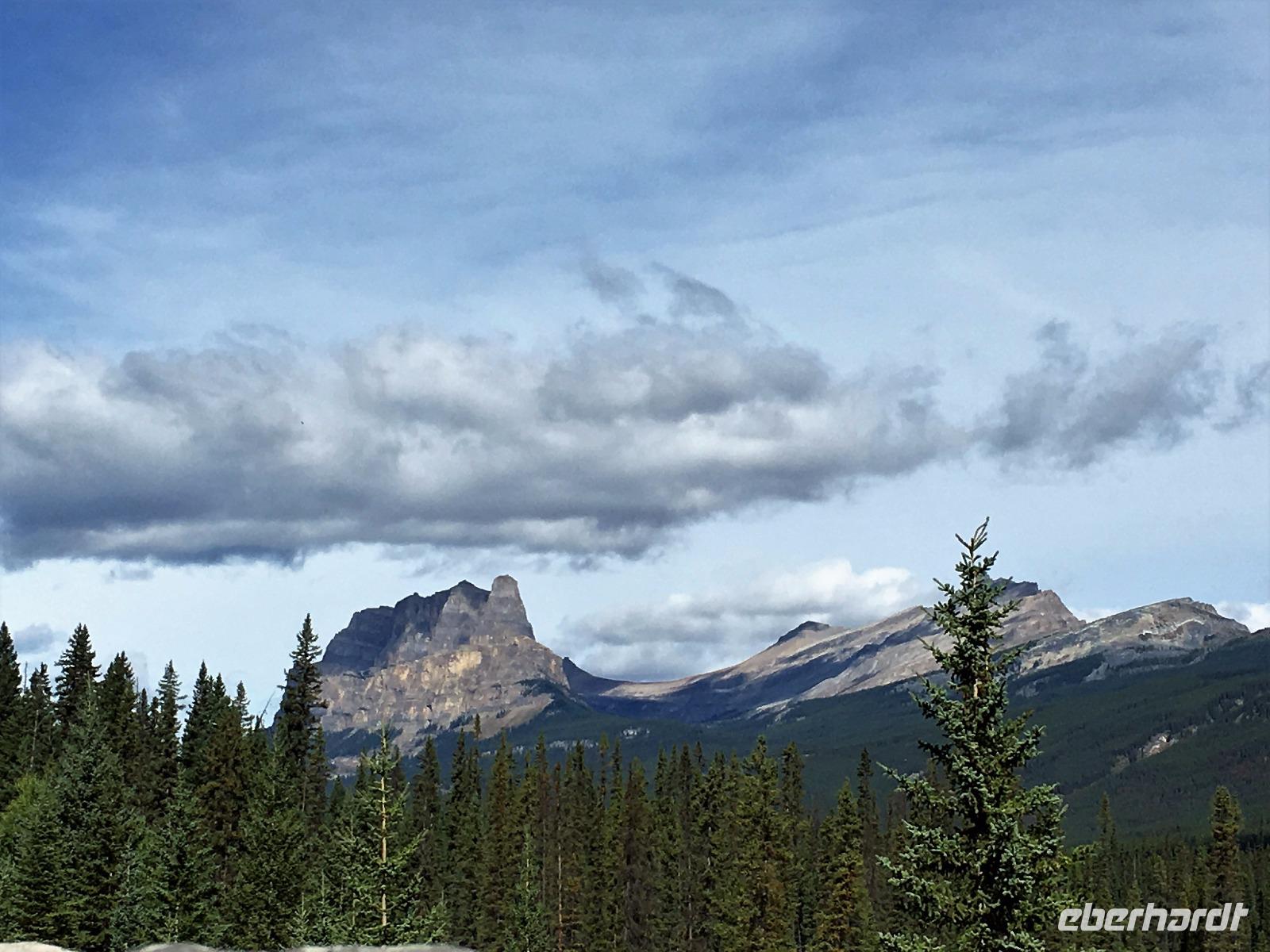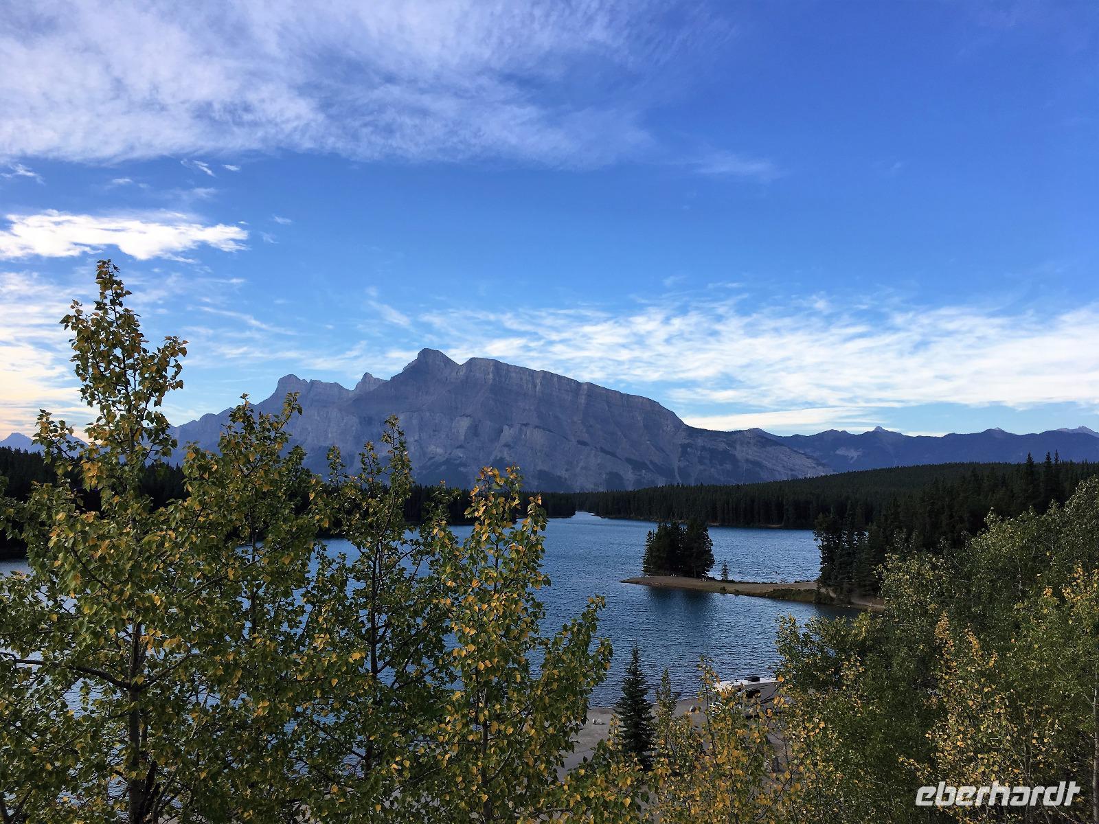 Ein herrlicher Tag bricht an. Sonnenschein, gute Laune, ausgeruht so geht es erstmals auf eine Stadtrundfahrt von Banff und danach gleich auf Sulphur Mountain. Die frische Luft da oben und der schoene Fussweg zu Samson's Huettchen sind richtig erquickend. Diese Aussicht, ein Traum. Auf der Fahrt nach Lake Louise halten wir beim Lieblingsberg, Castle Mountain, damit das obligate Gruppenbild geknipst werden kann. Es ist Sonntag also viel Verkehr auf der Hwy no 1 und noch mehr um Lake Louise herum. Ruhe gibt es bloss in dem maechtigen Chateau Lake Louise. Viele Fotos spaeter gehts auf die Wanderung zum Teehaus bei Agnes Lake. Die Hearte dieser Wanderung erkennt man an den verschwitzten T-Shirts und den ausgetrunkenen Wasserflaschen. Es geht naemlich ganz schoen steil hinauf bis zu Mirror Lake, da machen wir Mittagpause. Pikas, Chipmonks und Eichhoernchen schauen gespannt zu. Unsere T-Shirts trocknen wieder und die zweite Wasserflasche kommt nun zum Zuge. Erfolglos rennen die kleinen Waldbewohner weg, wenn es fuer uns wieder weiter geht. Es ist nicht mehr weit zu Agnes Lake bloss steil ! Es ist wahrlich eine wunderbare Wanderung. Oben angekommen, sehen wir den schimmernden See inmitten der Berge. Natuerlich zieht das an diesem schoenen Sonntag viele Besucher an. Also wandern wir bald wieder runter zu unserem Bus. Auch, weil wir heute auch noch nach Lake Moraine weiterfahren wollen. Lake Moraine ist so beruehmt, dass die alte 20 Dollar Note dieses Motiv daraufgedrueckt hatte. Einfach herrlich dieses tuerkisblau des Sees und das tiefblau des Himmels. So eine praechtige Farbe kann man gar nicht beschreiben. Am Abend gibt es verschiedene Nudelgerichte zur Auswahl, das gibt uns fuer morgen die noetige Energie. Denn Morgen gehts aufs Eis.