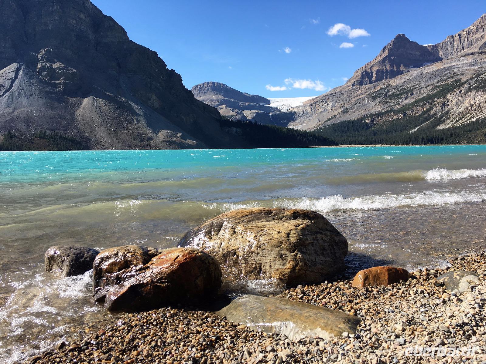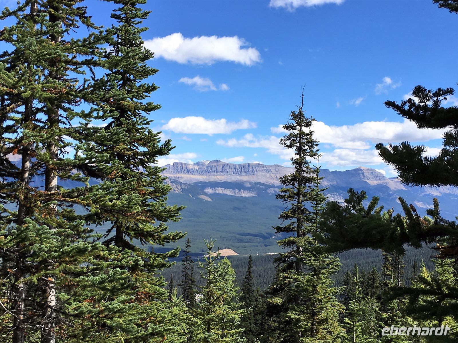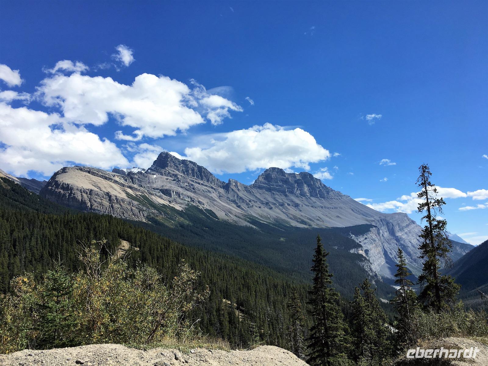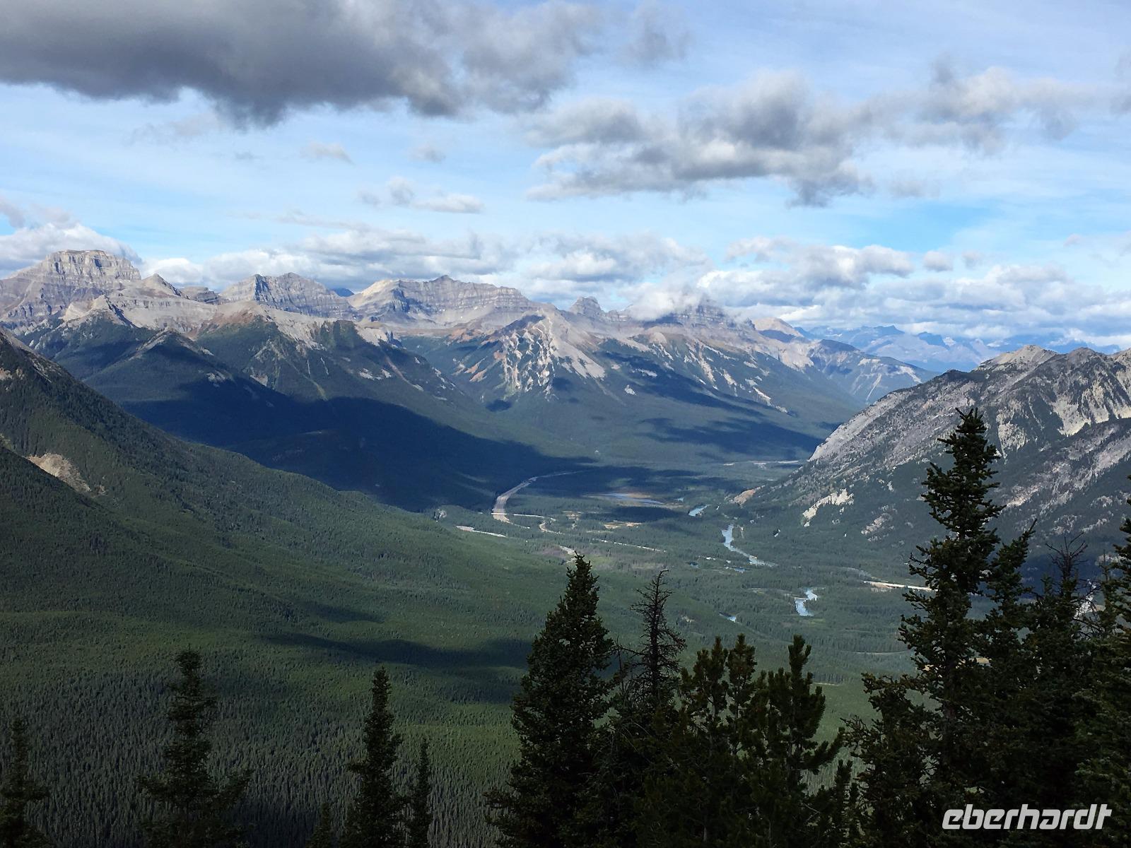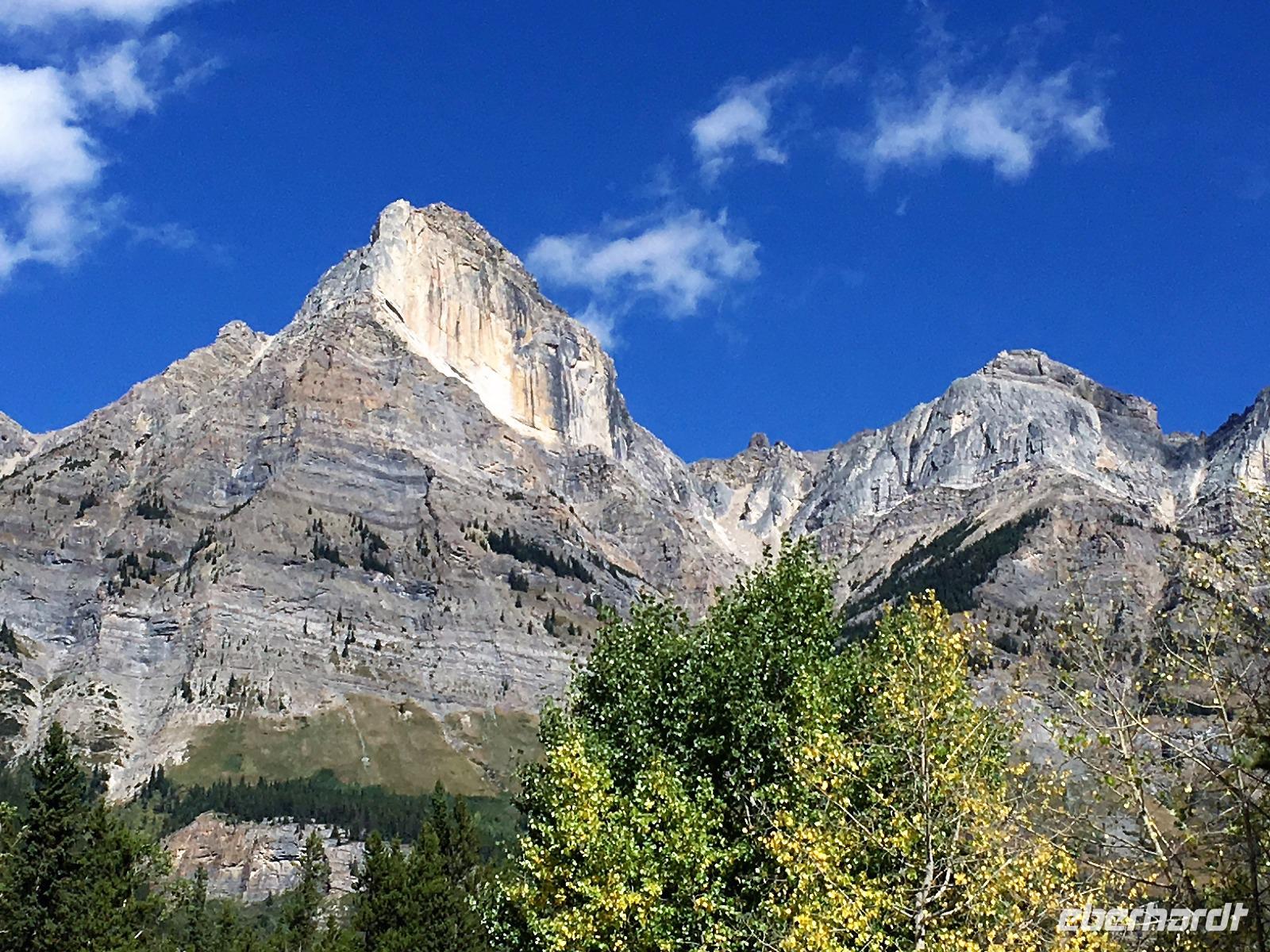 Ein herrlicher Tag bricht an. Sonnenschein, gute Laune, ausgeruht so geht es erstmals auf eine Stadtrundfahrt von Banff und danach gleich auf Sulphur Mountain. Die frische Luft da oben und der schoene Fussweg zu Samson's Huettchen sind richtig erquickend. Diese Aussicht, ein Traum. Auf der Fahrt nach Lake Louise halten wir beim Lieblingsberg, Castle Mountain, damit das obligate Gruppenbild geknipst werden kann. Es ist Sonntag also viel Verkehr auf der Hwy no 1 und noch mehr um Lake Louise herum. Ruhe gibt es bloss in dem maechtigen Chateau Lake Louise. Viele Fotos spaeter gehts auf die Wanderung zum Teehaus bei Agnes Lake. Die Hearte dieser Wanderung erkennt man an den verschwitzten T-Shirts und den ausgetrunkenen Wasserflaschen. Es geht naemlich ganz schoen steil hinauf bis zu Mirror Lake, da machen wir Mittagpause. Pikas, Chipmonks und Eichhoernchen schauen gespannt zu. Unsere T-Shirts trocknen wieder und die zweite Wasserflasche kommt nun zum Zuge. Erfolglos rennen die kleinen Waldbewohner weg, wenn es fuer uns wieder weiter geht. Es ist nicht mehr weit zu Agnes Lake bloss steil ! Es ist wahrlich eine wunderbare Wanderung. Oben angekommen, sehen wir den schimmernden See inmitten der Berge. Natuerlich zieht das an diesem schoenen Sonntag viele Besucher an. Also wandern wir bald wieder runter zu unserem Bus. Auch, weil wir heute auch noch nach Lake Moraine weiterfahren wollen. Lake Moraine ist so beruehmt, dass die alte 20 Dollar Note dieses Motiv daraufgedrueckt hatte. Einfach herrlich dieses tuerkisblau des Sees und das tiefblau des Himmels. So eine praechtige Farbe kann man gar nicht beschreiben. Am Abend gibt es verschiedene Nudelgerichte zur Auswahl, das gibt uns fuer morgen die noetige Energie. Denn Morgen gehts aufs Eis.