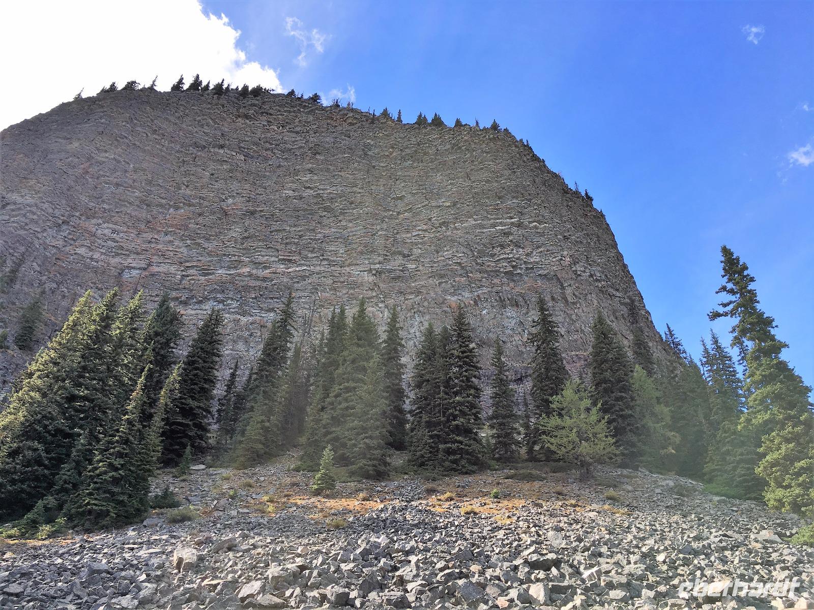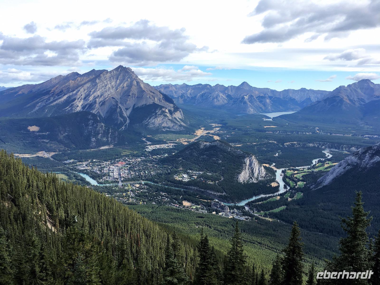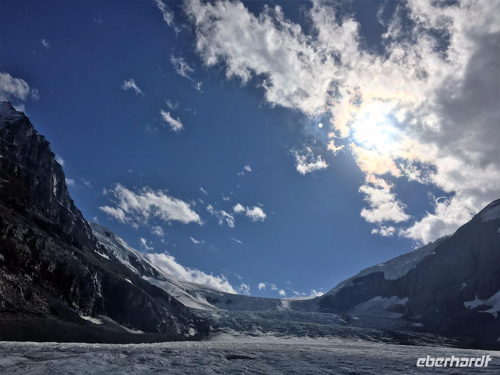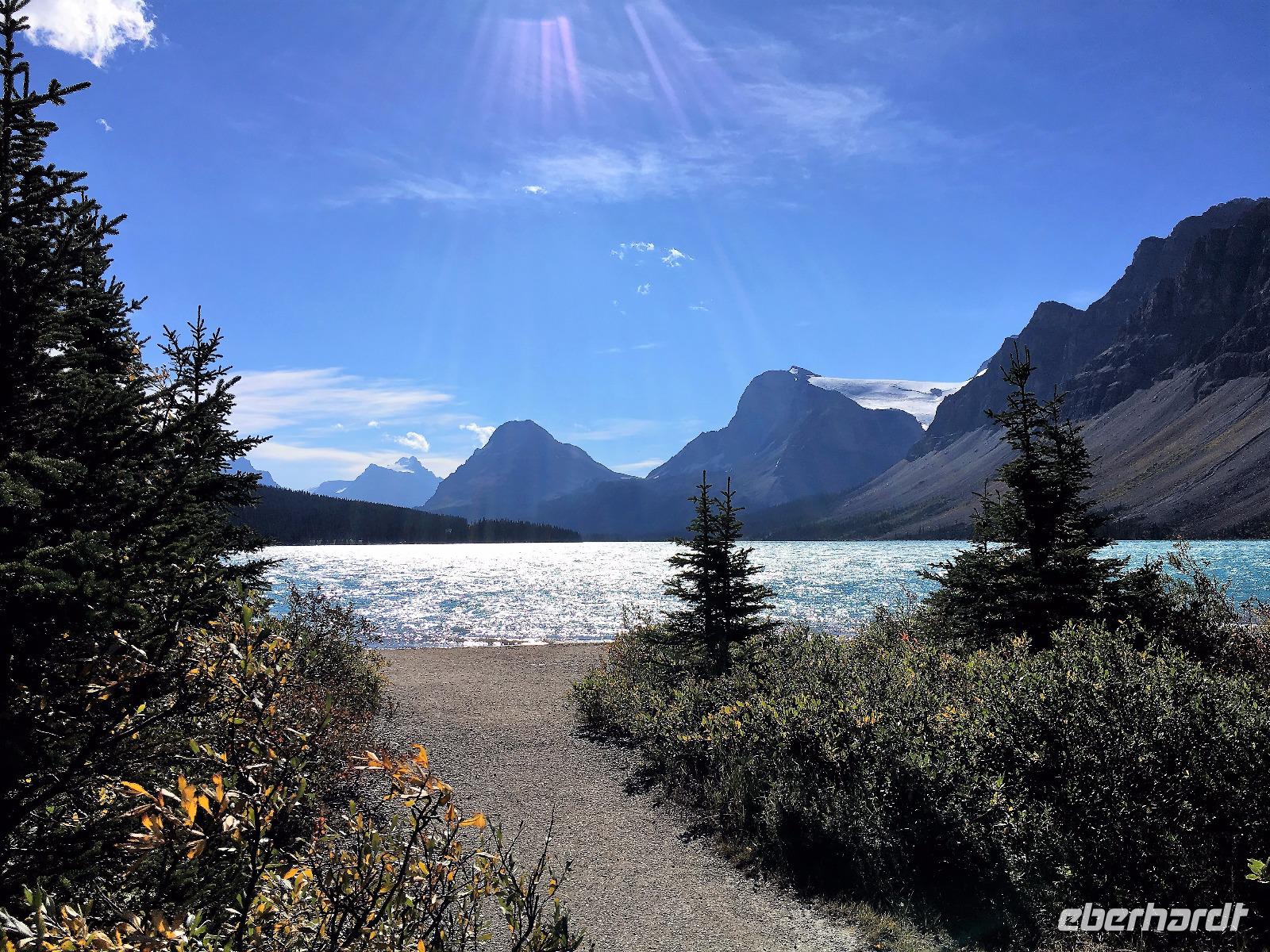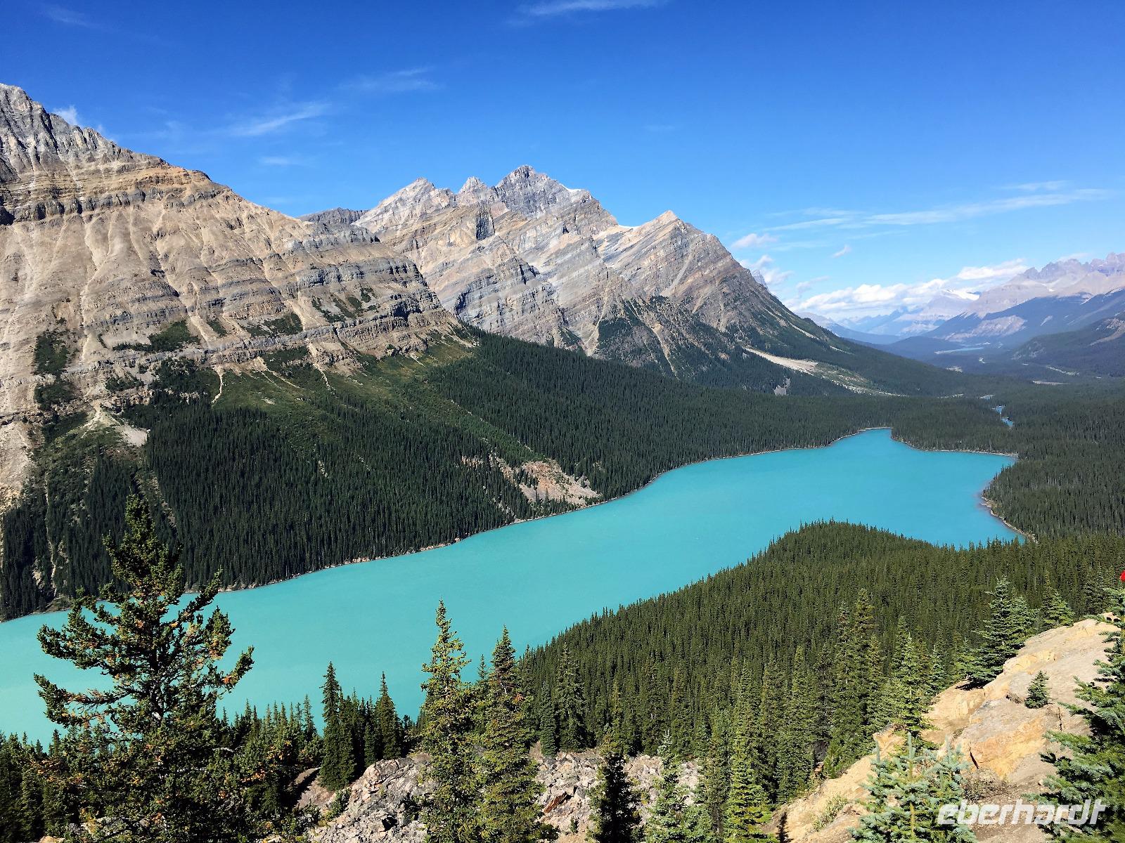 Ein herrlicher Tag bricht an. Sonnenschein, gute Laune, ausgeruht so geht es erstmals auf eine Stadtrundfahrt von Banff und danach gleich auf Sulphur Mountain. Die frische Luft da oben und der schoene Fussweg zu Samson's Huettchen sind richtig erquickend. Diese Aussicht, ein Traum. Auf der Fahrt nach Lake Louise halten wir beim Lieblingsberg, Castle Mountain, damit das obligate Gruppenbild geknipst werden kann. Es ist Sonntag also viel Verkehr auf der Hwy no 1 und noch mehr um Lake Louise herum. Ruhe gibt es bloss in dem maechtigen Chateau Lake Louise. Viele Fotos spaeter gehts auf die Wanderung zum Teehaus bei Agnes Lake. Die Hearte dieser Wanderung erkennt man an den verschwitzten T-Shirts und den ausgetrunkenen Wasserflaschen. Es geht naemlich ganz schoen steil hinauf bis zu Mirror Lake, da machen wir Mittagpause. Pikas, Chipmonks und Eichhoernchen schauen gespannt zu. Unsere T-Shirts trocknen wieder und die zweite Wasserflasche kommt nun zum Zuge. Erfolglos rennen die kleinen Waldbewohner weg, wenn es fuer uns wieder weiter geht. Es ist nicht mehr weit zu Agnes Lake bloss steil ! Es ist wahrlich eine wunderbare Wanderung. Oben angekommen, sehen wir den schimmernden See inmitten der Berge. Natuerlich zieht das an diesem schoenen Sonntag viele Besucher an. Also wandern wir bald wieder runter zu unserem Bus. Auch, weil wir heute auch noch nach Lake Moraine weiterfahren wollen. Lake Moraine ist so beruehmt, dass die alte 20 Dollar Note dieses Motiv daraufgedrueckt hatte. Einfach herrlich dieses tuerkisblau des Sees und das tiefblau des Himmels. So eine praechtige Farbe kann man gar nicht beschreiben. Am Abend gibt es verschiedene Nudelgerichte zur Auswahl, das gibt uns fuer morgen die noetige Energie. Denn Morgen gehts aufs Eis.