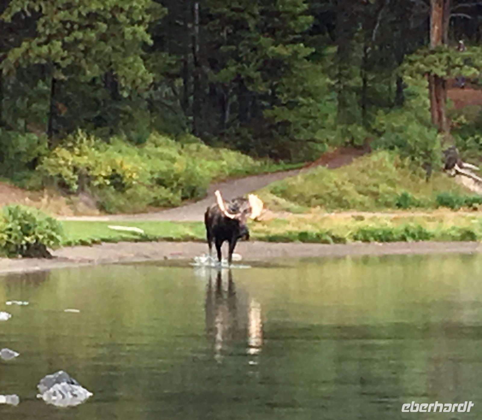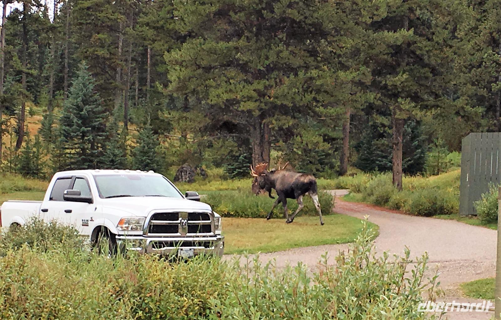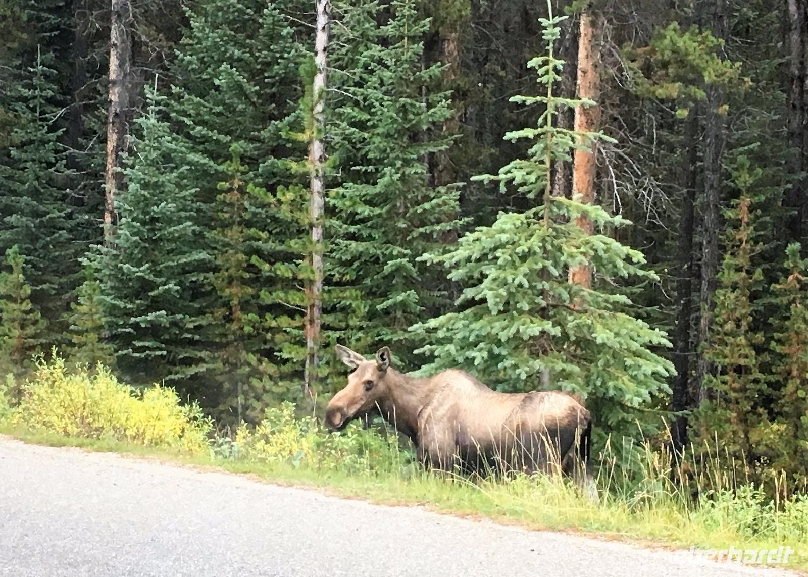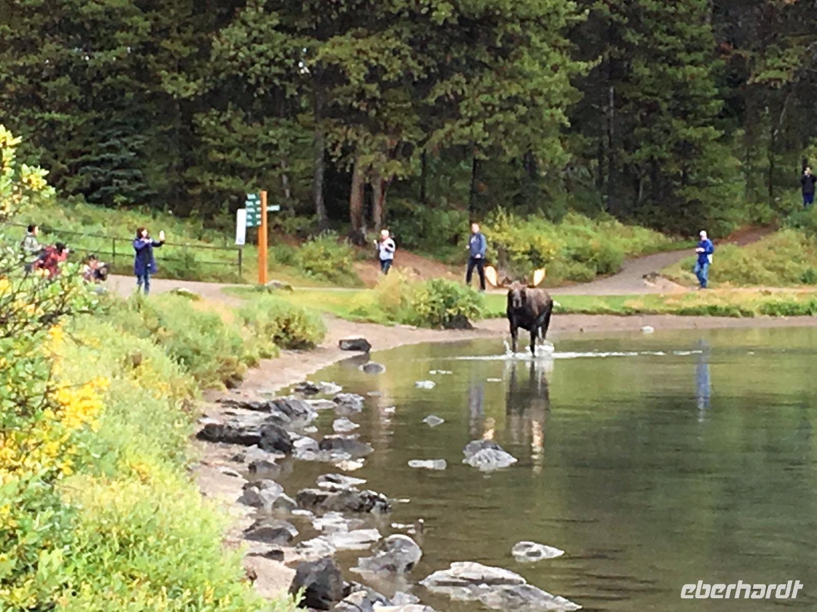 Wer klopft an die Tuer meines Waldhaeuschens ? Der Weckrufdienst; denn hier gibt es keine Telefone in den Zimmer. Huch, da rauscht es ja, es regnet ein wenig und die Wolken umhuellen sogar die Baeume. Beim tollen Fruehstueck werden wir munter und begeben uns gleich nach Jasper und in das Maligne Tal. Das schlechte Wette hat sich sehr verbessert. Vorerst gibt es eine schoene und interessante Wanderung entlang dieses malerischen Flusses. Vor dem «Weisser Ton» Wasserfall bleiben wir auch stehen und geniessen diesen Urton und die Perfektion dieses kleinen Wasserfalles. Sowas wollten wir in unseren Gaerten zu Hause ! Auf der Weiterfahrt zum Maligne See sehen wir Medicine Lake mit seinen unterirdischen Fluessen und ploetzlich auch ein Moose. Es ist ein Elch-Jungtier und spaziert gemaechlich am Strassenrand entlang. Von Mami keine Spur so bewegt er sich etwas tolpatschig und versucht alle Straeucher abzuknabbern was ihm nicht immer gelingt. Ab und zu schaut er auf und versichert sich, dass alle 30 Autos noch dastehen mit den lustigen Tieren drinnen die alle eine kleine Knipsschachtel um den Hals haengen haben. Wir schauen und staunen. Das Mittagessen anschliessend, bei Maligne See ist kurz aber fein sodass wir gleich zum Steg gehen koennen fuer unsere Bootsfahrt. Da, hier, es kommt soeben ein riesen Moose Bulle aus dem Wald und marschiert schnurstraks zum See hin damit er wohl seine Fuesse baden kann. Wir koennen dies Schauspiel gar nicht fassen. Auf einmal hat er genug gebadet, kommt aus dem Wasser und begiebt sich auf den Wanderweg der gleich bei der Lodge und beim Steg vorbeigeht. Wir treten alle zurueck, sodass er majestaetisch vorbeischreiten kann. 1000 Fotos spaeter haben wir alle nur noch ein Thema..........es faengt mit M an. Dass man diese scheuen Tiere so hautnah sehen kann ist eine sehr grosse Ausnahme. Was fuer ein Erlebnis. Die Bootsfahrt ist toll, das Wetter hat sich nochmehr verbessert und wir freuen uns ungemein, dass diese Bootstour auch stattfinden kann. Spirit Island ist das heutige Fotomotiv und manch einer knipst sicher auch ein Kodak-Foto. In Jasper haben wir anschliessend Zeit uns dies Staedtchen anzuschauen und Einkaeufe zu taetigen. Unsere Lodge ist nun nicht mehr weit entfernt und wir beschliessen, unser Maskottchen heute noch bei den Wasserfaellen zu taufen. Das ist sehr lustig und der Himmer hilft bei der Taufe mit Regenguss mit. Wir fluechten in unsere Lodge denn nun wird anstaendig Taufe gefeiert mit BC Wein und Snacks. Die ganz tolle Wildpilz-suppe waermt uns wieder auf und setzt den Ton fuers Abendbrot. Moose, wir wollen bloss von Moose traeumen.