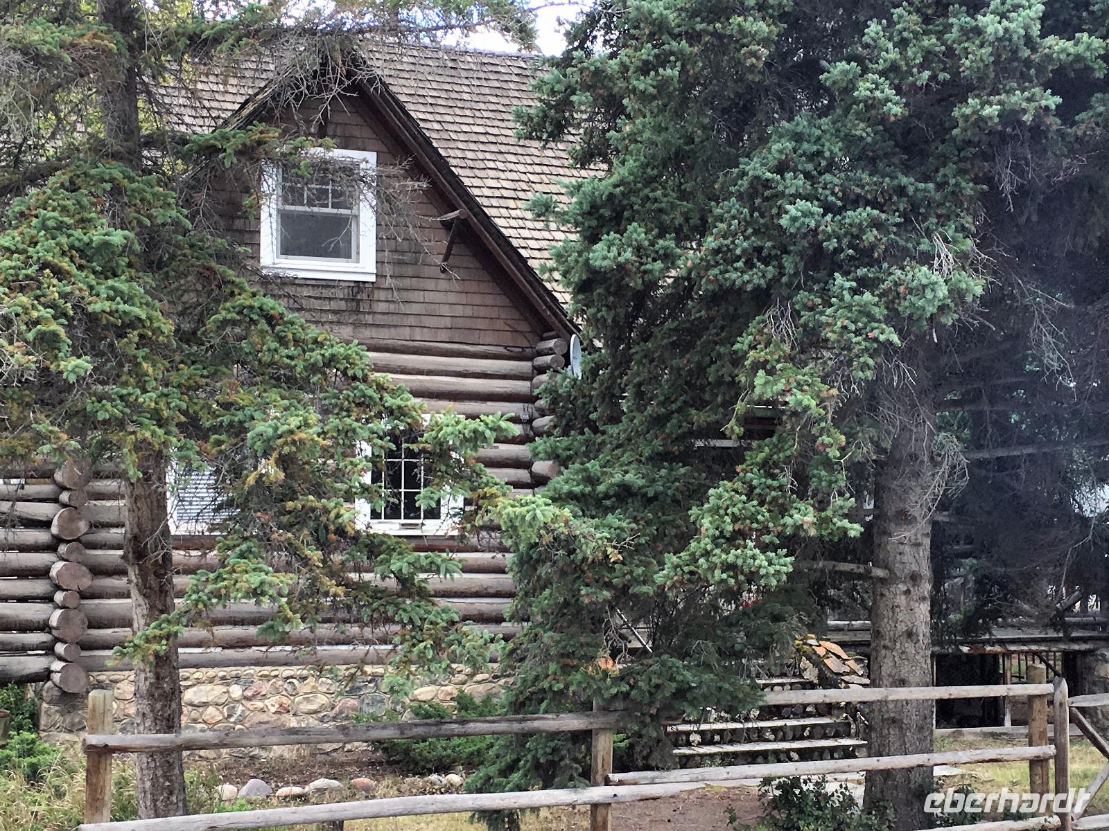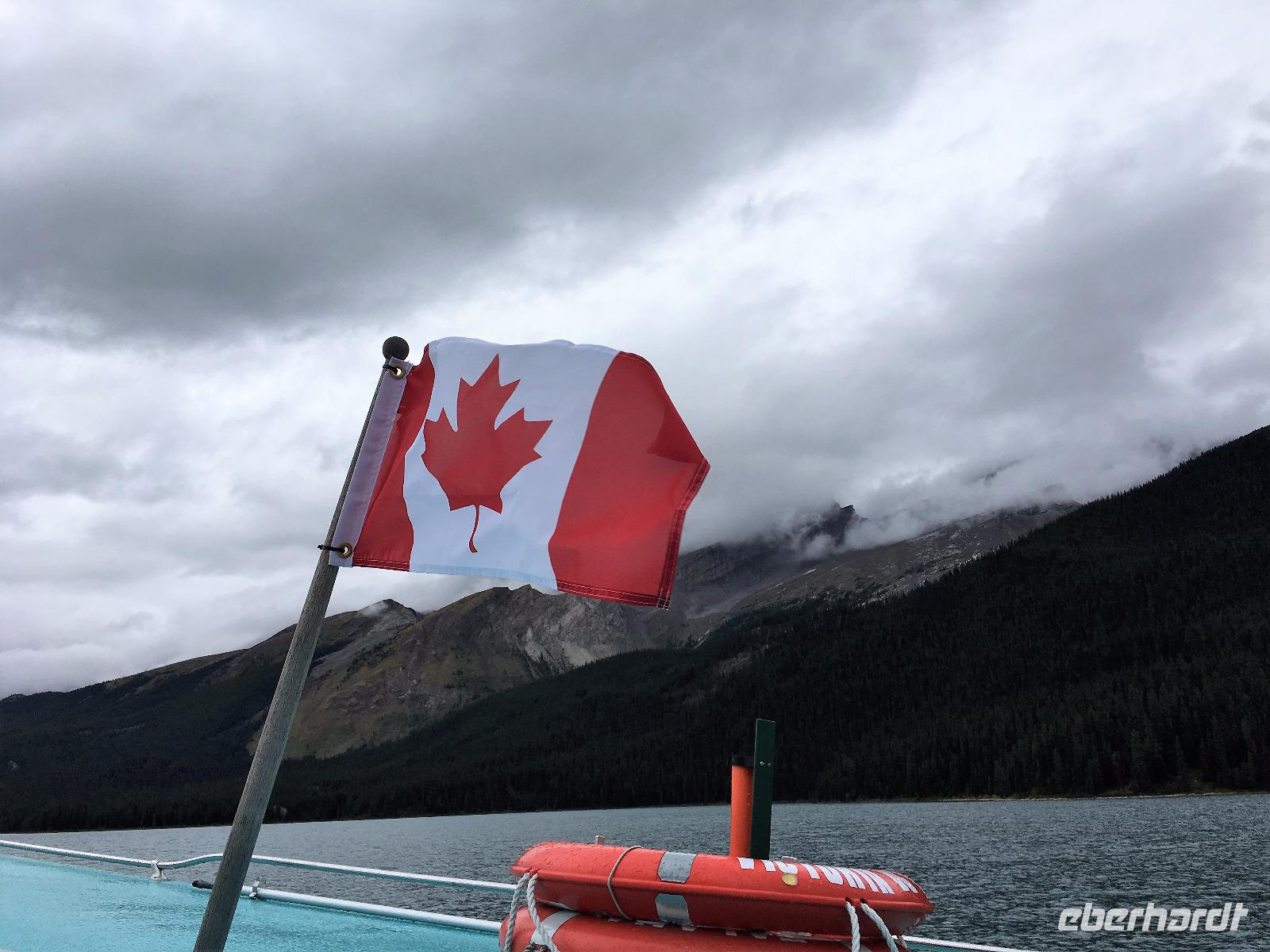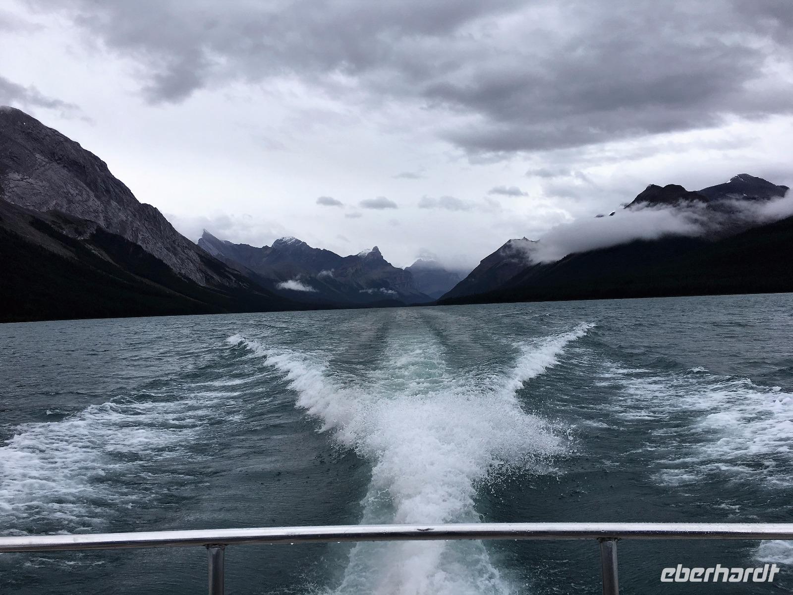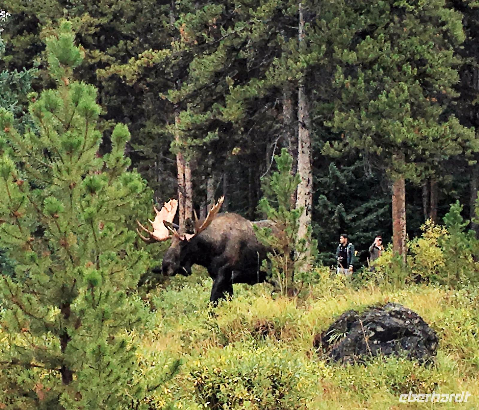 Wer klopft an die Tuer meines Waldhaeuschens ? Der Weckrufdienst; denn hier gibt es keine Telefone in den Zimmer. Huch, da rauscht es ja, es regnet ein wenig und die Wolken umhuellen sogar die Baeume. Beim tollen Fruehstueck werden wir munter und begeben uns gleich nach Jasper und in das Maligne Tal. Das schlechte Wette hat sich sehr verbessert. Vorerst gibt es eine schoene und interessante Wanderung entlang dieses malerischen Flusses. Vor dem «Weisser Ton» Wasserfall bleiben wir auch stehen und geniessen diesen Urton und die Perfektion dieses kleinen Wasserfalles. Sowas wollten wir in unseren Gaerten zu Hause ! Auf der Weiterfahrt zum Maligne See sehen wir Medicine Lake mit seinen unterirdischen Fluessen und ploetzlich auch ein Moose. Es ist ein Elch-Jungtier und spaziert gemaechlich am Strassenrand entlang. Von Mami keine Spur so bewegt er sich etwas tolpatschig und versucht alle Straeucher abzuknabbern was ihm nicht immer gelingt. Ab und zu schaut er auf und versichert sich, dass alle 30 Autos noch dastehen mit den lustigen Tieren drinnen die alle eine kleine Knipsschachtel um den Hals haengen haben. Wir schauen und staunen. Das Mittagessen anschliessend, bei Maligne See ist kurz aber fein sodass wir gleich zum Steg gehen koennen fuer unsere Bootsfahrt. Da, hier, es kommt soeben ein riesen Moose Bulle aus dem Wald und marschiert schnurstraks zum See hin damit er wohl seine Fuesse baden kann. Wir koennen dies Schauspiel gar nicht fassen. Auf einmal hat er genug gebadet, kommt aus dem Wasser und begiebt sich auf den Wanderweg der gleich bei der Lodge und beim Steg vorbeigeht. Wir treten alle zurueck, sodass er majestaetisch vorbeischreiten kann. 1000 Fotos spaeter haben wir alle nur noch ein Thema..........es faengt mit M an. Dass man diese scheuen Tiere so hautnah sehen kann ist eine sehr grosse Ausnahme. Was fuer ein Erlebnis. Die Bootsfahrt ist toll, das Wetter hat sich nochmehr verbessert und wir freuen uns ungemein, dass diese Bootstour auch stattfinden kann. Spirit Island ist das heutige Fotomotiv und manch einer knipst sicher auch ein Kodak-Foto. In Jasper haben wir anschliessend Zeit uns dies Staedtchen anzuschauen und Einkaeufe zu taetigen. Unsere Lodge ist nun nicht mehr weit entfernt und wir beschliessen, unser Maskottchen heute noch bei den Wasserfaellen zu taufen. Das ist sehr lustig und der Himmer hilft bei der Taufe mit Regenguss mit. Wir fluechten in unsere Lodge denn nun wird anstaendig Taufe gefeiert mit BC Wein und Snacks. Die ganz tolle Wildpilz-suppe waermt uns wieder auf und setzt den Ton fuers Abendbrot. Moose, wir wollen bloss von Moose traeumen.