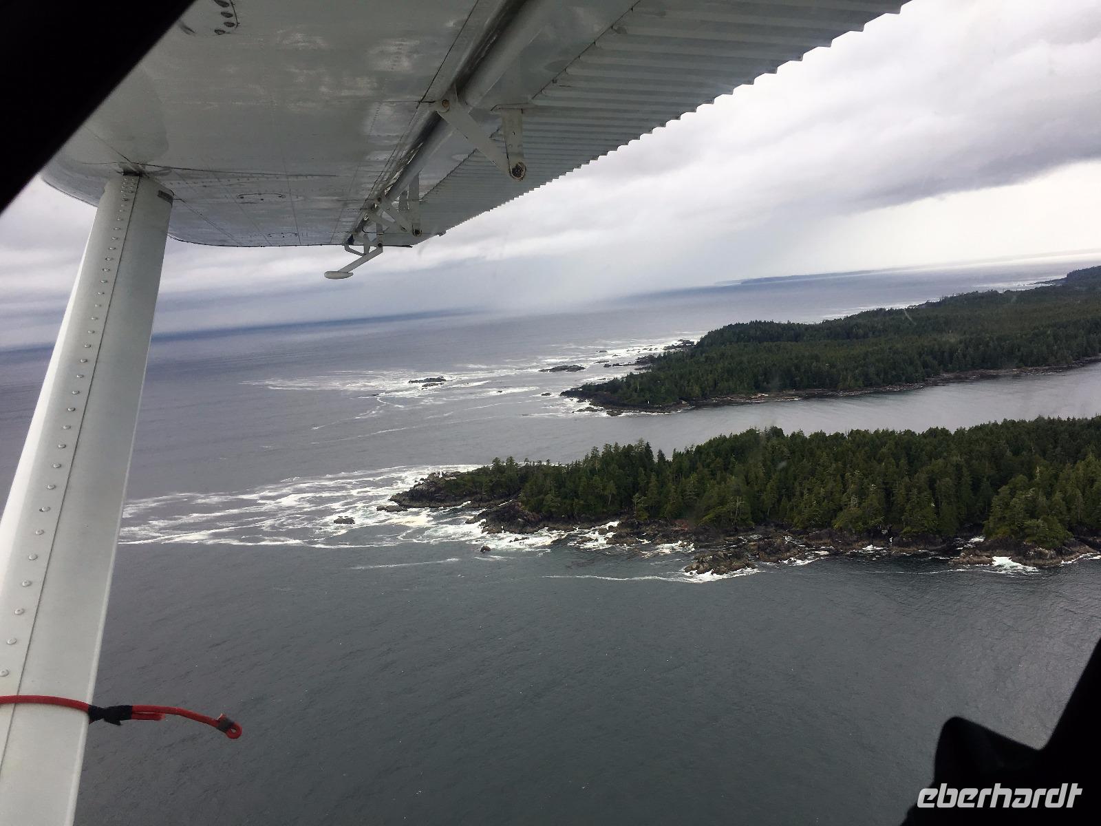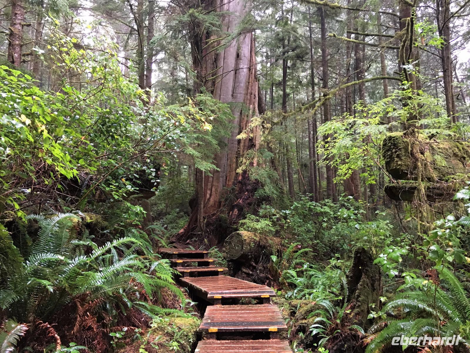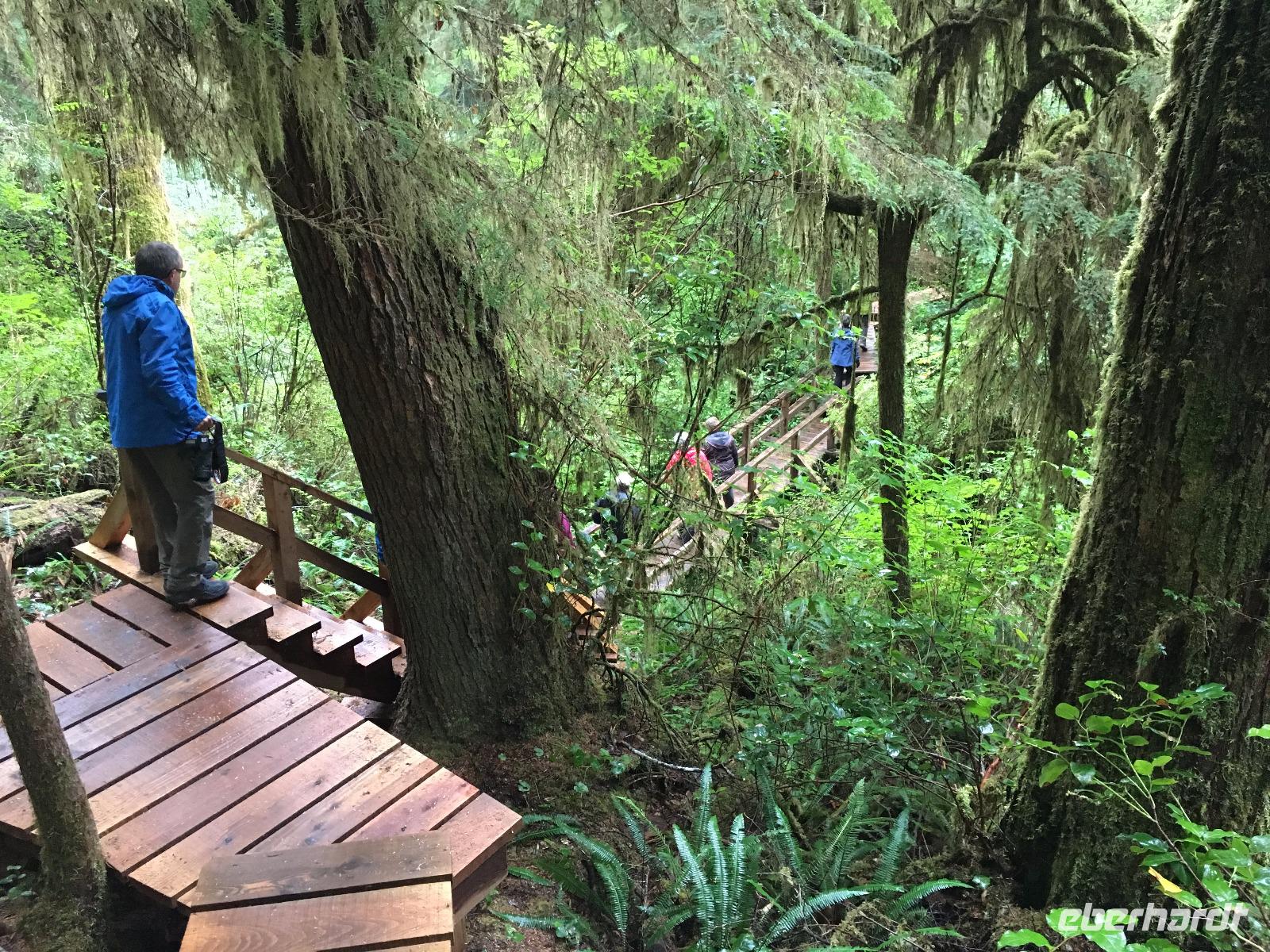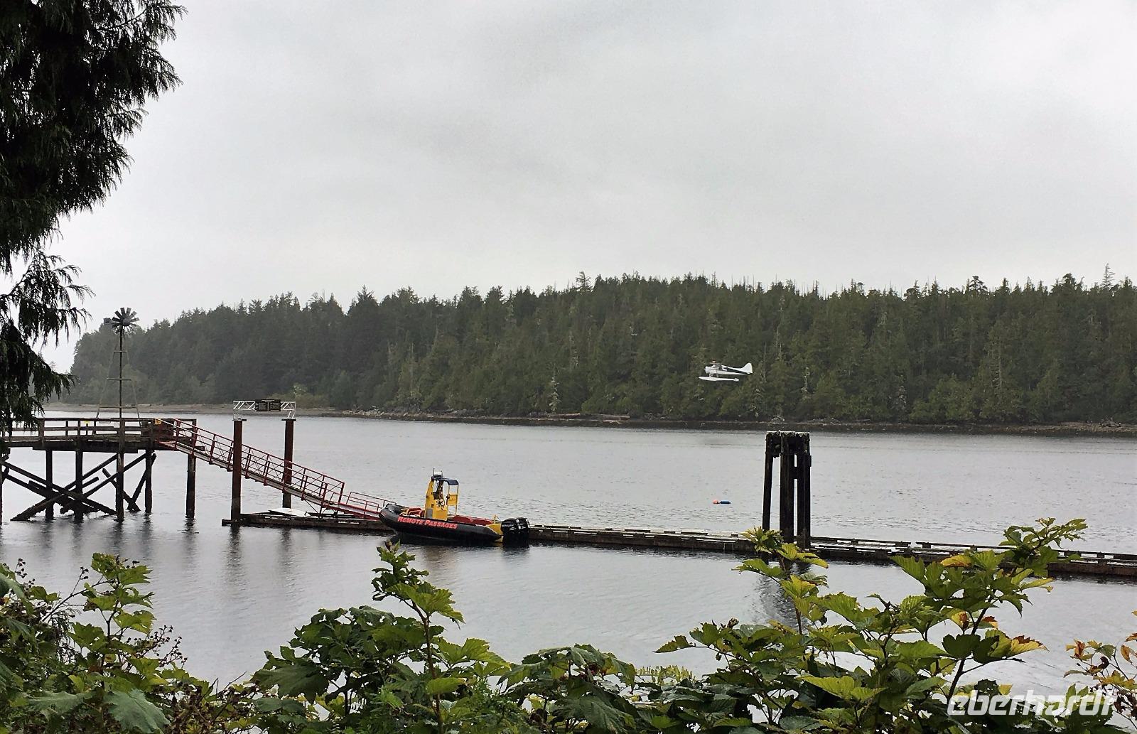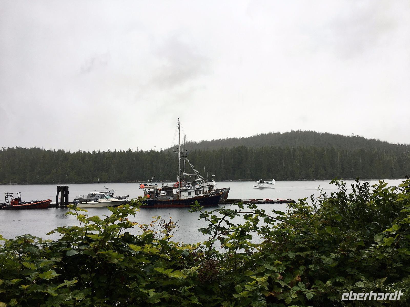 Es ist unser Westkuesten-Tag, der Regenwald-Tag, und es troepfelt sogar ganz leise. Das Fruehstueck nehmen wir in einem huebschen kleinen Kaffeehaus ein. Ausser ein paar Ortsansaessige belegen wir das ganze Restaurant. Als erstes wollen wir gleich mal diese legendaeren Riesenbaeume des Pacific Rim Nazionalparks sehen und halten also auch gleich bei einem Rundwanderweg an. Auf einem Holzsteg gehend geniessen wir die Ueberschwenglichkeit der Vielfalt dieses Waldes. Es ist wirklich ein Urwald auf 3 Etagen und wir bewegen uns mal im Unterholz und mal im Mittelbereich. Die Krone des Waldes ist kaum sichtbar...so hoch oben... aber auch weil es immer wieder regnet und wir die Scheibenwischer unserer Brillen nicht dabei haben ! Gerade im Regen, wird uns erklaert, sind diese Waelder am schoensten, alles glitzert, die Farne leuchten und die Troepfchen schauen zierlich aus auf dem Moos und den Luftpflanzen. Es ist wie ein Maerchenwald. Knipsend und staunend gehen wir und sehen nach einer Stunde auch unseren Bus wieder. Auf der Tafel steht, dass dieser Rundgang 1.1 Km lang ist. Wir waren eine Stunde unterwegs und wir sind doch eine Wandergruppe ? Also holen wir die Zeit mit dem Bus wieder ein. Noch einen kurzen Abstecher auf Radar Hill mit der schoenen Aussicht auf den ganzen Pacific Rim National Park und schon sind wir in Tofino. Die Bootsfirma mit der wir den heutigen Ausflug gebucht haben offeriert auch Kaffee, Tee und heisse Schokolade. Es regnet auch nicht mehr und ein bisschen hellblau zeigt sich am Himmel. Warren ist unser Kapitaen, er segelt uns in seinem 600 PS gedeckten Schiff sicher an den vielen Inseln vorbei. Wir schlaengeln uns eigentlich durch ein Inselmeer. Ploetzlich sehen wir etwas schwimmen, ein Seehund ? Nein, groesser. Ein schoener grosser Schwarzbaer steigt aus dem Wasser und betritt die Insel die ca 50 Meter neben unserem Schiff liegt. Was fuer ein Glueck, wir sehen unseren ersten Baeren auf dieser Reise. Nun sind wir uebergluecklich sodass auch die 10 Minuten unruhige See uns gar nichts ausmachen. Wir haben auch einen Seemann unter uns, er geniesst den hohen Wellengang lachend, wir anderen ueberleben diese Schauklerei schweigend. Kaum an Destination gelandet, faengt es an zu schuetten was nur geht. Wir verabschieden uns von Warren und eilen zur Ueberdachung. Das Picknick schmeckt gut, wenn nicht durchnaesst. Jetzt wollen wir aber zu den heissen Quellen und das ist eine 1 stuendige Wanderung durch den Wald. So schoen, jetzt so nass. Bloss 2 unter uns, trauen sich bei Ankunft an den Quellen, die triefende Kleidung auszuziehen um ins warme Nass zu springen, die anderen schauen kopfschuettelnd zu. Es regnet immer heftiger, als waere das moeglich, die Tropfen sind so lang wie endlose Spaghetti und total gebadet erreichen wir wieder die Anlegestelle. Bald kommt das Wasserflugzeug, um uns durch die Luefte zu heben und uns wieder mit dem warmen Bus zu vereinen. Der Flug mit so einem Wasserflugzeug ist ein Abenteuer fuer sich es ist toll ueber die Inselwelt zu schweben wie ein Vogel. Mancheiner unter uns haelt auch Ausschau, ob er den Baeren nicht doch noch einmal sehen kann. Auf dem Steg in Tofino treffen wir auf jene die heute «frei» haben und Brendan. Nun gibts aber einen heissen Kaffee und danach fahren wir auch gleich zurueck zum Hotel, wo jeder seine eigene Quelle/Badewanne geniesst. Ein feines, wenn auch unuebliches Abendessen rundet diesen ereignisreichen Tag ab. Das offerierte Bier schmeckt vorzueglich, der gute Schlaf ist gesichert.