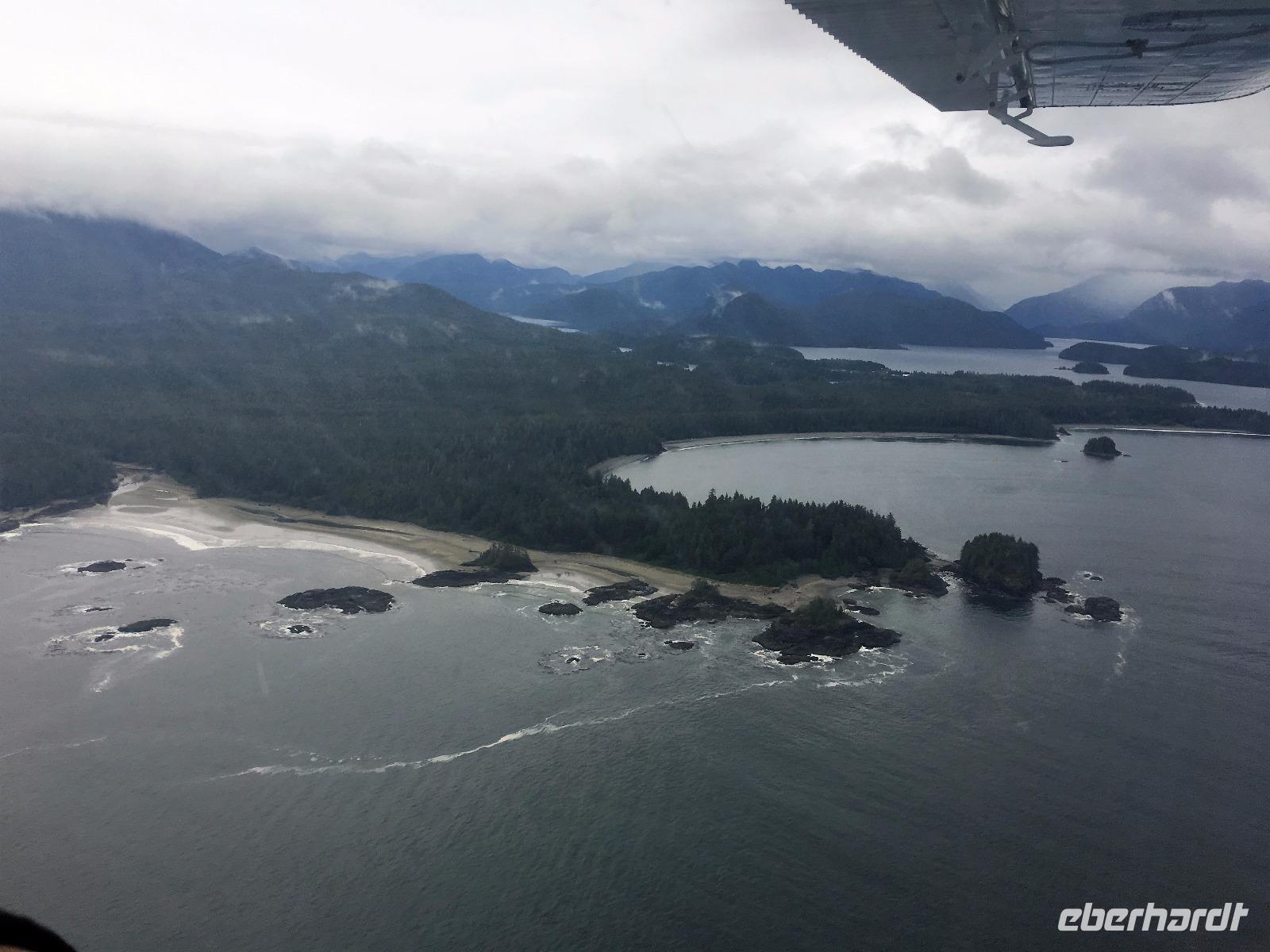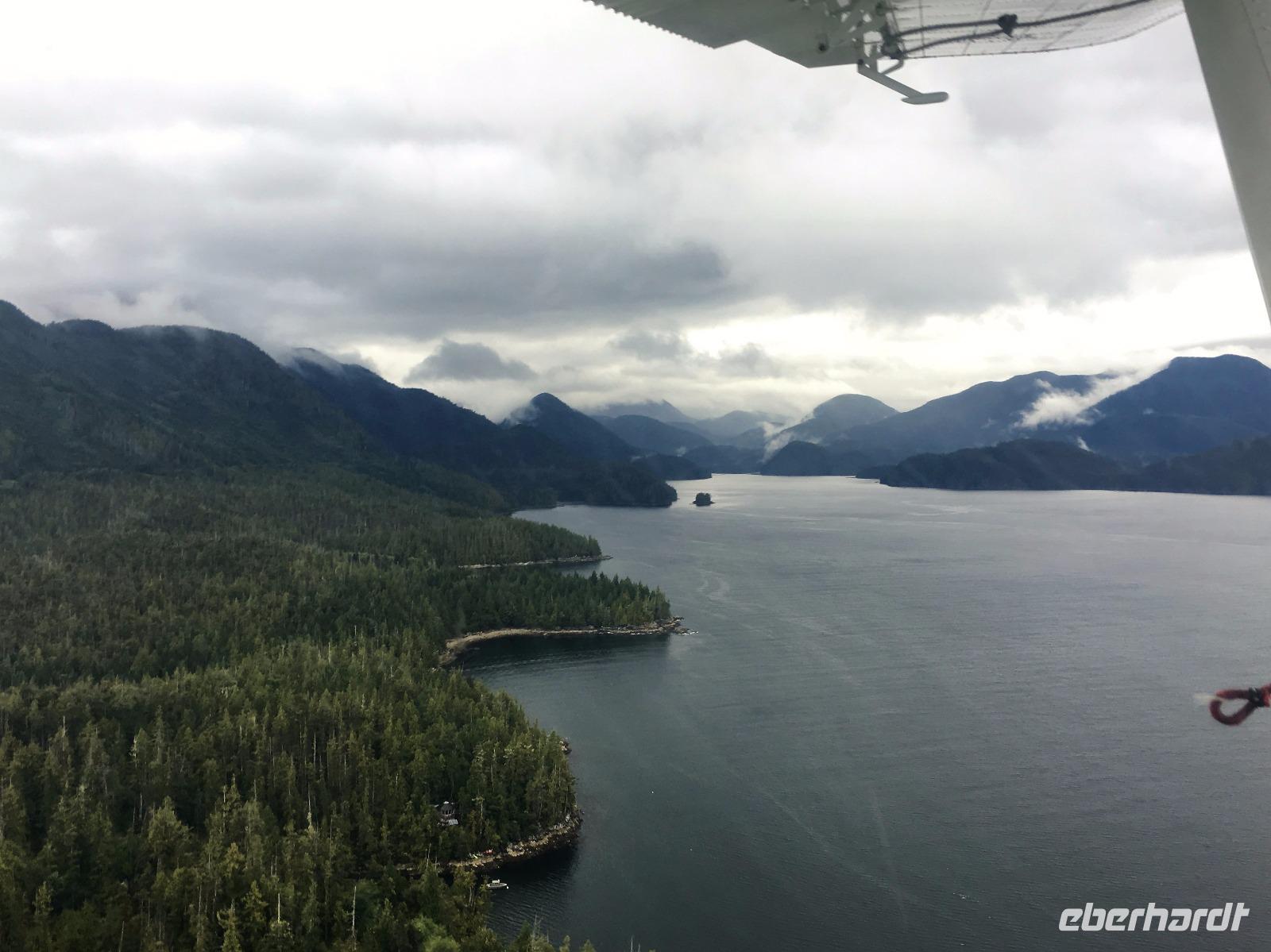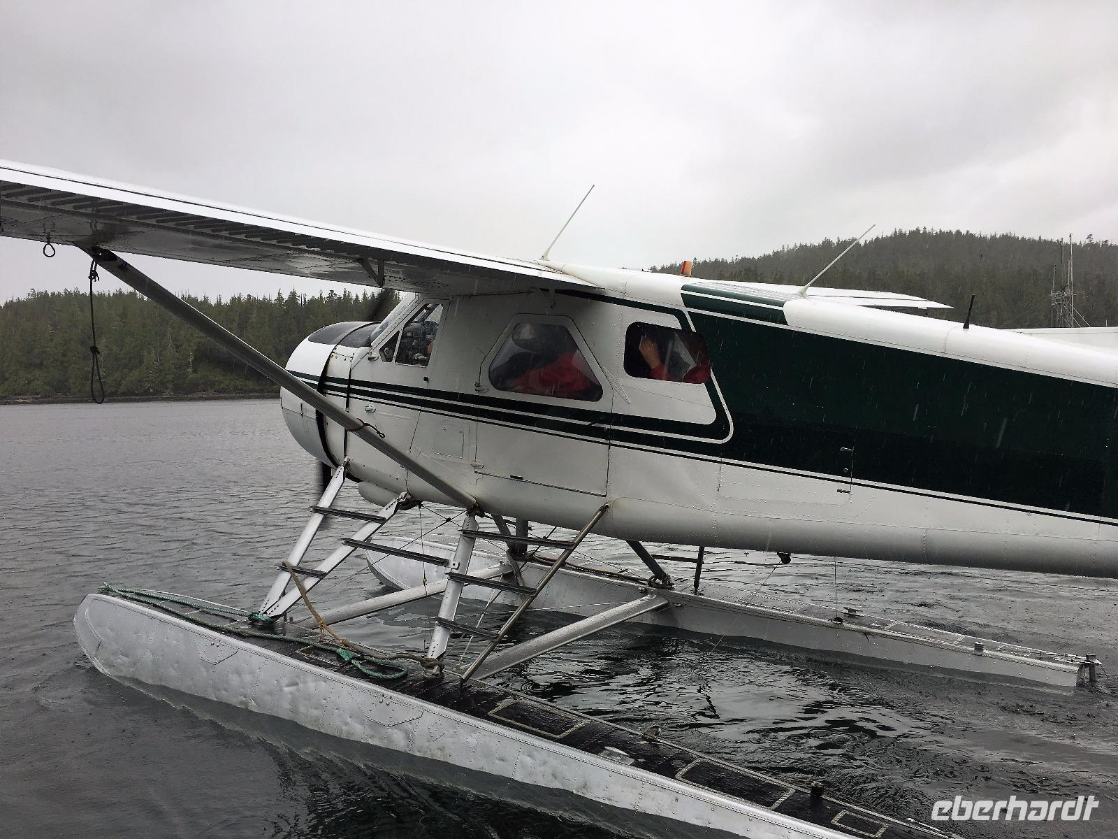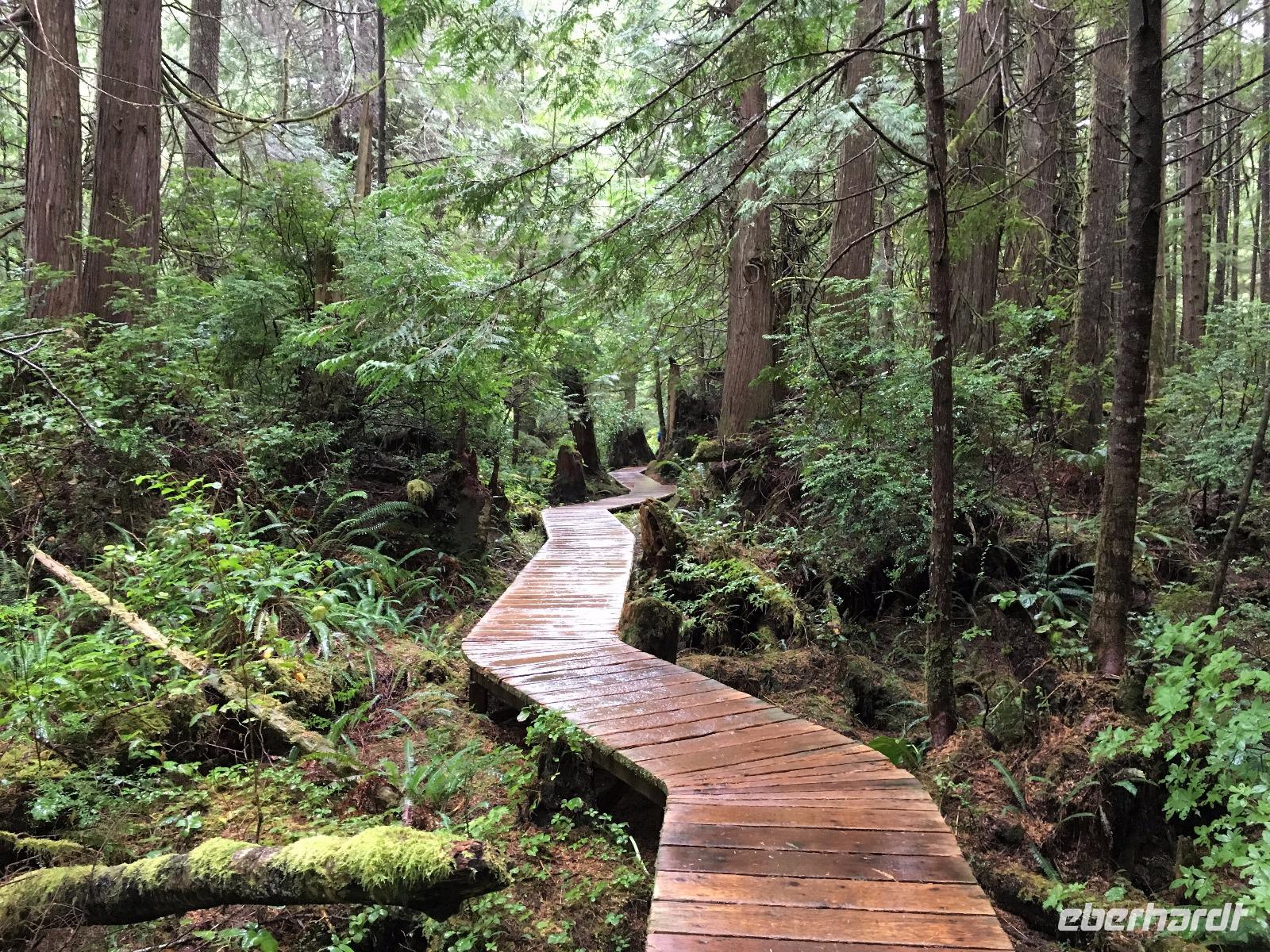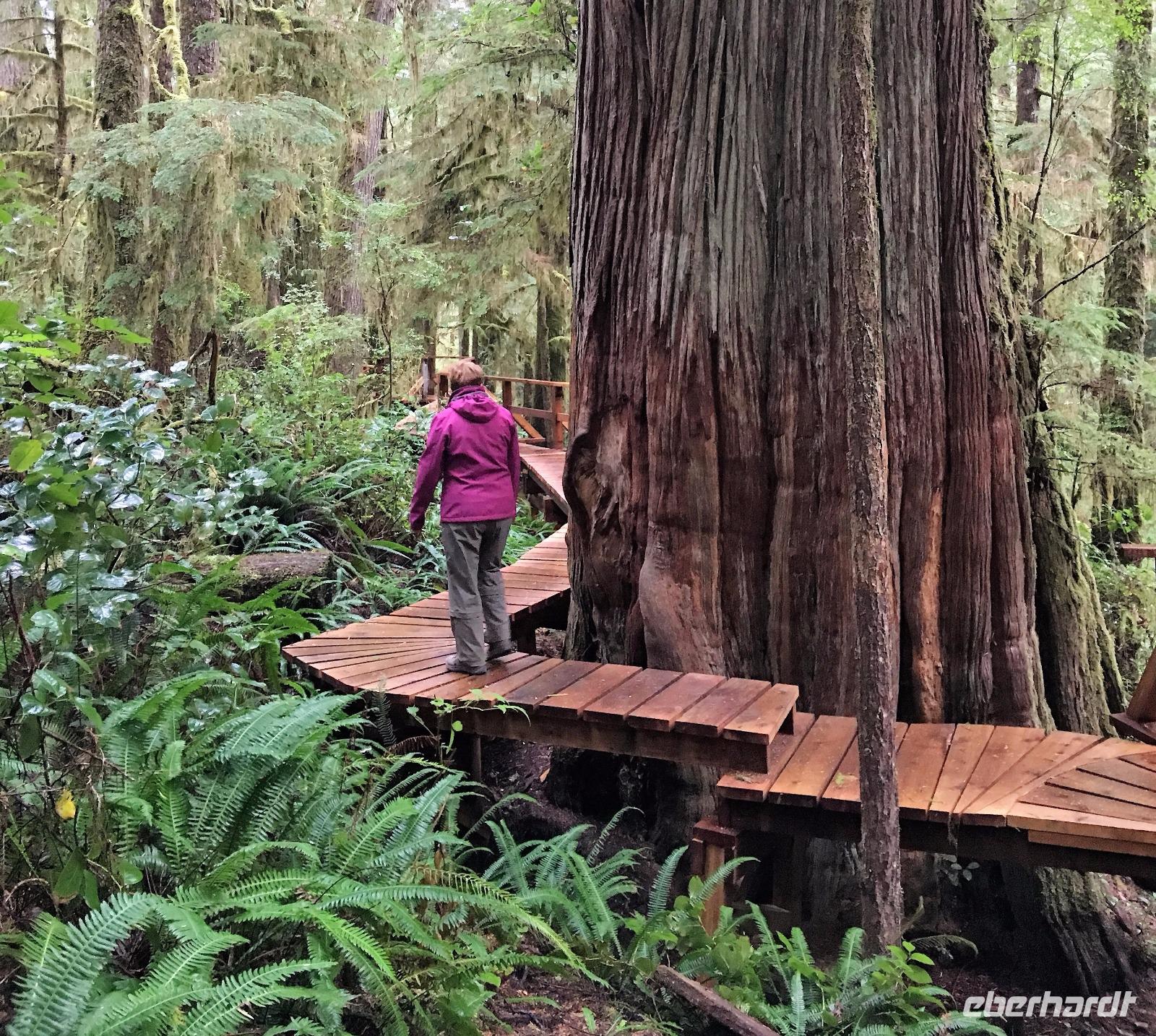Es ist unser Westkuesten-Tag, der Regenwald-Tag, und es troepfelt sogar ganz leise. Das Fruehstueck nehmen wir in einem huebschen kleinen Kaffeehaus ein. Ausser ein paar Ortsansaessige belegen wir das ganze Restaurant. Als erstes wollen wir gleich mal diese legendaeren Riesenbaeume des Pacific Rim Nazionalparks sehen und halten also auch gleich bei einem Rundwanderweg an. Auf einem Holzsteg gehend geniessen wir die Ueberschwenglichkeit der Vielfalt dieses Waldes. Es ist wirklich ein Urwald auf 3 Etagen und wir bewegen uns mal im Unterholz und mal im Mittelbereich. Die Krone des Waldes ist kaum sichtbar...so hoch oben... aber auch weil es immer wieder regnet und wir die Scheibenwischer unserer Brillen nicht dabei haben ! Gerade im Regen, wird uns erklaert, sind diese Waelder am schoensten, alles glitzert, die Farne leuchten und die Troepfchen schauen zierlich aus auf dem Moos und den Luftpflanzen. Es ist wie ein Maerchenwald. Knipsend und staunend gehen wir und sehen nach einer Stunde auch unseren Bus wieder. Auf der Tafel steht, dass dieser Rundgang 1.1 Km lang ist. Wir waren eine Stunde unterwegs und wir sind doch eine Wandergruppe ? Also holen wir die Zeit mit dem Bus wieder ein. Noch einen kurzen Abstecher auf Radar Hill mit der schoenen Aussicht auf den ganzen Pacific Rim National Park und schon sind wir in Tofino. Die Bootsfirma mit der wir den heutigen Ausflug gebucht haben offeriert auch Kaffee, Tee und heisse Schokolade. Es regnet auch nicht mehr und ein bisschen hellblau zeigt sich am Himmel. Warren ist unser Kapitaen, er segelt uns in seinem 600 PS gedeckten Schiff sicher an den vielen Inseln vorbei. Wir schlaengeln uns eigentlich durch ein Inselmeer. Ploetzlich sehen wir etwas schwimmen, ein Seehund ? Nein, groesser. Ein schoener grosser Schwarzbaer steigt aus dem Wasser und betritt die Insel die ca 50 Meter neben unserem Schiff liegt. Was fuer ein Glueck, wir sehen unseren ersten Baeren auf dieser Reise. Nun sind wir uebergluecklich sodass auch die 10 Minuten unruhige See uns gar nichts ausmachen. Wir haben auch einen Seemann unter uns, er geniesst den hohen Wellengang lachend, wir anderen ueberleben diese Schauklerei schweigend. Kaum an Destination gelandet, faengt es an zu schuetten was nur geht. Wir verabschieden uns von Warren und eilen zur Ueberdachung. Das Picknick schmeckt gut, wenn nicht durchnaesst. Jetzt wollen wir aber zu den heissen Quellen und das ist eine 1 stuendige Wanderung durch den Wald. So schoen, jetzt so nass. Bloss 2 unter uns, trauen sich bei Ankunft an den Quellen, die triefende Kleidung auszuziehen um ins warme Nass zu springen, die anderen schauen kopfschuettelnd zu. Es regnet immer heftiger, als waere das moeglich, die Tropfen sind so lang wie endlose Spaghetti und total gebadet erreichen wir wieder die Anlegestelle. Bald kommt das Wasserflugzeug, um uns durch die Luefte zu heben und uns wieder mit dem warmen Bus zu vereinen. Der Flug mit so einem Wasserflugzeug ist ein Abenteuer fuer sich es ist toll ueber die Inselwelt zu schweben wie ein Vogel. Mancheiner unter uns haelt auch Ausschau, ob er den Baeren nicht doch noch einmal sehen kann. Auf dem Steg in Tofino treffen wir auf jene die heute «frei» haben und Brendan. Nun gibts aber einen heissen Kaffee und danach fahren wir auch gleich zurueck zum Hotel, wo jeder seine eigene Quelle/Badewanne geniesst. Ein feines, wenn auch unuebliches Abendessen rundet diesen ereignisreichen Tag ab. Das offerierte Bier schmeckt vorzueglich, der gute Schlaf ist gesichert.