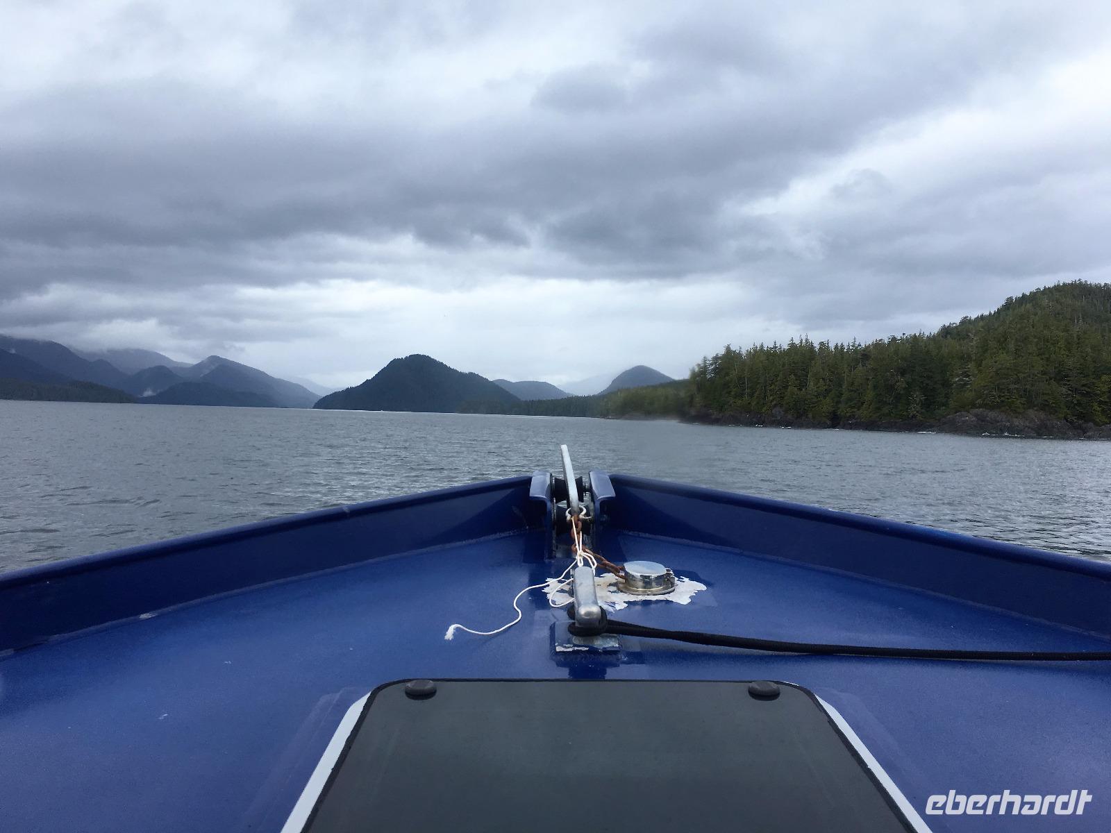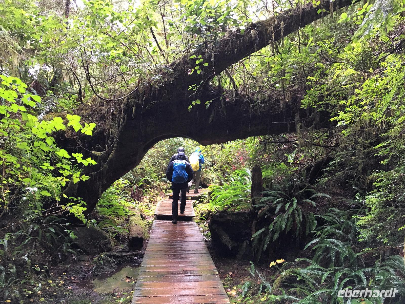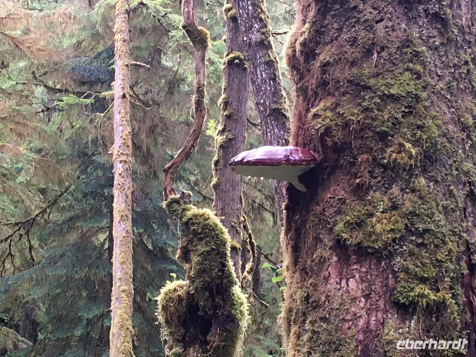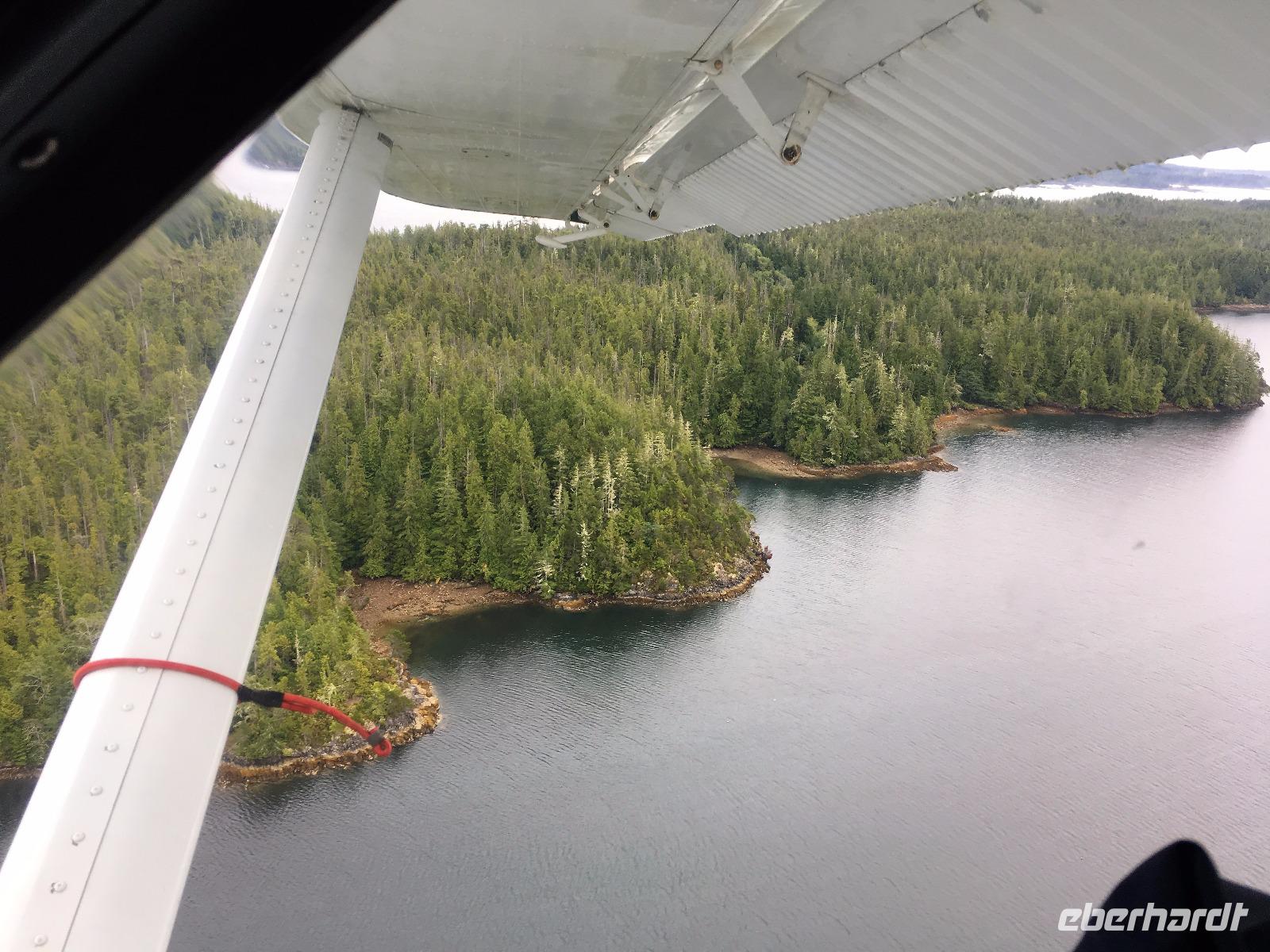 Es ist unser Westkuesten-Tag, der Regenwald-Tag, und es troepfelt sogar ganz leise. Das Fruehstueck nehmen wir in einem huebschen kleinen Kaffeehaus ein. Ausser ein paar Ortsansaessige belegen wir das ganze Restaurant. Als erstes wollen wir gleich mal diese legendaeren Riesenbaeume des Pacific Rim Nazionalparks sehen und halten also auch gleich bei einem Rundwanderweg an. Auf einem Holzsteg gehend geniessen wir die Ueberschwenglichkeit der Vielfalt dieses Waldes. Es ist wirklich ein Urwald auf 3 Etagen und wir bewegen uns mal im Unterholz und mal im Mittelbereich. Die Krone des Waldes ist kaum sichtbar...so hoch oben... aber auch weil es immer wieder regnet und wir die Scheibenwischer unserer Brillen nicht dabei haben ! Gerade im Regen, wird uns erklaert, sind diese Waelder am schoensten, alles glitzert, die Farne leuchten und die Troepfchen schauen zierlich aus auf dem Moos und den Luftpflanzen. Es ist wie ein Maerchenwald. Knipsend und staunend gehen wir und sehen nach einer Stunde auch unseren Bus wieder. Auf der Tafel steht, dass dieser Rundgang 1.1 Km lang ist. Wir waren eine Stunde unterwegs und wir sind doch eine Wandergruppe ? Also holen wir die Zeit mit dem Bus wieder ein. Noch einen kurzen Abstecher auf Radar Hill mit der schoenen Aussicht auf den ganzen Pacific Rim National Park und schon sind wir in Tofino. Die Bootsfirma mit der wir den heutigen Ausflug gebucht haben offeriert auch Kaffee, Tee und heisse Schokolade. Es regnet auch nicht mehr und ein bisschen hellblau zeigt sich am Himmel. Warren ist unser Kapitaen, er segelt uns in seinem 600 PS gedeckten Schiff sicher an den vielen Inseln vorbei. Wir schlaengeln uns eigentlich durch ein Inselmeer. Ploetzlich sehen wir etwas schwimmen, ein Seehund ? Nein, groesser. Ein schoener grosser Schwarzbaer steigt aus dem Wasser und betritt die Insel die ca 50 Meter neben unserem Schiff liegt. Was fuer ein Glueck, wir sehen unseren ersten Baeren auf dieser Reise. Nun sind wir uebergluecklich sodass auch die 10 Minuten unruhige See uns gar nichts ausmachen. Wir haben auch einen Seemann unter uns, er geniesst den hohen Wellengang lachend, wir anderen ueberleben diese Schauklerei schweigend. Kaum an Destination gelandet, faengt es an zu schuetten was nur geht. Wir verabschieden uns von Warren und eilen zur Ueberdachung. Das Picknick schmeckt gut, wenn nicht durchnaesst. Jetzt wollen wir aber zu den heissen Quellen und das ist eine 1 stuendige Wanderung durch den Wald. So schoen, jetzt so nass. Bloss 2 unter uns, trauen sich bei Ankunft an den Quellen, die triefende Kleidung auszuziehen um ins warme Nass zu springen, die anderen schauen kopfschuettelnd zu. Es regnet immer heftiger, als waere das moeglich, die Tropfen sind so lang wie endlose Spaghetti und total gebadet erreichen wir wieder die Anlegestelle. Bald kommt das Wasserflugzeug, um uns durch die Luefte zu heben und uns wieder mit dem warmen Bus zu vereinen. Der Flug mit so einem Wasserflugzeug ist ein Abenteuer fuer sich es ist toll ueber die Inselwelt zu schweben wie ein Vogel. Mancheiner unter uns haelt auch Ausschau, ob er den Baeren nicht doch noch einmal sehen kann. Auf dem Steg in Tofino treffen wir auf jene die heute «frei» haben und Brendan. Nun gibts aber einen heissen Kaffee und danach fahren wir auch gleich zurueck zum Hotel, wo jeder seine eigene Quelle/Badewanne geniesst. Ein feines, wenn auch unuebliches Abendessen rundet diesen ereignisreichen Tag ab. Das offerierte Bier schmeckt vorzueglich, der gute Schlaf ist gesichert.