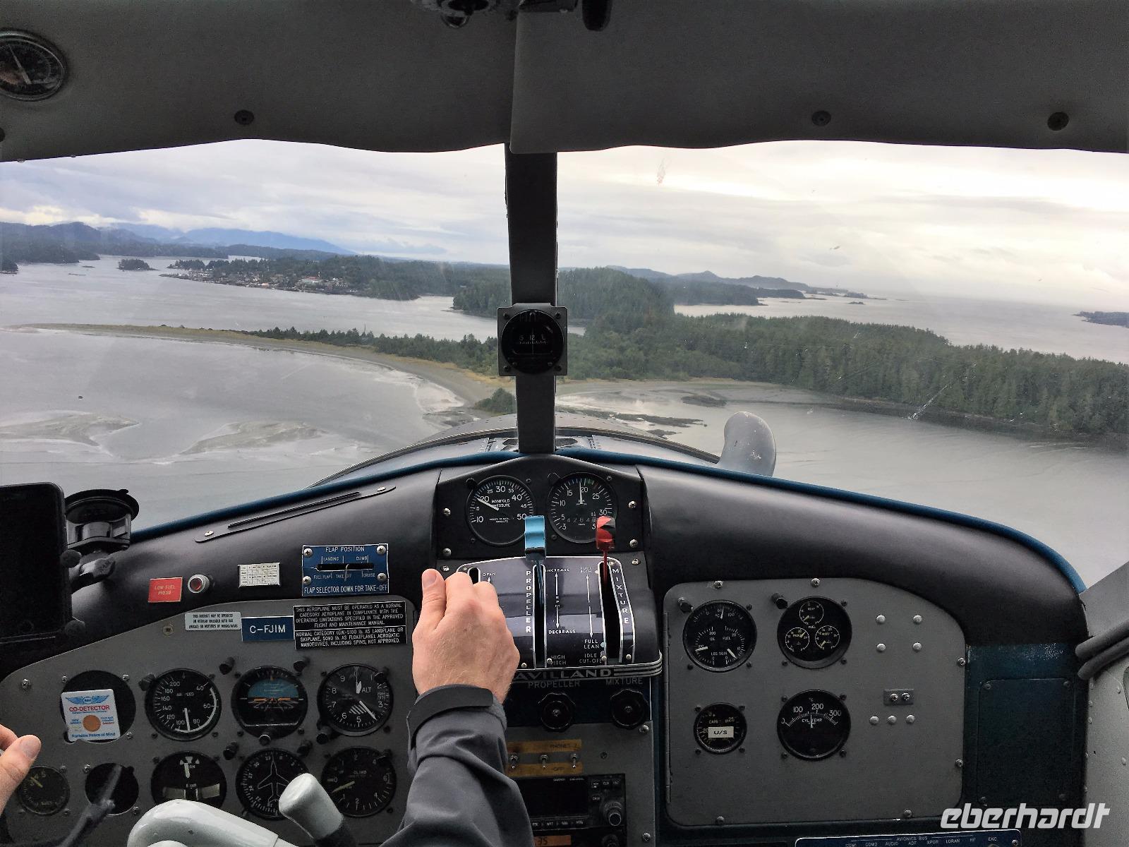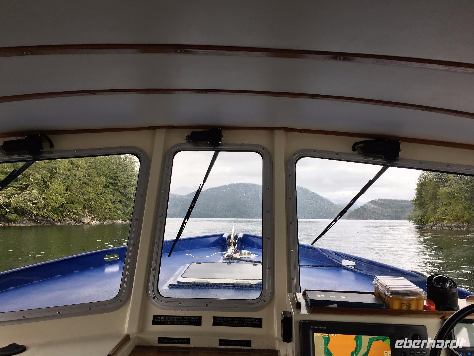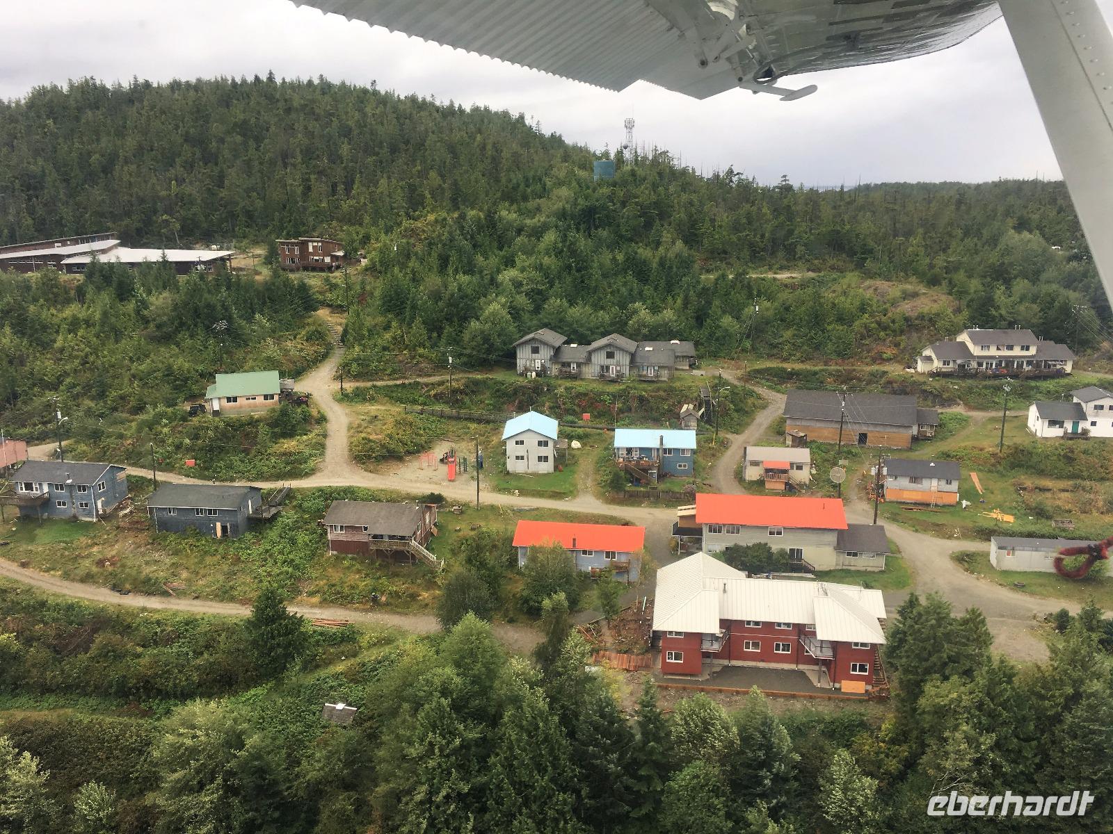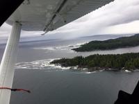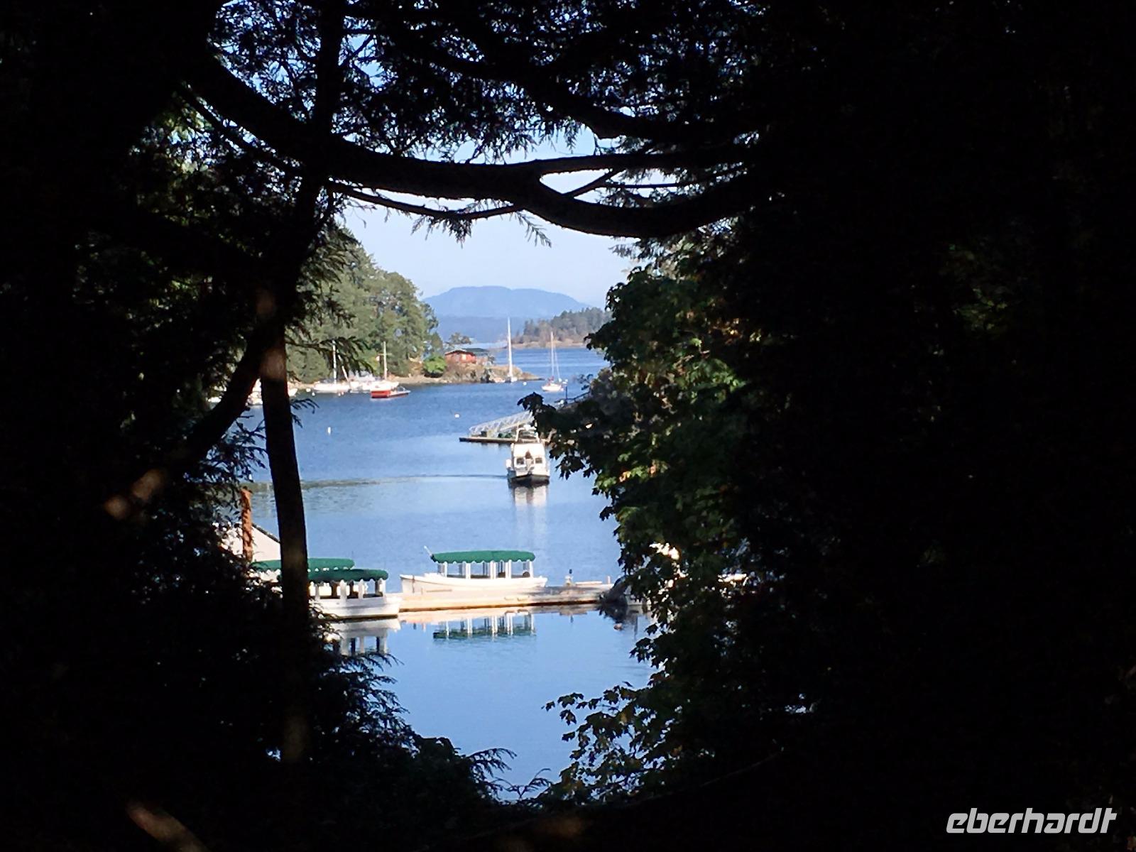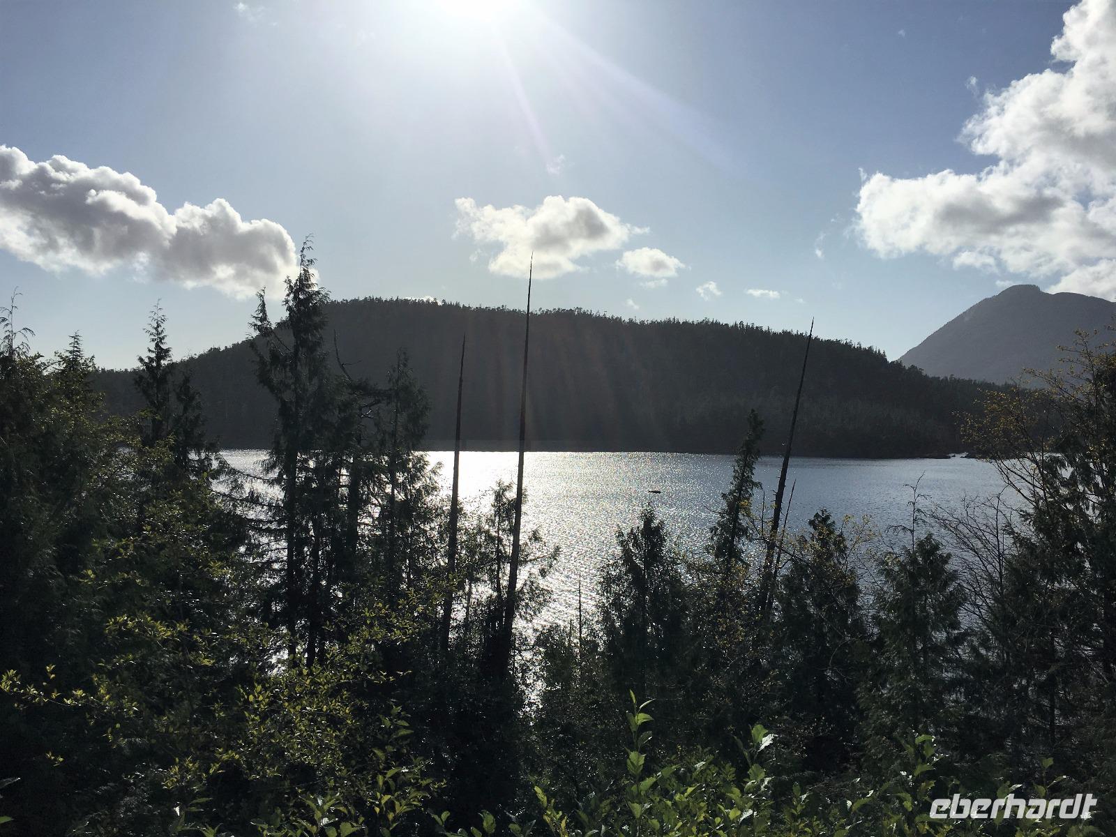 Es ist unser Westkuesten-Tag, der Regenwald-Tag, und es troepfelt sogar ganz leise. Das Fruehstueck nehmen wir in einem huebschen kleinen Kaffeehaus ein. Ausser ein paar Ortsansaessige belegen wir das ganze Restaurant. Als erstes wollen wir gleich mal diese legendaeren Riesenbaeume des Pacific Rim Nazionalparks sehen und halten also auch gleich bei einem Rundwanderweg an. Auf einem Holzsteg gehend geniessen wir die Ueberschwenglichkeit der Vielfalt dieses Waldes. Es ist wirklich ein Urwald auf 3 Etagen und wir bewegen uns mal im Unterholz und mal im Mittelbereich. Die Krone des Waldes ist kaum sichtbar...so hoch oben... aber auch weil es immer wieder regnet und wir die Scheibenwischer unserer Brillen nicht dabei haben ! Gerade im Regen, wird uns erklaert, sind diese Waelder am schoensten, alles glitzert, die Farne leuchten und die Troepfchen schauen zierlich aus auf dem Moos und den Luftpflanzen. Es ist wie ein Maerchenwald. Knipsend und staunend gehen wir und sehen nach einer Stunde auch unseren Bus wieder. Auf der Tafel steht, dass dieser Rundgang 1.1 Km lang ist. Wir waren eine Stunde unterwegs und wir sind doch eine Wandergruppe ? Also holen wir die Zeit mit dem Bus wieder ein. Noch einen kurzen Abstecher auf Radar Hill mit der schoenen Aussicht auf den ganzen Pacific Rim National Park und schon sind wir in Tofino. Die Bootsfirma mit der wir den heutigen Ausflug gebucht haben offeriert auch Kaffee, Tee und heisse Schokolade. Es regnet auch nicht mehr und ein bisschen hellblau zeigt sich am Himmel. Warren ist unser Kapitaen, er segelt uns in seinem 600 PS gedeckten Schiff sicher an den vielen Inseln vorbei. Wir schlaengeln uns eigentlich durch ein Inselmeer. Ploetzlich sehen wir etwas schwimmen, ein Seehund ? Nein, groesser. Ein schoener grosser Schwarzbaer steigt aus dem Wasser und betritt die Insel die ca 50 Meter neben unserem Schiff liegt. Was fuer ein Glueck, wir sehen unseren ersten Baeren auf dieser Reise. Nun sind wir uebergluecklich sodass auch die 10 Minuten unruhige See uns gar nichts ausmachen. Wir haben auch einen Seemann unter uns, er geniesst den hohen Wellengang lachend, wir anderen ueberleben diese Schauklerei schweigend. Kaum an Destination gelandet, faengt es an zu schuetten was nur geht. Wir verabschieden uns von Warren und eilen zur Ueberdachung. Das Picknick schmeckt gut, wenn nicht durchnaesst. Jetzt wollen wir aber zu den heissen Quellen und das ist eine 1 stuendige Wanderung durch den Wald. So schoen, jetzt so nass. Bloss 2 unter uns, trauen sich bei Ankunft an den Quellen, die triefende Kleidung auszuziehen um ins warme Nass zu springen, die anderen schauen kopfschuettelnd zu. Es regnet immer heftiger, als waere das moeglich, die Tropfen sind so lang wie endlose Spaghetti und total gebadet erreichen wir wieder die Anlegestelle. Bald kommt das Wasserflugzeug, um uns durch die Luefte zu heben und uns wieder mit dem warmen Bus zu vereinen. Der Flug mit so einem Wasserflugzeug ist ein Abenteuer fuer sich es ist toll ueber die Inselwelt zu schweben wie ein Vogel. Mancheiner unter uns haelt auch Ausschau, ob er den Baeren nicht doch noch einmal sehen kann. Auf dem Steg in Tofino treffen wir auf jene die heute «frei» haben und Brendan. Nun gibts aber einen heissen Kaffee und danach fahren wir auch gleich zurueck zum Hotel, wo jeder seine eigene Quelle/Badewanne geniesst. Ein feines, wenn auch unuebliches Abendessen rundet diesen ereignisreichen Tag ab. Das offerierte Bier schmeckt vorzueglich, der gute Schlaf ist gesichert.