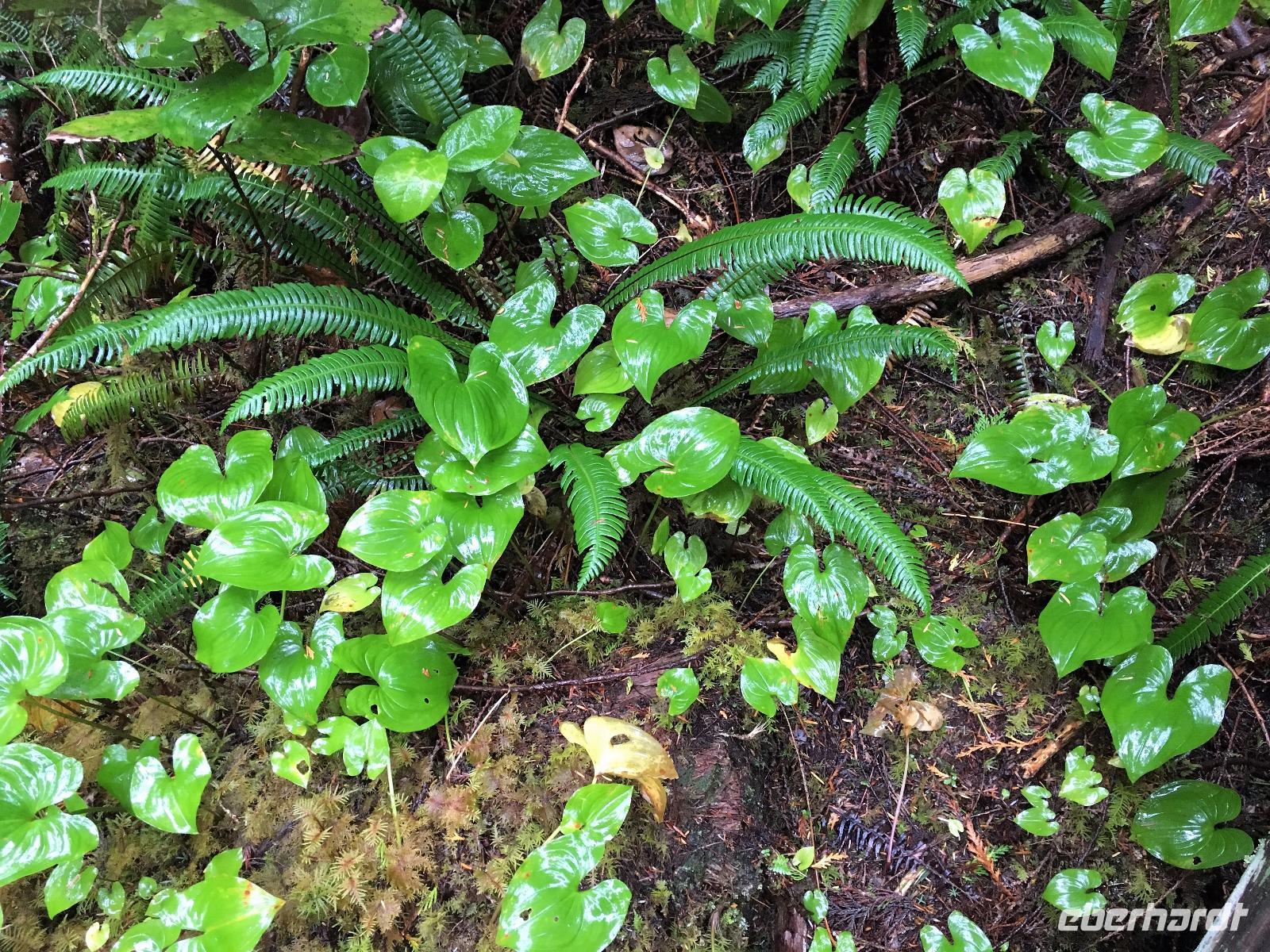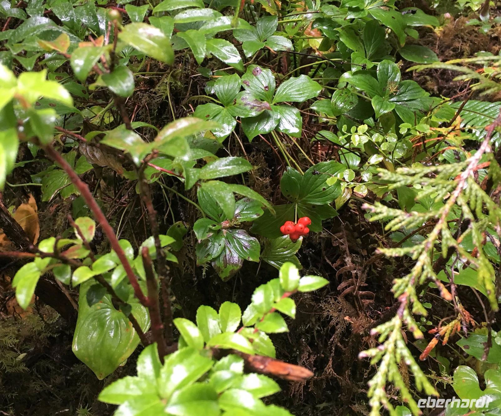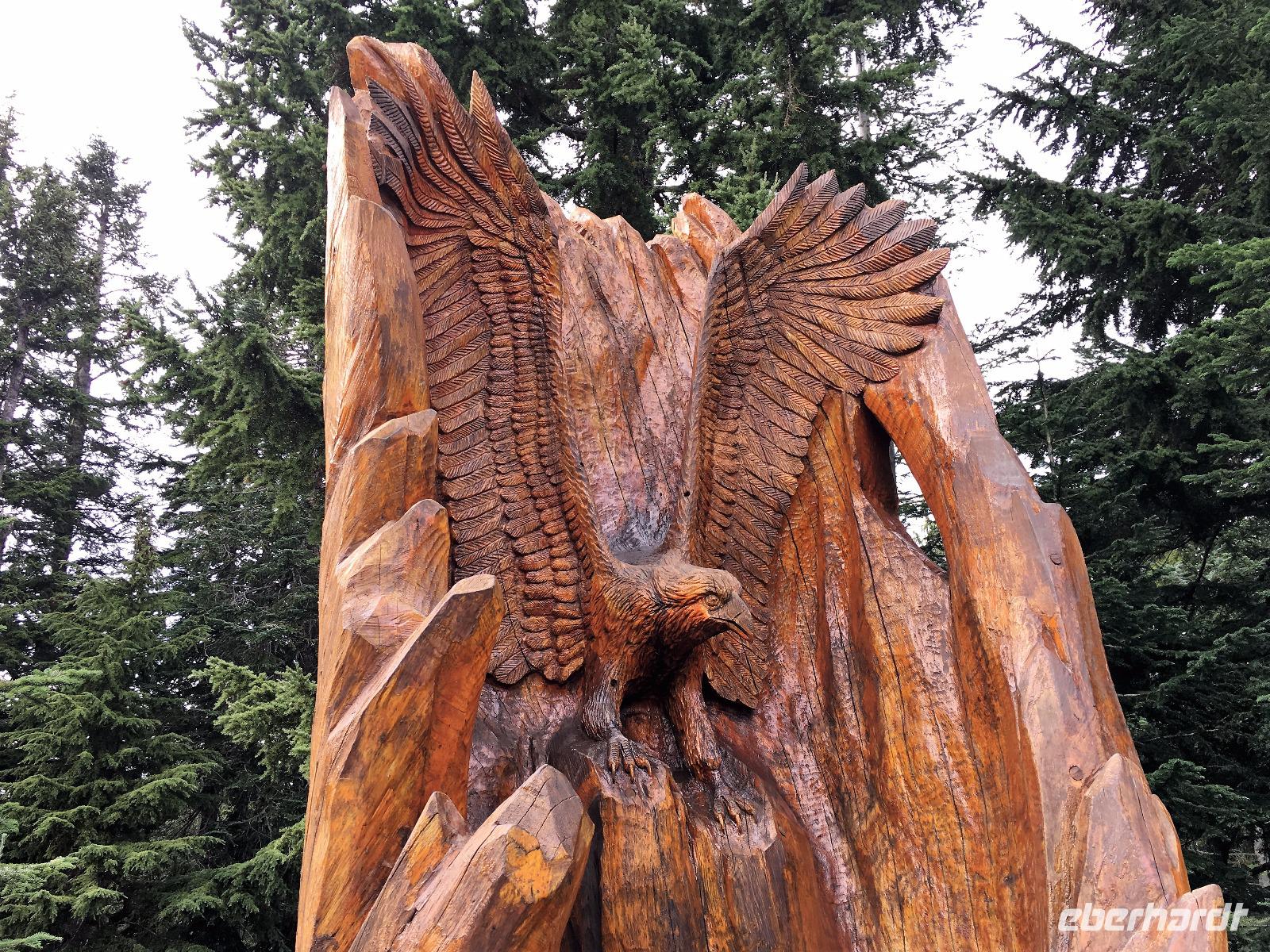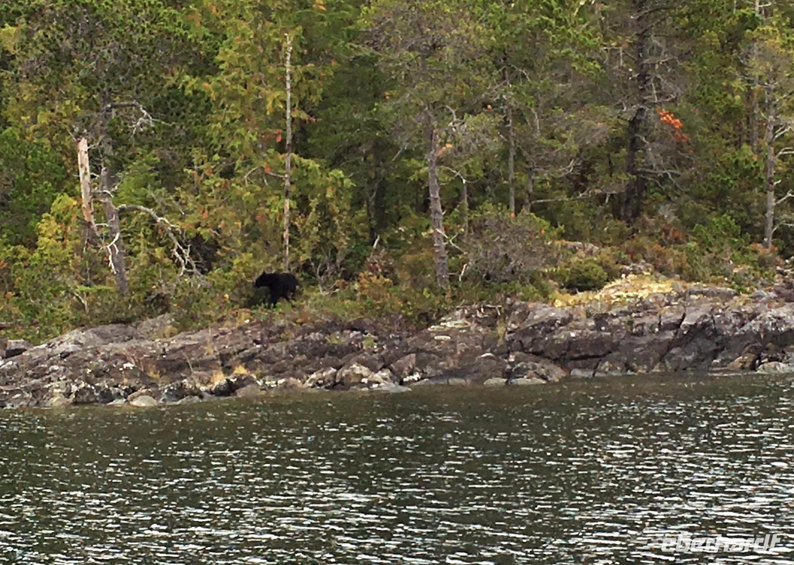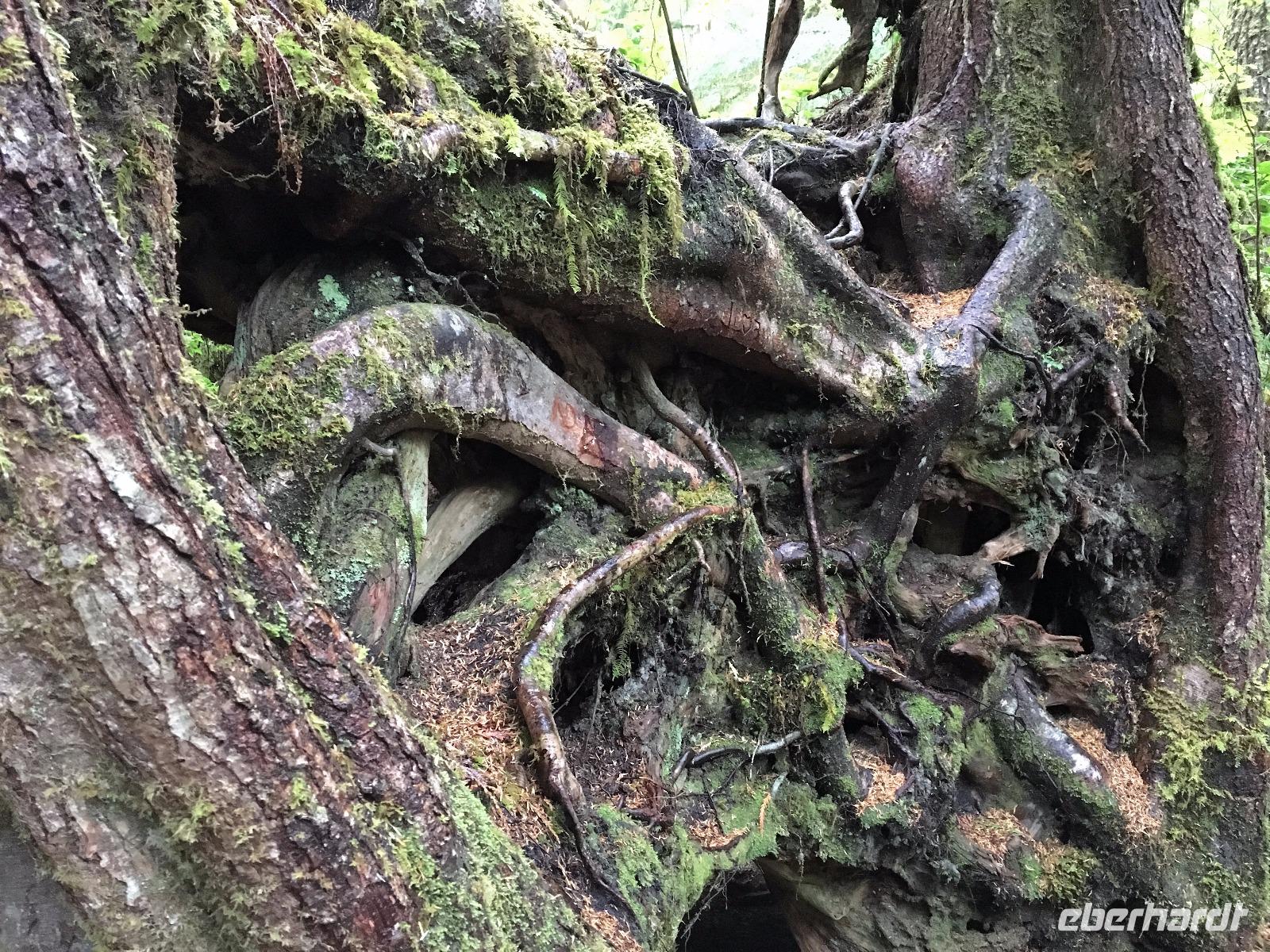 Es ist unser Westkuesten-Tag, der Regenwald-Tag, und es troepfelt sogar ganz leise. Das Fruehstueck nehmen wir in einem huebschen kleinen Kaffeehaus ein. Ausser ein paar Ortsansaessige belegen wir das ganze Restaurant. Als erstes wollen wir gleich mal diese legendaeren Riesenbaeume des Pacific Rim Nazionalparks sehen und halten also auch gleich bei einem Rundwanderweg an. Auf einem Holzsteg gehend geniessen wir die Ueberschwenglichkeit der Vielfalt dieses Waldes. Es ist wirklich ein Urwald auf 3 Etagen und wir bewegen uns mal im Unterholz und mal im Mittelbereich. Die Krone des Waldes ist kaum sichtbar...so hoch oben... aber auch weil es immer wieder regnet und wir die Scheibenwischer unserer Brillen nicht dabei haben ! Gerade im Regen, wird uns erklaert, sind diese Waelder am schoensten, alles glitzert, die Farne leuchten und die Troepfchen schauen zierlich aus auf dem Moos und den Luftpflanzen. Es ist wie ein Maerchenwald. Knipsend und staunend gehen wir und sehen nach einer Stunde auch unseren Bus wieder. Auf der Tafel steht, dass dieser Rundgang 1.1 Km lang ist. Wir waren eine Stunde unterwegs und wir sind doch eine Wandergruppe ? Also holen wir die Zeit mit dem Bus wieder ein. Noch einen kurzen Abstecher auf Radar Hill mit der schoenen Aussicht auf den ganzen Pacific Rim National Park und schon sind wir in Tofino. Die Bootsfirma mit der wir den heutigen Ausflug gebucht haben offeriert auch Kaffee, Tee und heisse Schokolade. Es regnet auch nicht mehr und ein bisschen hellblau zeigt sich am Himmel. Warren ist unser Kapitaen, er segelt uns in seinem 600 PS gedeckten Schiff sicher an den vielen Inseln vorbei. Wir schlaengeln uns eigentlich durch ein Inselmeer. Ploetzlich sehen wir etwas schwimmen, ein Seehund ? Nein, groesser. Ein schoener grosser Schwarzbaer steigt aus dem Wasser und betritt die Insel die ca 50 Meter neben unserem Schiff liegt. Was fuer ein Glueck, wir sehen unseren ersten Baeren auf dieser Reise. Nun sind wir uebergluecklich sodass auch die 10 Minuten unruhige See uns gar nichts ausmachen. Wir haben auch einen Seemann unter uns, er geniesst den hohen Wellengang lachend, wir anderen ueberleben diese Schauklerei schweigend. Kaum an Destination gelandet, faengt es an zu schuetten was nur geht. Wir verabschieden uns von Warren und eilen zur Ueberdachung. Das Picknick schmeckt gut, wenn nicht durchnaesst. Jetzt wollen wir aber zu den heissen Quellen und das ist eine 1 stuendige Wanderung durch den Wald. So schoen, jetzt so nass. Bloss 2 unter uns, trauen sich bei Ankunft an den Quellen, die triefende Kleidung auszuziehen um ins warme Nass zu springen, die anderen schauen kopfschuettelnd zu. Es regnet immer heftiger, als waere das moeglich, die Tropfen sind so lang wie endlose Spaghetti und total gebadet erreichen wir wieder die Anlegestelle. Bald kommt das Wasserflugzeug, um uns durch die Luefte zu heben und uns wieder mit dem warmen Bus zu vereinen. Der Flug mit so einem Wasserflugzeug ist ein Abenteuer fuer sich es ist toll ueber die Inselwelt zu schweben wie ein Vogel. Mancheiner unter uns haelt auch Ausschau, ob er den Baeren nicht doch noch einmal sehen kann. Auf dem Steg in Tofino treffen wir auf jene die heute «frei» haben und Brendan. Nun gibts aber einen heissen Kaffee und danach fahren wir auch gleich zurueck zum Hotel, wo jeder seine eigene Quelle/Badewanne geniesst. Ein feines, wenn auch unuebliches Abendessen rundet diesen ereignisreichen Tag ab. Das offerierte Bier schmeckt vorzueglich, der gute Schlaf ist gesichert.