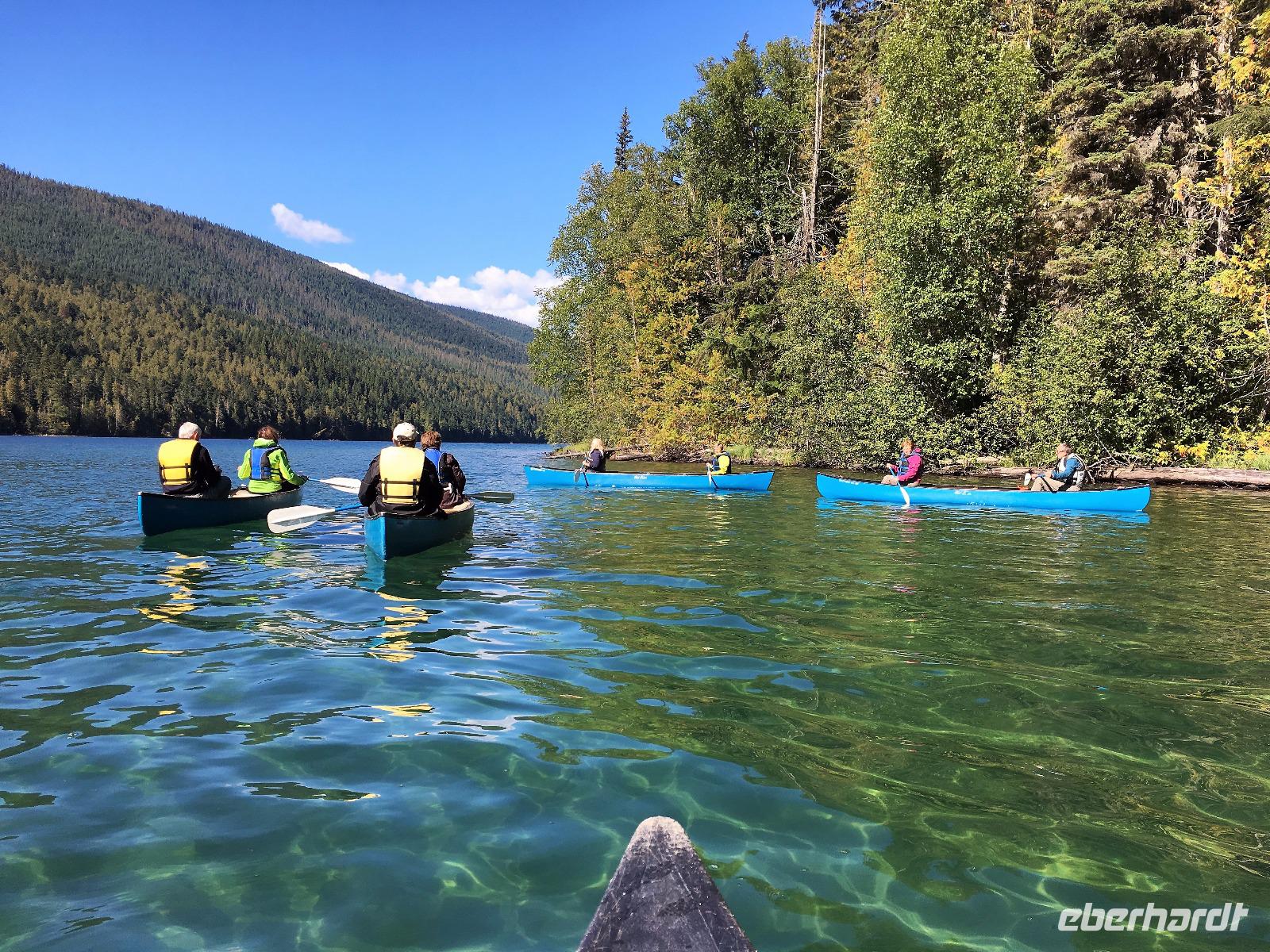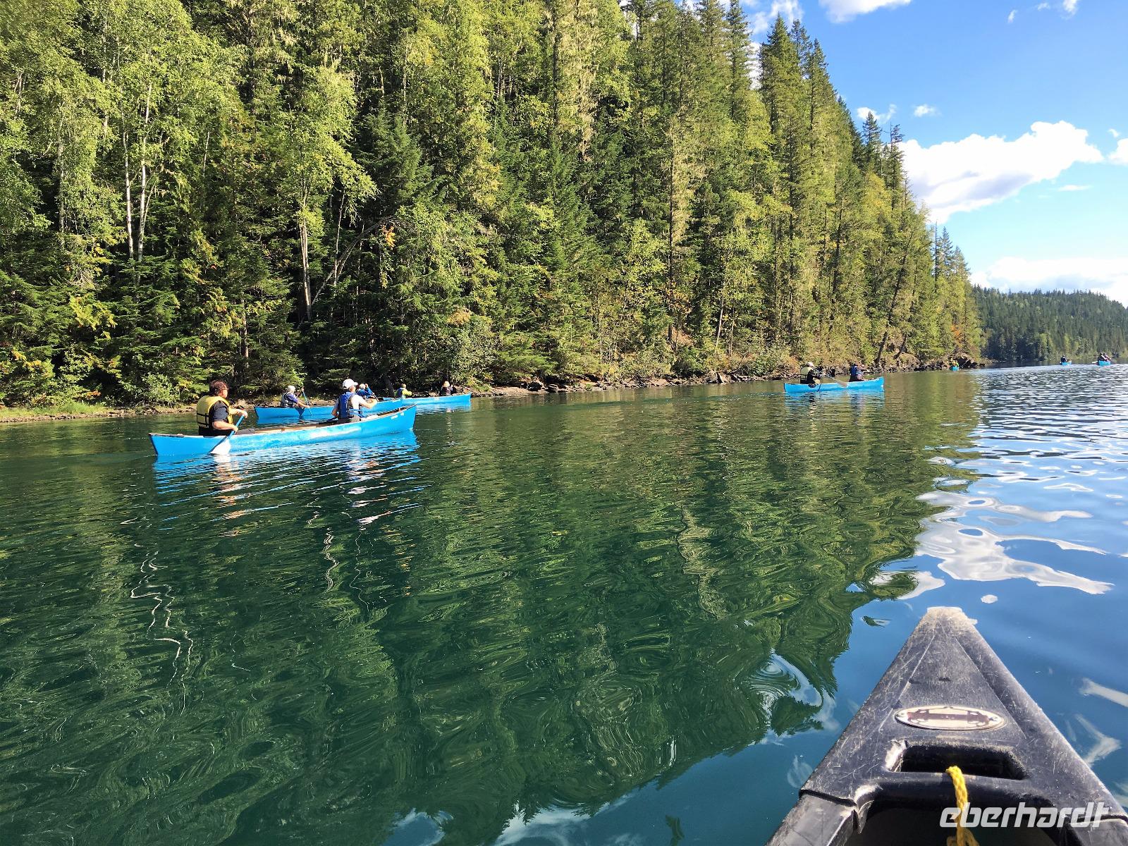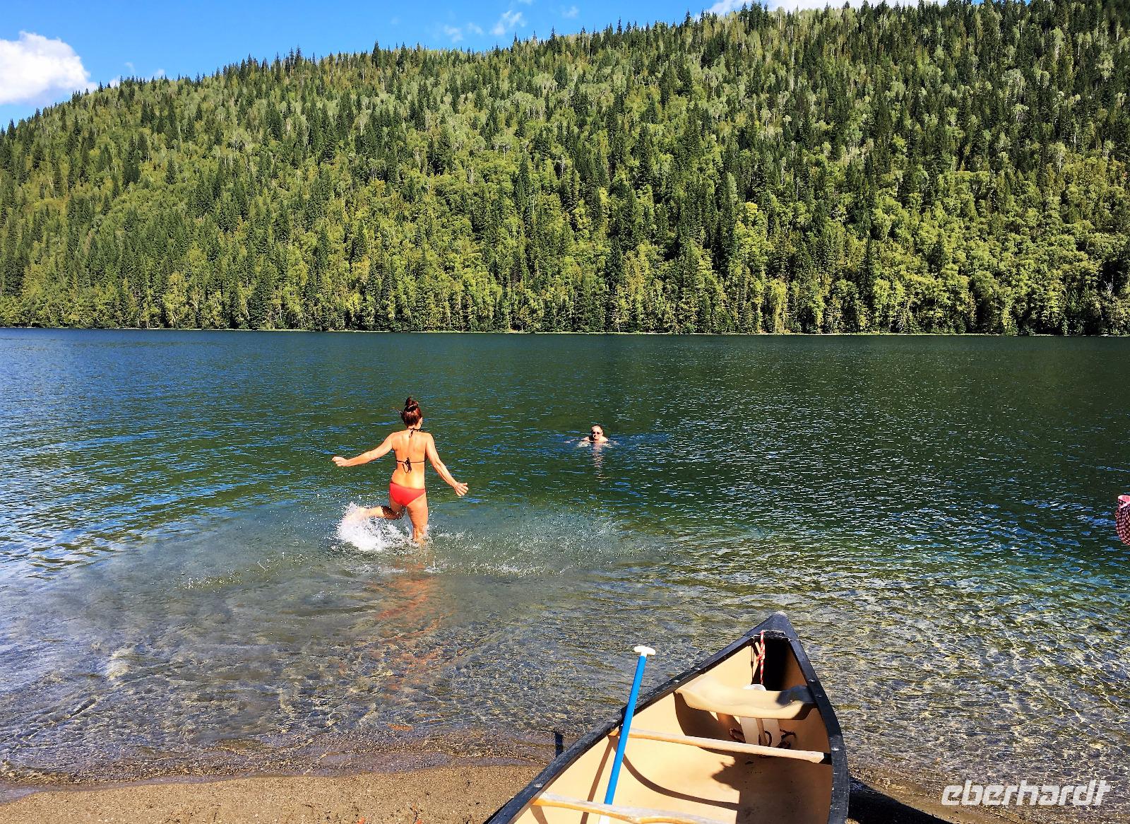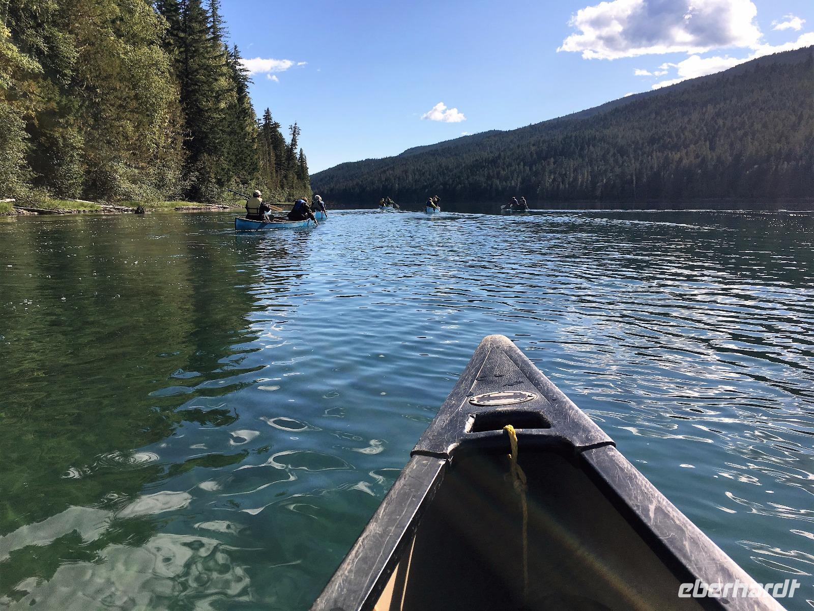 Ruhig und gut haben wir hier geschlafen und beim oeffenen der Balkontuere sehen wir auch, dass die Wolkendecke bloss Morgendunst ist. Zwischendurch blitzt naemlich schon das erfreuliche Tiefblau des Himmels. Nach dem wahrlich koeniglichen Fruehstueckbuffet welches nur fuer uns bereitet wurde, starten wir den Tag mit den Spahat Faellen. Diese 18 Meter hohen Wasserfaelle sind eines von drei ganz besonders schoenen Wasserfaellen hier in diesem Park. In Grey Wells Park gibt es in den ersten 20 km auch Farmen und eine davon gehoert Mike dem wilden Oesterreicher. Mike spielt uns auch auf seiner hawaianischen Ukelele ein Lied vor ehe wir mit unserem franzoesischen Paddelmeister Xavier auf die Tagestour gehen. Die Dawson Faelle, welche wir als naechstes besichtigen sind aehnlich den Niagara Faellen bloss nicht so weit jedoch ohne Hochhaeuser dahinter. Nach einem Spaziergang durch den Wald und einer Weiterfahrt kommen wir bei den Bayleys Chutes vorbei. Leider springen gerade keine Lachse, vielleicht weil es nun 2 Tage geregnet hatte und deshalb der Fluss so viel Wasser fuehrt. Item, gegen Mittag faengt unser heutiges Highlight an. Wir werden von Xavier eingewiesen wie man so ein Kanu fuehrt, wer vorne und wer hinten sitzt, wer Richtung und wer Tempo angibt und wie man geradeaus faehrt. Wir lernen auch Kurven fahren, das verstehen wir auch ganz schnell und im zig zag Muster paddeln wir froehlich nicht allzuweit bis zu einem schoenen Strand. Da die Sonne nun lacht, springen einige unter uns auch gleich ins Wasser. Brrrr schon etwas kuehl aber das haertet ab...Nach dem Picknick, welches wir auf geschnittenen Holzstaemmen sitzend einnehmen, paddeln wir wieder fleissig auf dem stillen grossen See. Keine Welle, kein Motor nur unsere Glueckseeligkeit im Sonnenschein. Das ist Urlaub. Die 2. groessten Wasserfaelle in BC besuchen wir anschliessend, es sind die Helmcken Falls. Die wunderbare Sicht ueber einen Grossteil dieses riesen Parks bewundern wir von Green Mountain aus. Der Abschluss gestaltet sich sehr angenehm auf der Ranch, an einem langen Tisch sitzend, ein gutes Bierchen geniessend und den Geschichten des oesterreichischen Besitzers dieser Ranch zuhorchend. Faszinierend, wie sie leben, diese europaeischen Kanada-Imigranten. Jedenfalls lachen sie alle viel und laut ! Es war ein herrlicher Tag, mit bloss 5.5 Km Wanderung jedoch, so scheint uns, mindestens 20 Km im Kanu paddelnd. Jedenfalls ist das so, wenn wir unsere Oberarme fragen.