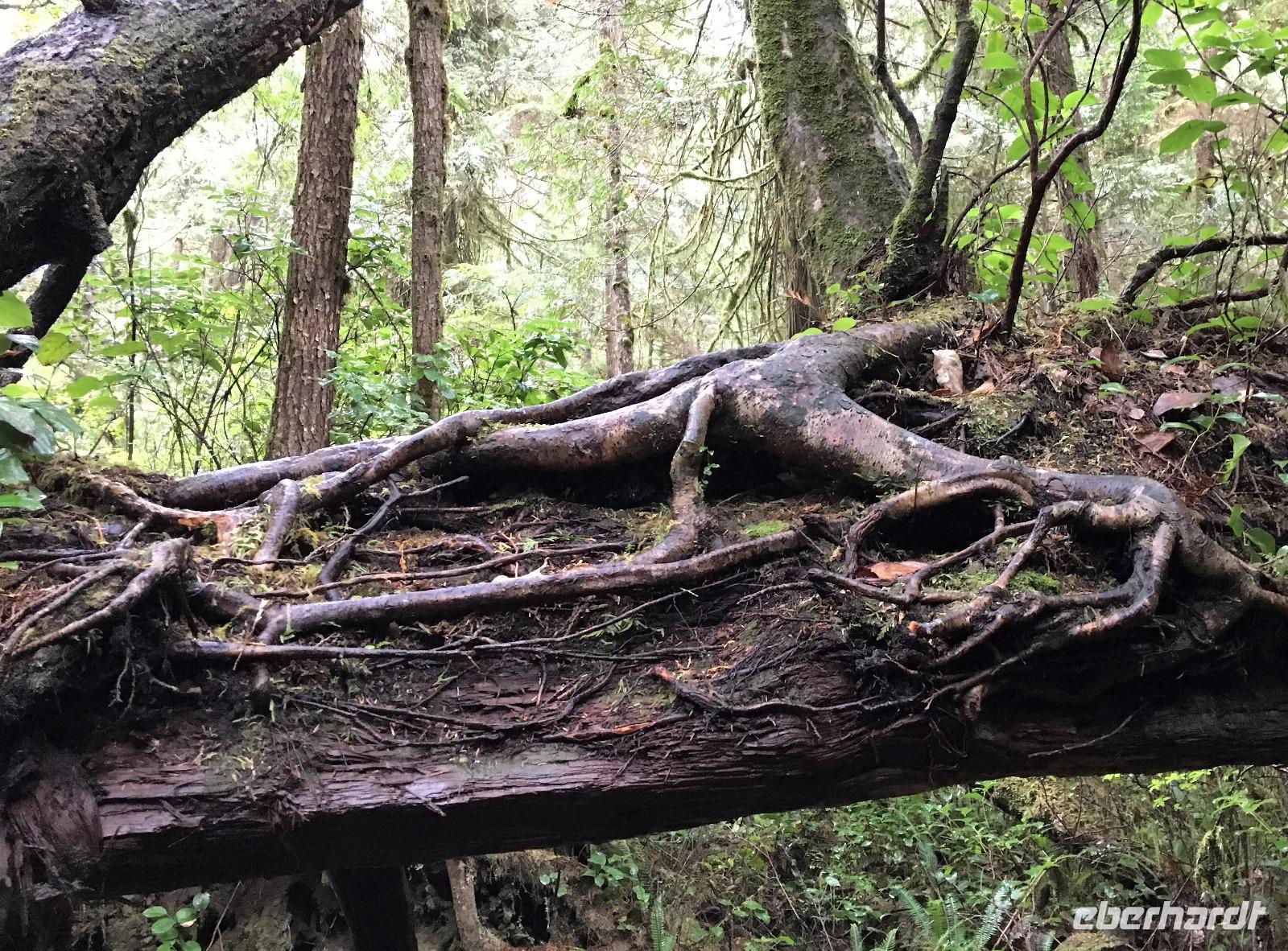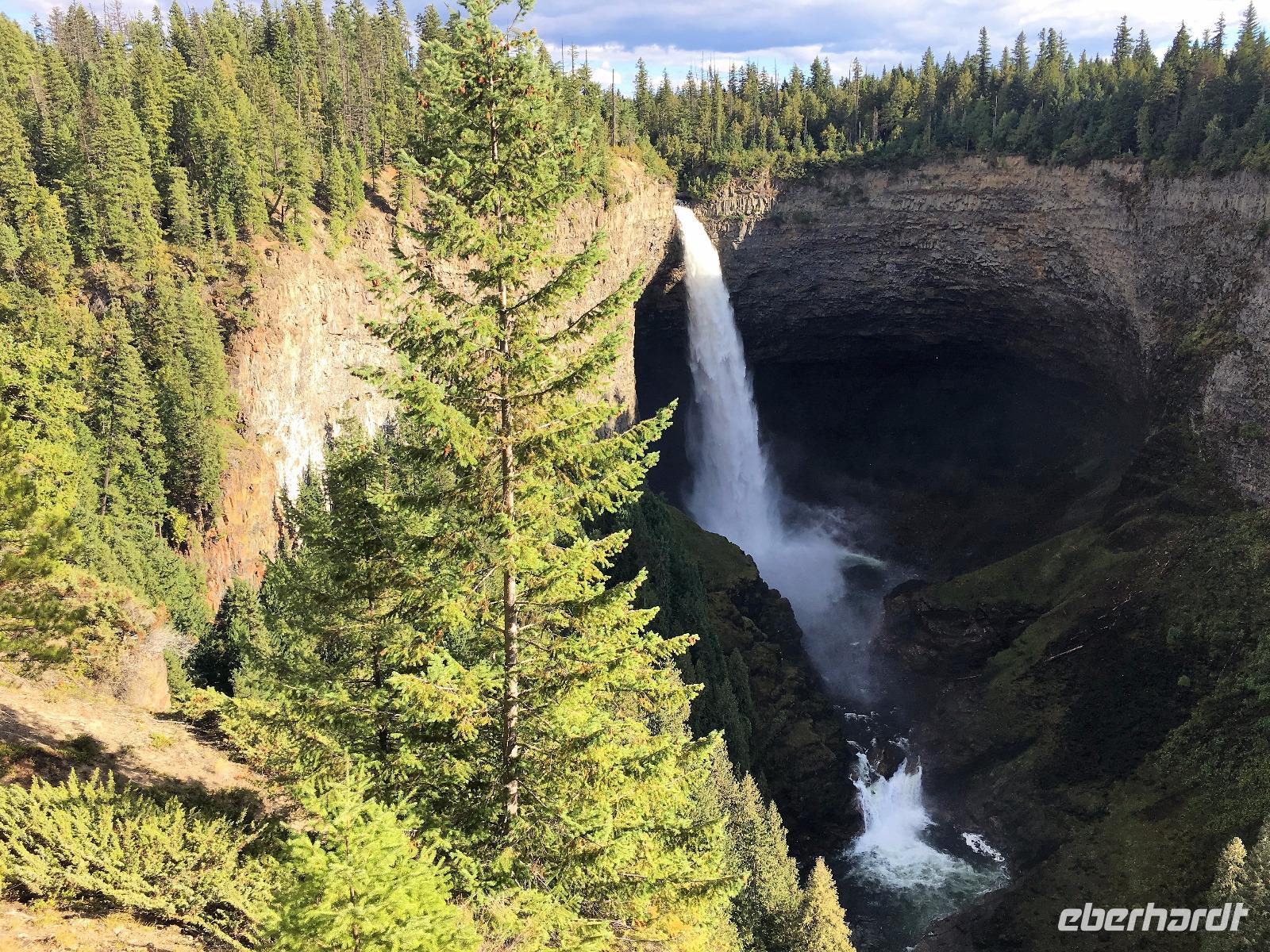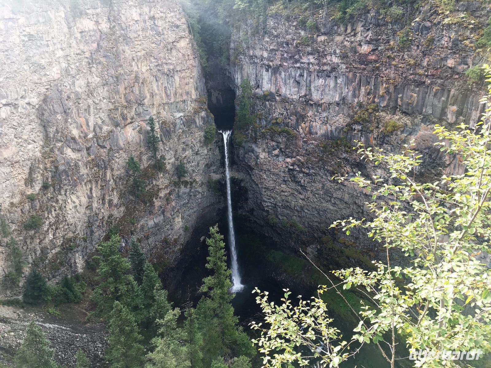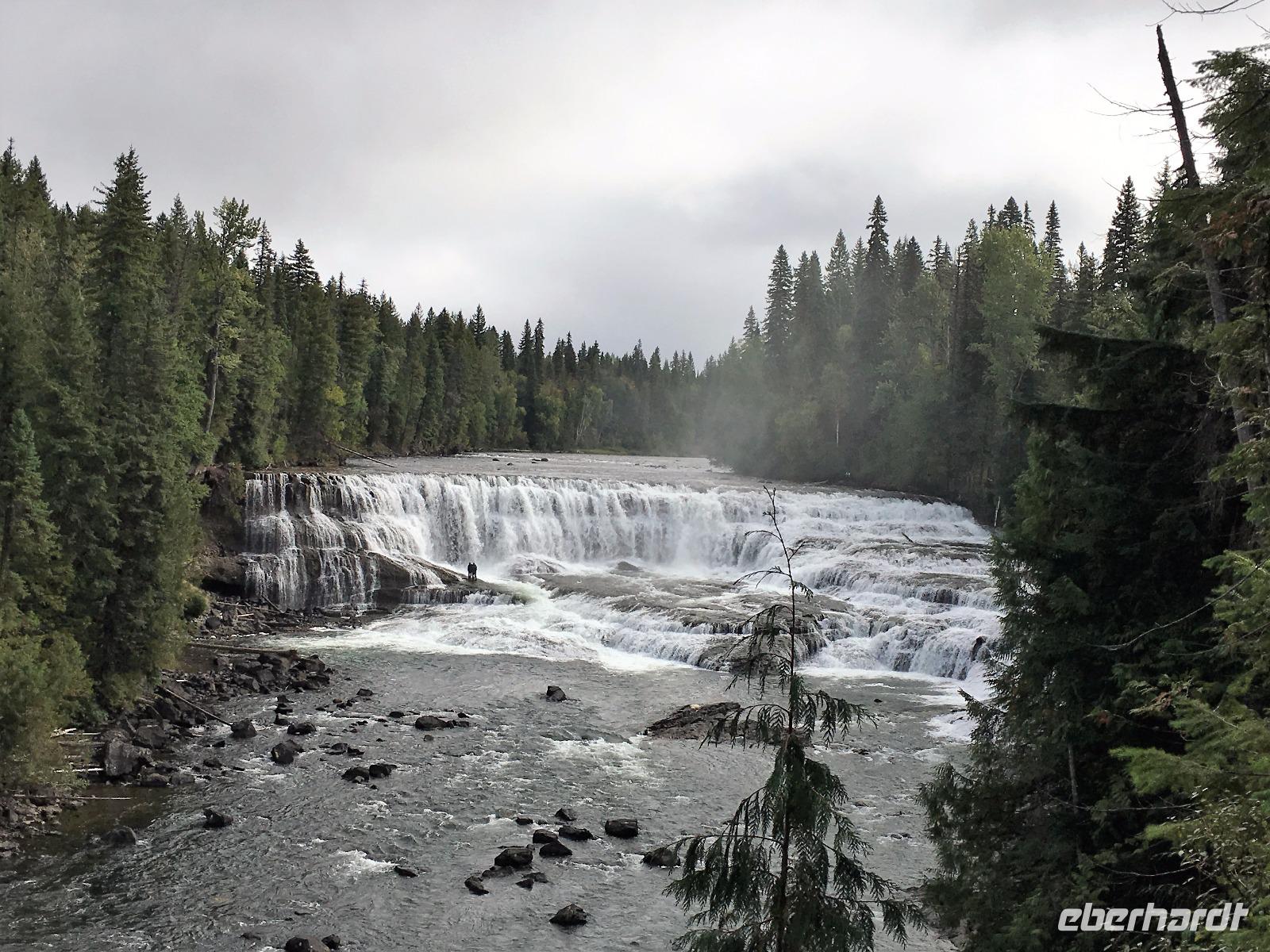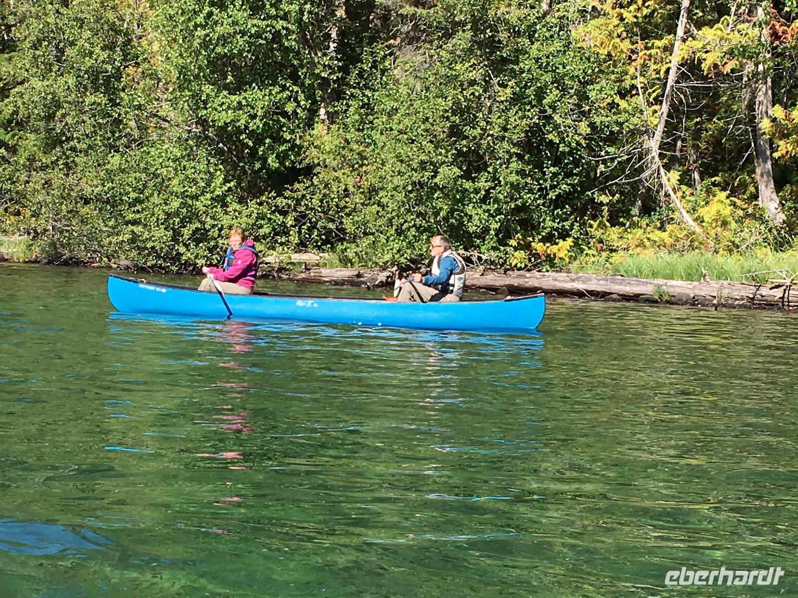 Ruhig und gut haben wir hier geschlafen und beim oeffenen der Balkontuere sehen wir auch, dass die Wolkendecke bloss Morgendunst ist. Zwischendurch blitzt naemlich schon das erfreuliche Tiefblau des Himmels. Nach dem wahrlich koeniglichen Fruehstueckbuffet welches nur fuer uns bereitet wurde, starten wir den Tag mit den Spahat Faellen. Diese 18 Meter hohen Wasserfaelle sind eines von drei ganz besonders schoenen Wasserfaellen hier in diesem Park. In Grey Wells Park gibt es in den ersten 20 km auch Farmen und eine davon gehoert Mike dem wilden Oesterreicher. Mike spielt uns auch auf seiner hawaianischen Ukelele ein Lied vor ehe wir mit unserem franzoesischen Paddelmeister Xavier auf die Tagestour gehen. Die Dawson Faelle, welche wir als naechstes besichtigen sind aehnlich den Niagara Faellen bloss nicht so weit jedoch ohne Hochhaeuser dahinter. Nach einem Spaziergang durch den Wald und einer Weiterfahrt kommen wir bei den Bayleys Chutes vorbei. Leider springen gerade keine Lachse, vielleicht weil es nun 2 Tage geregnet hatte und deshalb der Fluss so viel Wasser fuehrt. Item, gegen Mittag faengt unser heutiges Highlight an. Wir werden von Xavier eingewiesen wie man so ein Kanu fuehrt, wer vorne und wer hinten sitzt, wer Richtung und wer Tempo angibt und wie man geradeaus faehrt. Wir lernen auch Kurven fahren, das verstehen wir auch ganz schnell und im zig zag Muster paddeln wir froehlich nicht allzuweit bis zu einem schoenen Strand. Da die Sonne nun lacht, springen einige unter uns auch gleich ins Wasser. Brrrr schon etwas kuehl aber das haertet ab...Nach dem Picknick, welches wir auf geschnittenen Holzstaemmen sitzend einnehmen, paddeln wir wieder fleissig auf dem stillen grossen See. Keine Welle, kein Motor nur unsere Glueckseeligkeit im Sonnenschein. Das ist Urlaub. Die 2. groessten Wasserfaelle in BC besuchen wir anschliessend, es sind die Helmcken Falls. Die wunderbare Sicht ueber einen Grossteil dieses riesen Parks bewundern wir von Green Mountain aus. Der Abschluss gestaltet sich sehr angenehm auf der Ranch, an einem langen Tisch sitzend, ein gutes Bierchen geniessend und den Geschichten des oesterreichischen Besitzers dieser Ranch zuhorchend. Faszinierend, wie sie leben, diese europaeischen Kanada-Imigranten. Jedenfalls lachen sie alle viel und laut ! Es war ein herrlicher Tag, mit bloss 5.5 Km Wanderung jedoch, so scheint uns, mindestens 20 Km im Kanu paddelnd. Jedenfalls ist das so, wenn wir unsere Oberarme fragen.
