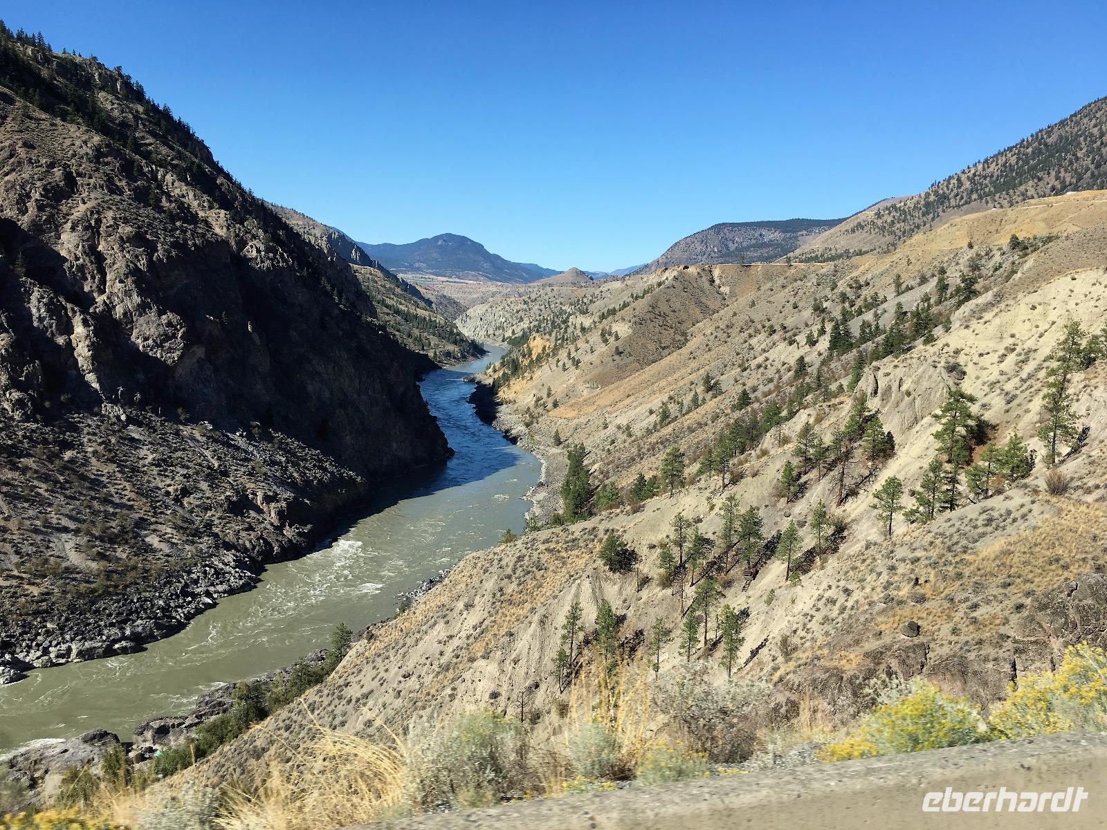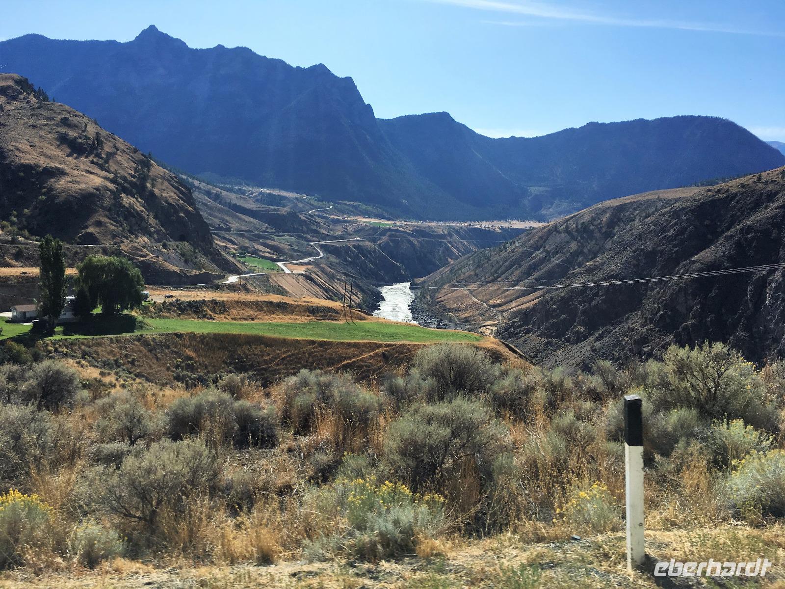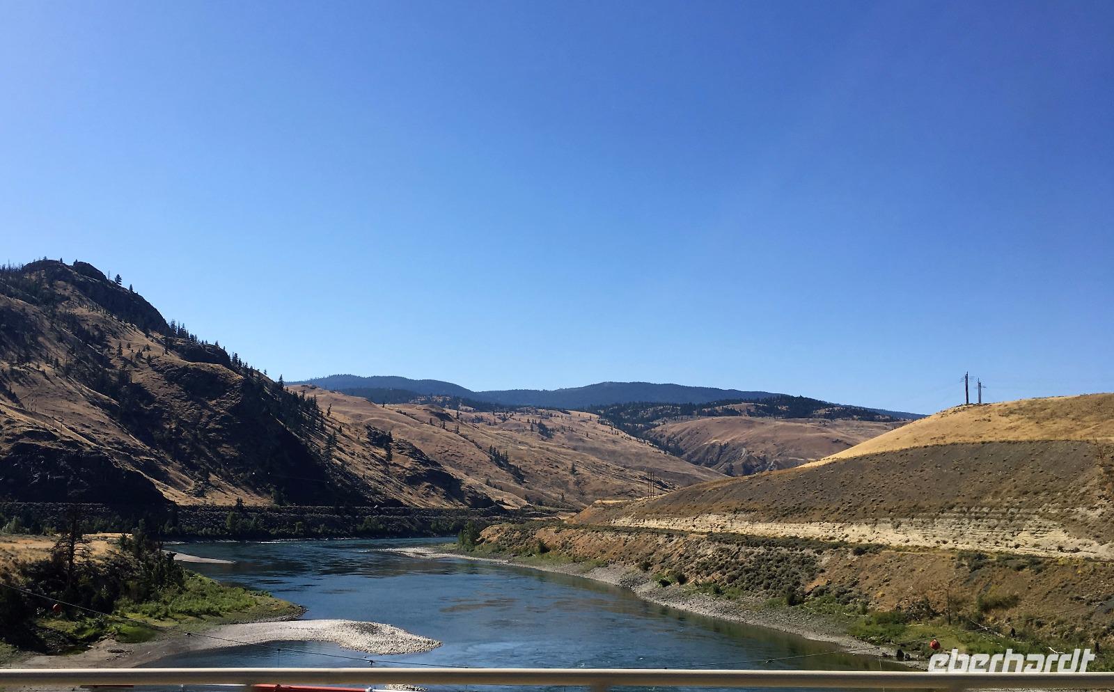 Das feine Fruehstueck nehmen wir heute mit Sonnenbrille ein. Ein wunderbarer wenn auch wander- und paddelloser Tag erwartet uns. Vorerst fahren wir dem North Thompson Fluss entlang und horchen den Geschichten des David Thompson und Simon Fraser zu. Ueberall bloss Bueschelgrass und Ponderosa Pinien, viele Braende haben diese Gegend gezeichnet und manche Schornsteine stehen ohne Haus auf den Wiesen. In Kamloops machen wir beim Rathaus Pause. Viele Fotos gibt es hier zu sehen und ein schoenes Klo gibt es auch. Nun aber weiter zur Hat Creek Ranch mit einem Fotostopp beim Kamloops See damit er auch digital mit nach Hause kommen kann. Diese Ranchgegend ist huegelig und hat ausser vielen Seen auch 4 Salzwasserseen. Die schauen sehr malerisch aus mit ihrem weissen Strand und roter Erika Umrandung. Die Hat Creek Ranch lernen wir vorerst als Restaurant kennen, der BBQ ist sehr lecker. Danach aber entpuppt sich diese Ranch in ein Freilichtmuseum mit einem Interpretations Zentrum der Sushwap Indianer. Sheila heisst die Scaw die uns von ihren Gebraeuchen und Gepflogenheiten berichtet. Sie singt uns auch 2 Lieder vor die uns in ihren Bann ziehen. Danach werden wir mit einer Postkutsche abgeholt und fahren zum Posthotel dieser Wagenstrasse. Schau, dies Geschirr und der Saloon mit den Spucknaepfen und der Bar. Da muss es lustig zu und her gegangen sein waehrend der Goldrauschzeit. Die Gange in die Zimmer sind noch immer mit der alten bemalten Tapete verkleidet. Gott Sei Dank, schauen unsere Hotelzimmer nicht mehr so aus. Munter und frohgemutes unternehmen wir anschliessend die steile Strasse dem Fraser Canyon entlang und halten dann wieder an einem hellblauen See. Heute wird naemlich Bergfest gefeiert mit einem BC Shiraz und Knabbersachen. An einem Strand sitzend mit einem Glaeschen Wein in der Hand verweilen wir hier ein wenig und denken an die wunderschoene Zeit, die wir bisher gemeinsam erlebt haben. Die 2 Stunden Fahrt nach Whistler werden uns jedoch nicht erspart und auf der Duffy Lake Road, geht es wie auf der Achterbahn durch enge Schluchten, entlang eines Sees und steil einen Abhang hinunter. Guecklich kommen wir in Pemberton an, schauen nochmals, ob Lachse im Fluss sind und rollen so gemuetlich nach Whistler. Heute haben wir Gelegenheit alleine Essen zu gehen, wir werden mit Stadtplan ausgeruestet, bekommen viele Tips wo es was fuer jeden Gaumen gibt, sodass auch dieses Abenteuer gelingen moege.