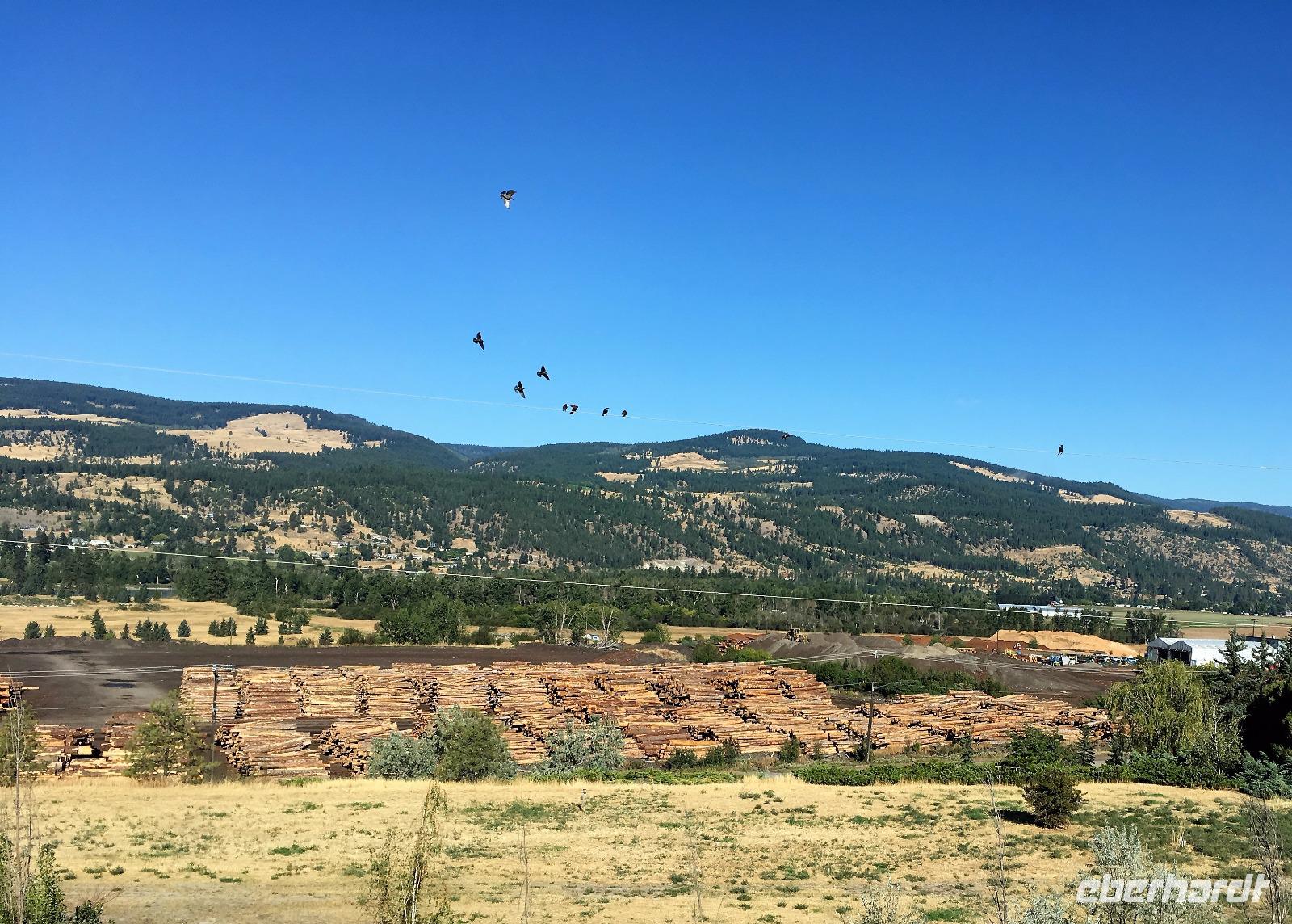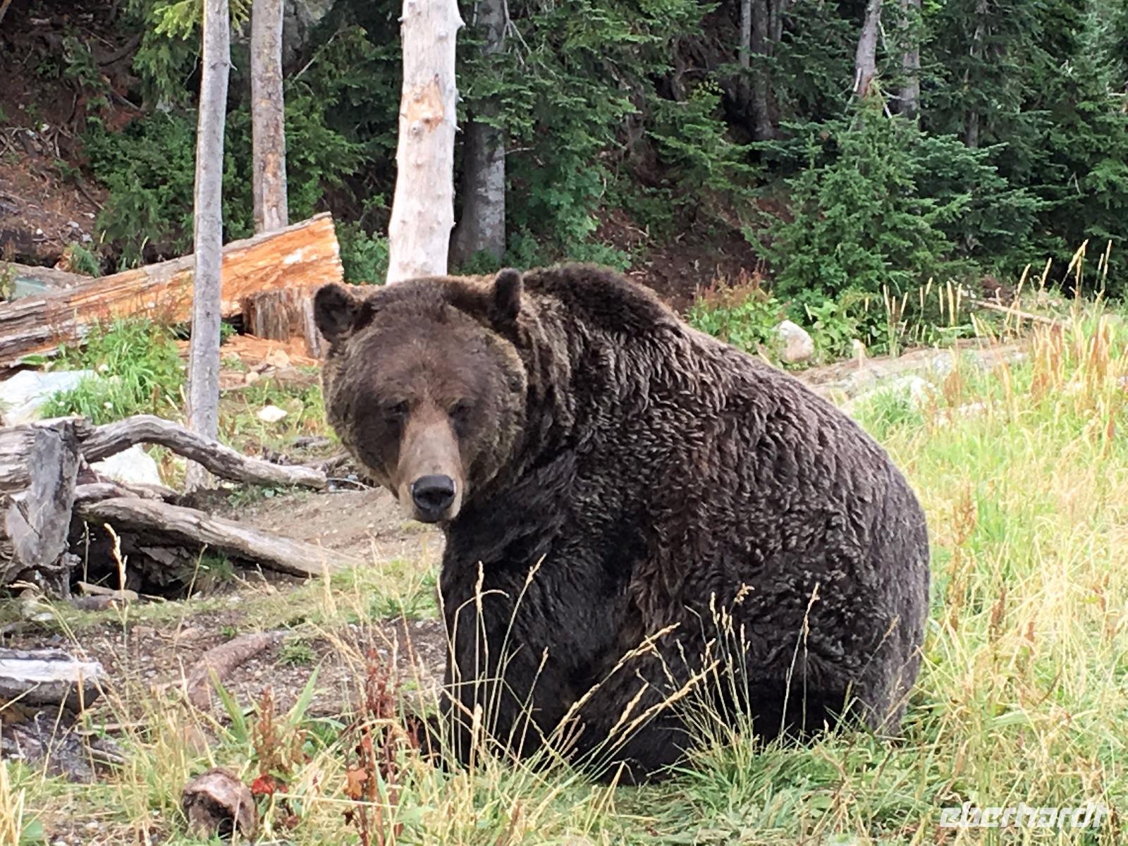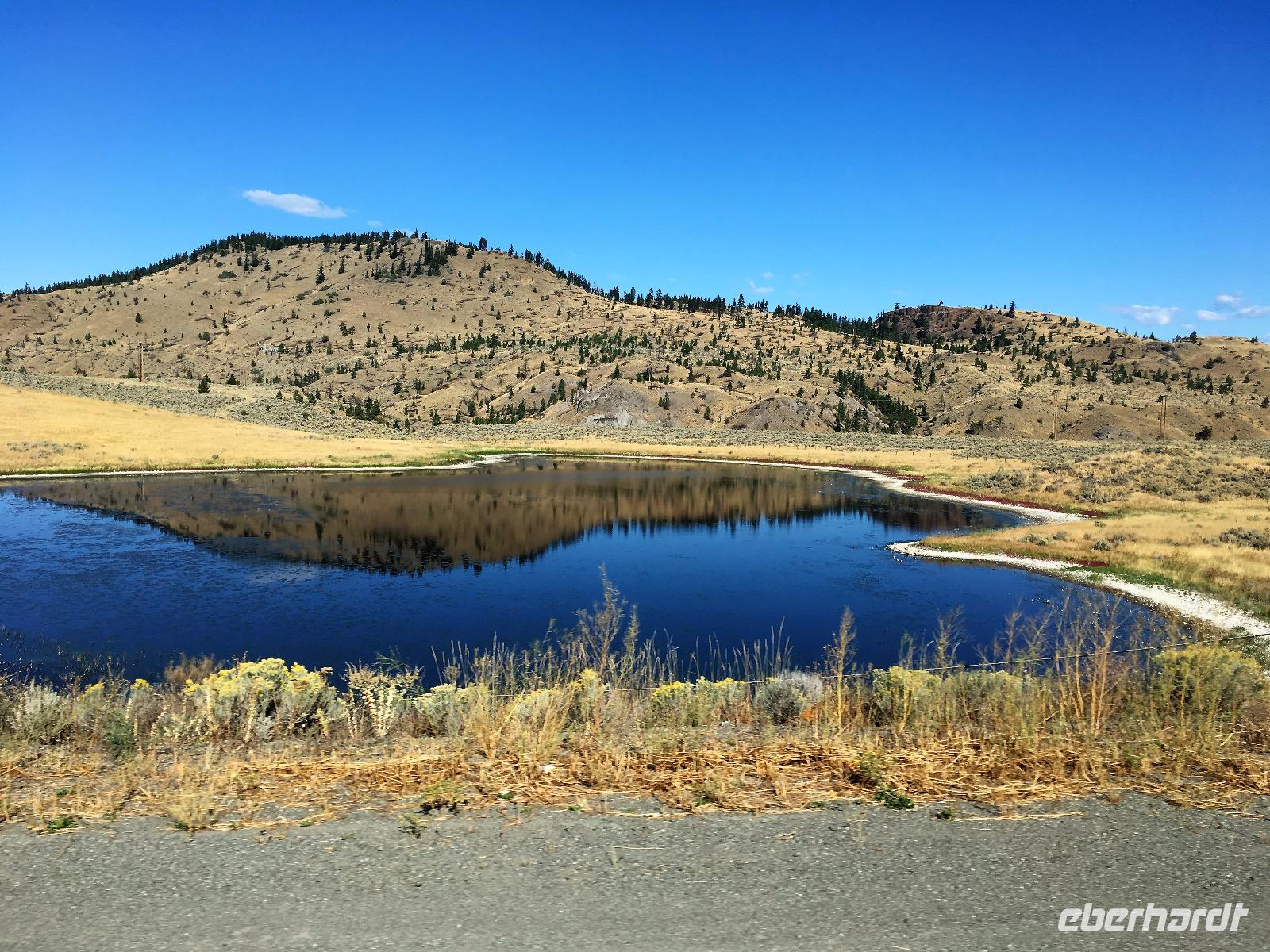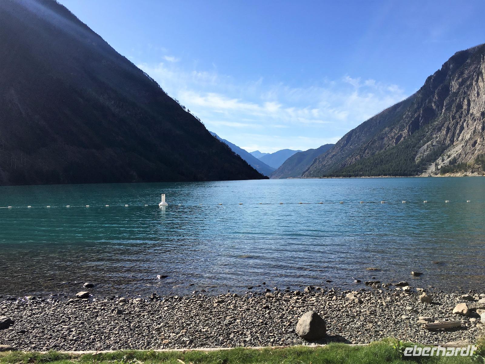Das feine Fruehstueck nehmen wir heute mit Sonnenbrille ein. Ein wunderbarer wenn auch wander- und paddelloser Tag erwartet uns. Vorerst fahren wir dem North Thompson Fluss entlang und horchen den Geschichten des David Thompson und Simon Fraser zu. Ueberall bloss Bueschelgrass und Ponderosa Pinien, viele Braende haben diese Gegend gezeichnet und manche Schornsteine stehen ohne Haus auf den Wiesen. In Kamloops machen wir beim Rathaus Pause. Viele Fotos gibt es hier zu sehen und ein schoenes Klo gibt es auch. Nun aber weiter zur Hat Creek Ranch mit einem Fotostopp beim Kamloops See damit er auch digital mit nach Hause kommen kann. Diese Ranchgegend ist huegelig und hat ausser vielen Seen auch 4 Salzwasserseen. Die schauen sehr malerisch aus mit ihrem weissen Strand und roter Erika Umrandung. Die Hat Creek Ranch lernen wir vorerst als Restaurant kennen, der BBQ ist sehr lecker. Danach aber entpuppt sich diese Ranch in ein Freilichtmuseum mit einem Interpretations Zentrum der Sushwap Indianer. Sheila heisst die Scaw die uns von ihren Gebraeuchen und Gepflogenheiten berichtet. Sie singt uns auch 2 Lieder vor die uns in ihren Bann ziehen. Danach werden wir mit einer Postkutsche abgeholt und fahren zum Posthotel dieser Wagenstrasse. Schau, dies Geschirr und der Saloon mit den Spucknaepfen und der Bar. Da muss es lustig zu und her gegangen sein waehrend der Goldrauschzeit. Die Gange in die Zimmer sind noch immer mit der alten bemalten Tapete verkleidet. Gott Sei Dank, schauen unsere Hotelzimmer nicht mehr so aus. Munter und frohgemutes unternehmen wir anschliessend die steile Strasse dem Fraser Canyon entlang und halten dann wieder an einem hellblauen See. Heute wird naemlich Bergfest gefeiert mit einem BC Shiraz und Knabbersachen. An einem Strand sitzend mit einem Glaeschen Wein in der Hand verweilen wir hier ein wenig und denken an die wunderschoene Zeit, die wir bisher gemeinsam erlebt haben. Die 2 Stunden Fahrt nach Whistler werden uns jedoch nicht erspart und auf der Duffy Lake Road, geht es wie auf der Achterbahn durch enge Schluchten, entlang eines Sees und steil einen Abhang hinunter. Guecklich kommen wir in Pemberton an, schauen nochmals, ob Lachse im Fluss sind und rollen so gemuetlich nach Whistler. Heute haben wir Gelegenheit alleine Essen zu gehen, wir werden mit Stadtplan ausgeruestet, bekommen viele Tips wo es was fuer jeden Gaumen gibt, sodass auch dieses Abenteuer gelingen moege.