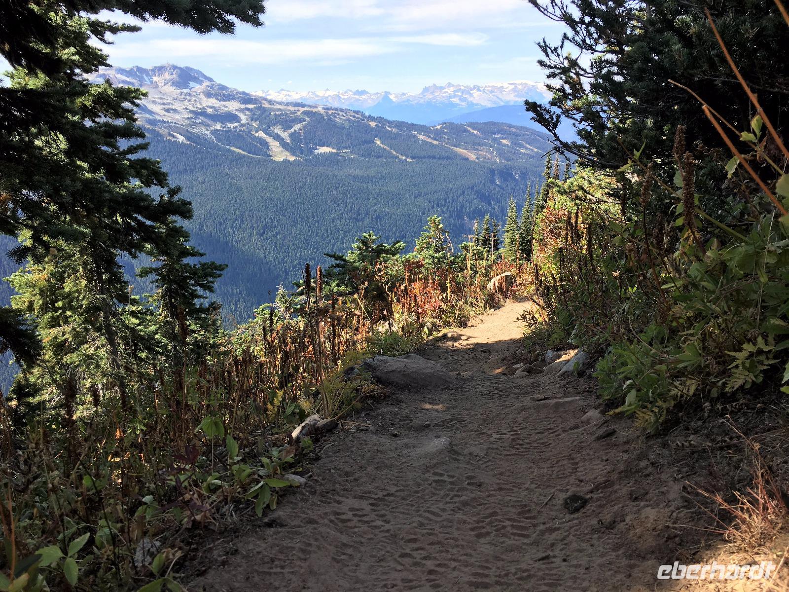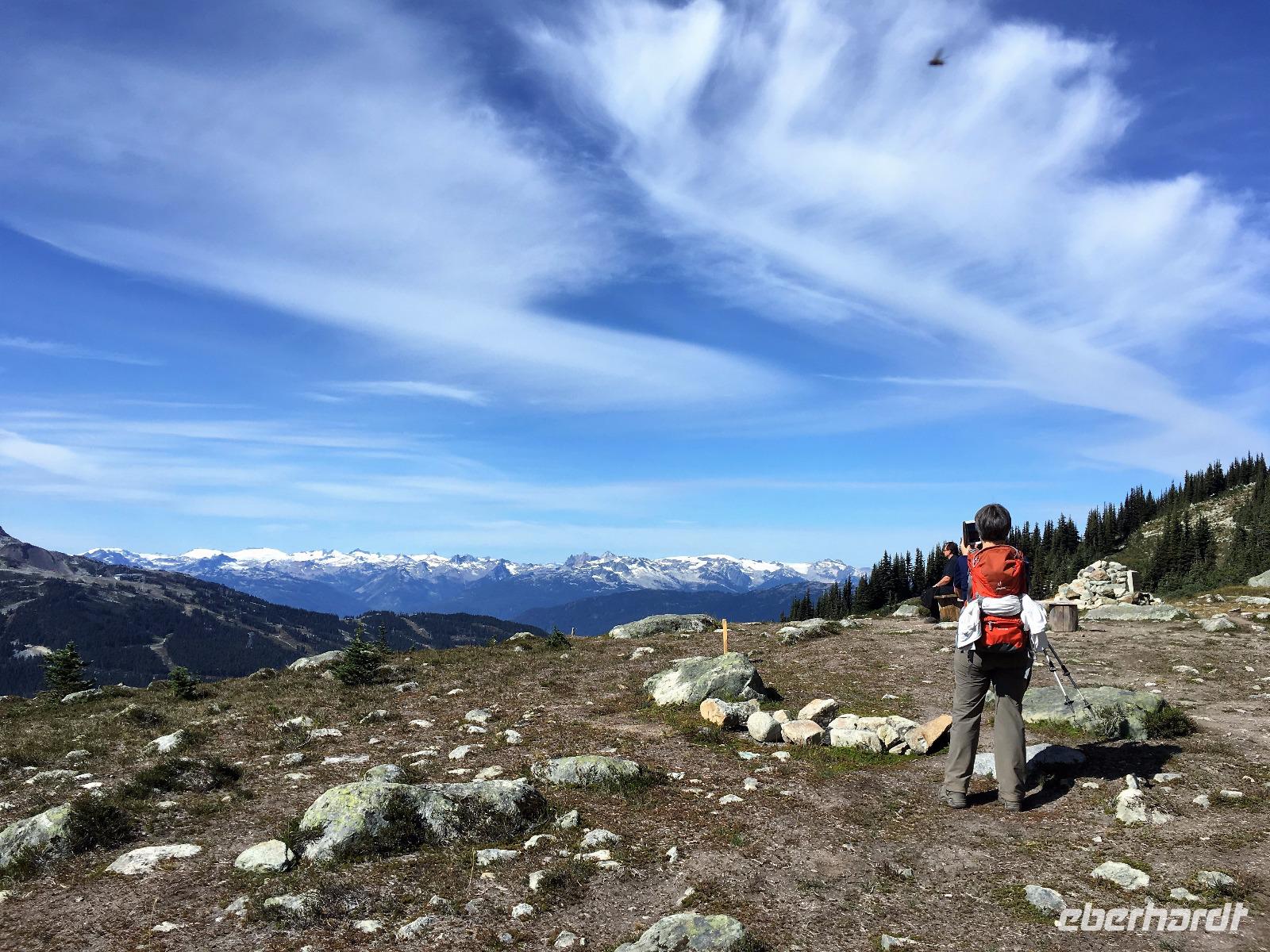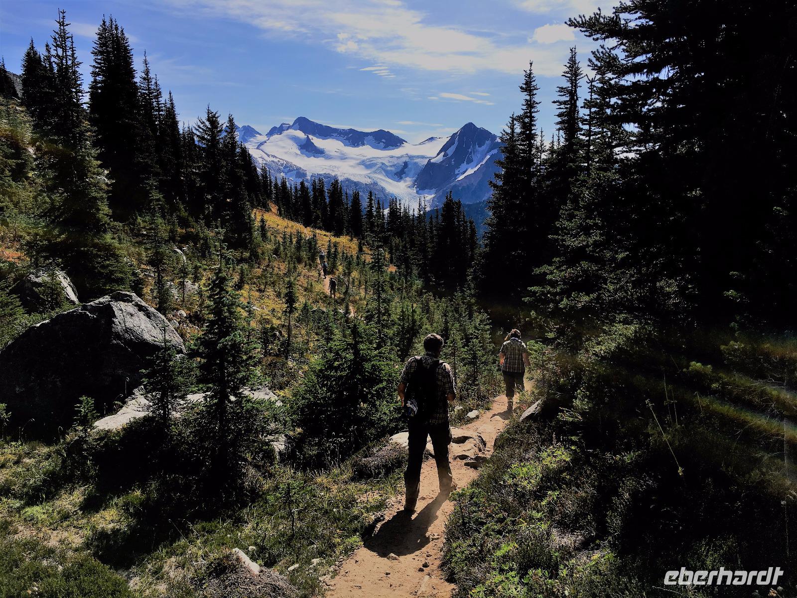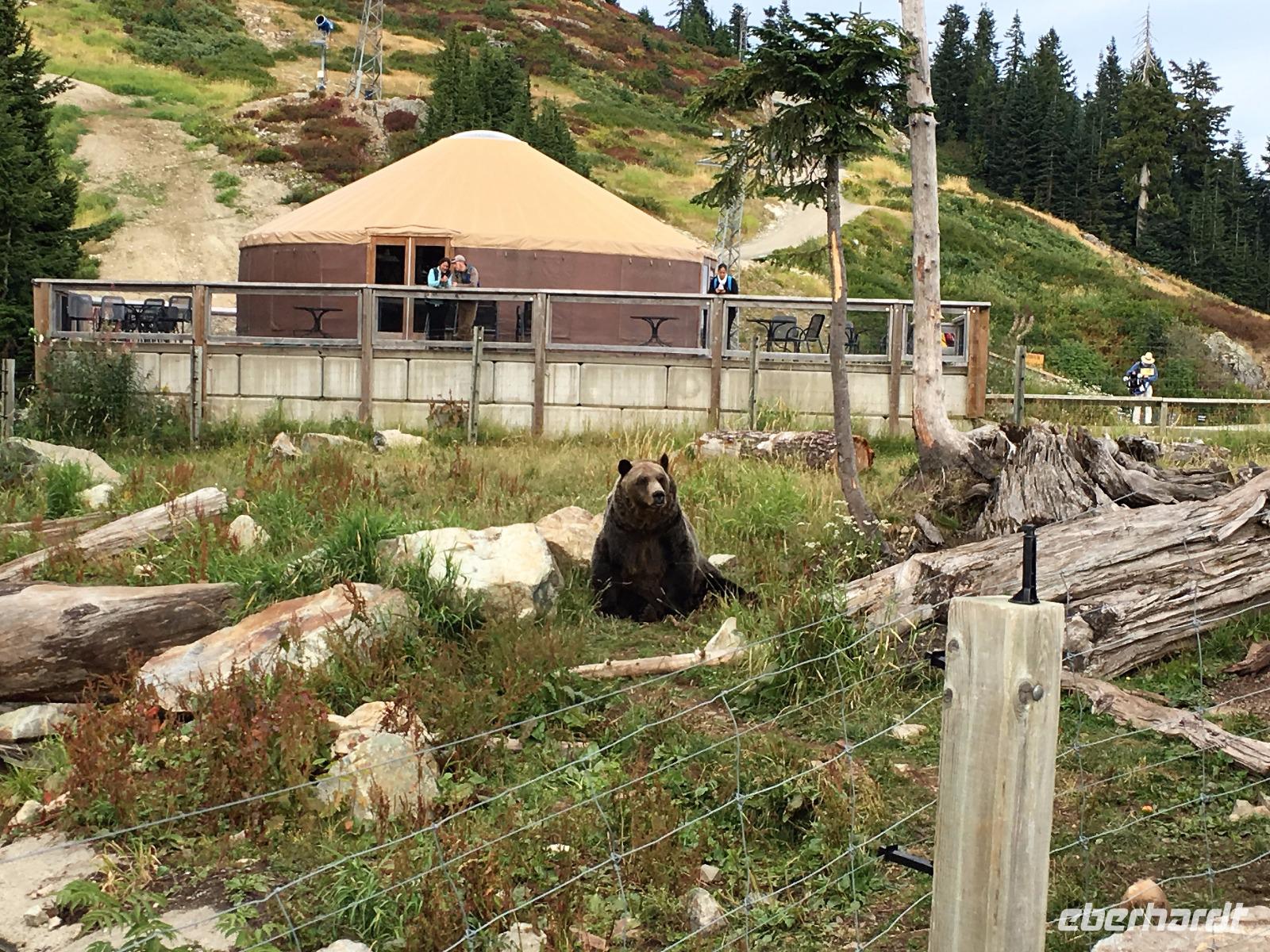 Guten Morgen in Whistler. Ach wie toll, die Sonne strahlt, das ist wunderbar, denn heute werden wir wandern gehen. Vorerst ein derftiges Fruehstueck, danach Picknick Einkauf und hinauf geht es mit 6-er Gondeln auf Whistler Mountain. Da gibt es auch einen Zwischenhalt und wir wollen natuerlich gleich aussteigen, ahhh nein, Elisabeth hat doch gesagt, wir sollen sitzen bleiben bis wir ganz oben auf dem Berg sind. Da ist es schoen, die Kanada- und die 2010 Olympia-Fahnen wehen im zarten Hauch des Windes und wir gehen auch gleich zu der Peak 2 Peak Gondola. Diese schwebende Verbindung der zwei Berge hat die laengste Seilspanne der Welt und ist nicht nur ein Erlebnis sondern auch ein technisches Spitzenprodukt. Die ganze Gruppe passt in eine Gondel und bald schweben wir hoch ueber dem Fitzsimmons Tal. Auf Blackcomb angekommen schauen uns Murmeltiere an. Sie stehen genau wie wir ziemlich unschluessig da. Wer ist wohl mehr am anderen interessiert ? Nach ein paar gelungenen Fotos beginnen wir unsere heutige Wanderung. Entlang des Berges gibt es einen schoenen Pfad ueber Stock und Stein. Den gehen wir fuer gute 1 ½ Stunden und bloss die perfekten Bonsai-Tannen und Fichten begleiten uns. Die Entscheidung auf eine Anhoehe zu wandern ist zwar eine anstrengende fuer einige, aber die Belohnung fuer die Strapazen ist gebuehrend hoch. Blackcomb Lake liegt wunderschoen am Fusse von einer Bergspitze die 7. Himmel heisst. Wir sind auch im 7. Himmel und wandern nach einer Weile und viele Fotos spaeter wieder auf den Weg hinunter und weiter zu einem kleineren See von dem man jedoch eine herrliche Aussicht geniesst. Jetzt ist es Zeit fuers mitgebrachte Picknick. Es wird immer waermer und bald steigen die Temperaturen auf 22 Grad. Fast waeren einige ins Wasser gesprungen. Aber eben nur fast. Also wandern wir wieder zurueck zur Gondel und stehen auf Whistler Mountain in einer Schlange der Leute, die alle auch wieder nach Whistler hinunter fahren wollen und offensichtlich kein Bike und Ritterausruestung bei sich haben. Wie wir ! Die Schlange ist lang aber es geht bloss 10 Minuten und schon sitzen wir in den eierfoermigen Gondeln. Von oben kann man den Downhill Biker zuschauen, wie sie ueber Baeume springen, steile Pfade meistern und ganz enge Kurven mit Riesengeschwindigkeit ueberleben. Beeindruckend ist das schon. Muede kommen wir im Dorf an. Nun hat jeder sein eigenes Programm, in Whistler braucht man mindestens eine Woche, um nur schon das wenigste mitzumachen. Es ist echt eine Spielwiese fuer Erwachsene. Abendbrot gibt es in einem urchigen Lokal mitten im Dorf ehe wir diesen wunderbaren Wandertag beenden. Einige unter uns schwingen noch die Beine bei flotter irischer Musik im Pup damit wir auch noch den letzten Tropfen Energie los werden. Der Geraeuschpegel des Bierfestes droehnt noch lange in die Nacht, aber unser Hotel hat Schallwaende und 3-fach Verglasung. Wussten die, dass wir auch schlafen wollen ?
